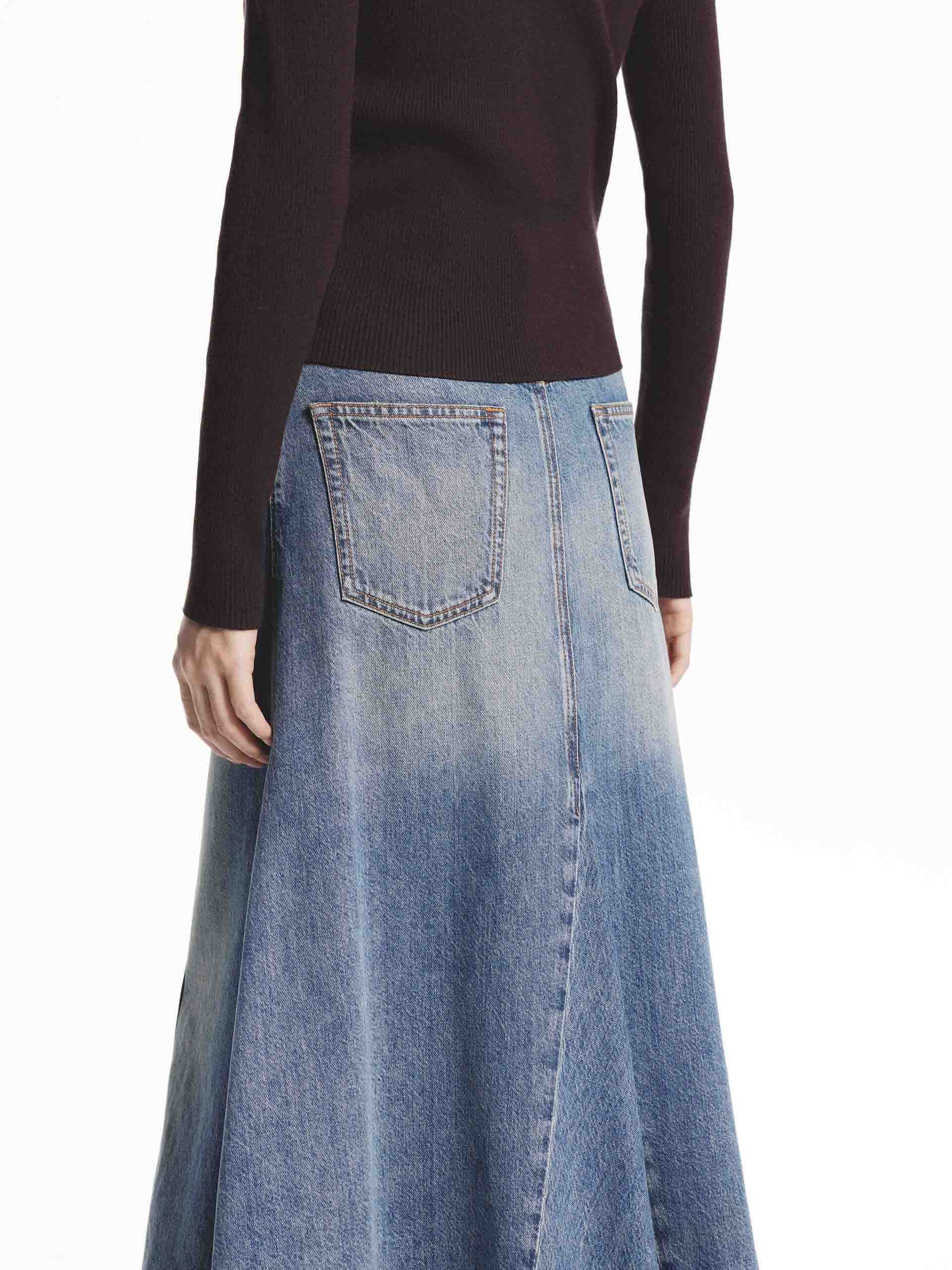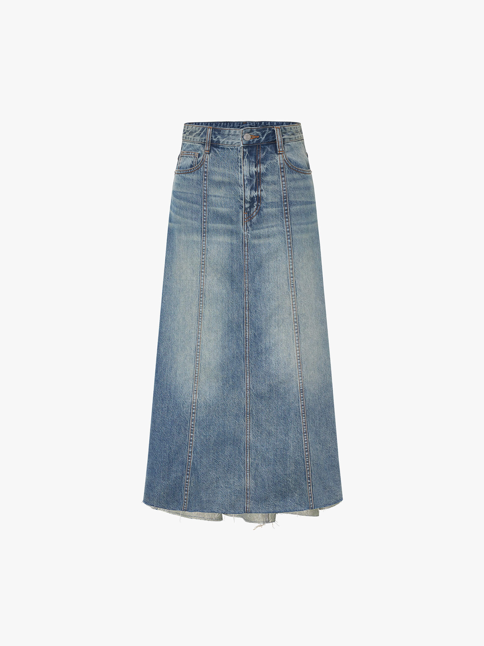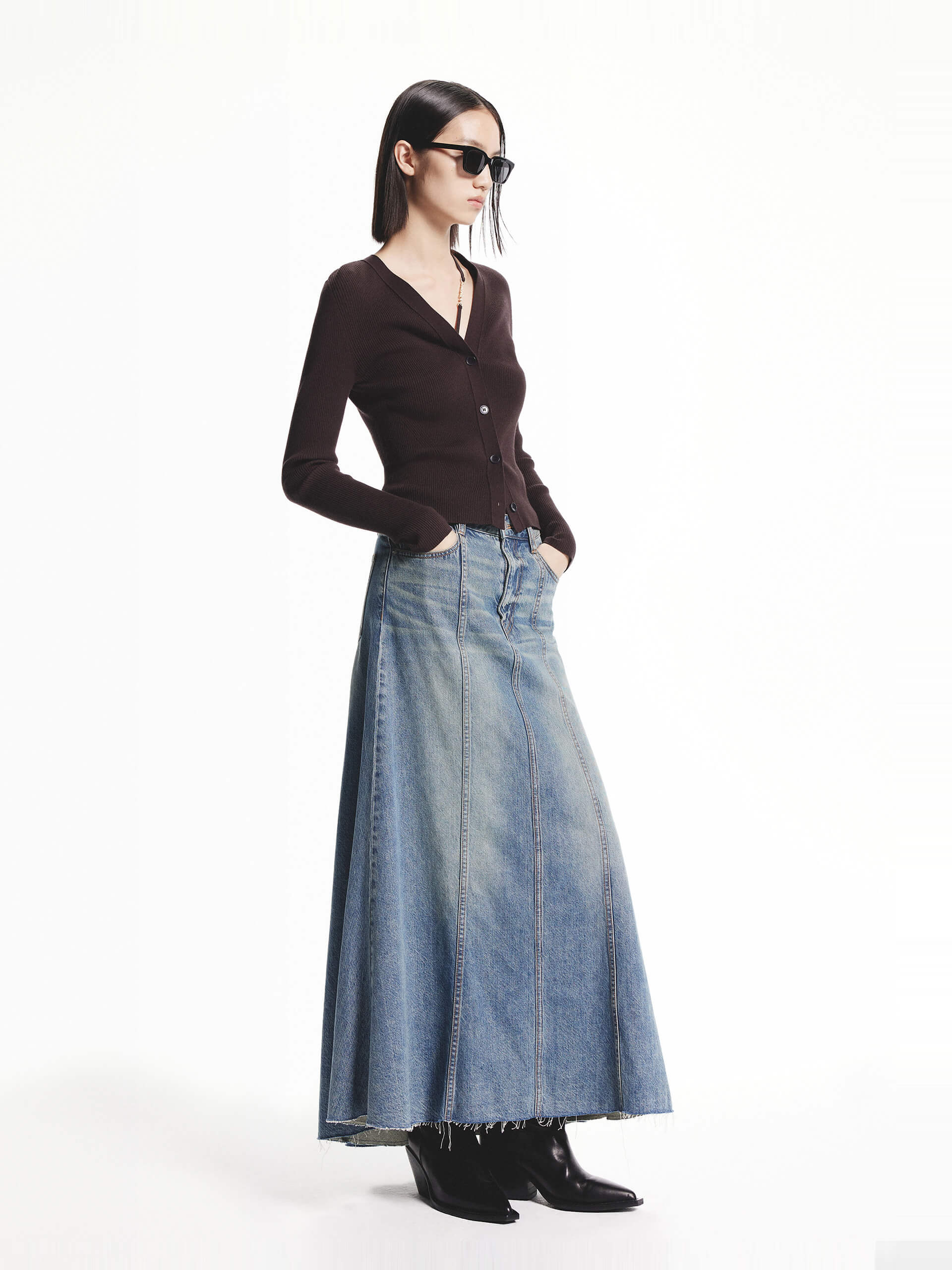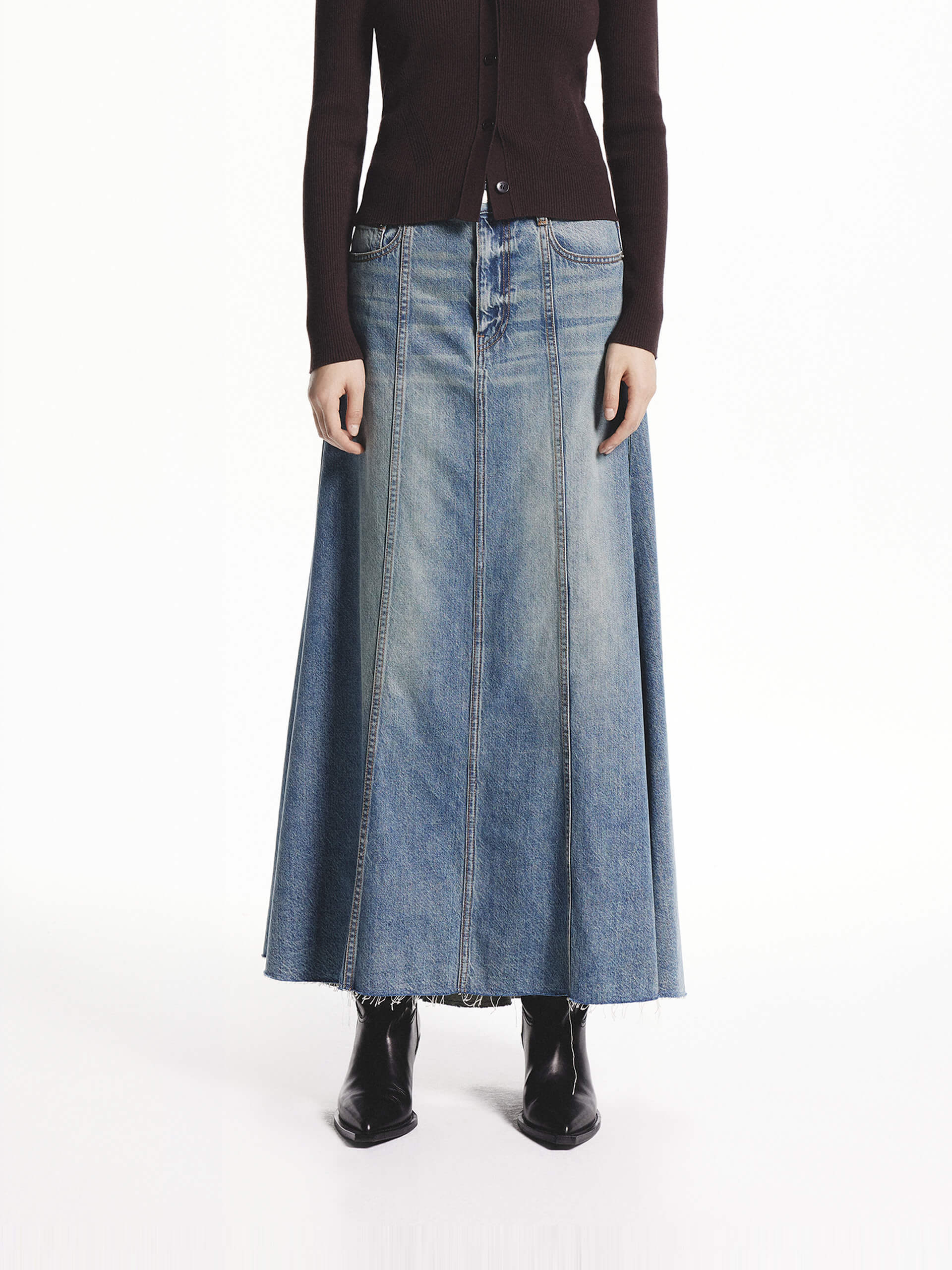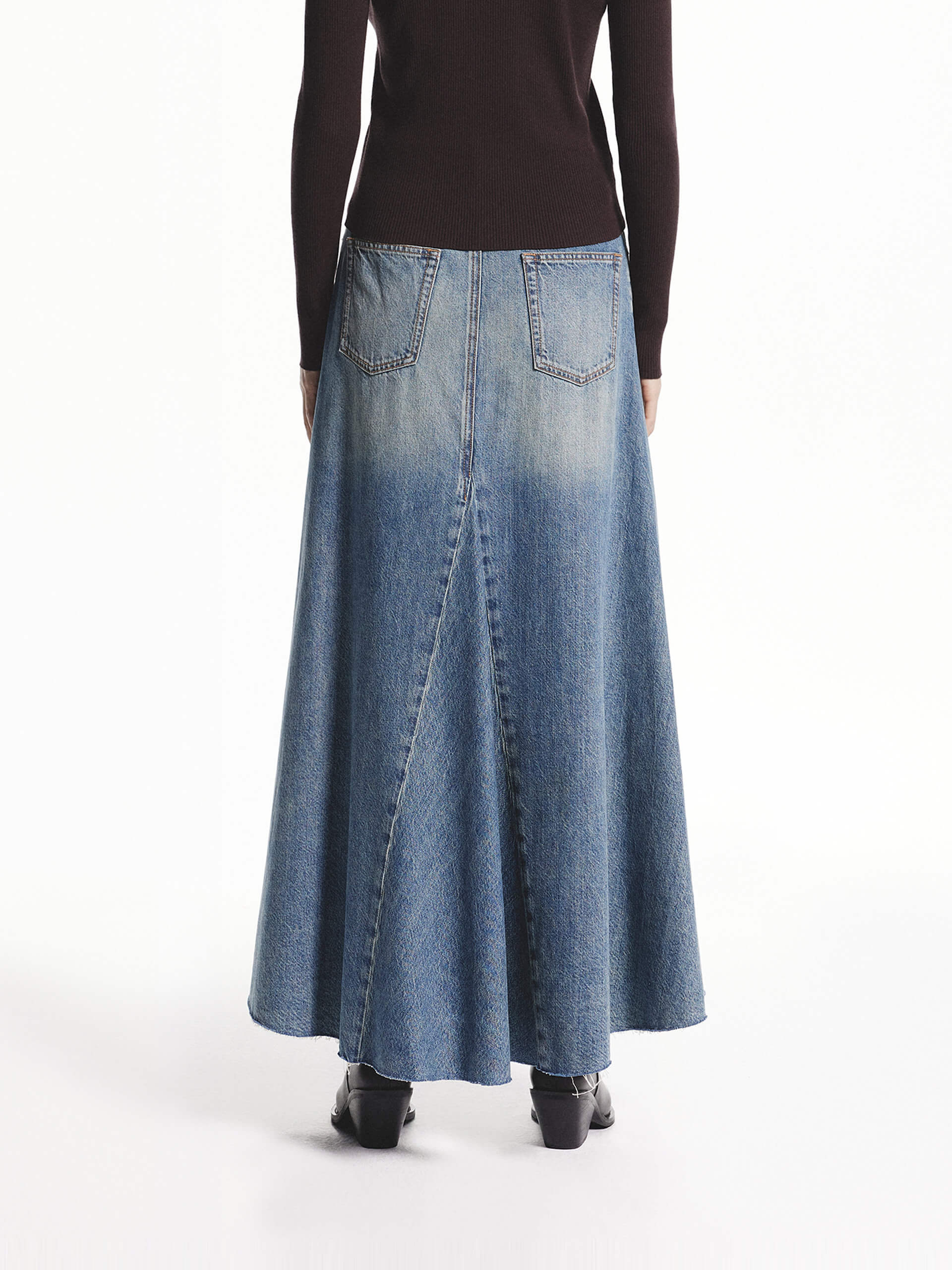 This denim skirt is expertly crafted from comfortable cotton, offering a lightly faded blue wash and raw hem for a trendy touch. Its A-line maxi silhouette adds a flattering and versatile option to any wardrobe. Pair with our knit cardigan for a stylish look.