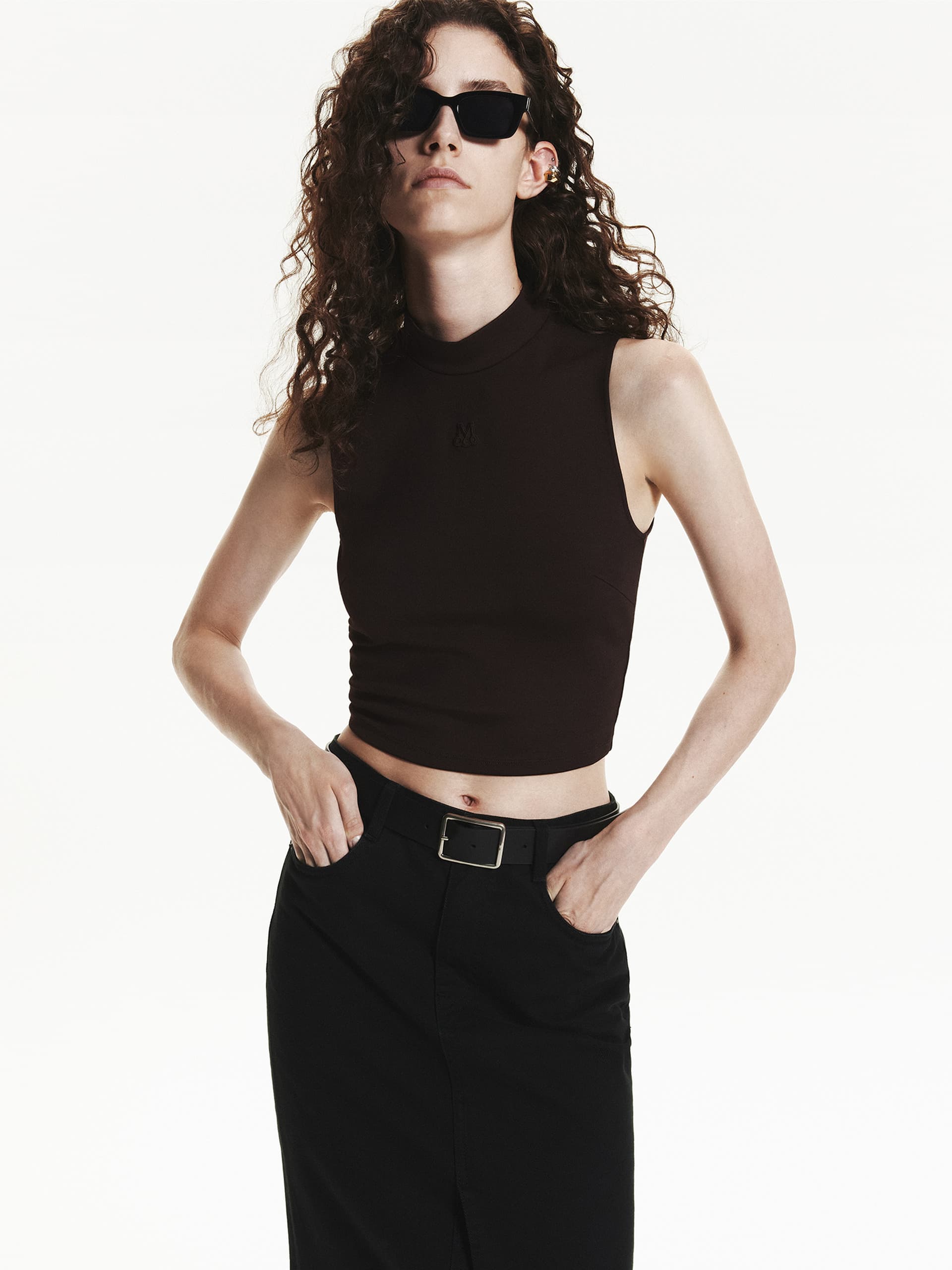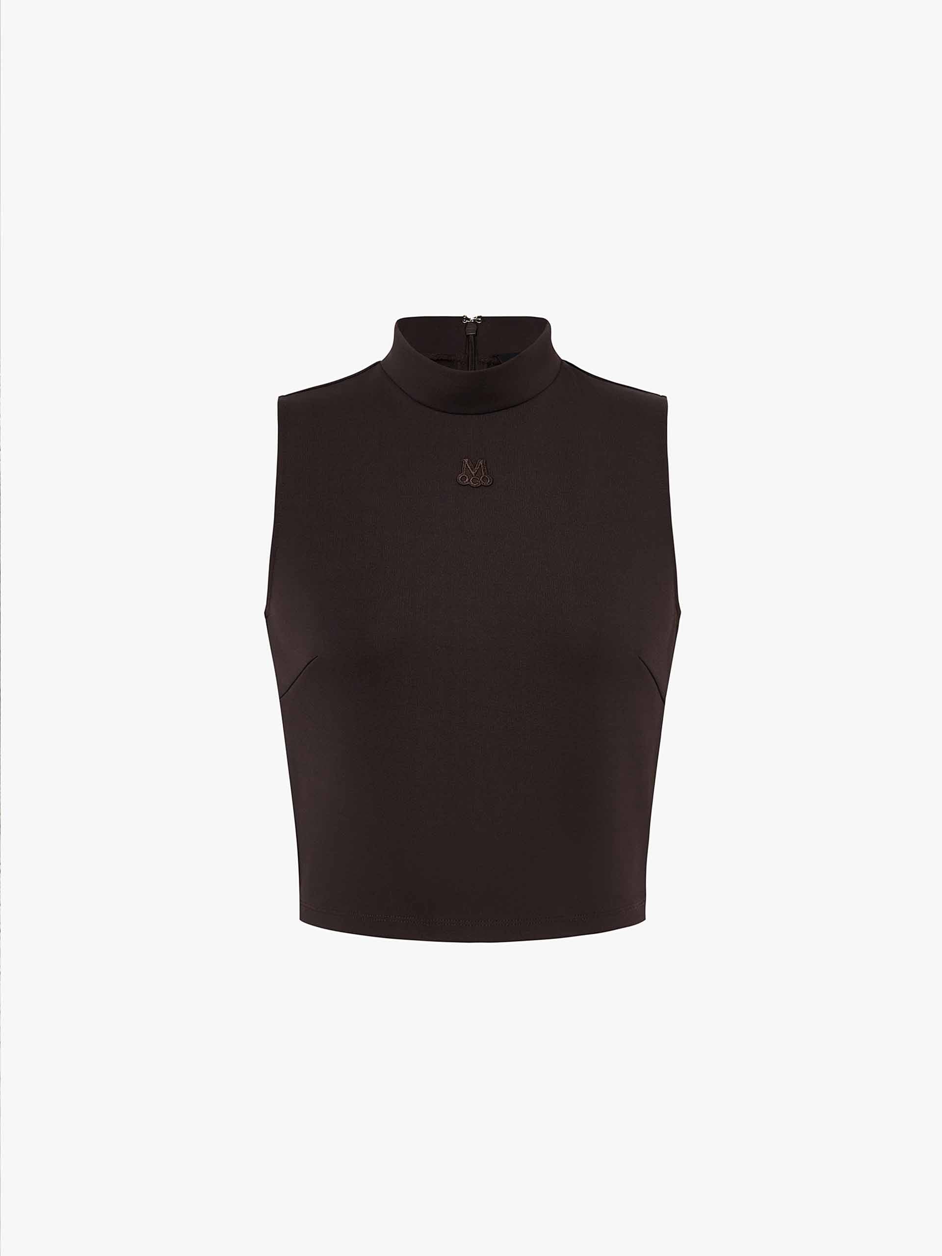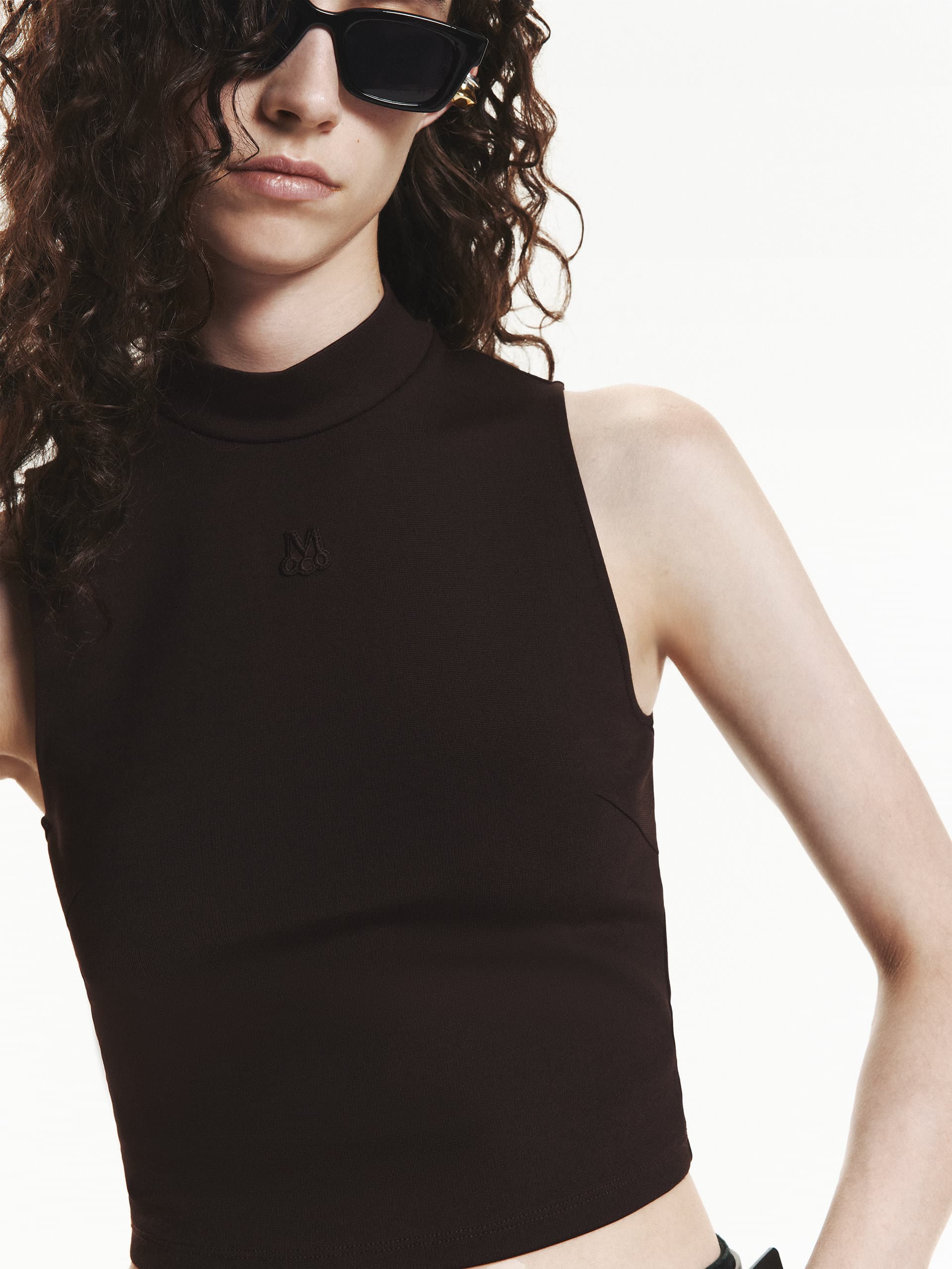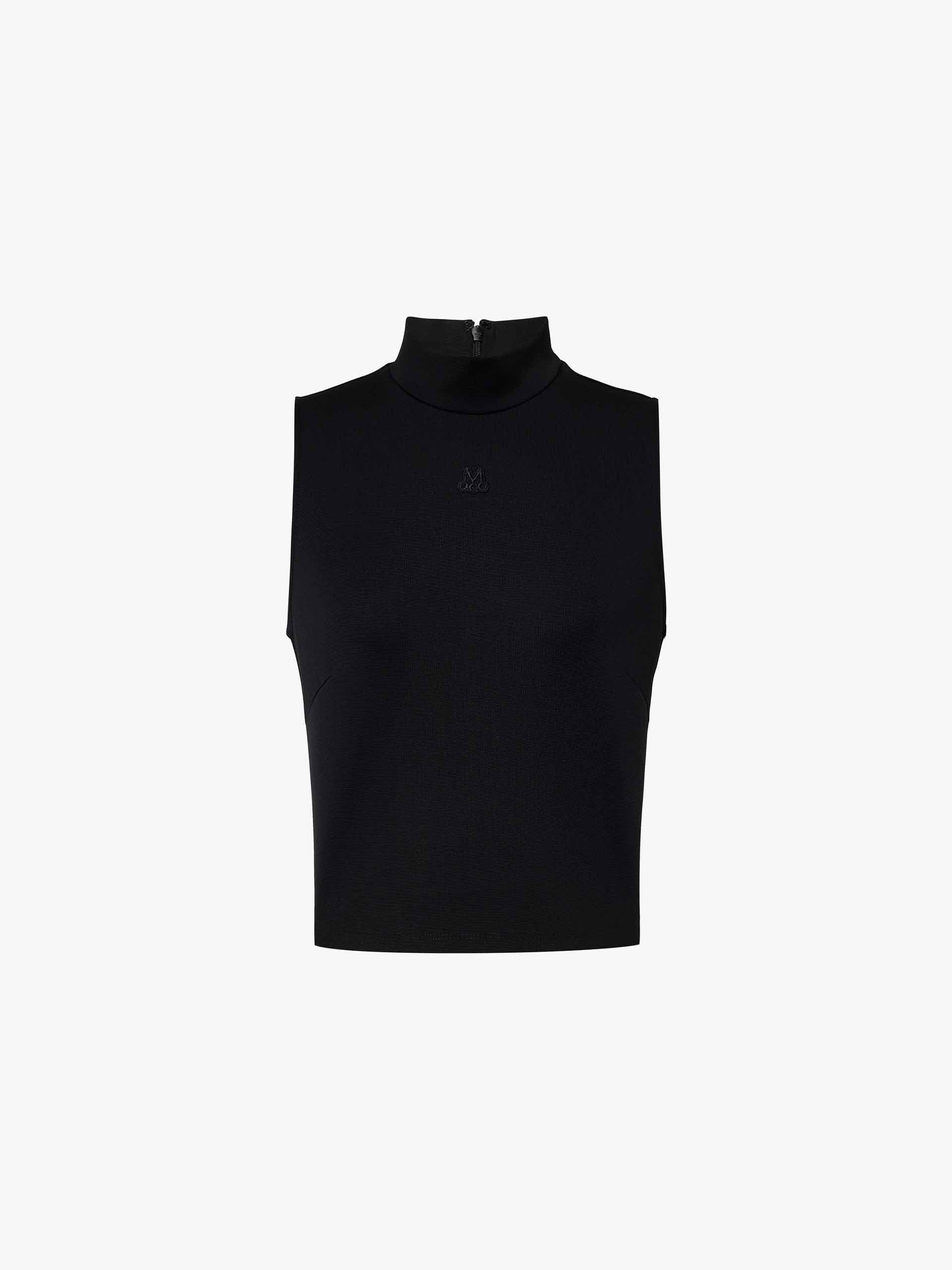 This sleeveless tank is crafted from a cozy stretchy knit fabric for ultimate comfort. It features a flattering stand collar and an invisible zipper at the back for a sleek, modern look. The slim fit and cropped length make it the perfect match for leather pants and layer it with a blazer.