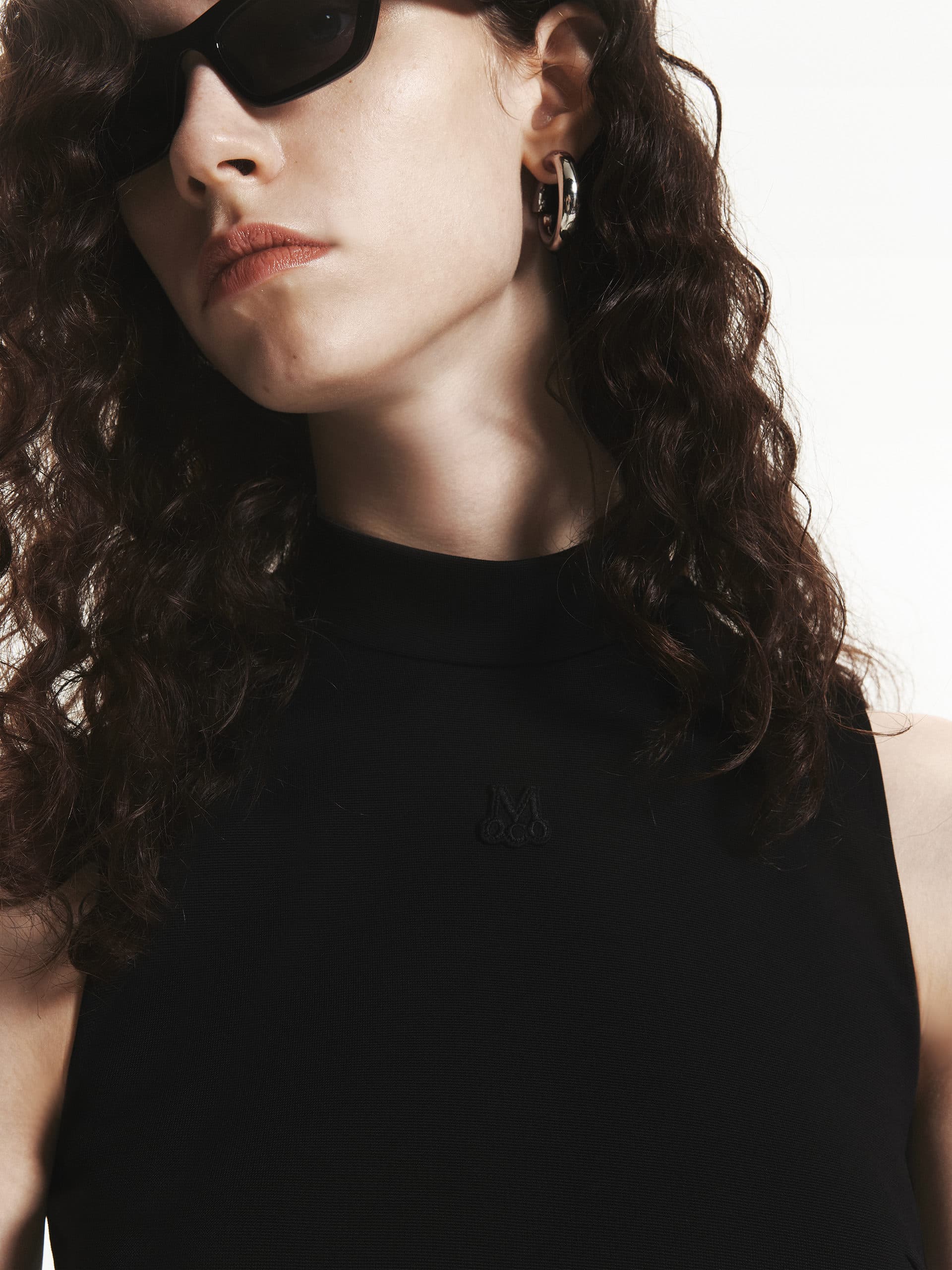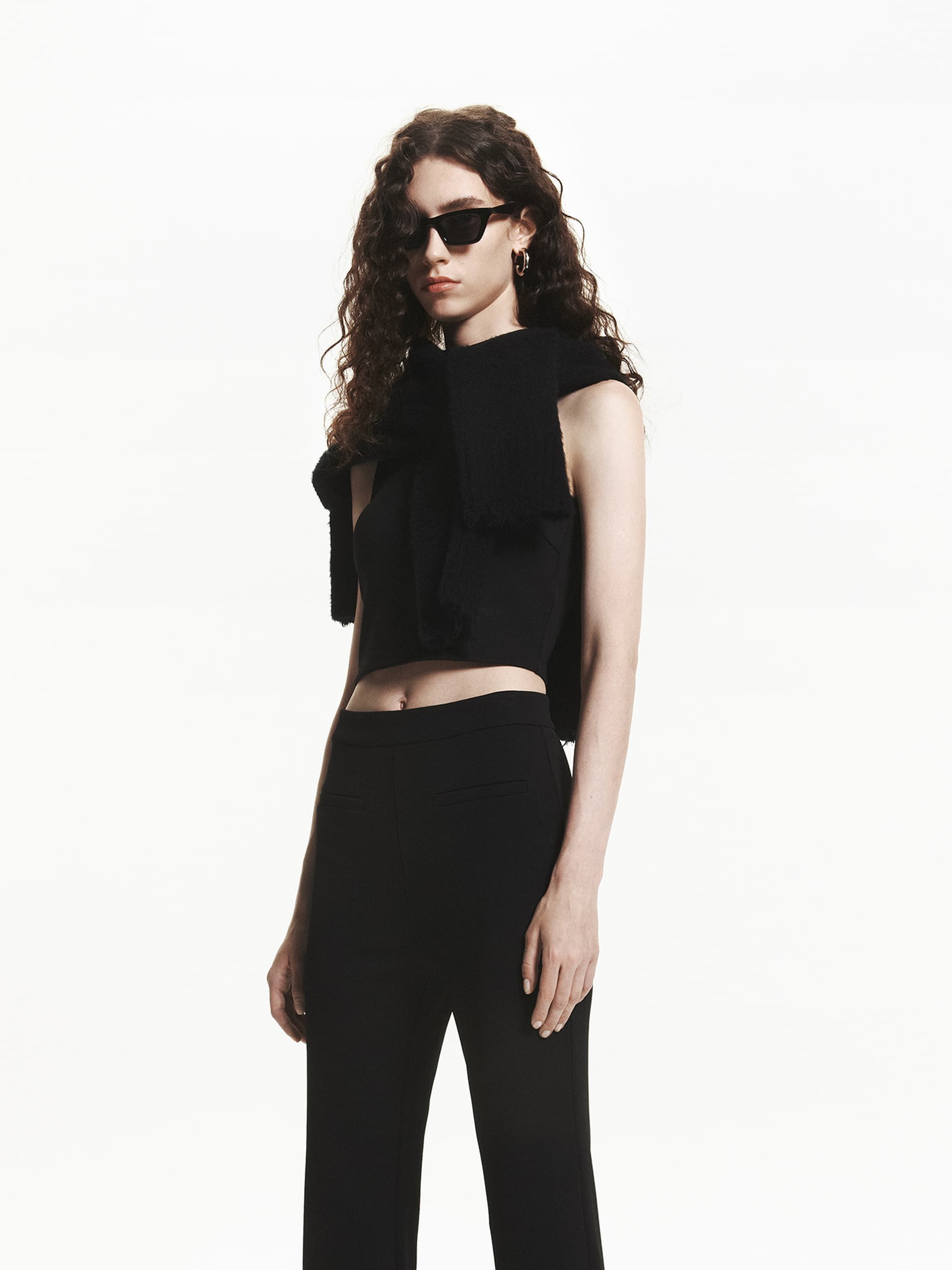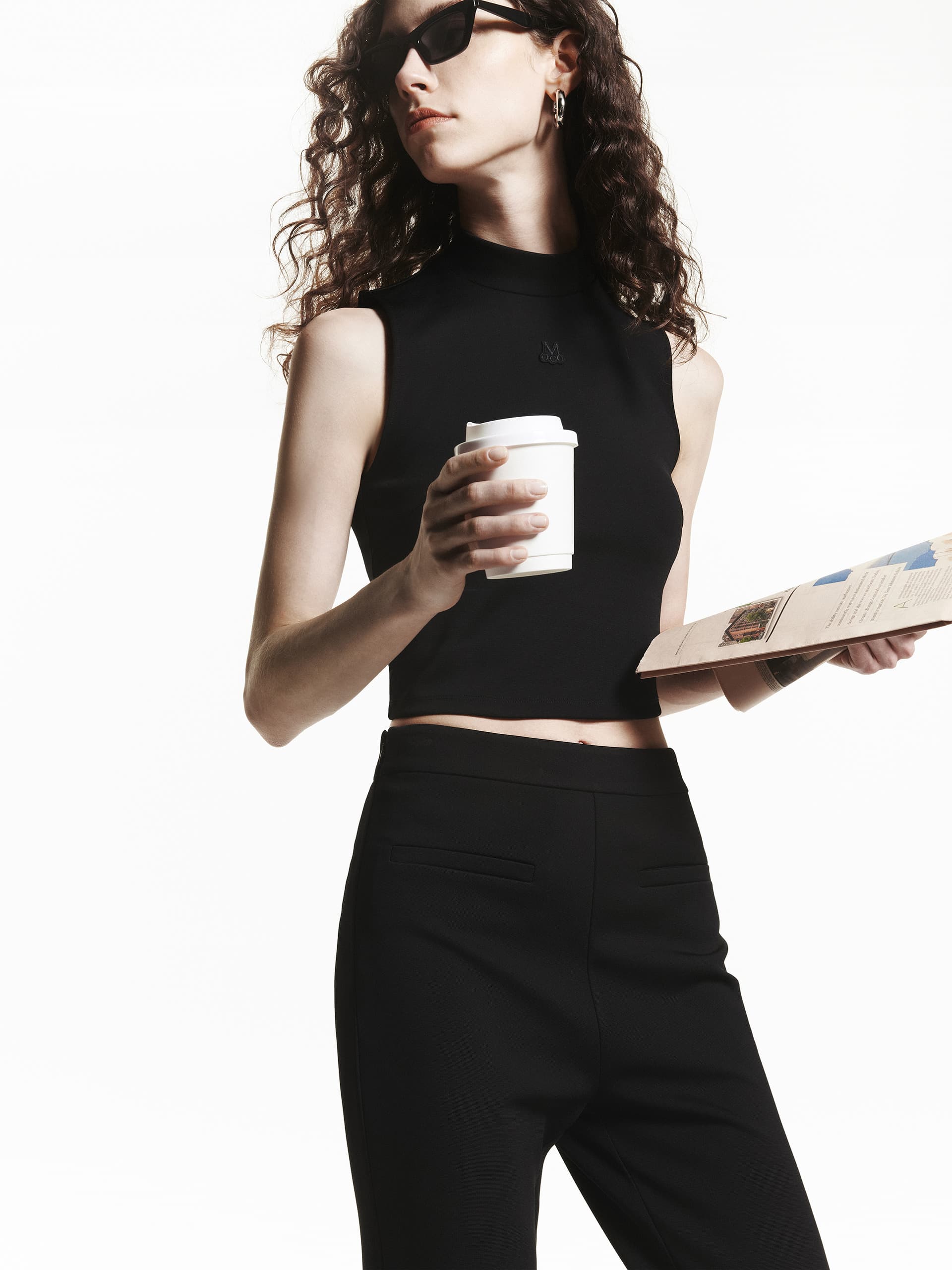 This sleeveless tank is crafted from a cozy stretchy knit fabric for ultimate comfort. It features a flattering stand collar and an invisible zipper at the back for a sleek, modern look. The slim fit and cropped length make it the perfect match for leather pants and layer it with a blazer.