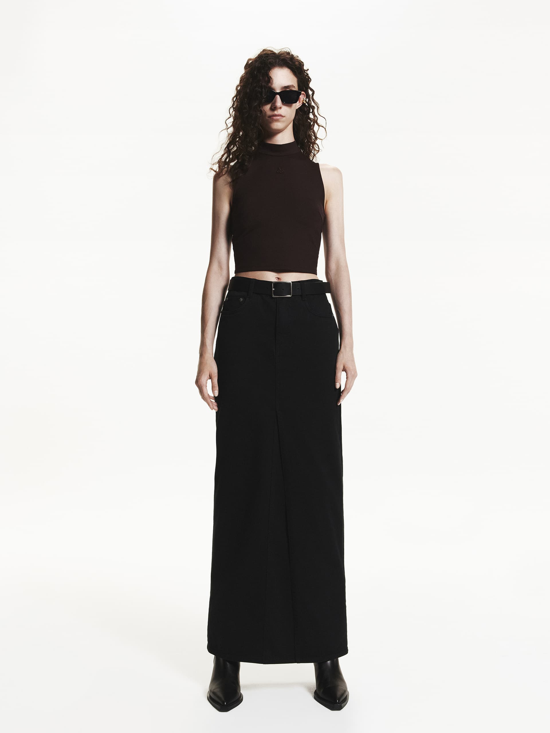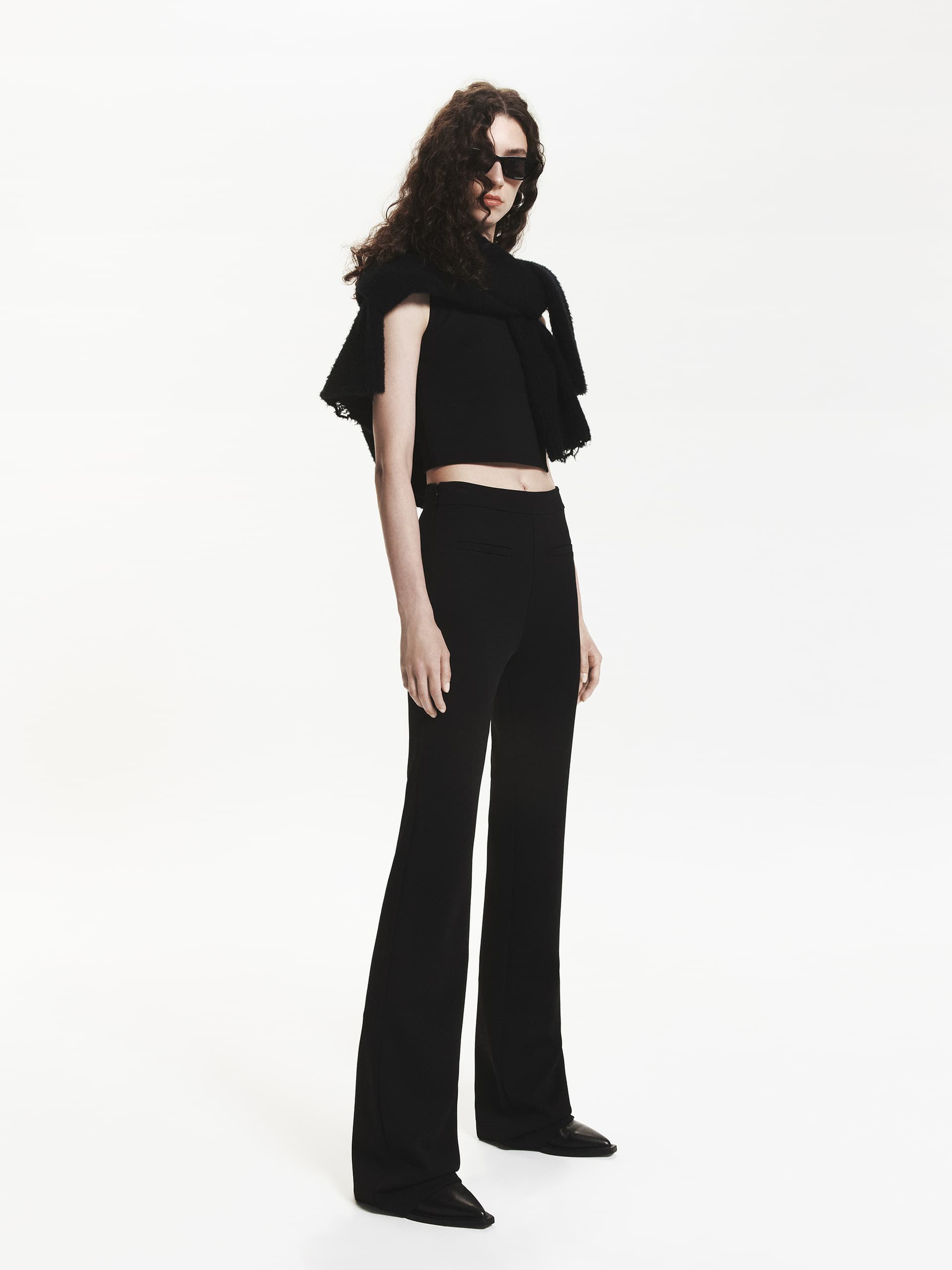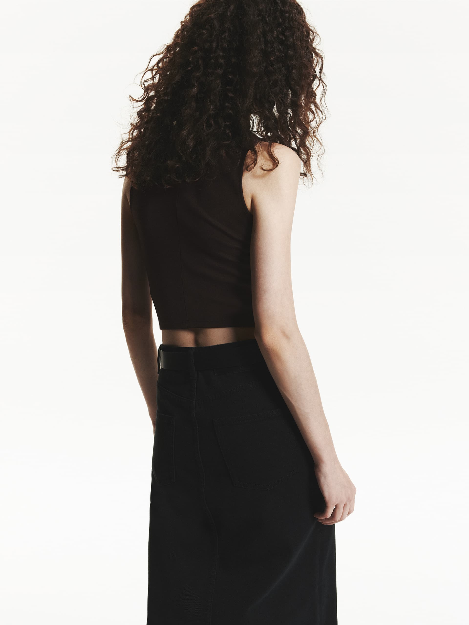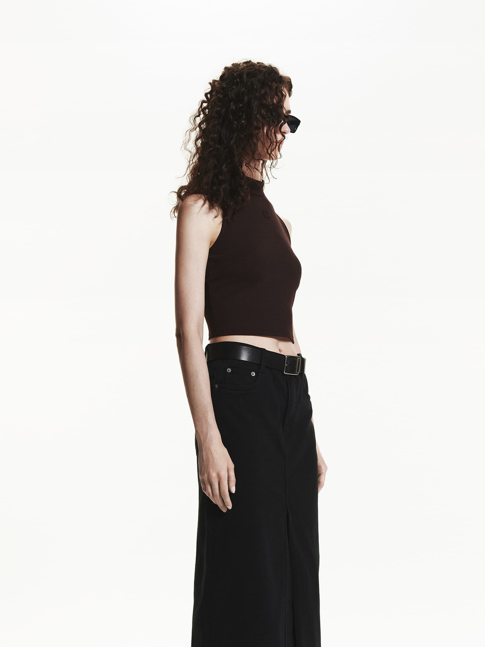 This sleeveless tank is crafted from a cozy stretchy knit fabric for ultimate comfort. It features a flattering stand collar and an invisible zipper at the back for a sleek, modern look. The slim fit and cropped length make it the perfect match for leather pants and layer it with a blazer.