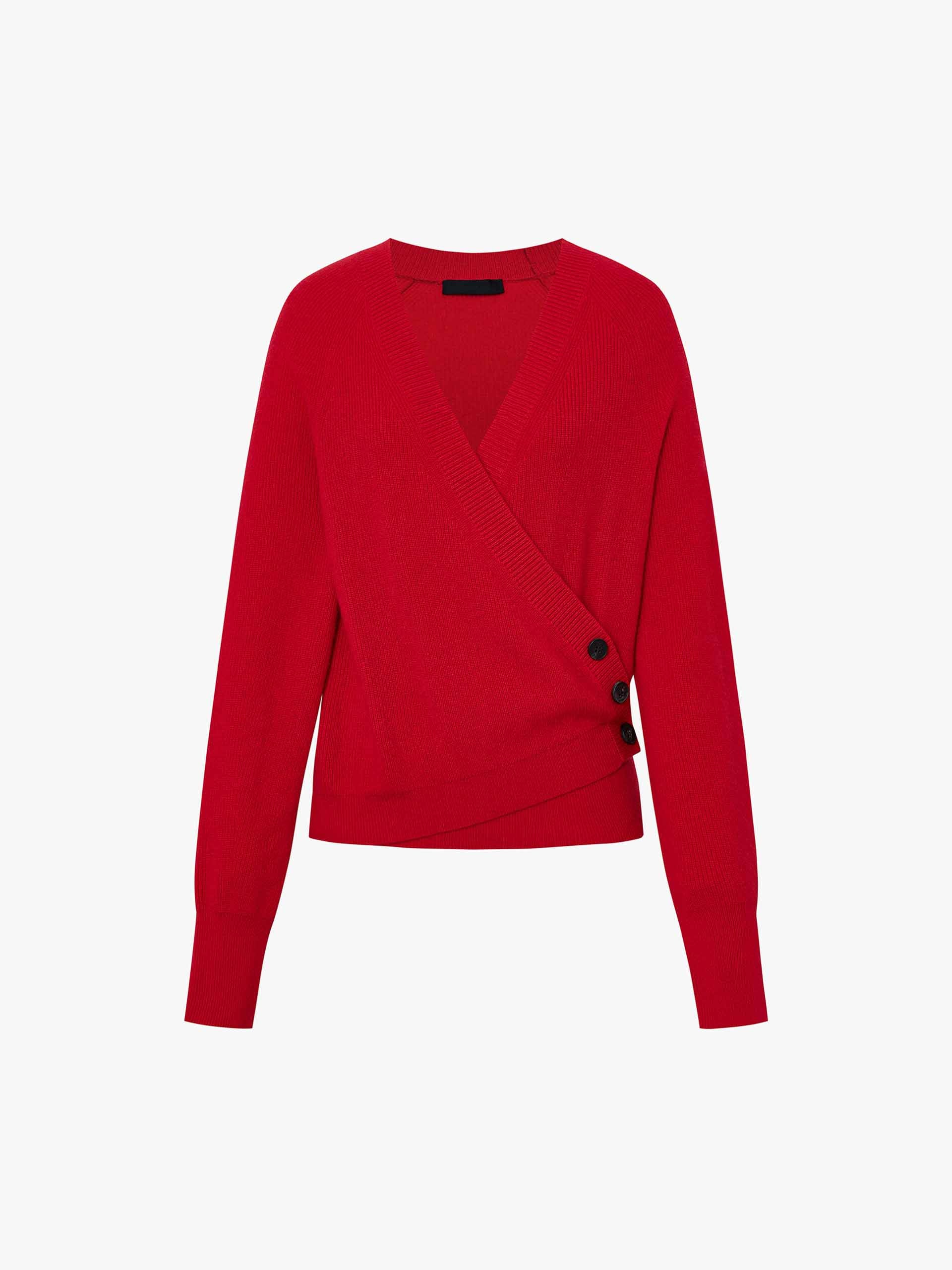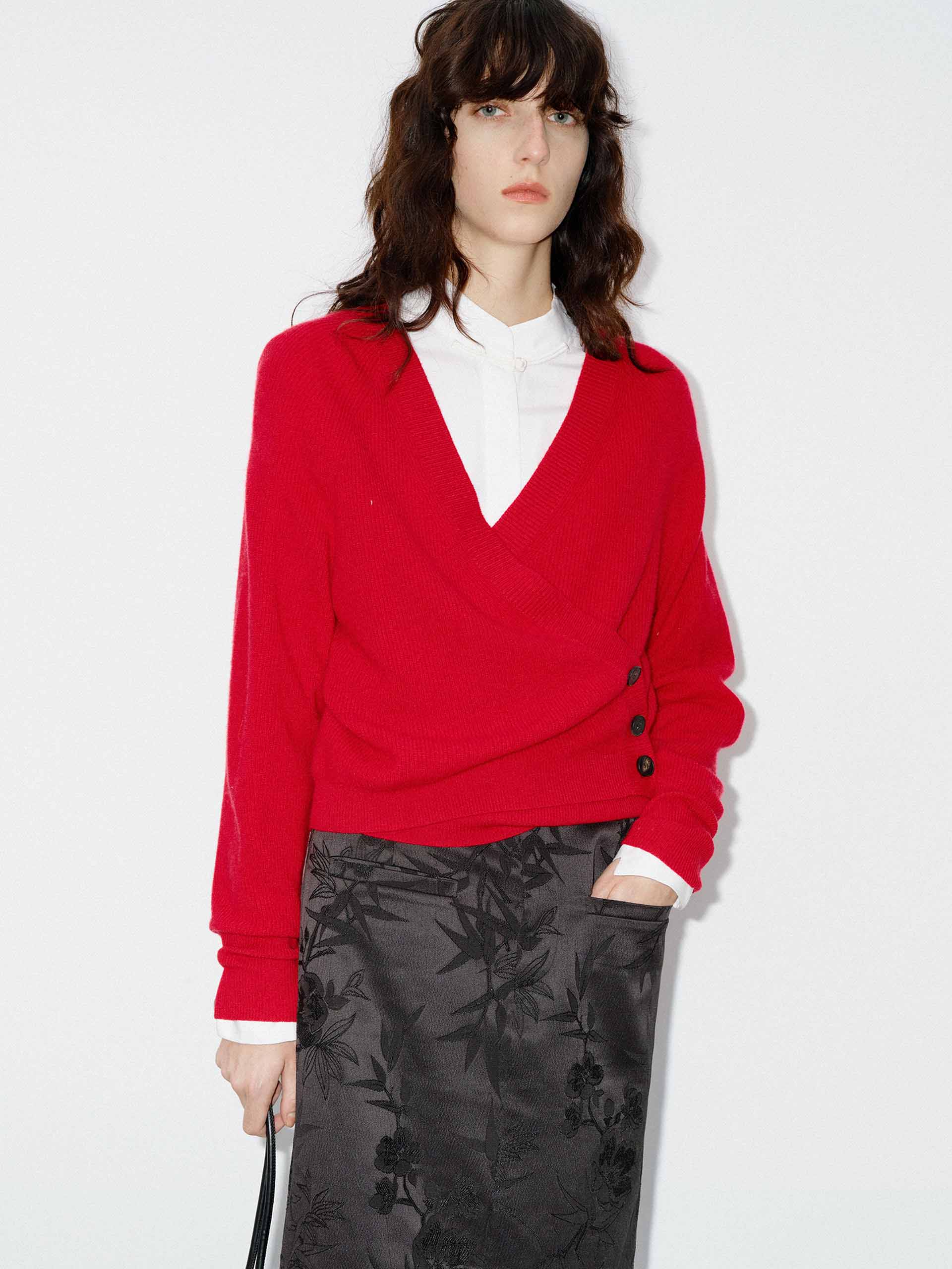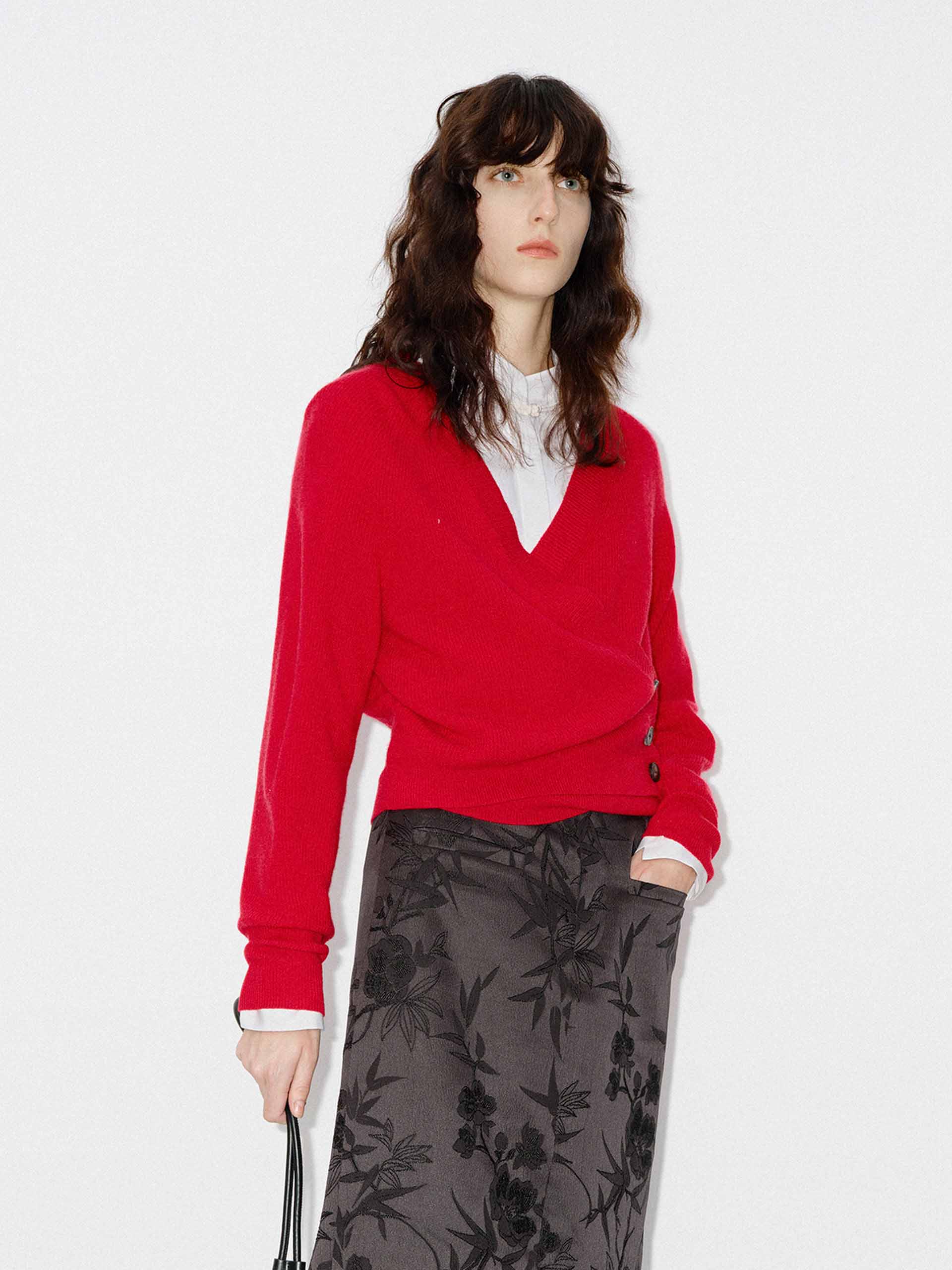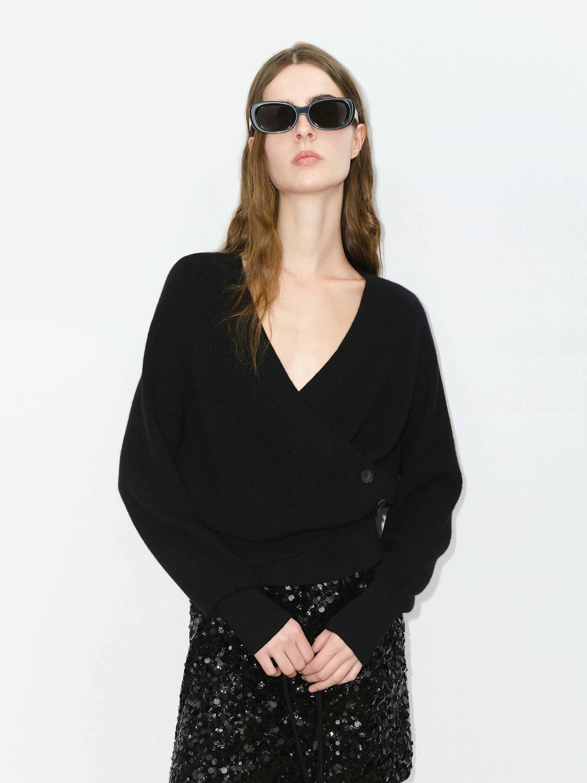 Expertly crafted from a luxurious blend of wool and cashmere, this sweater offers a soft and cozy feel against the skin. Features a V-neckline and close fit create a flattering silhouette, while the irregularly wrapped details add a unique and stylish touch.