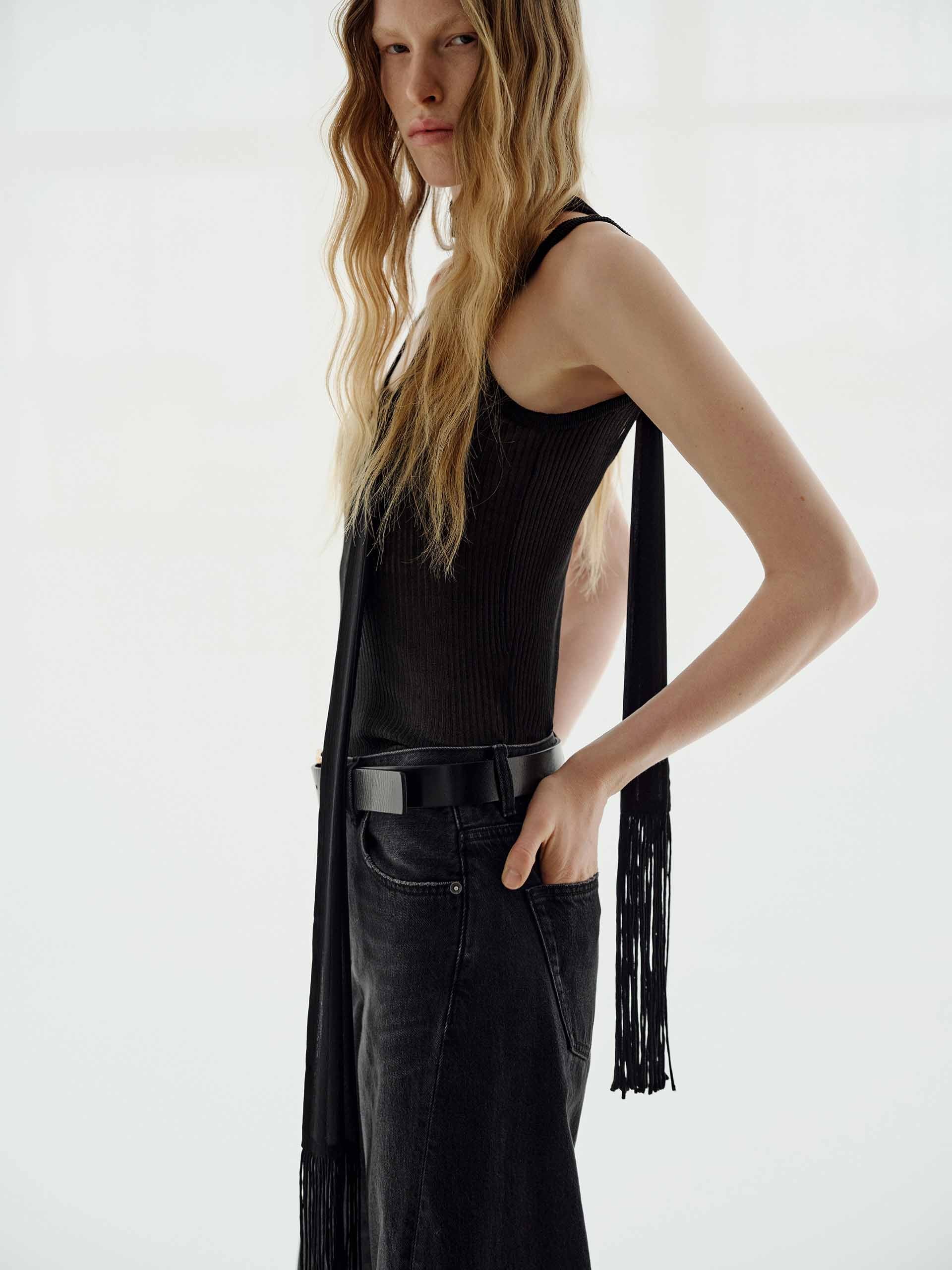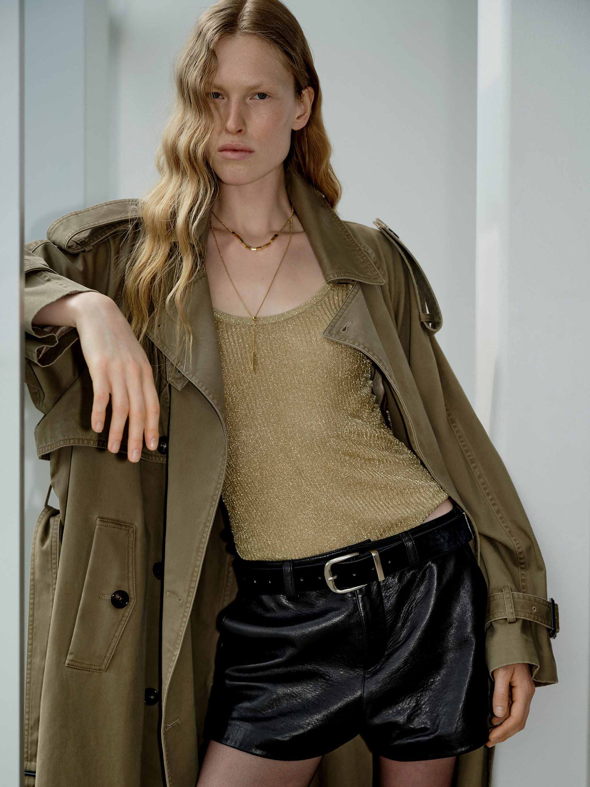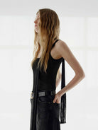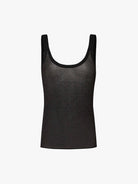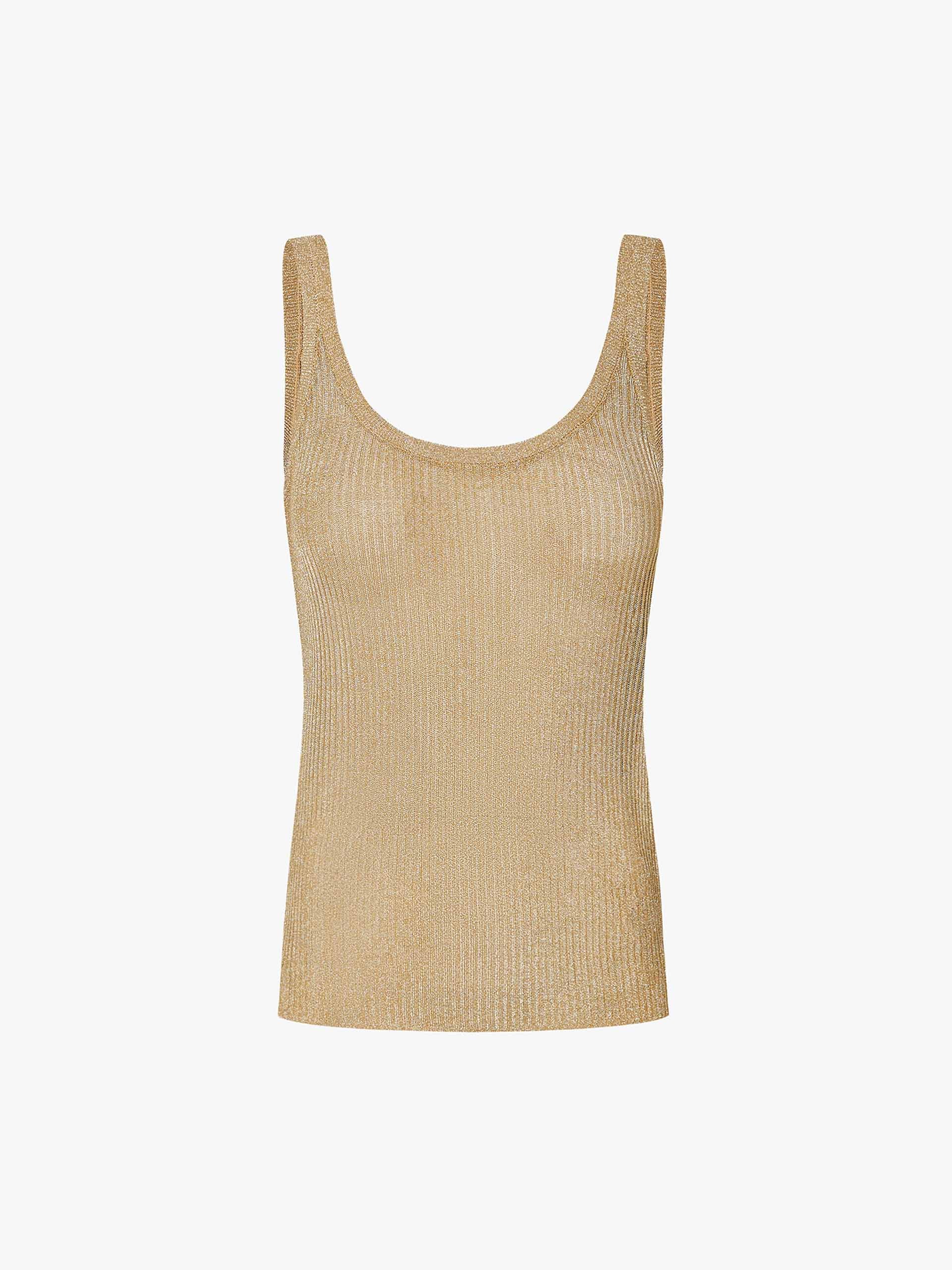 Shine with effortless glamour in our tank top, a sleek and luminous staple designed to elevate any ensemble. Crafted from metallic fabric, this tank creates a mesmerizing shiny effect. The slim fit hugs your curves gracefully, while the flattering U-neckline and sleeveless cut highlight your collarbones and shoulders for a touch of understated allure.