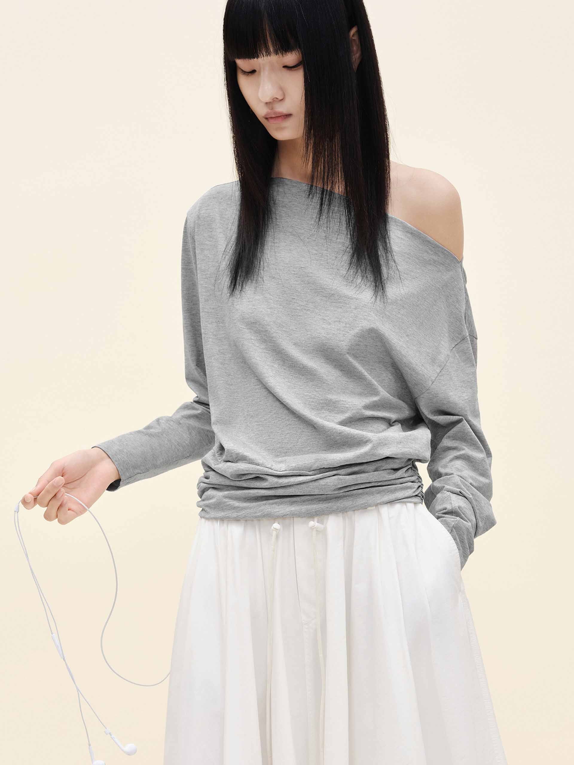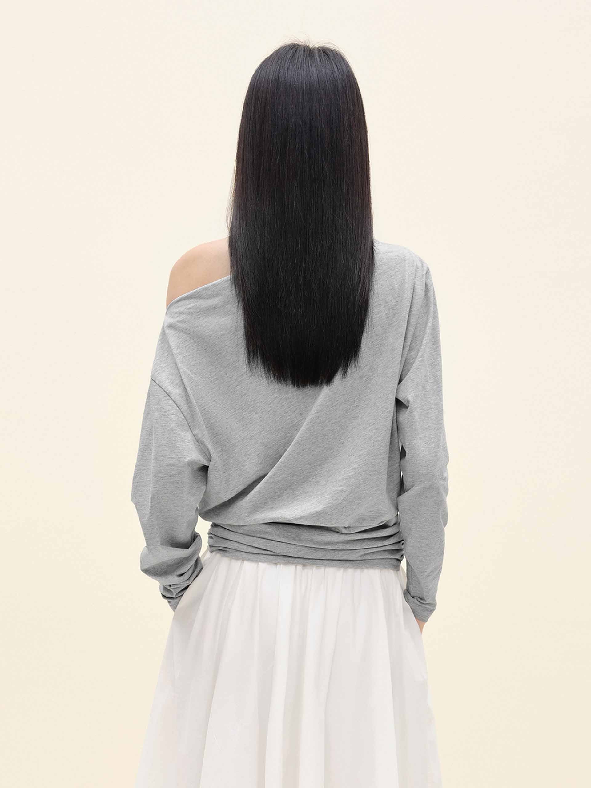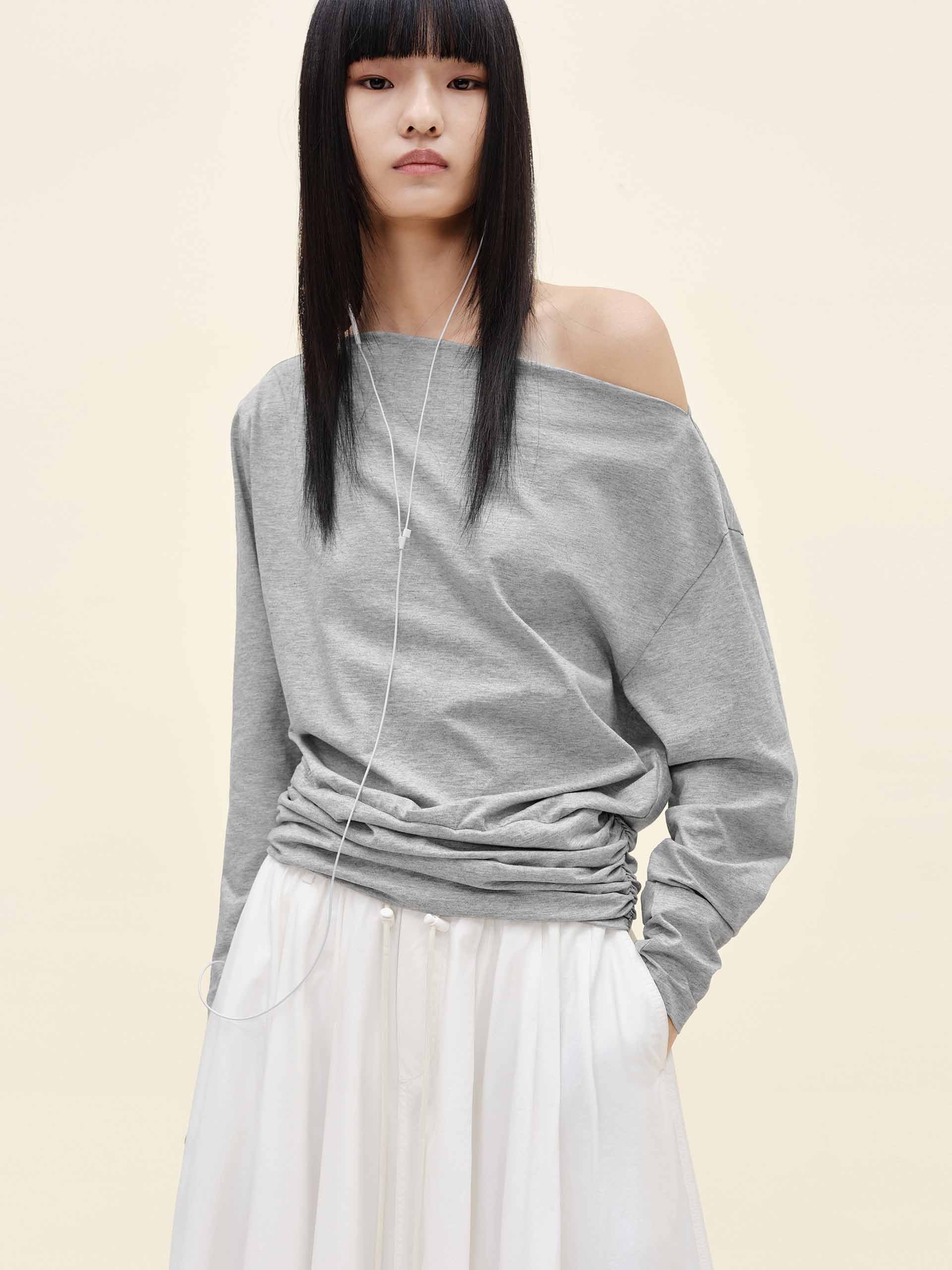 Embrace effortless allure with our t-shirt, a chic blend of relaxed comfort and sophisticated design. The statement off shoulder detail reveals a hint of skin for a touch of romantic elegance, while the long sleeves provide balance and versatility for layering. Adding a dynamic flourish, the pleated hem introduces texture and movement.