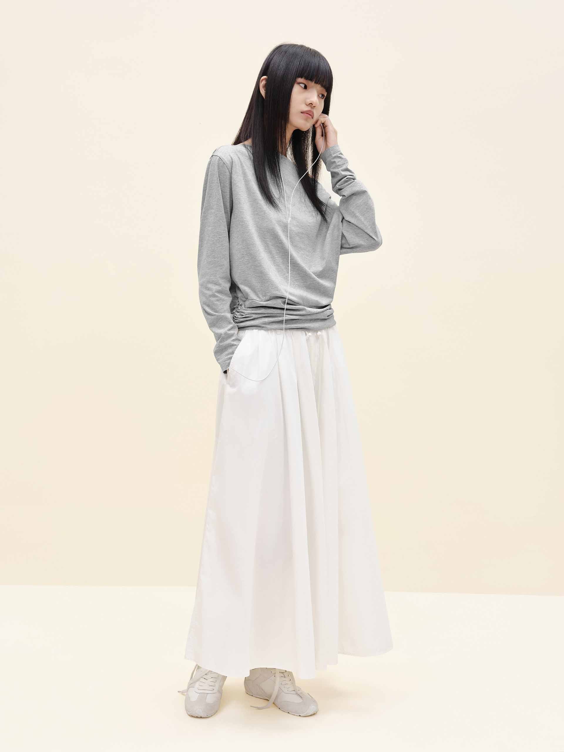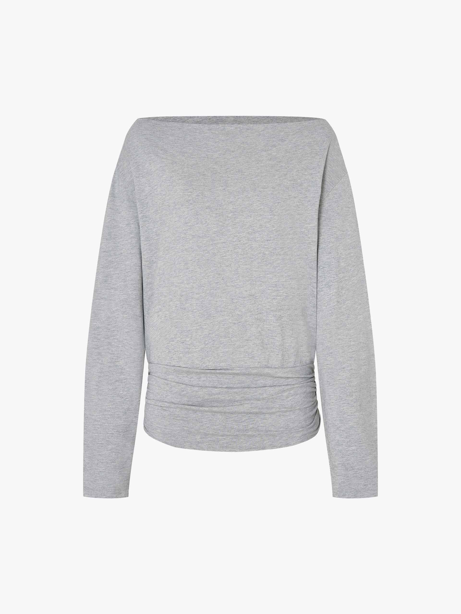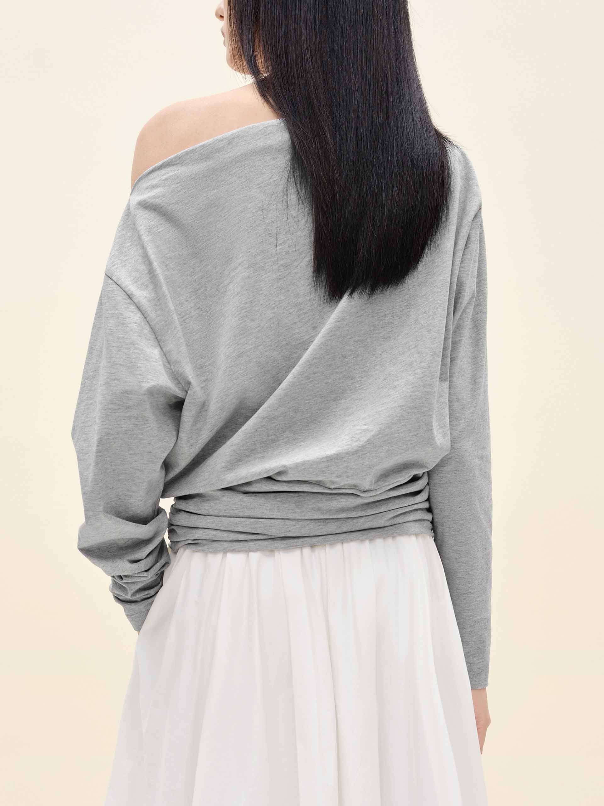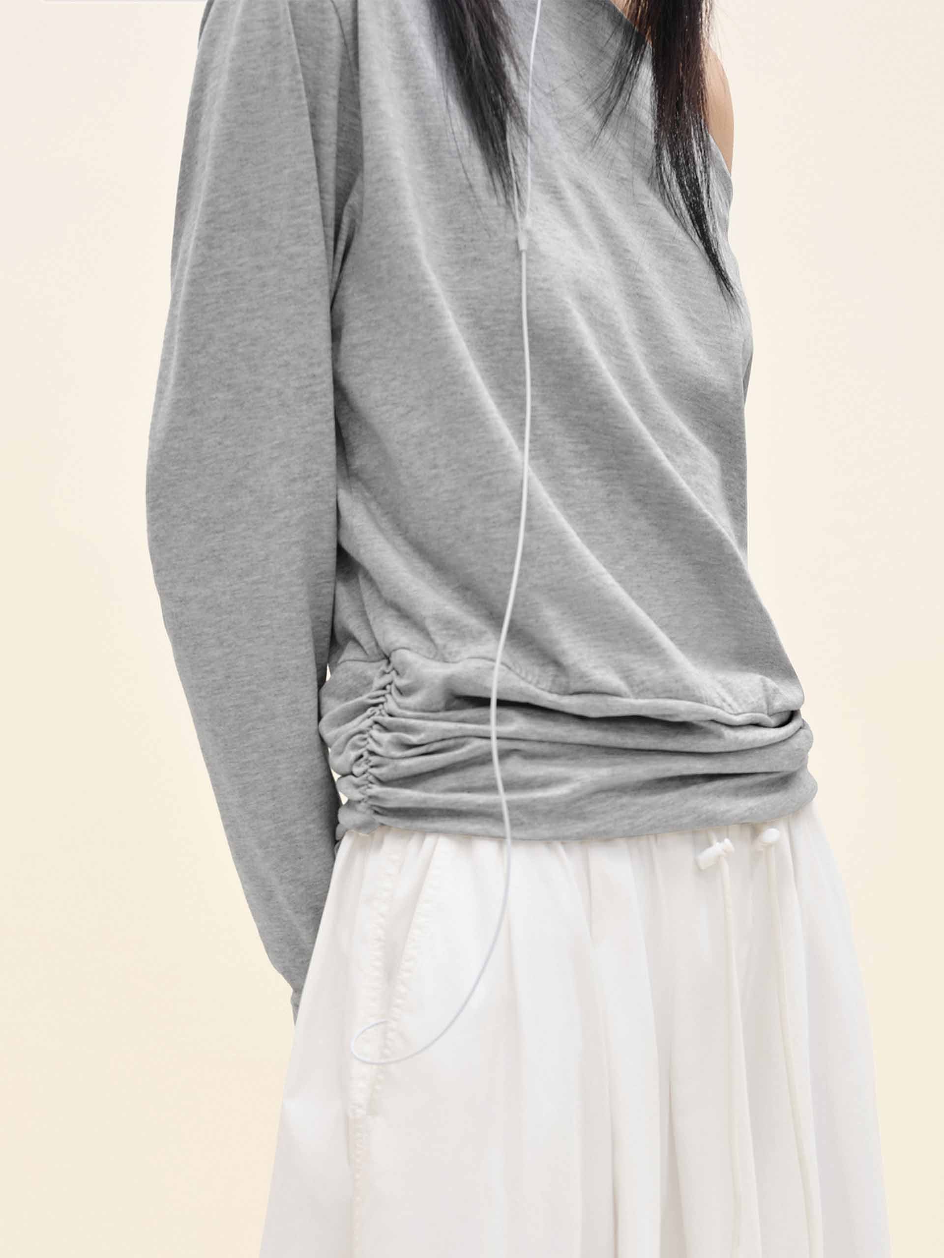 Embrace effortless allure with our t-shirt, a chic blend of relaxed comfort and sophisticated design. The statement off shoulder detail reveals a hint of skin for a touch of romantic elegance, while the long sleeves provide balance and versatility for layering. Adding a dynamic flourish, the pleated hem introduces texture and movement.