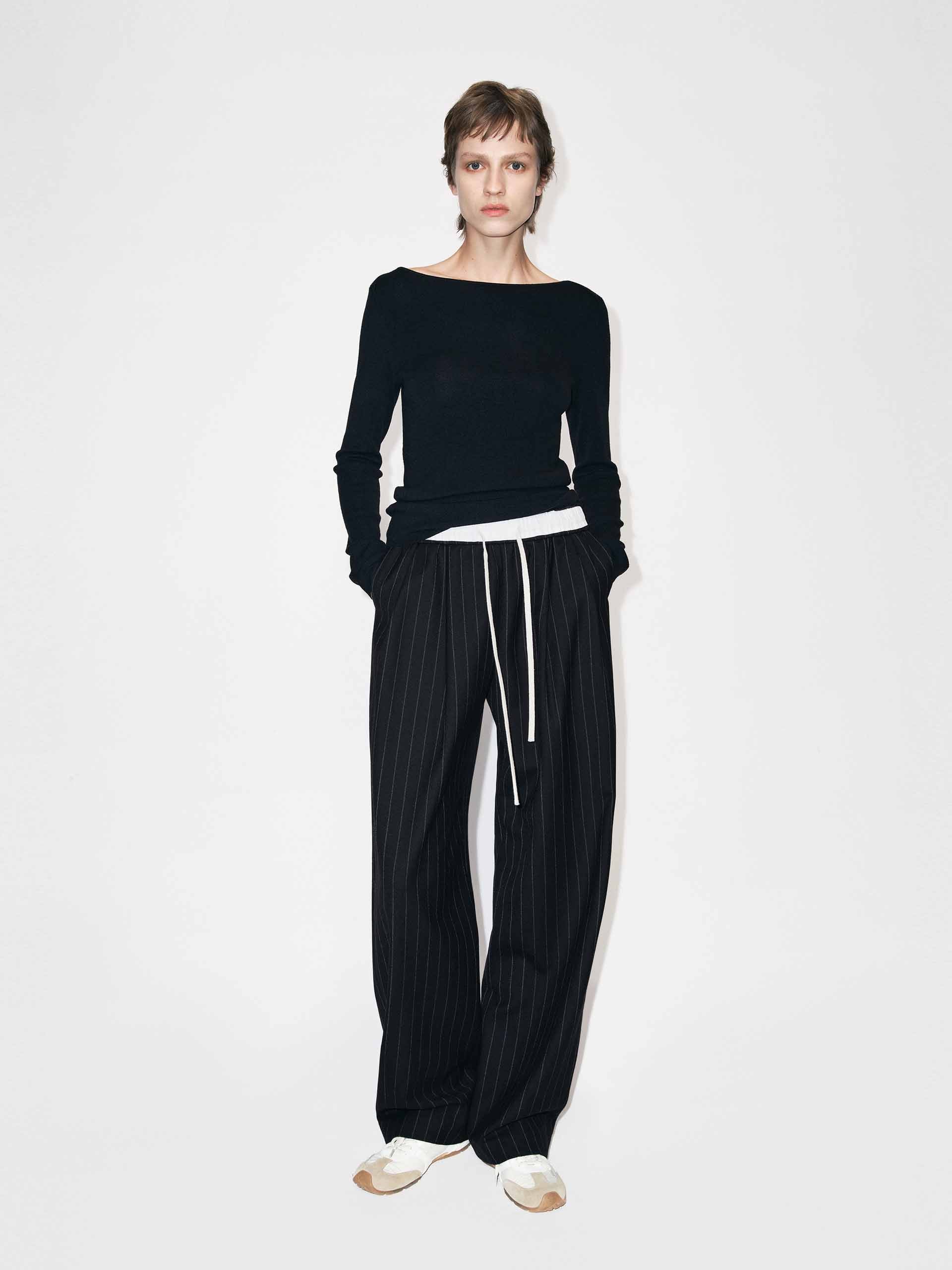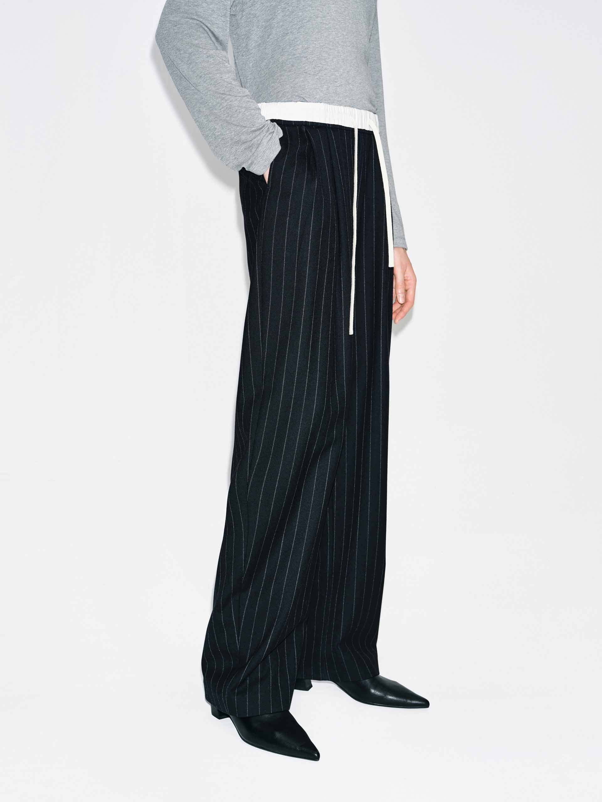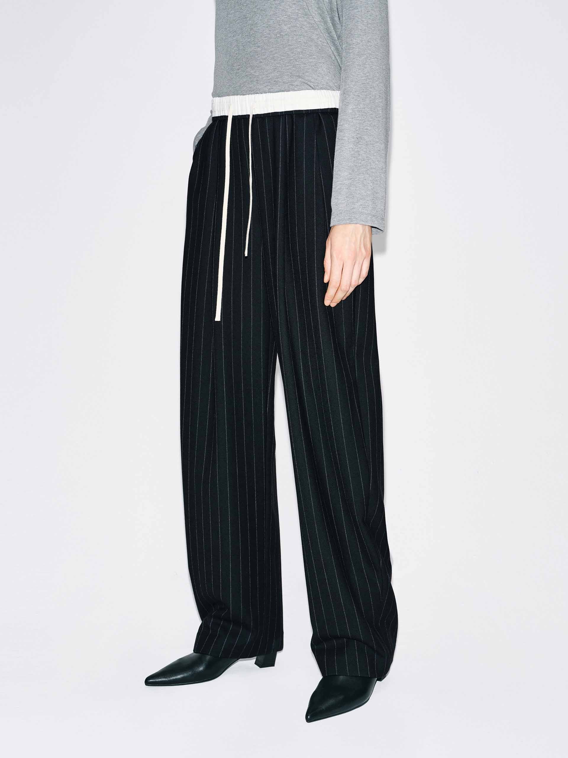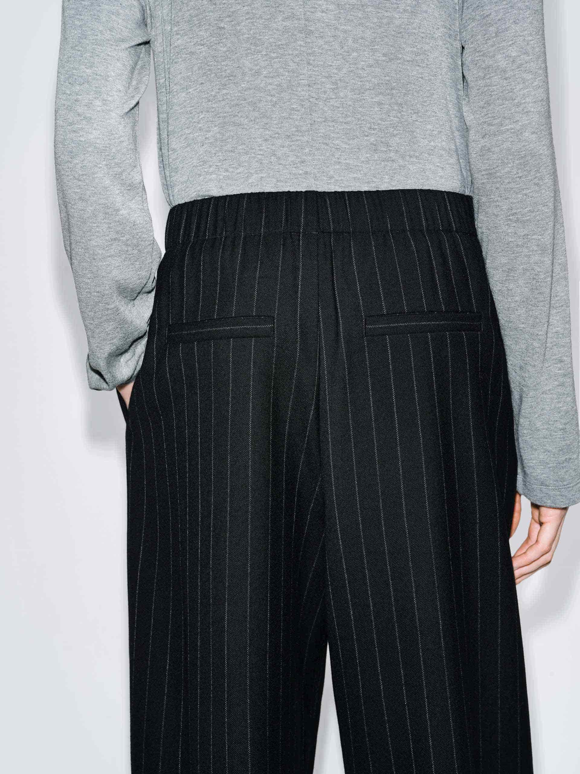 Crafted from 100% premium wool, these trousers masterfully blend tailored sophistication with relaxed comfort. The sharp, refined pinstripe pattern adds a touch of classic elegance, making them an ideal choice for modern polished looks. Practical yet stylish, they feature a layered elasticated waistband with an adjustable drawstring for a customizable, comfortable fit. Pair with the matching coat for a more sophisticated and charming look.