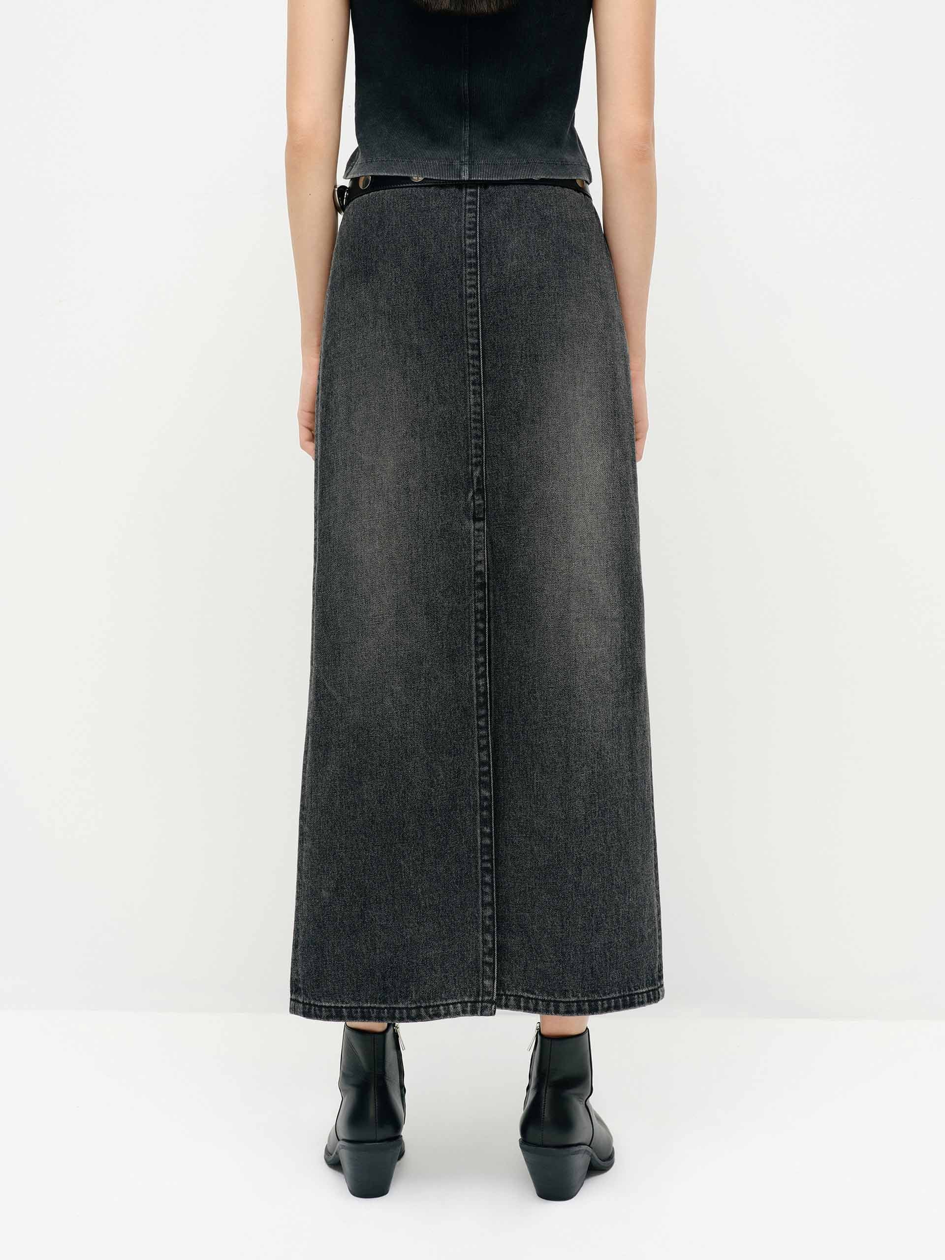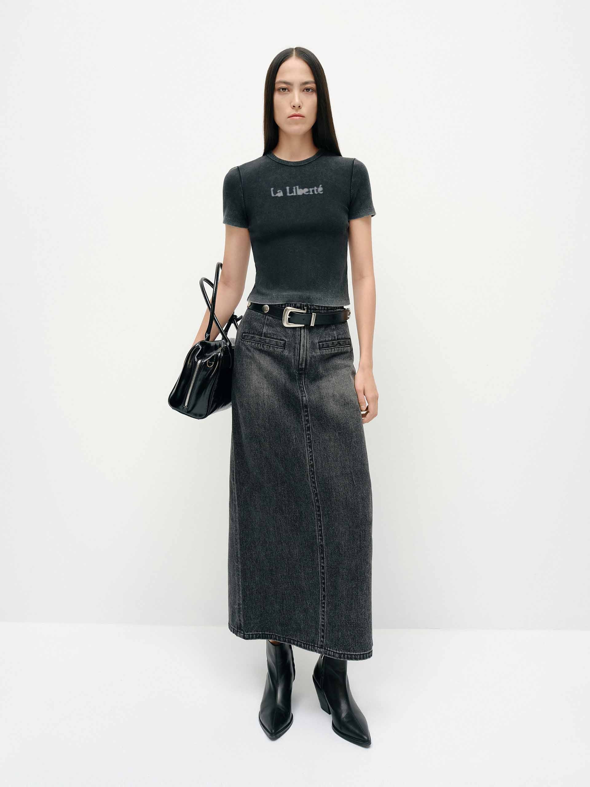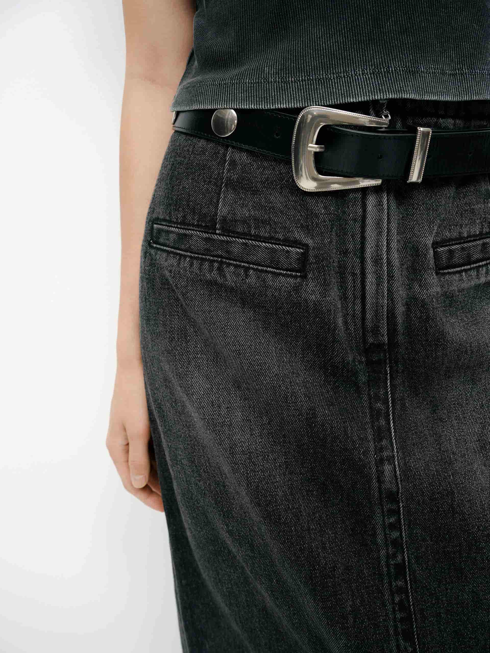 This timeless skirt is crafted from comfortable cotton, making it the perfect option for everyday wear. With its straight silhouette, zip closure, back slit design, and lightly faded black wash, this skirt effortlessly combines style and comfort. Pair it with our distressed T-shirts for a casual and chic look. Please note, the waist belt is not included.