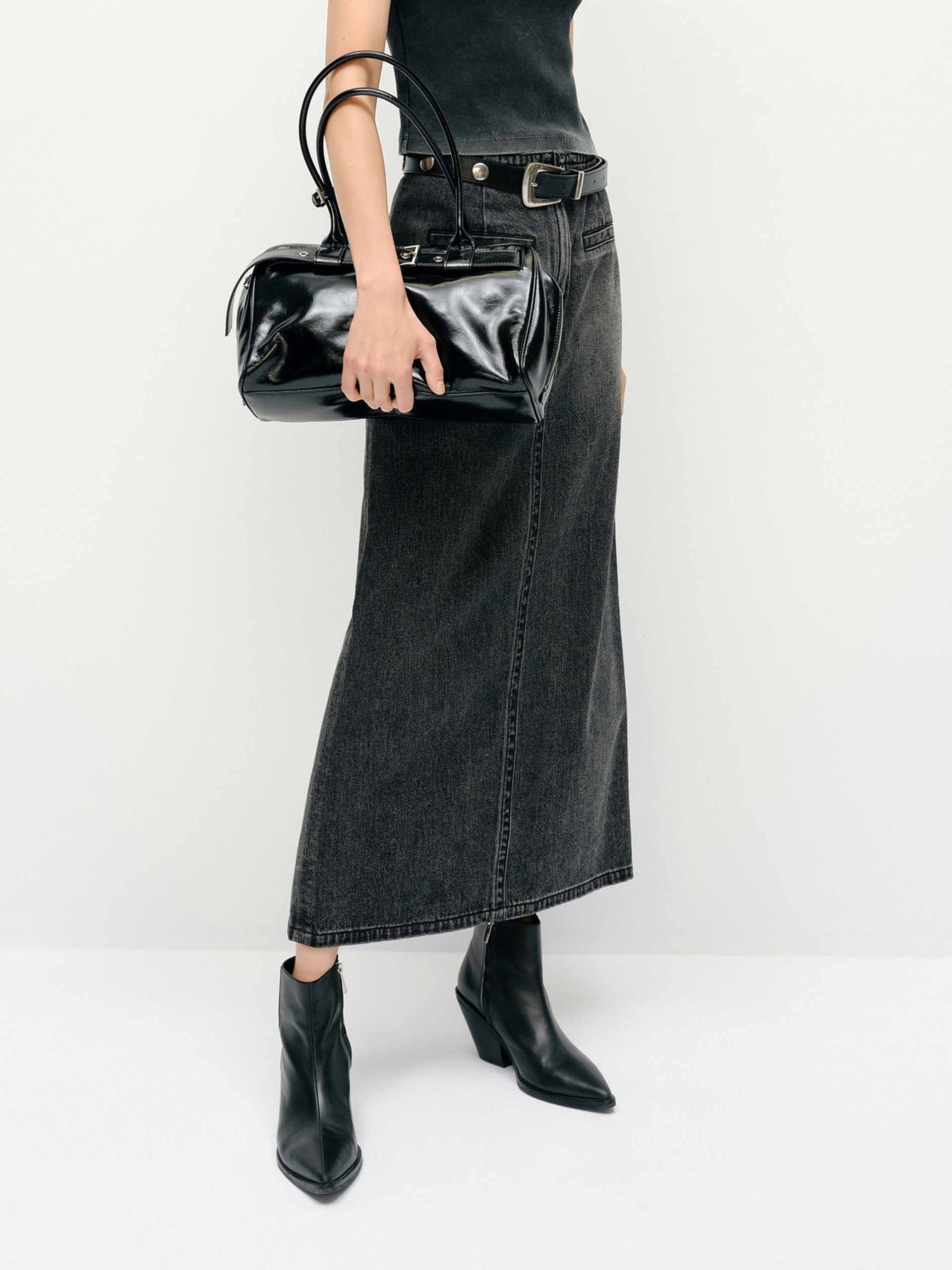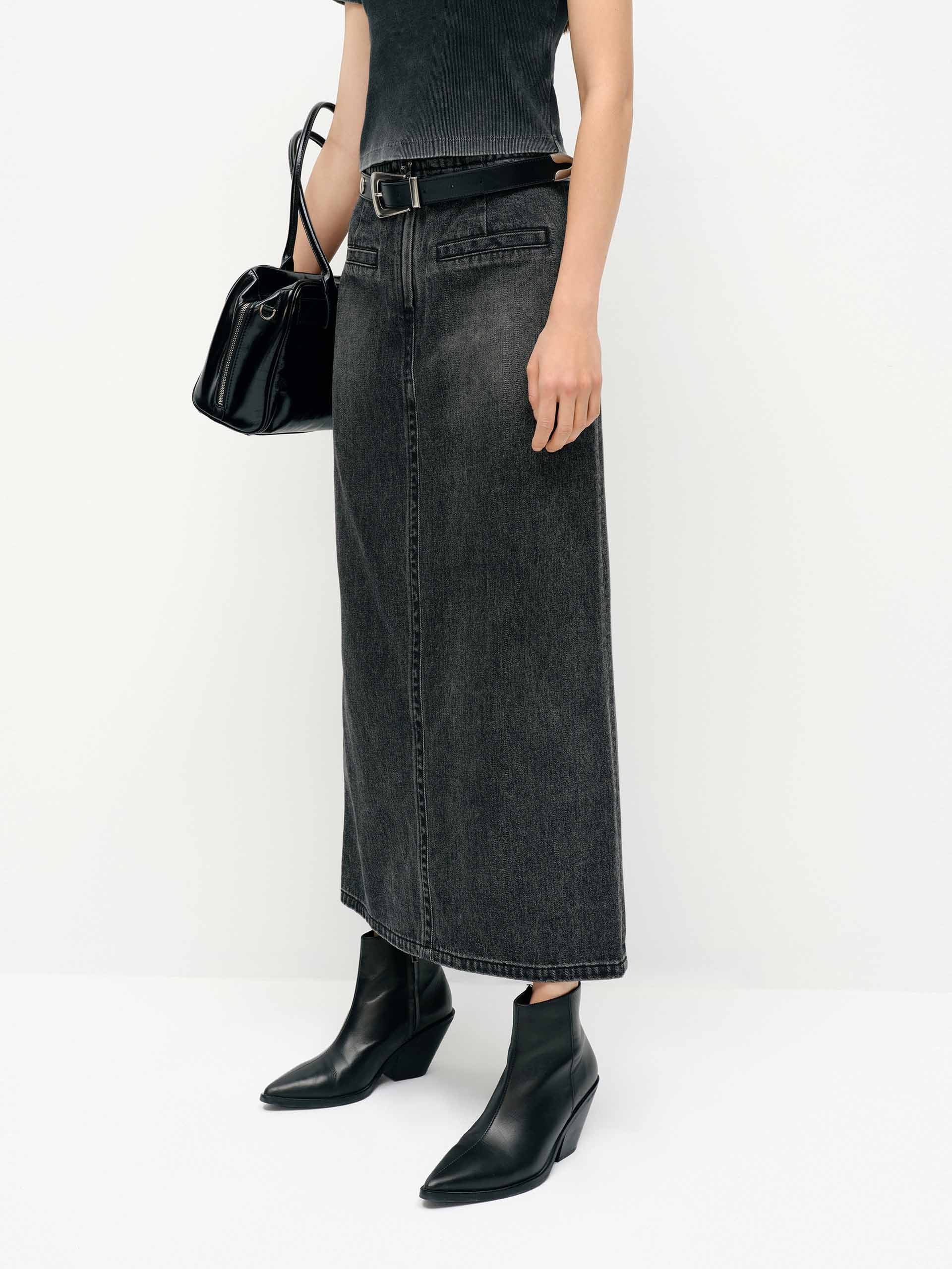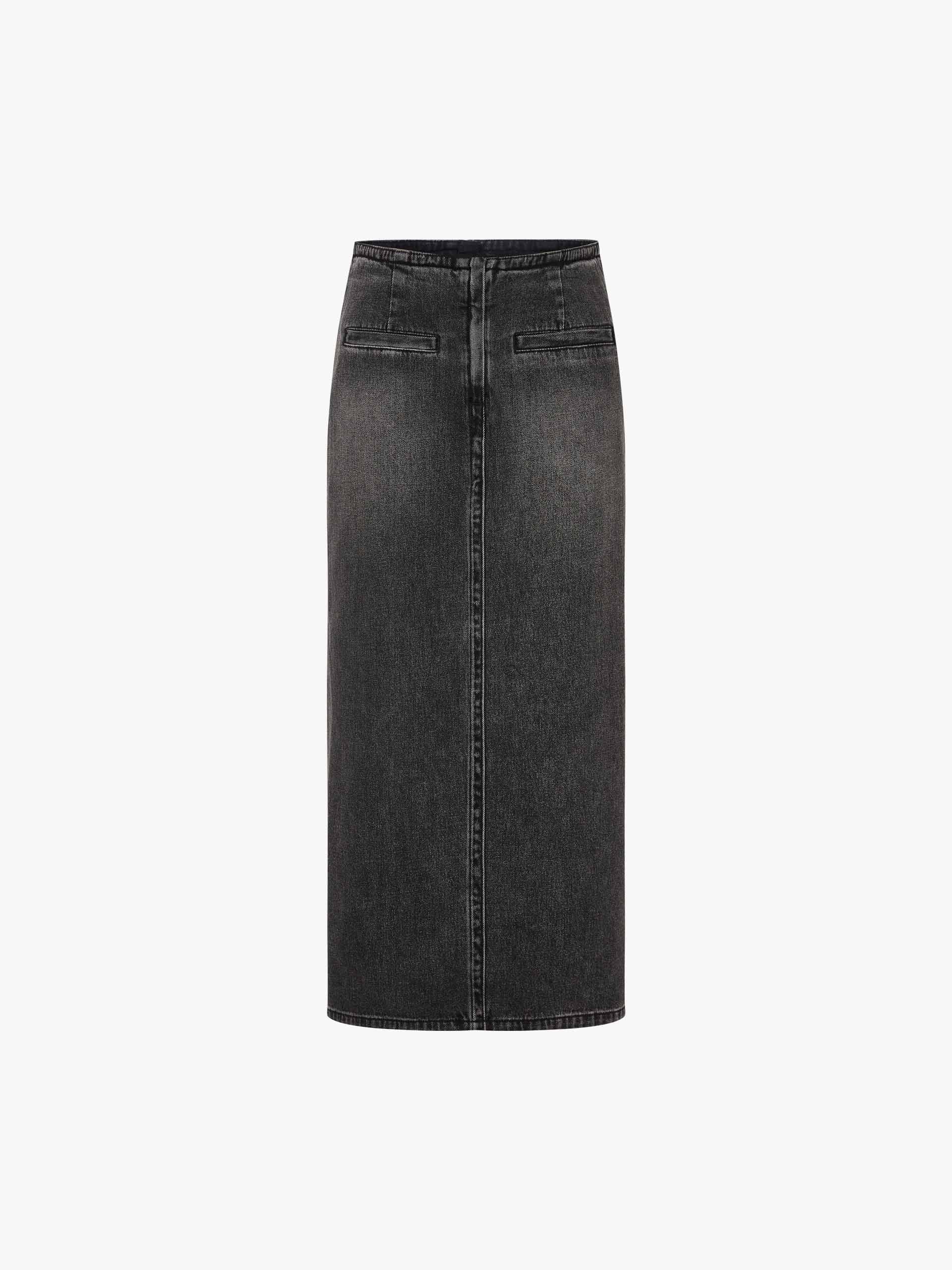 This timeless skirt is crafted from comfortable cotton, making it the perfect option for everyday wear. With its straight silhouette, zip closure, back slit design, and lightly faded black wash, this skirt effortlessly combines style and comfort. Pair it with our distressed T-shirts for a casual and chic look. Please note, the waist belt is not included.