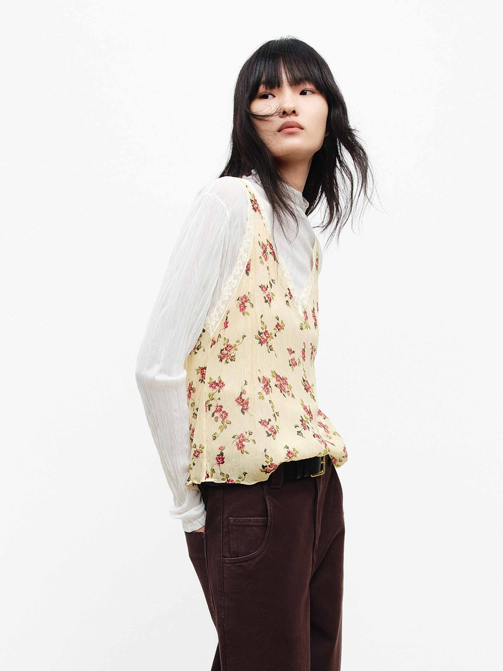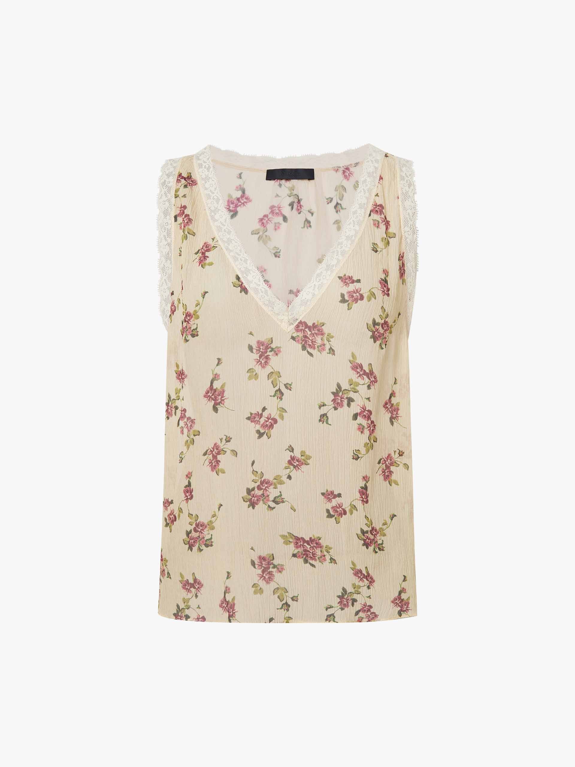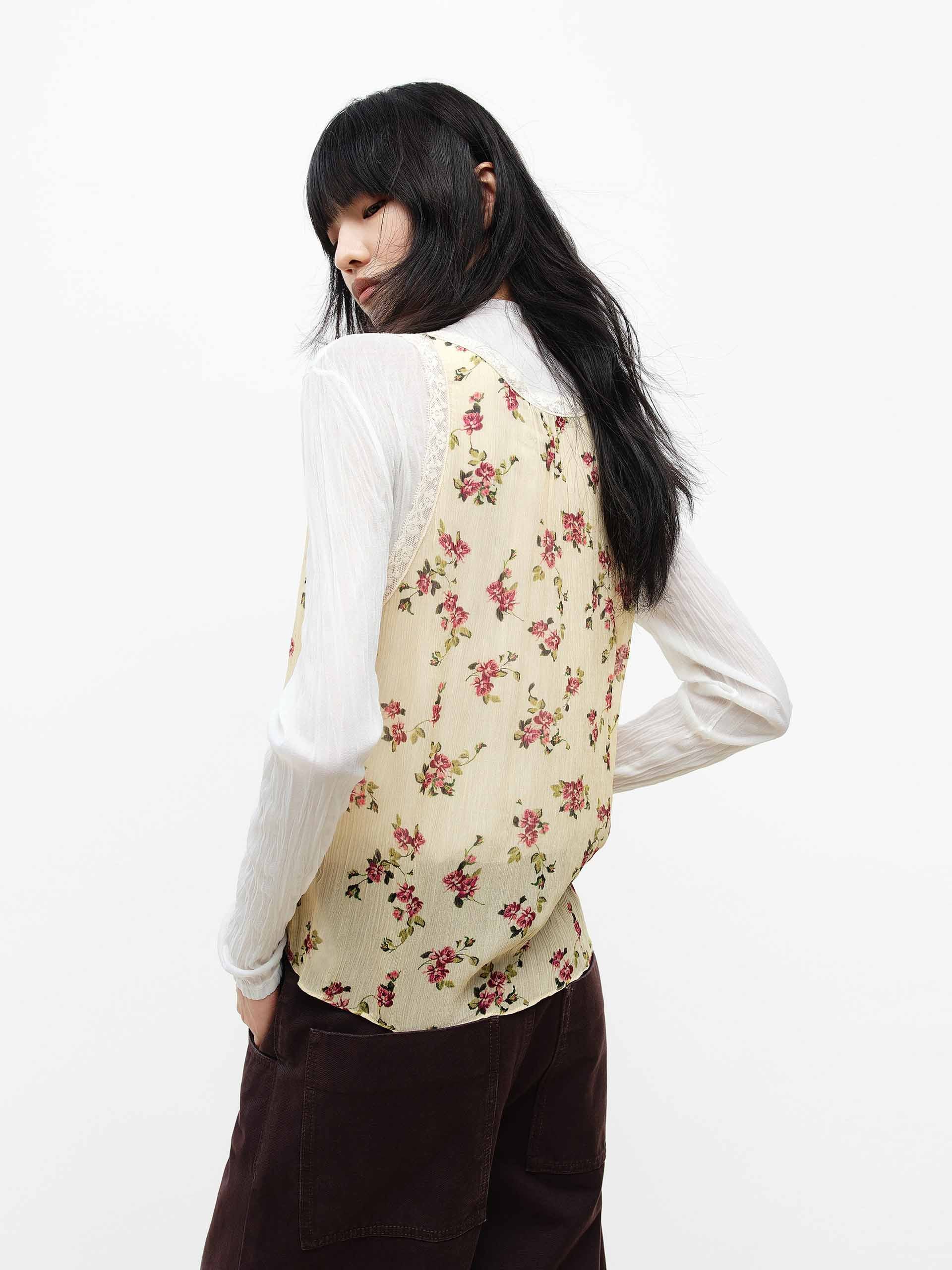 This tank features a retro floral pattern, paired with a V-neck and lace trim detailing, making it an ideal layering piece for spring. Its sleeveless design and regular fit allow it to be styled over a blouse or worn alone, adding a vibrant touch to your spring wardrobe.