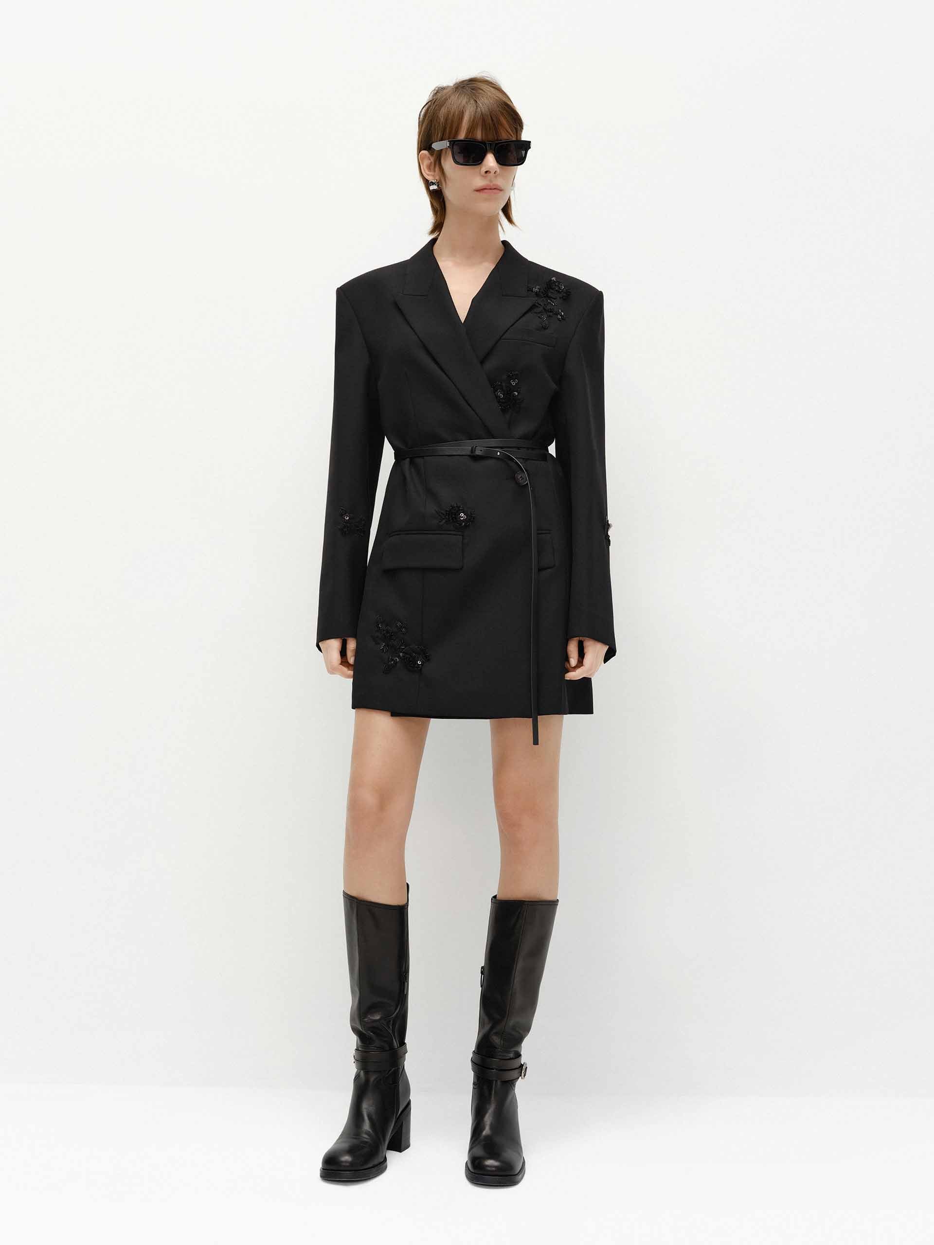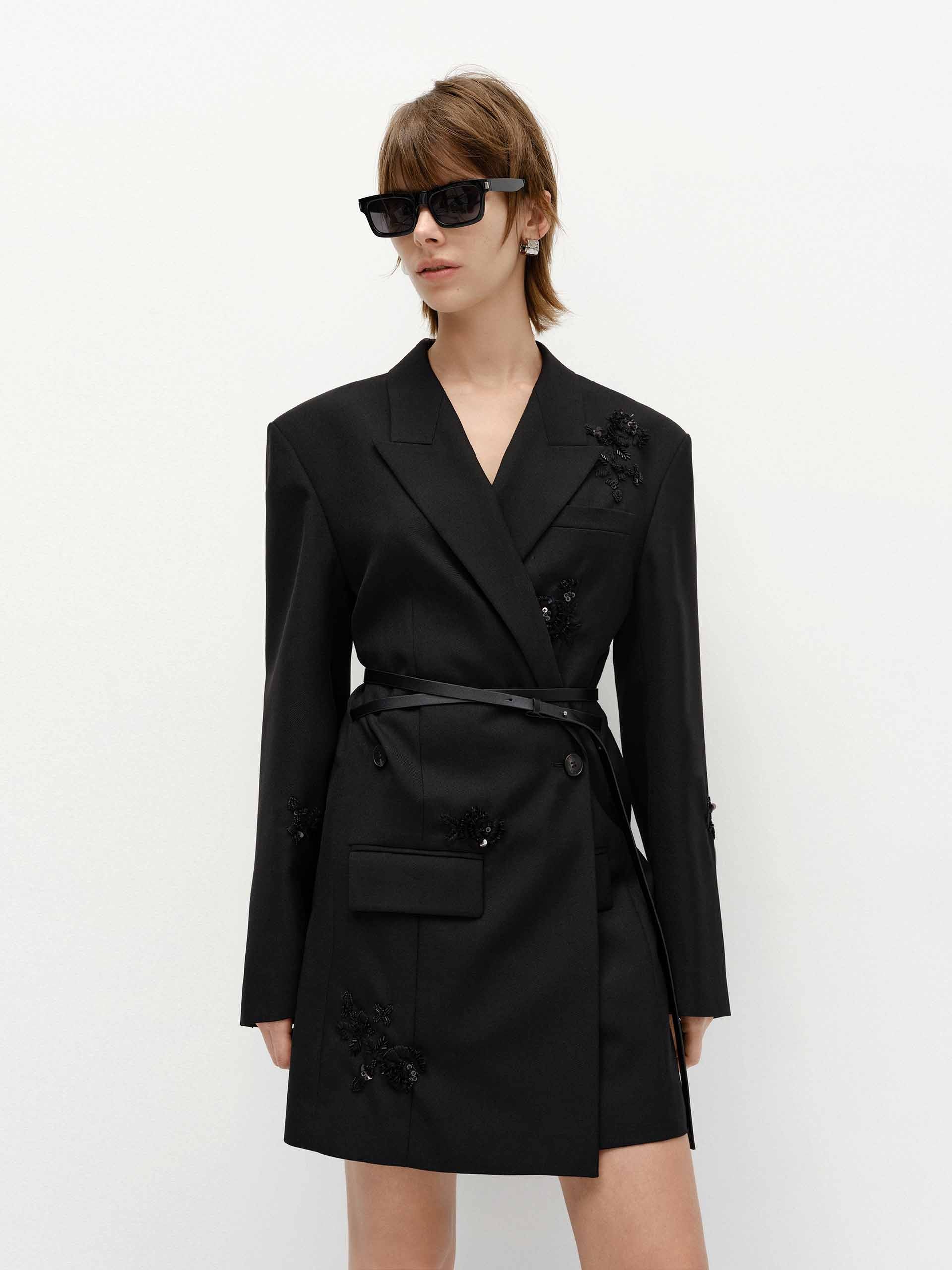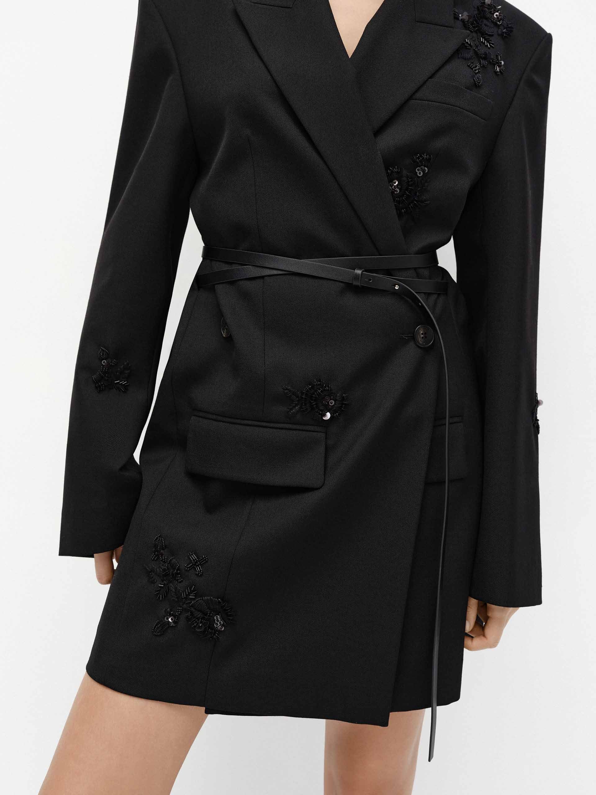 Made from a luxurious wool blend, this dress is cut in a blazer silhouette with a flattering mini length. The slanted placket wrap design adds a touch of sophistication, while the sparkling sequin details add a hint of glamour. Perfect for any special occasion or night out.