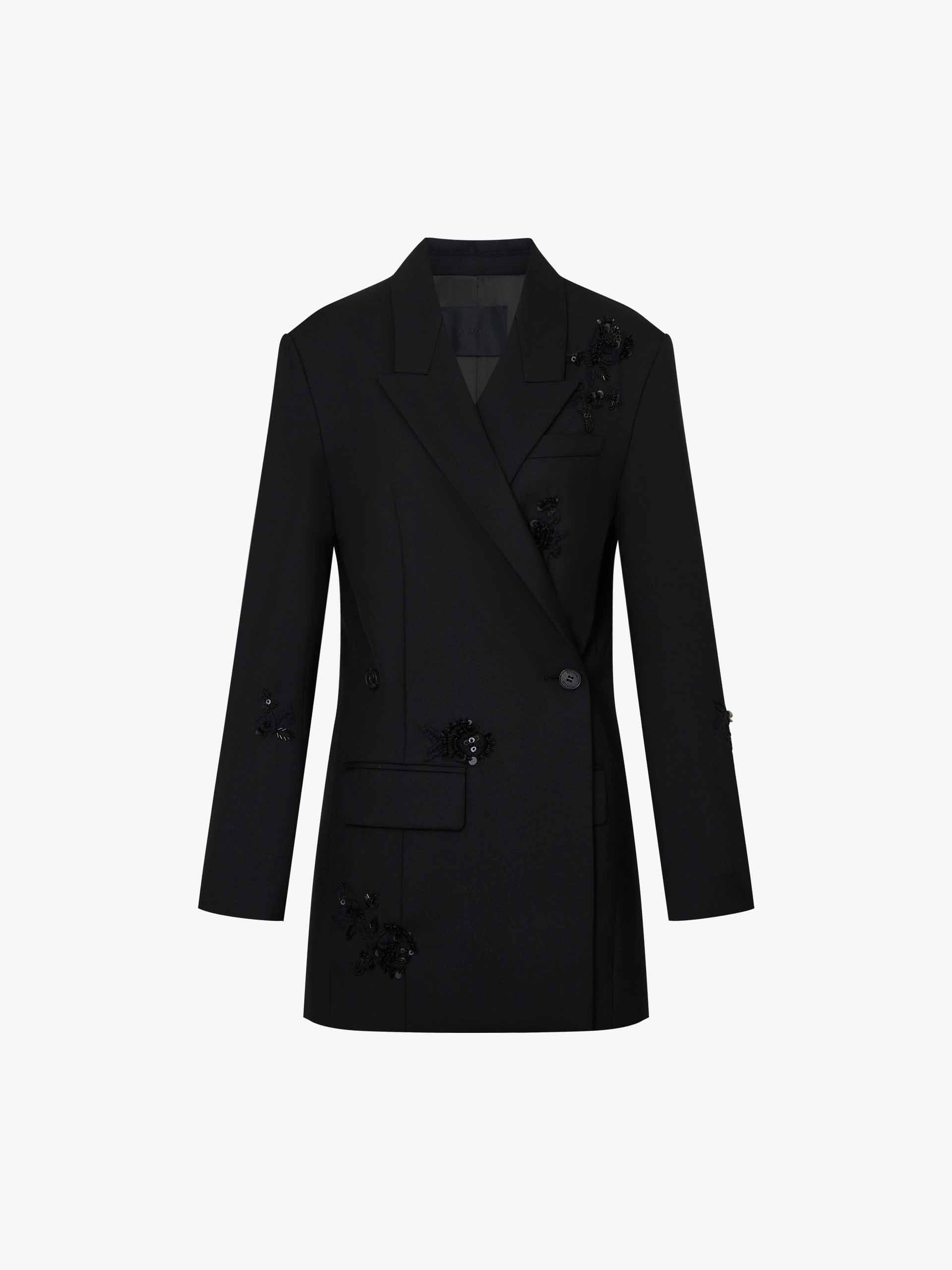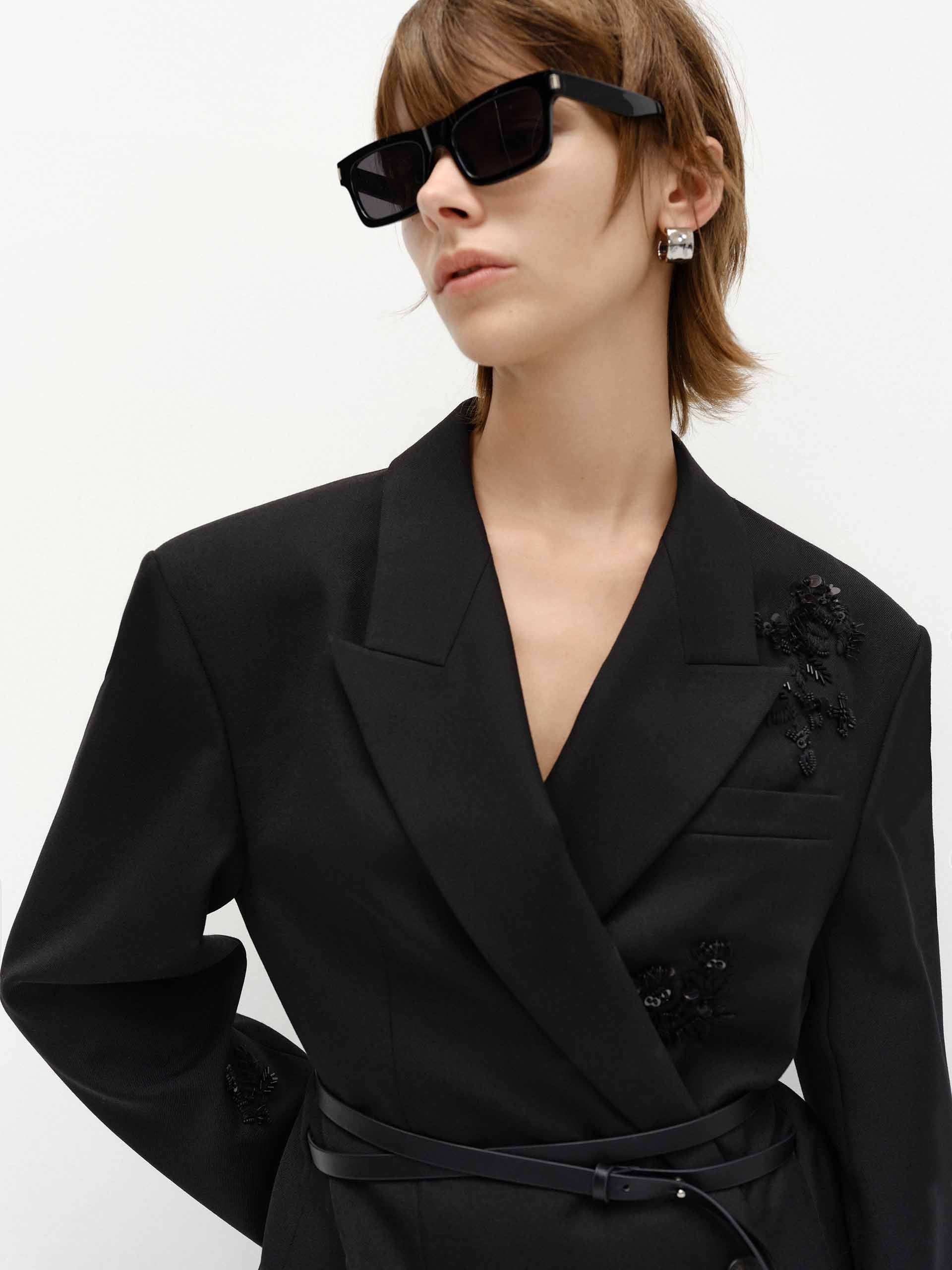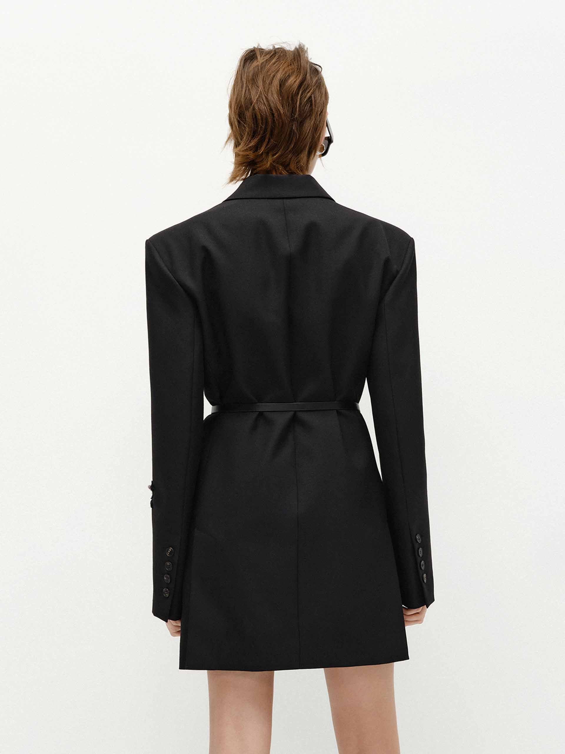 Made from a luxurious wool blend, this dress is cut in a blazer silhouette with a flattering mini length. The slanted placket wrap design adds a touch of sophistication, while the sparkling sequin details add a hint of glamour. Perfect for any special occasion or night out.