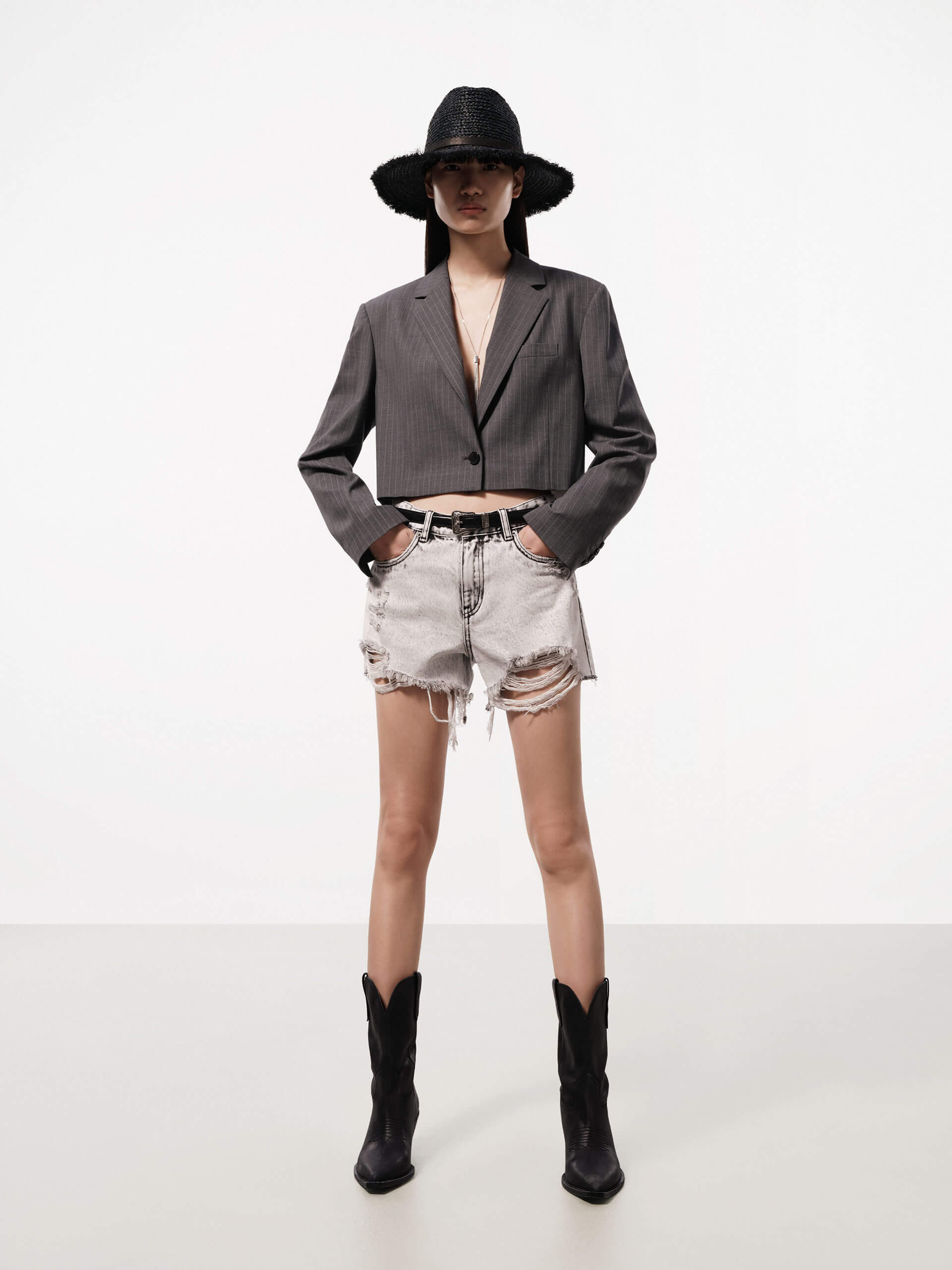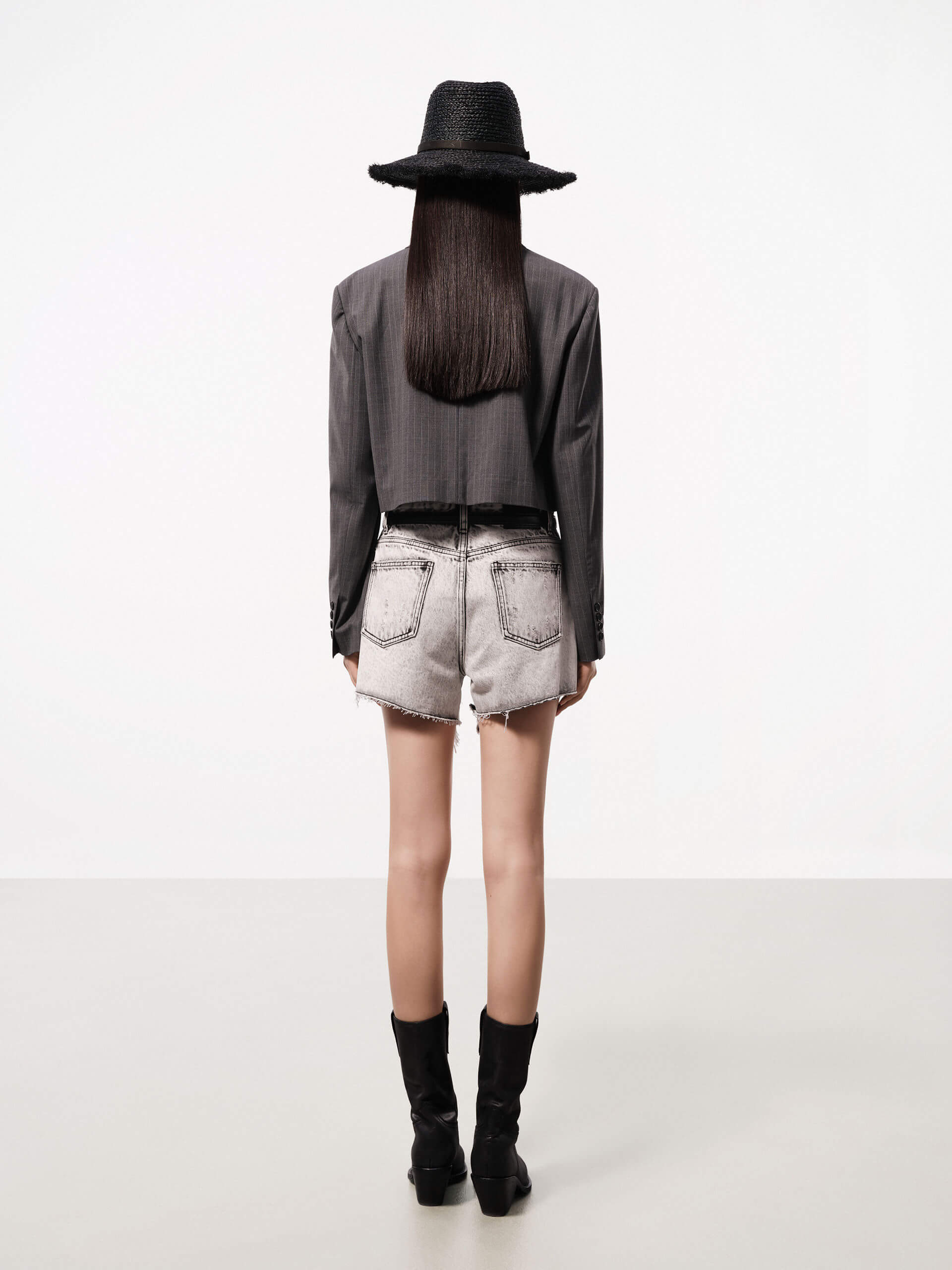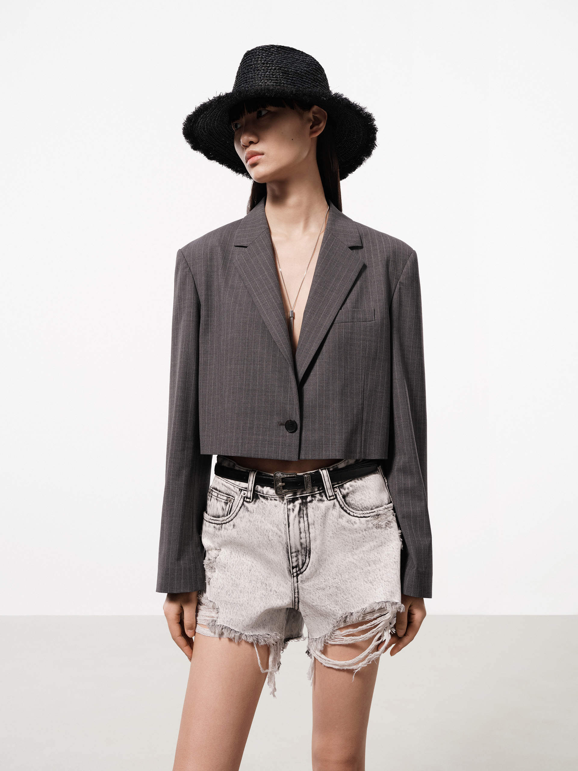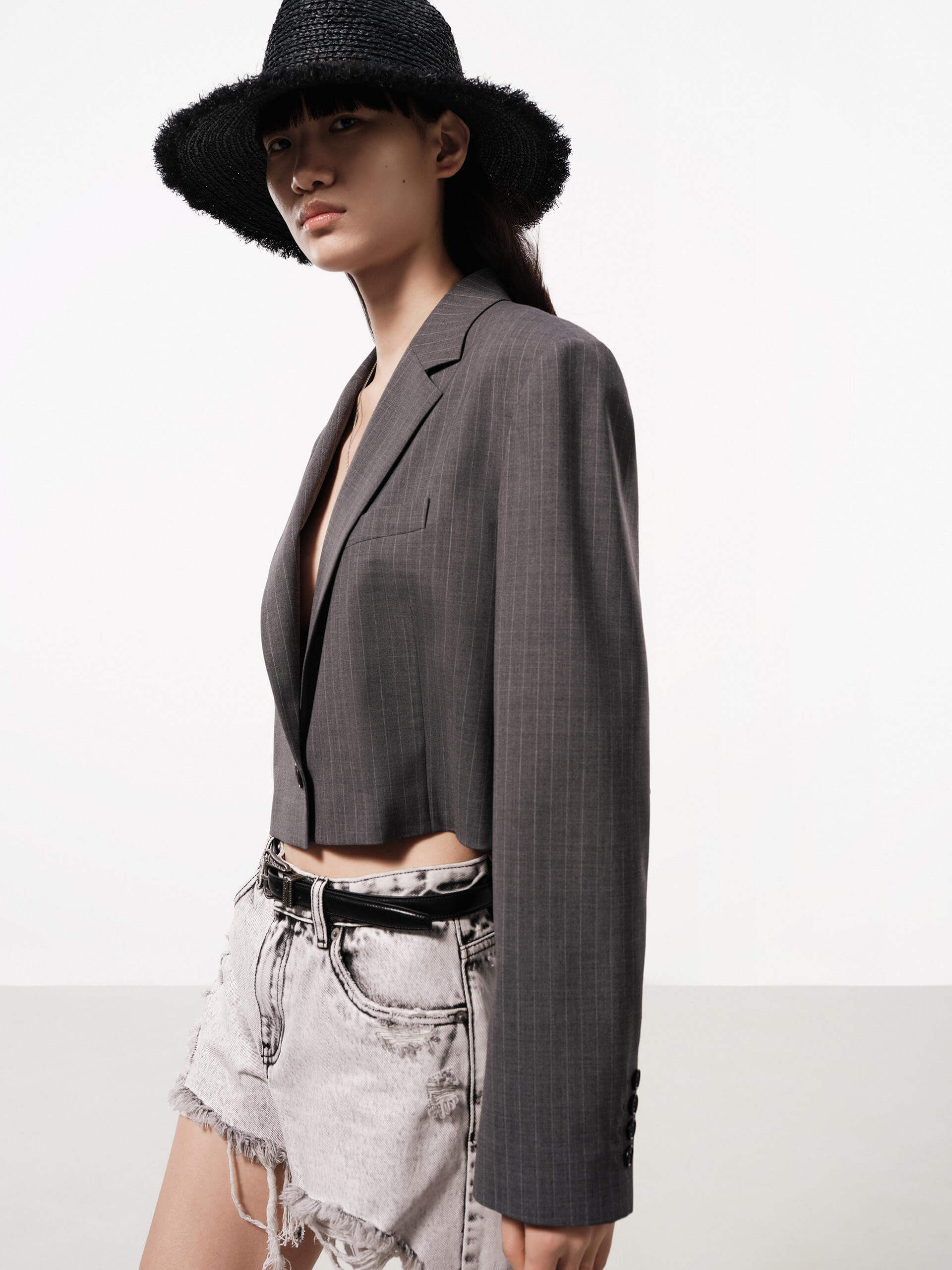 This season, our design team has refined our tailoring with a heightened focus on fabric and directional silhouettes. Crafted from a wool blend, this blazer features a shorter cut and defined padded shoulders, providing both comfort and style.