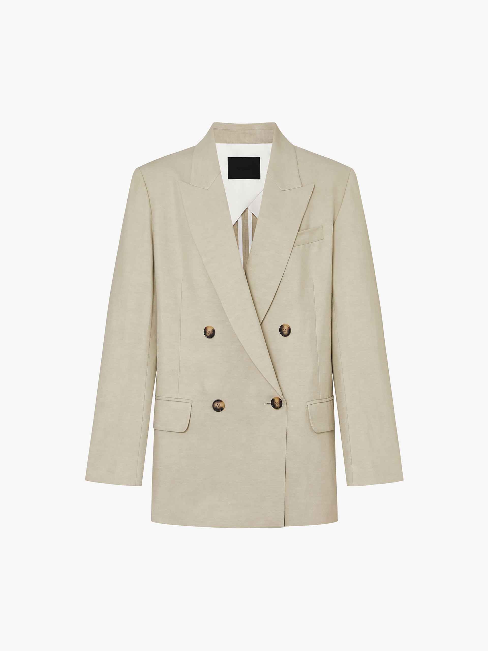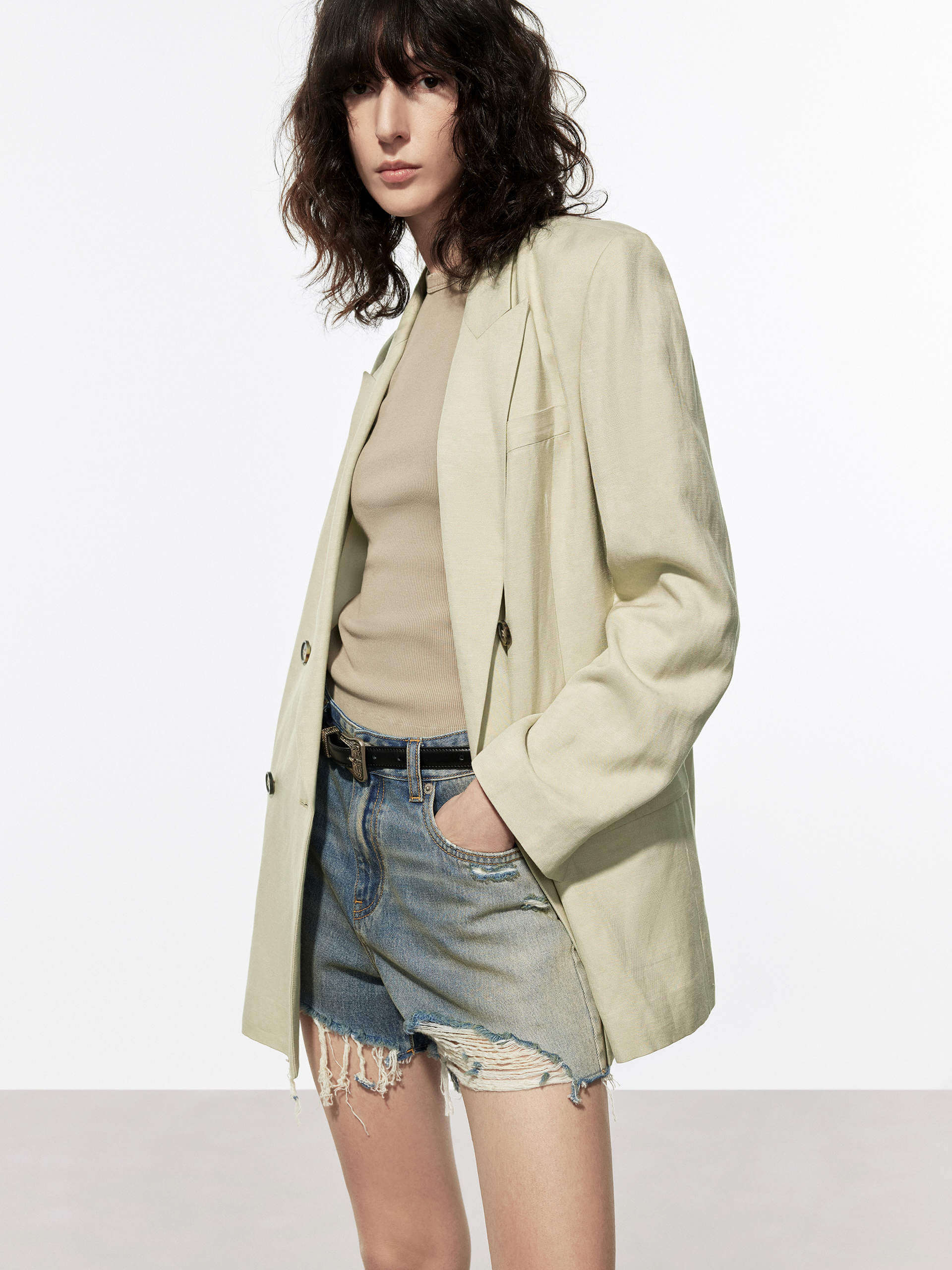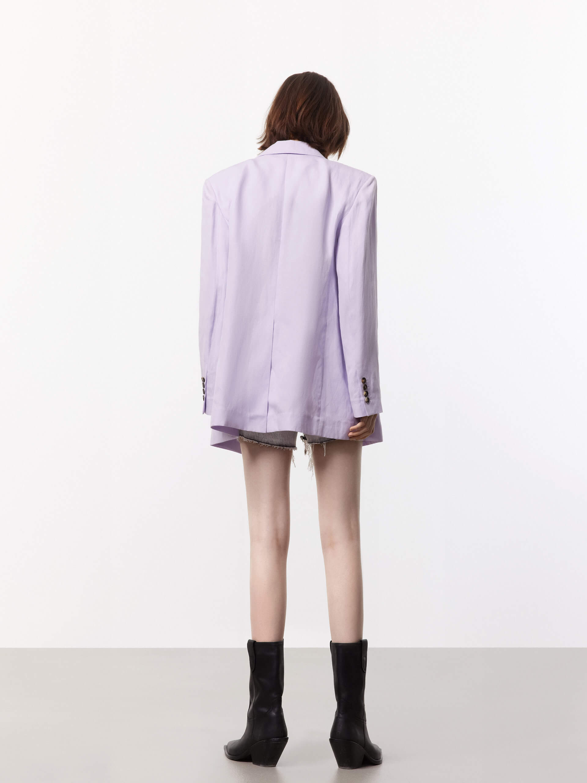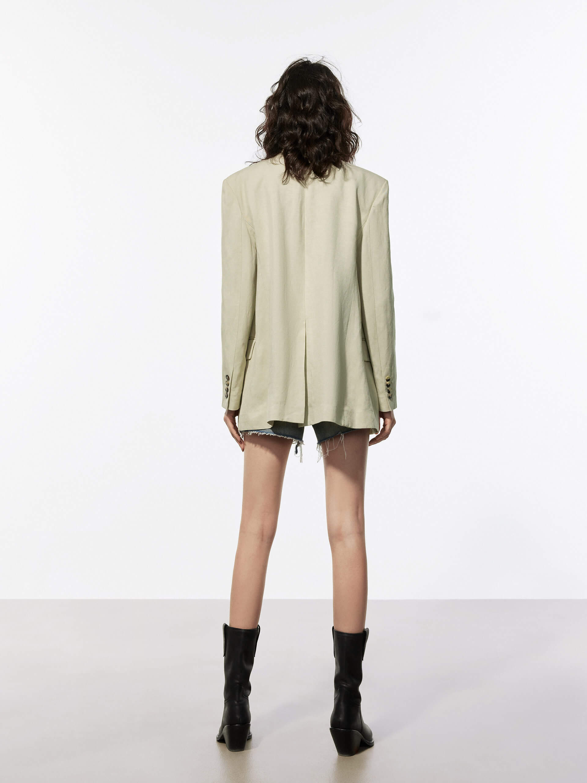 This blazer is made from a comfortable linen blend fabric, which makes it breathable and lightweight, perfect for warmer weather. The structured fit provides a polished and professional look, while the padded shoulders add definition and structure to the silhouette. This blazer is a versatile piece that can be dressed up or down, making it a great addition to any wardrobe.