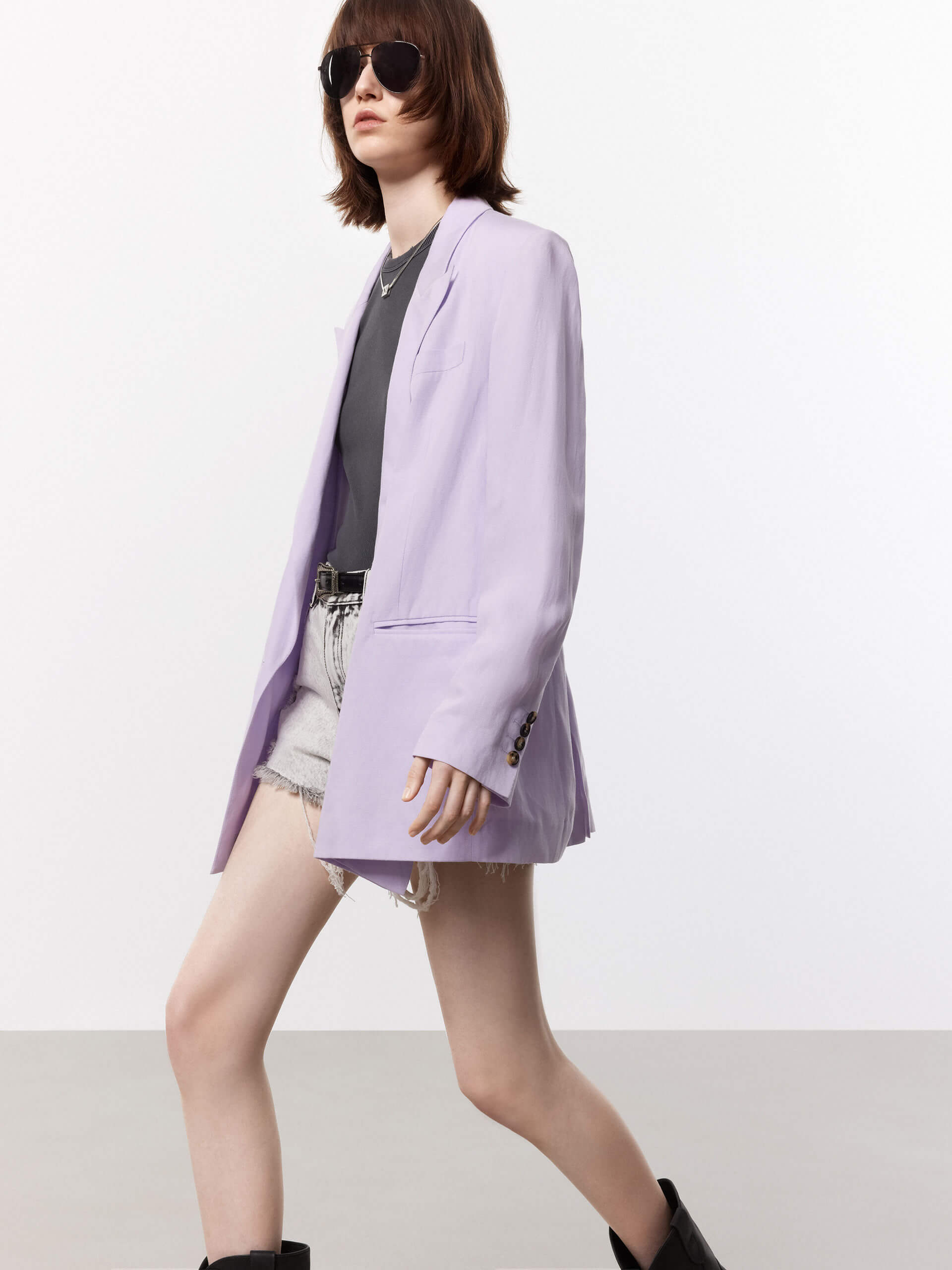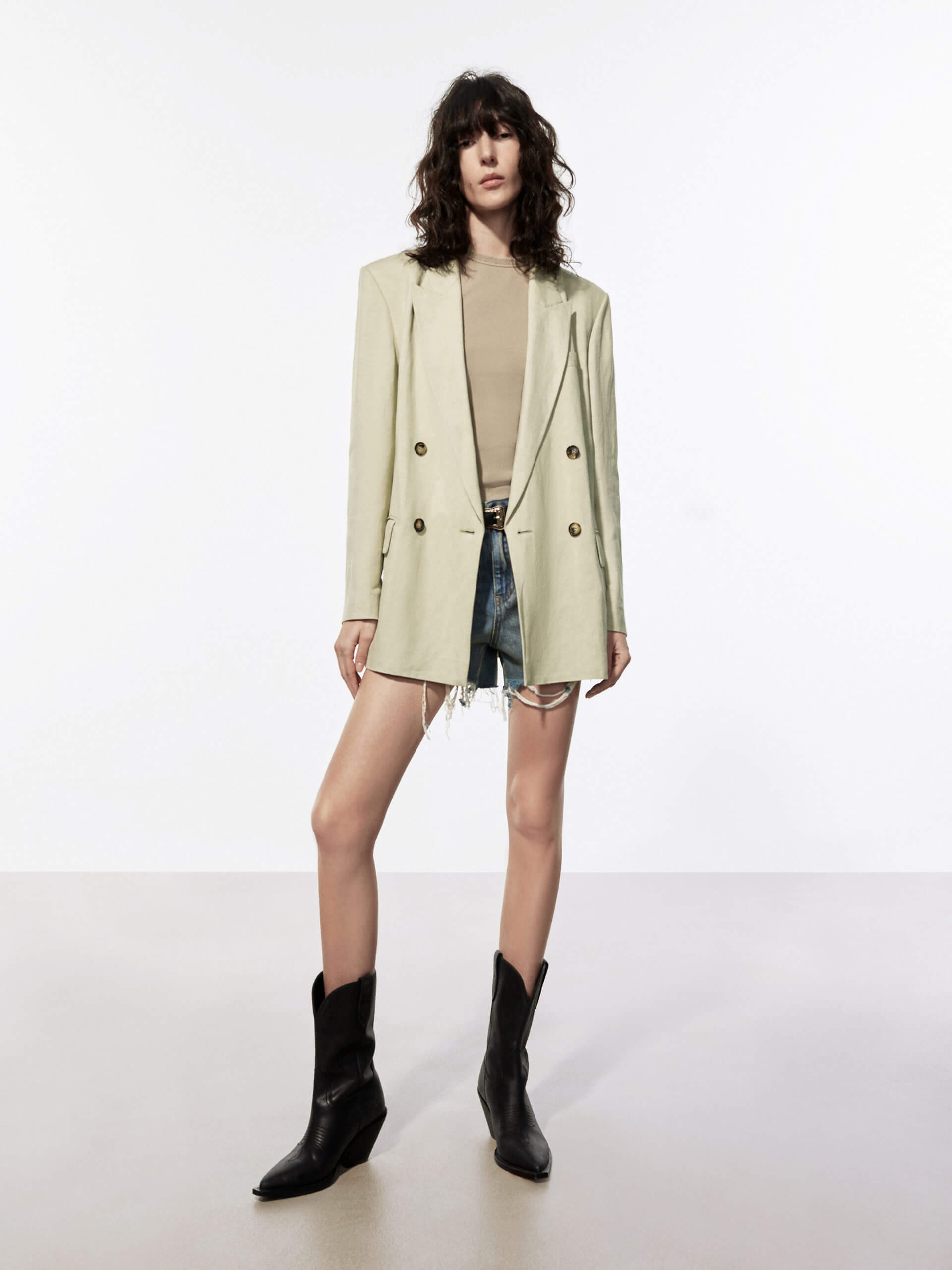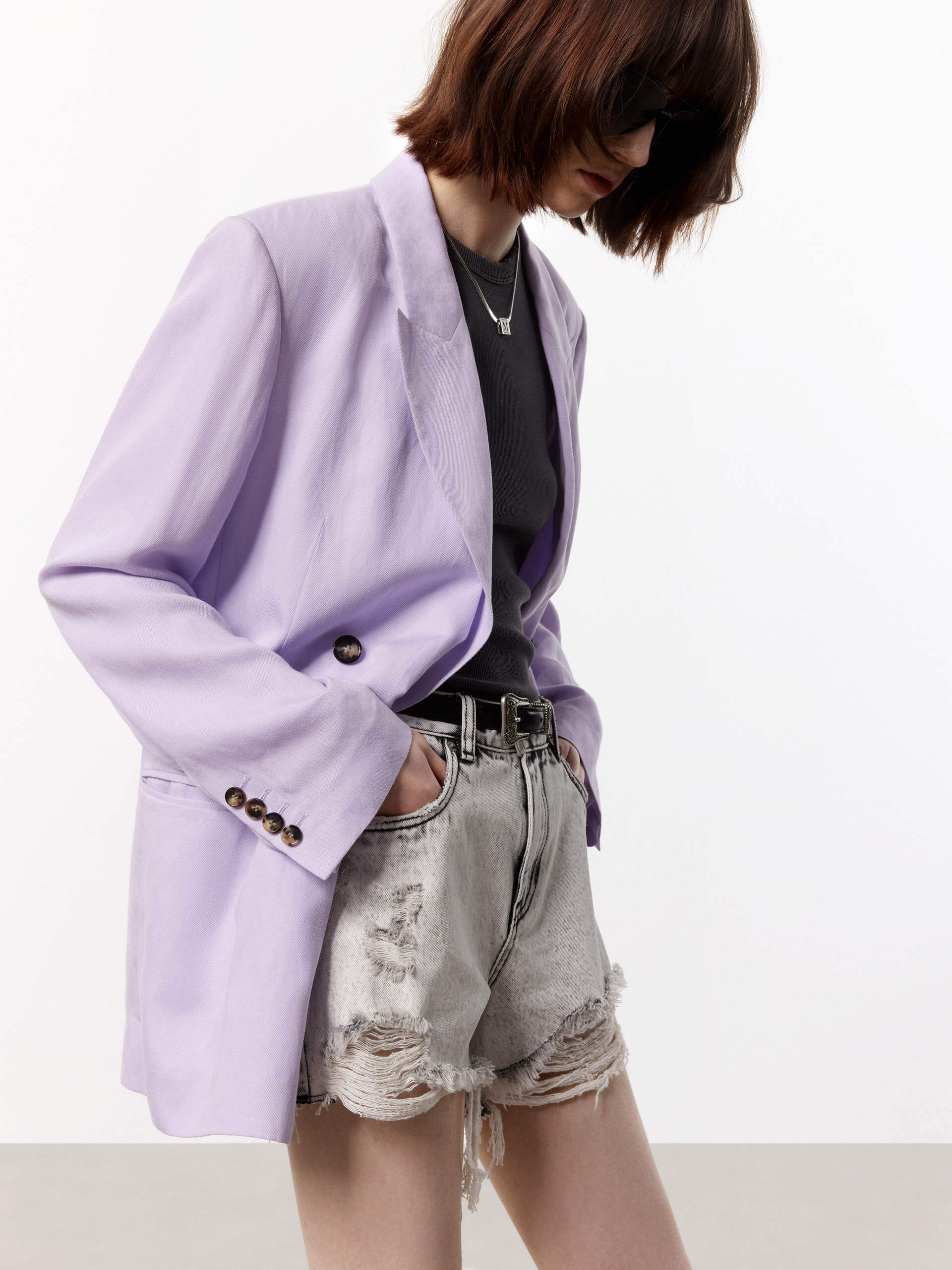 This blazer is made from a comfortable linen blend fabric, which makes it breathable and lightweight, perfect for warmer weather. The structured fit provides a polished and professional look, while the padded shoulders add definition and structure to the silhouette. This blazer is a versatile piece that can be dressed up or down, making it a great addition to any wardrobe.