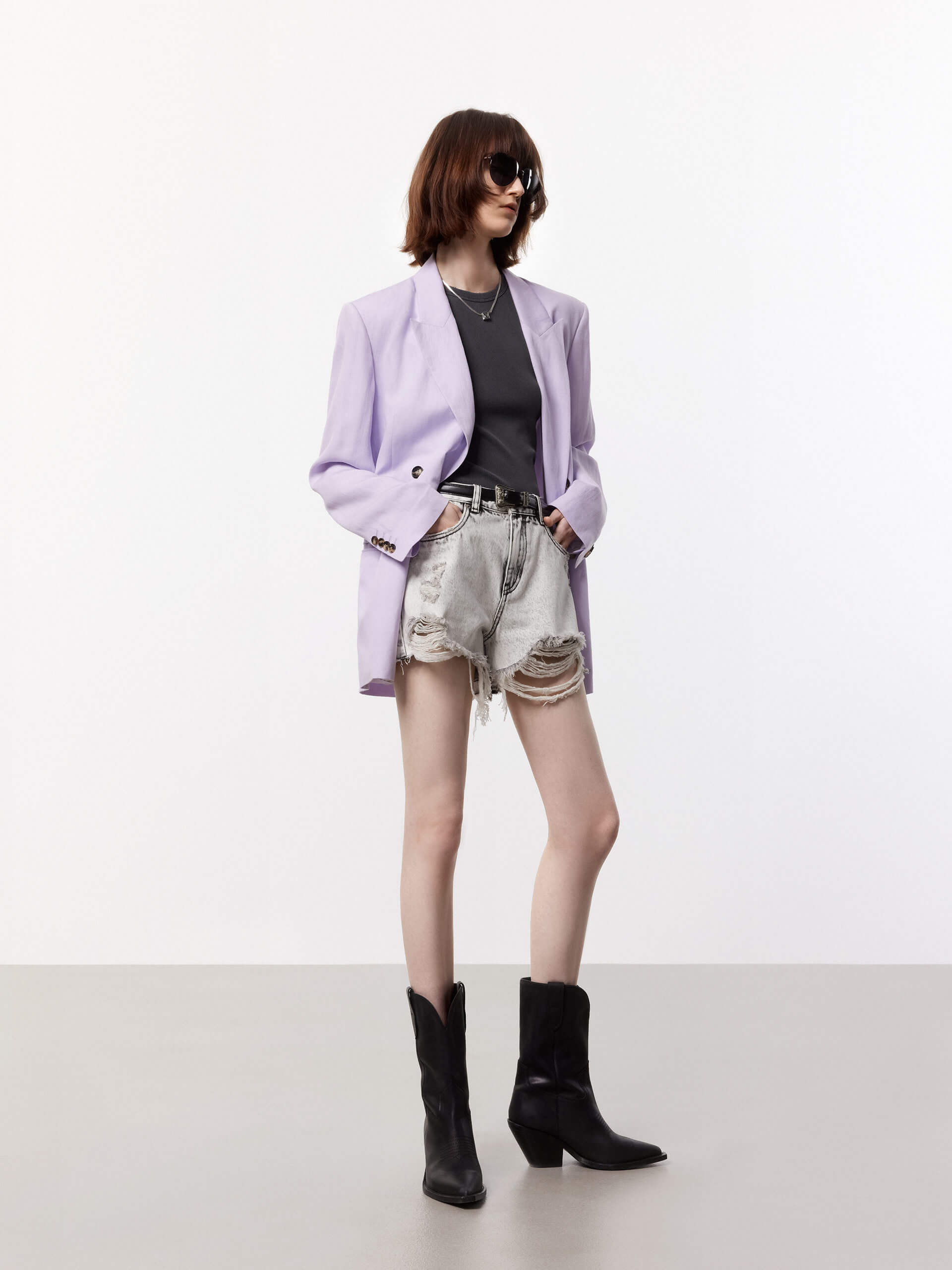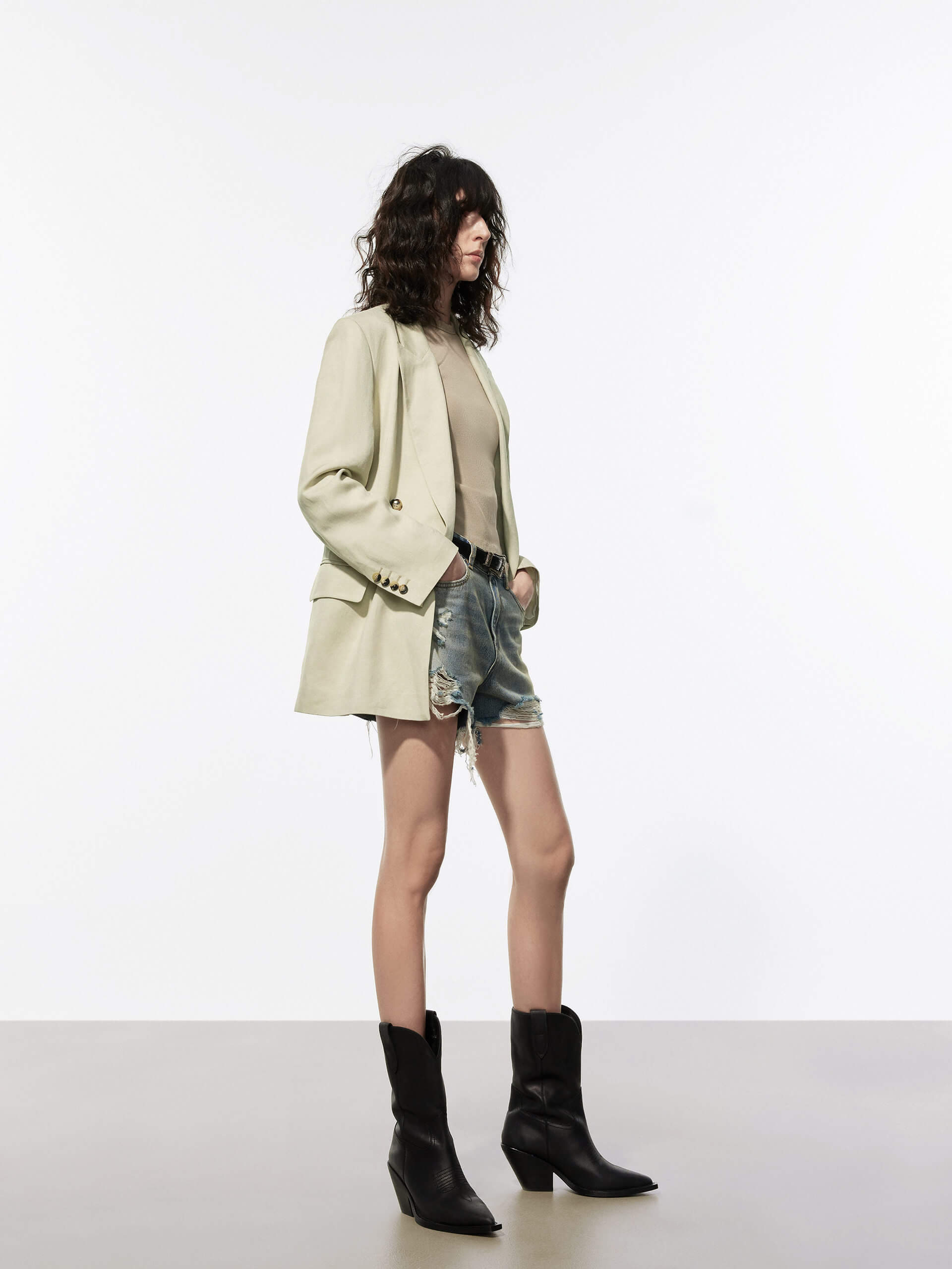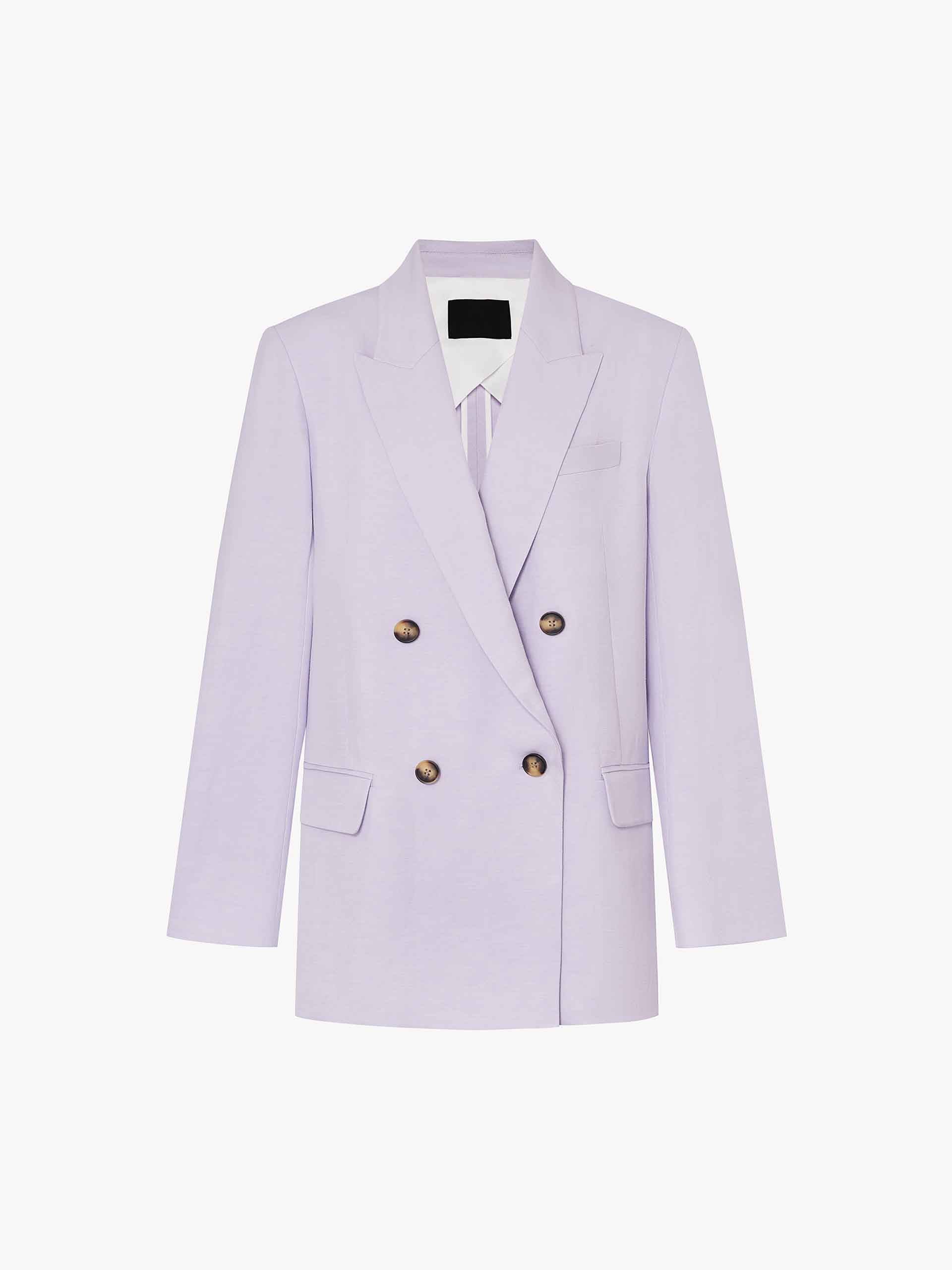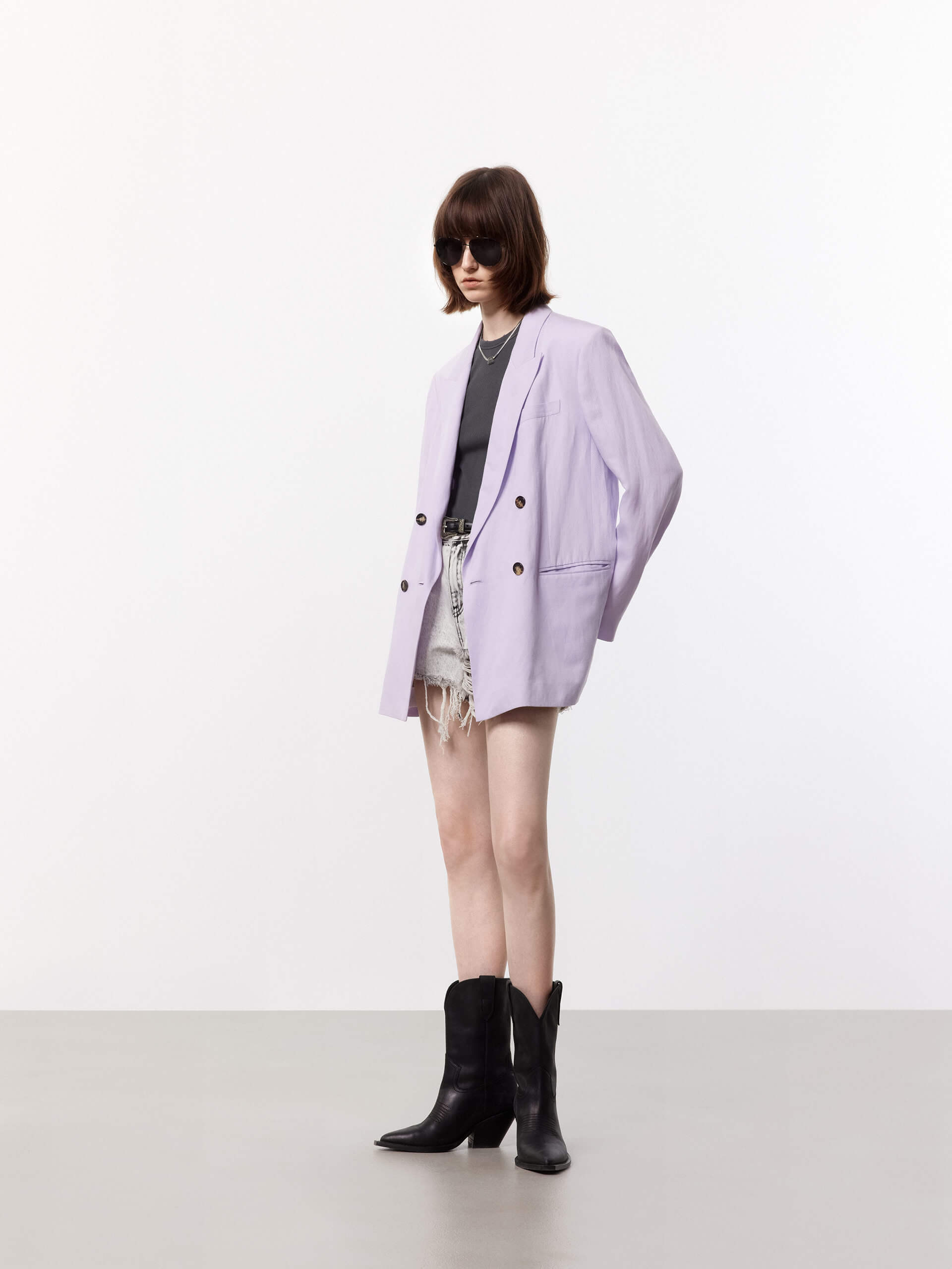 This blazer is made from a comfortable linen blend fabric, which makes it breathable and lightweight, perfect for warmer weather. The structured fit provides a polished and professional look, while the padded shoulders add definition and structure to the silhouette. This blazer is a versatile piece that can be dressed up or down, making it a great addition to any wardrobe.