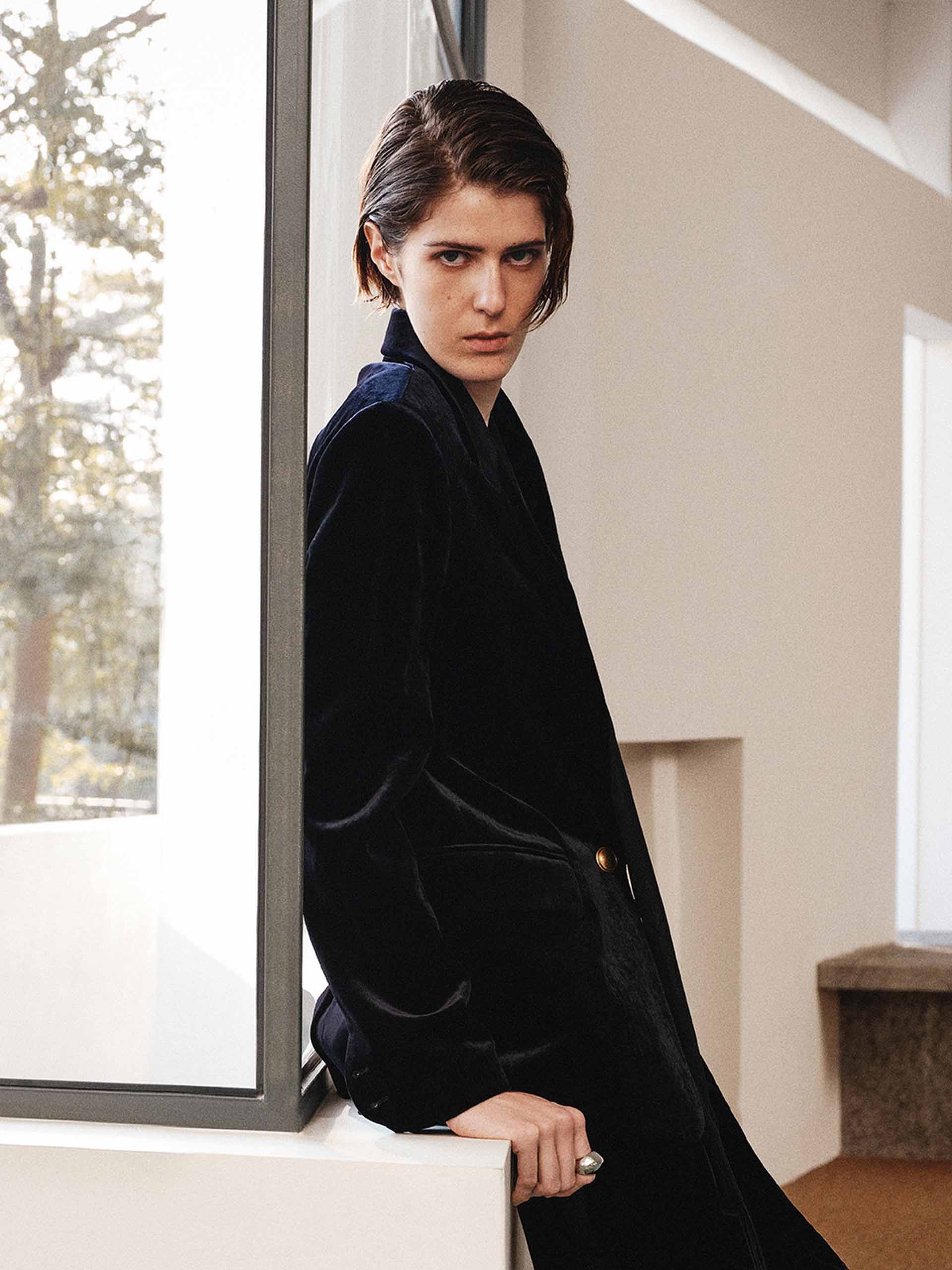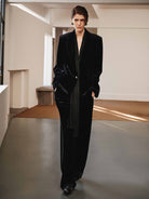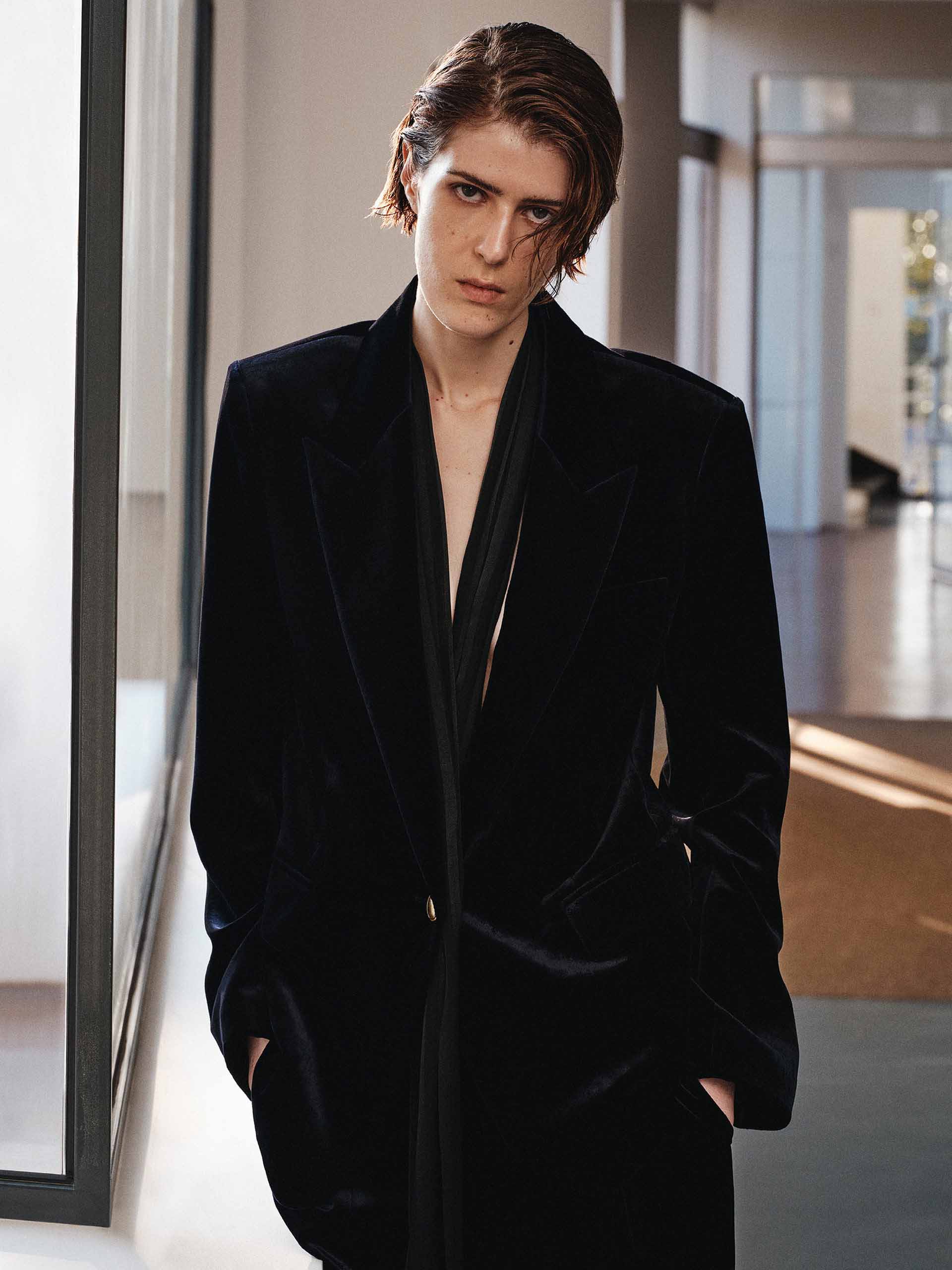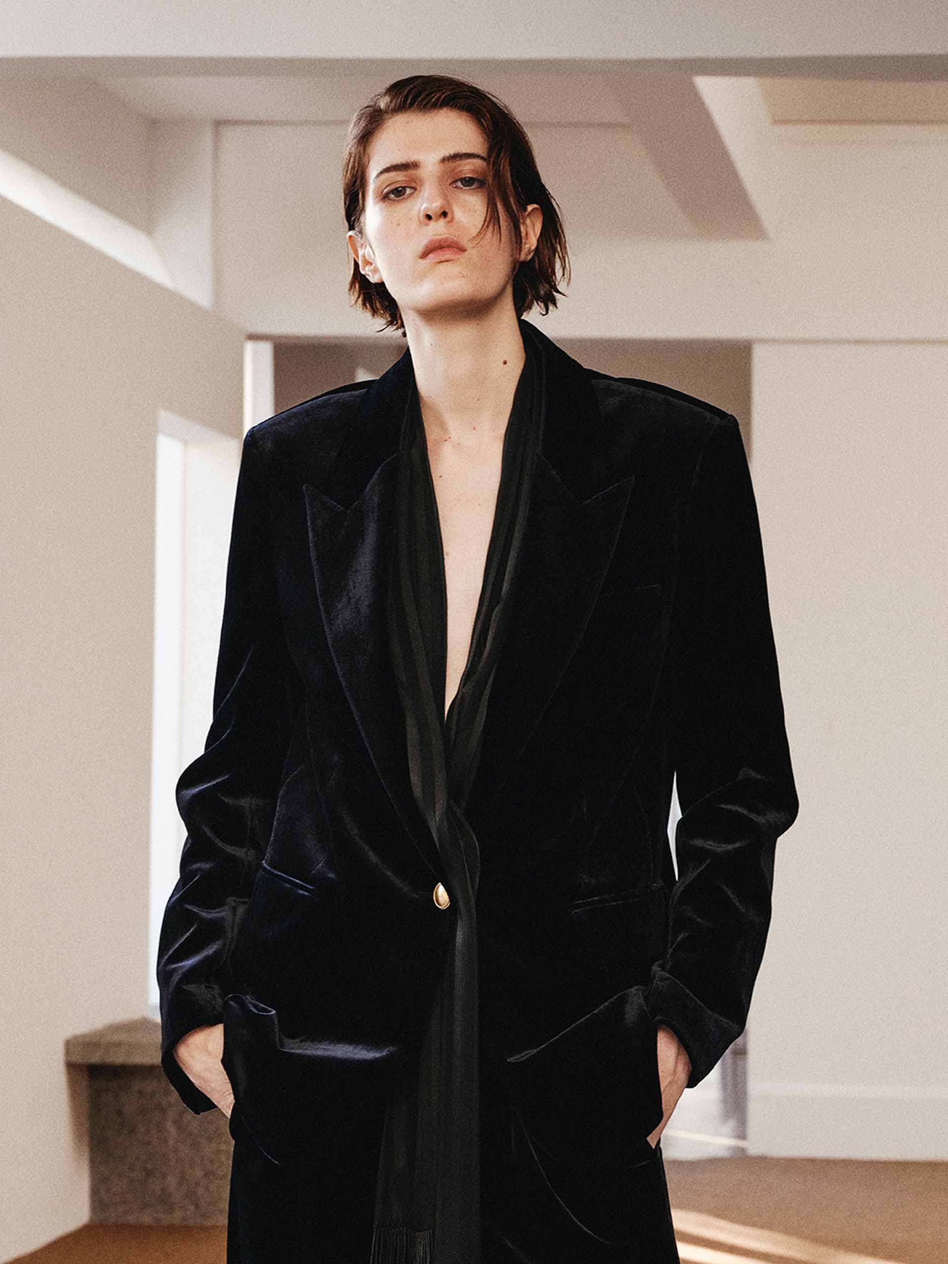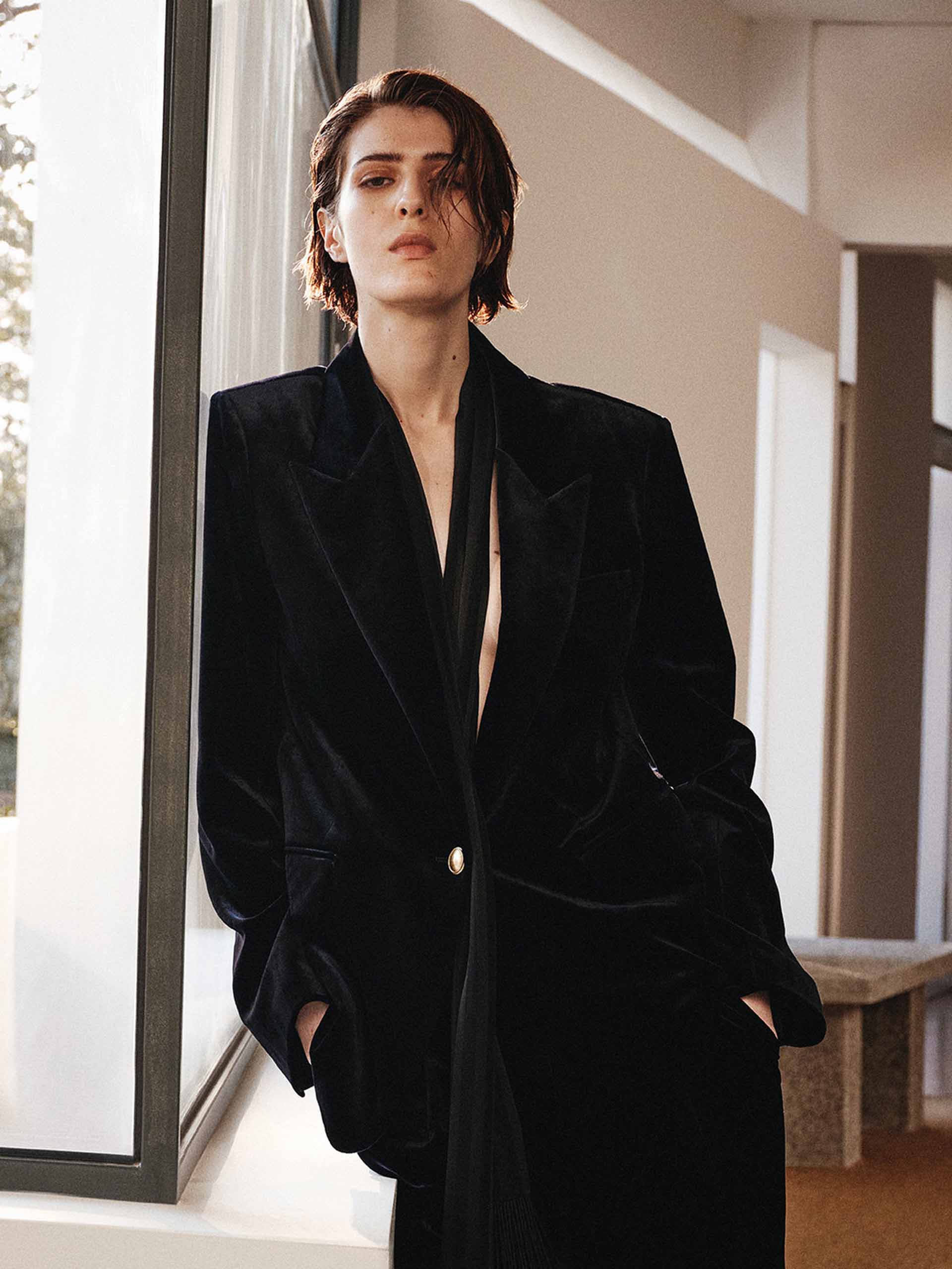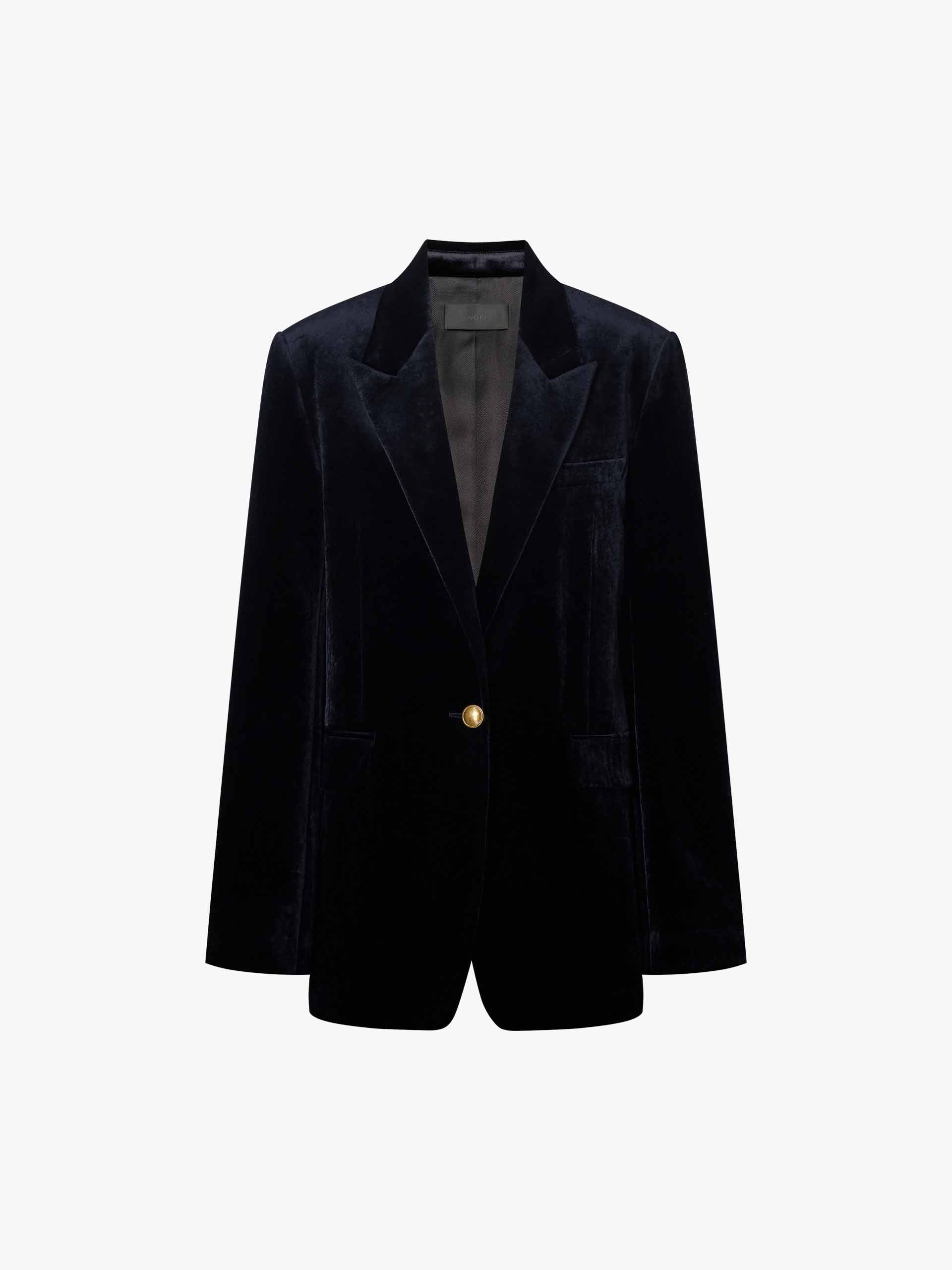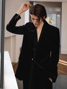 This blazer masterfully blends timeless elegance with sumptuous texture. Its structured silhouette, defined by a classic peak lapel and a refined padded shoulder, creates a powerful and polished frame. The luxurious velvet touch invites admiration, while the distinctive single metal button adds a focal point of sleek modernity. Pair with the matching trousers for a more sophisticated and charming look.