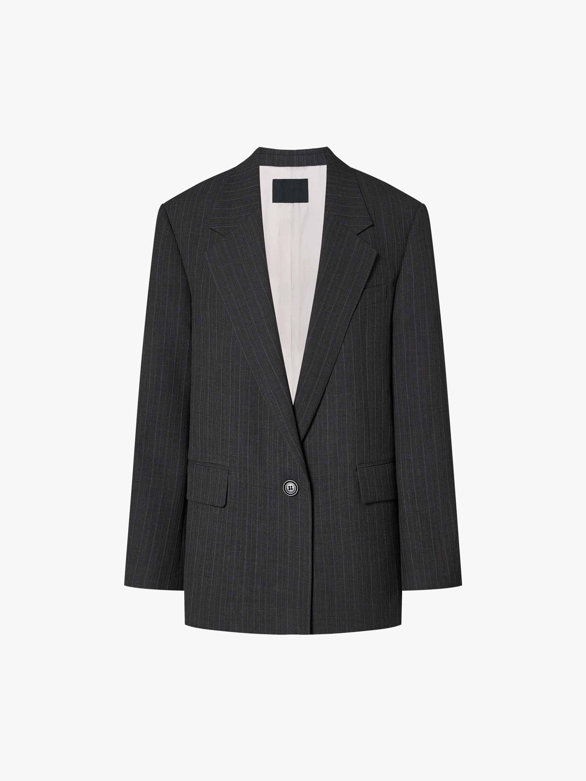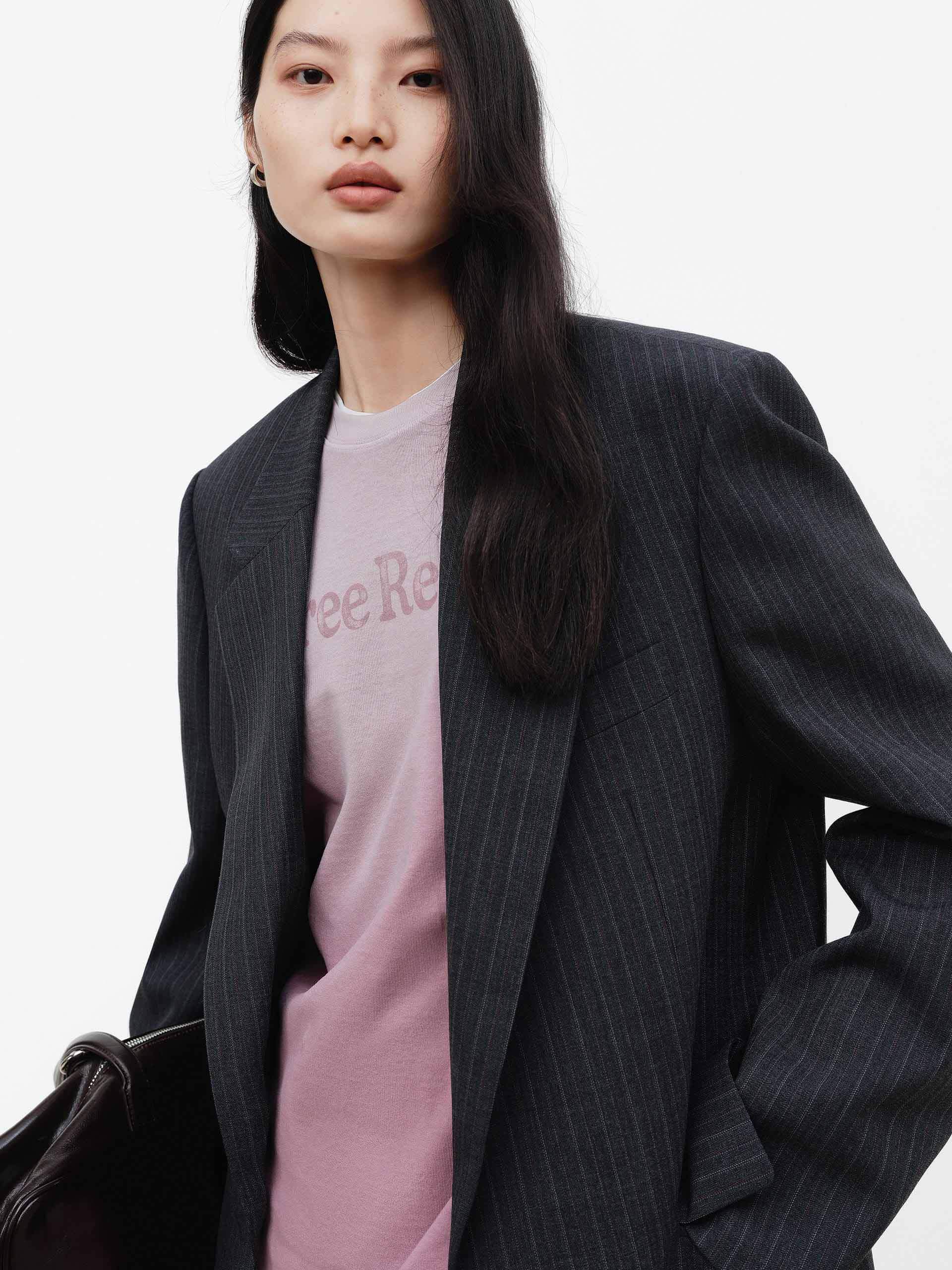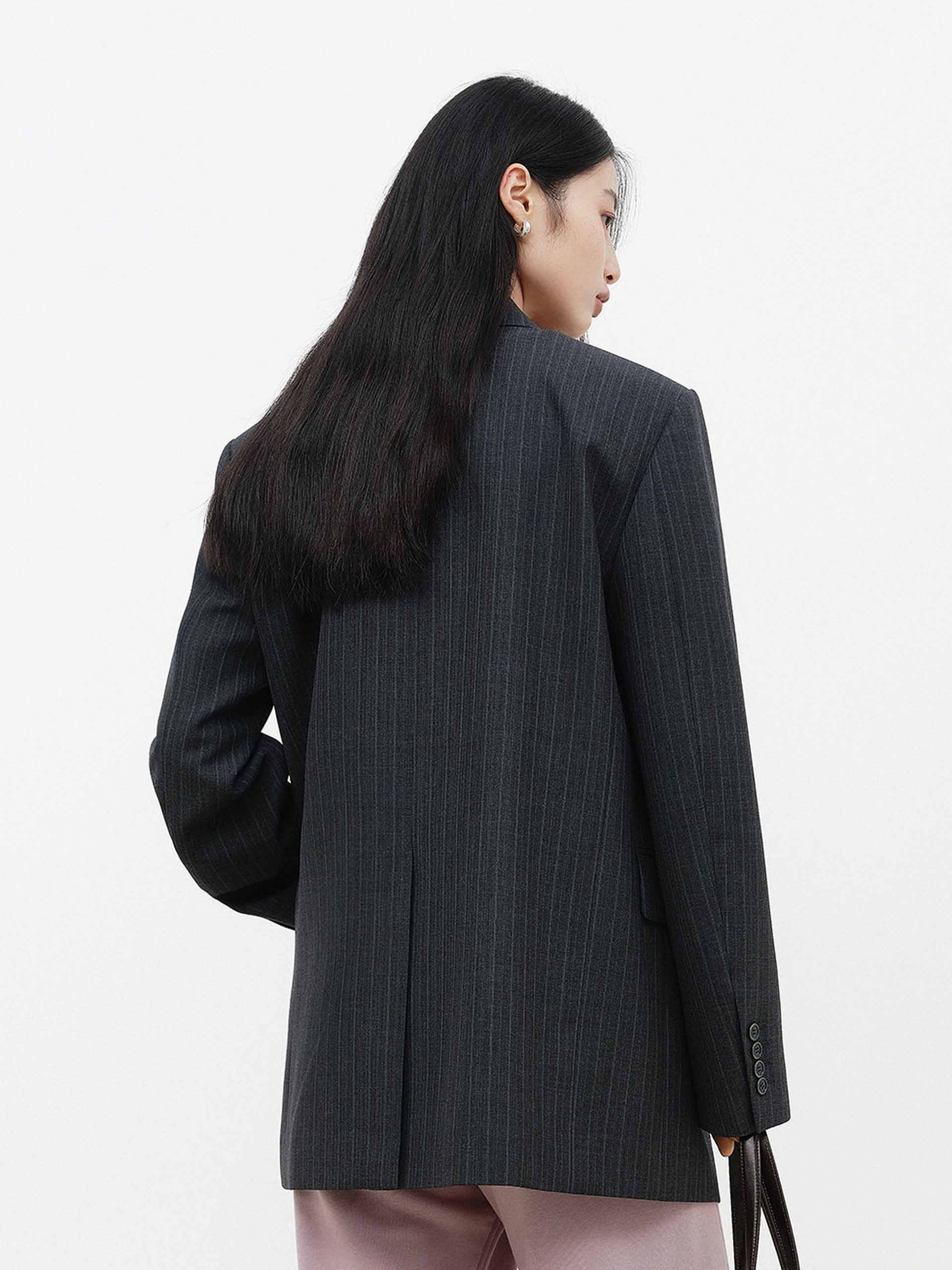 This wool-blend blazer features padded shoulders to accentuate a sharp shoulder line, while vertical stripes visually elongate the figure. Whether paired with matching trousers or jeans, it effortlessly transitions to both work and semi-formal occasions, embodying a modern and sophisticated style.
