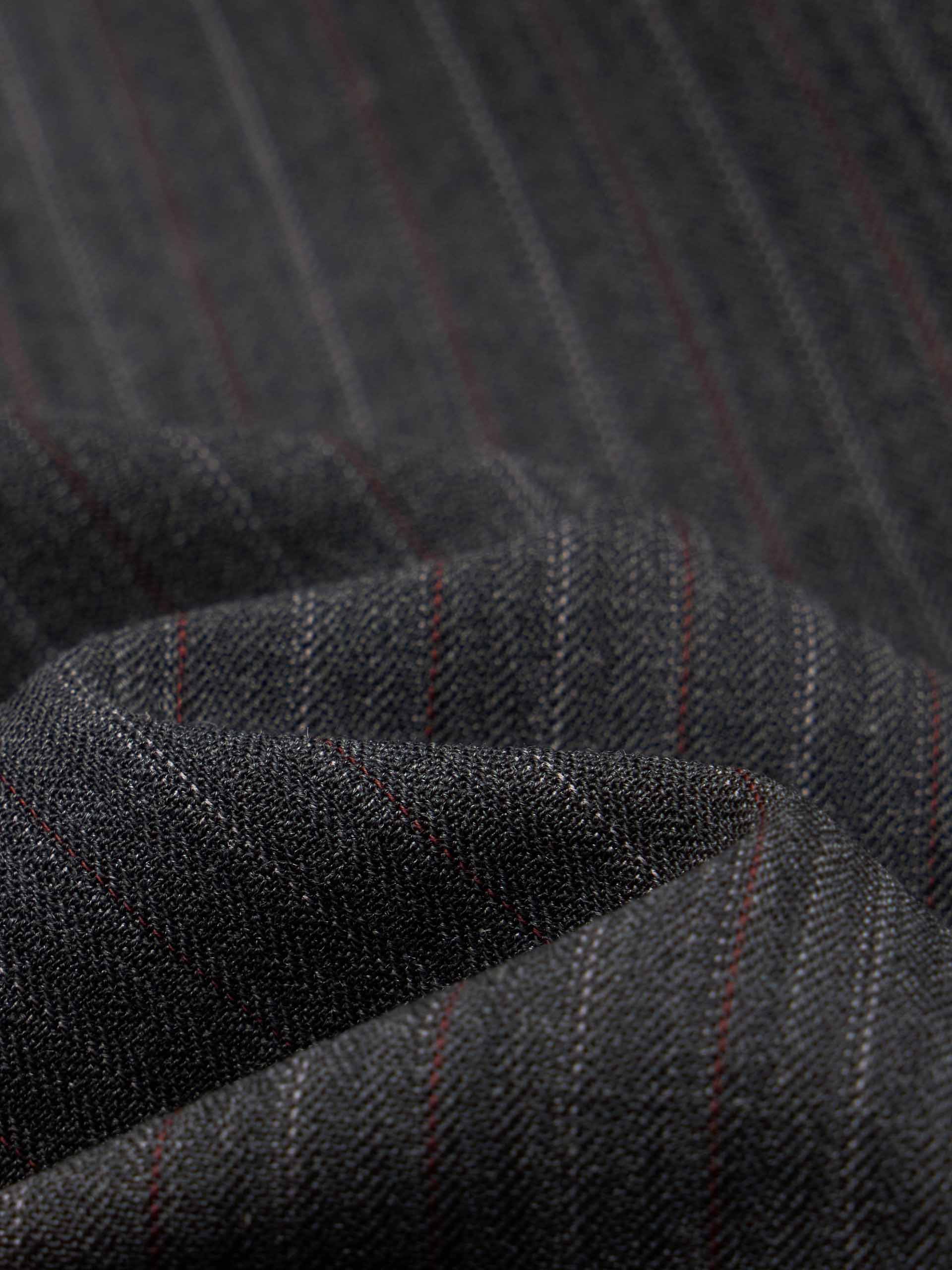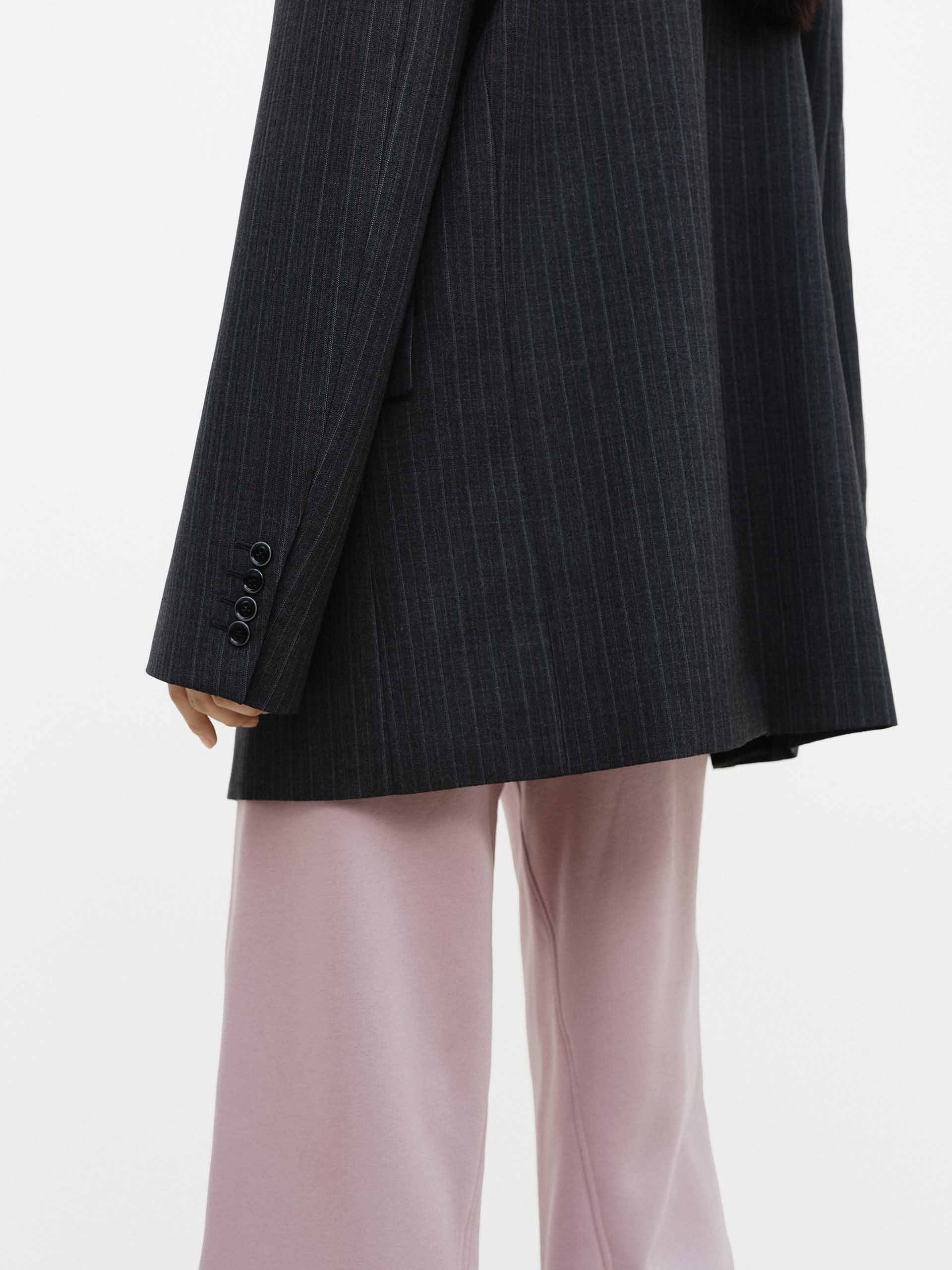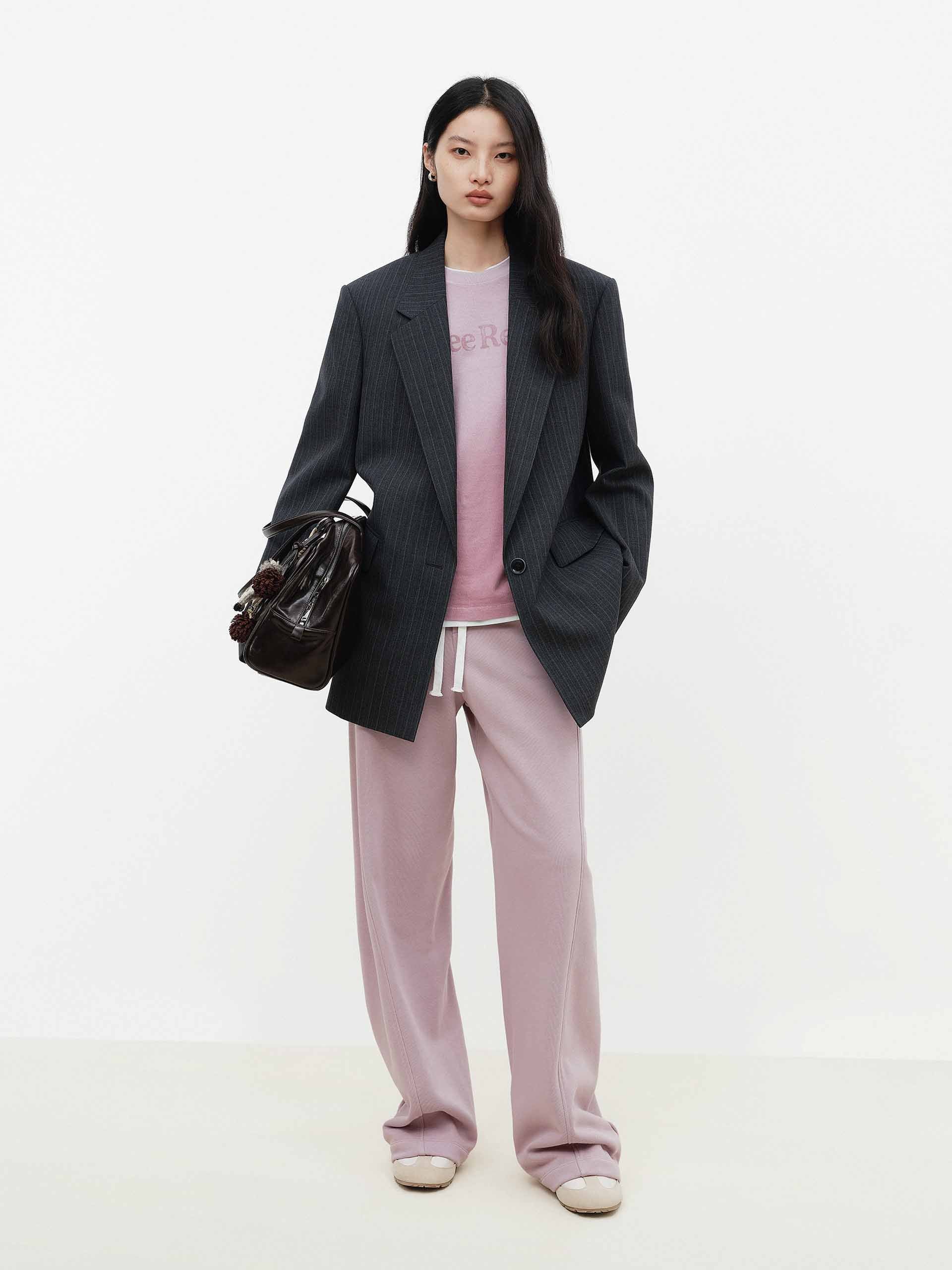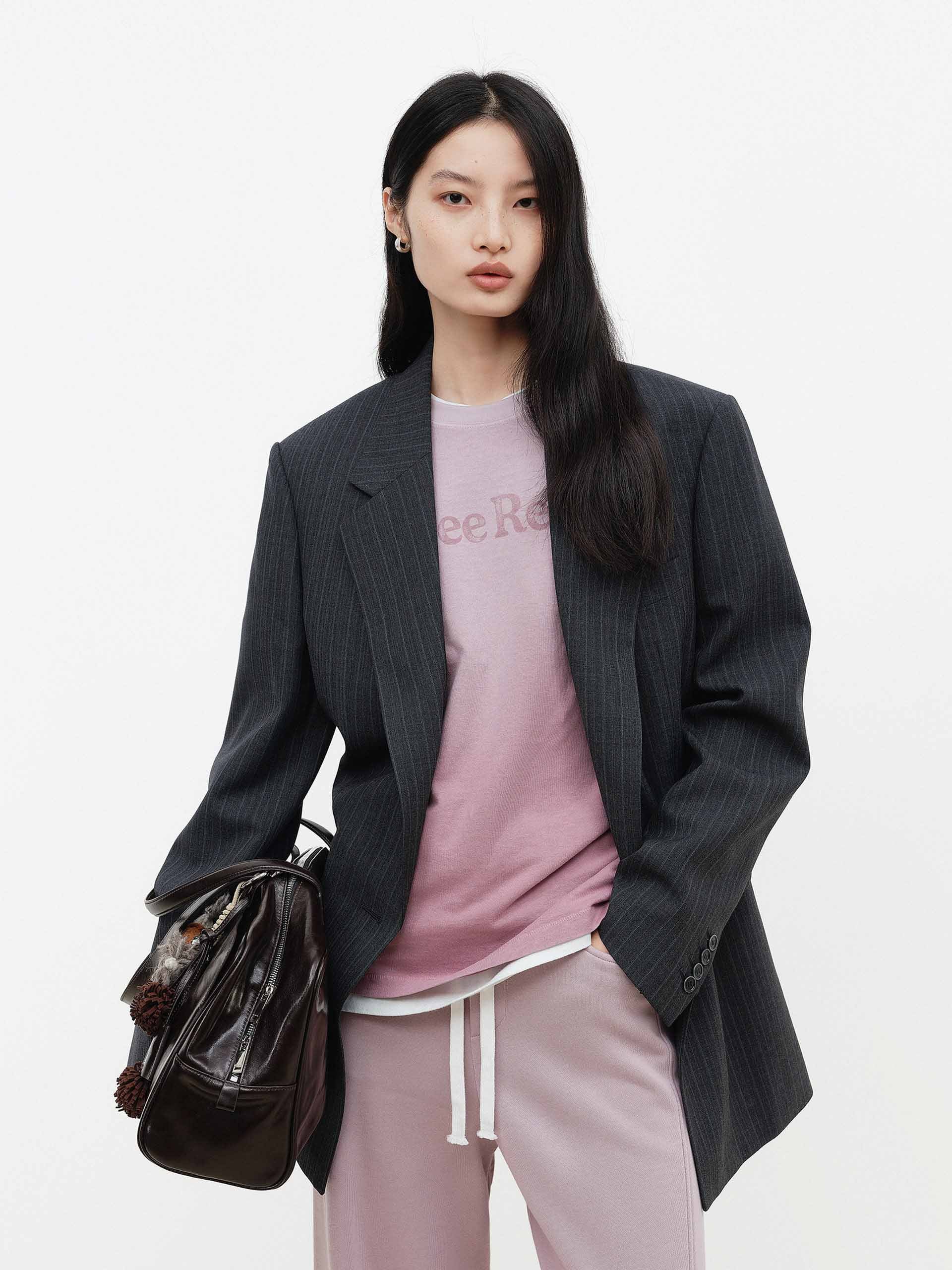 This wool-blend blazer features padded shoulders to accentuate a sharp shoulder line, while vertical stripes visually elongate the figure. Whether paired with matching trousers or jeans, it effortlessly transitions to both work and semi-formal occasions, embodying a modern and sophisticated style.