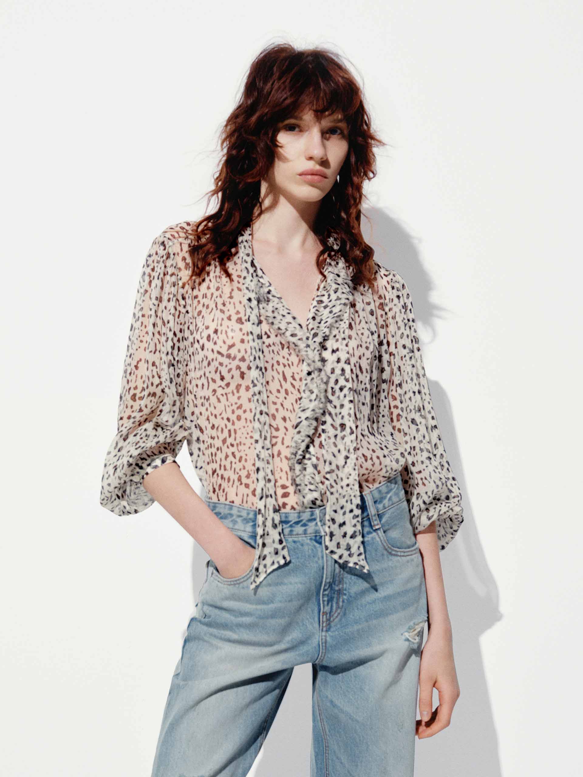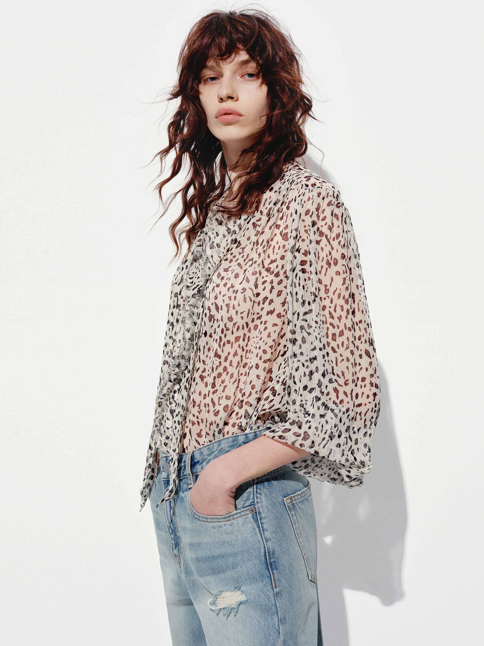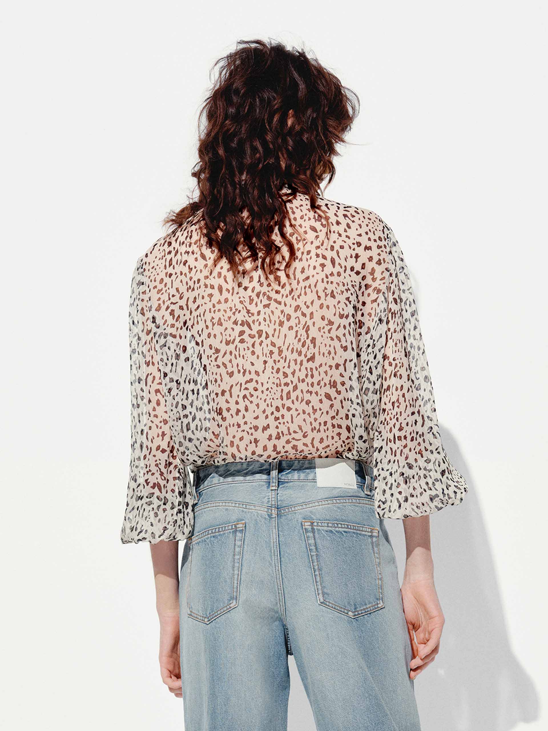 Unleash your wild side with this eye-catching animal print blouse, designed for those who love to stand out. The regular fit offers effortless comfort, while the elbow-length sleeves—featuring a smooth lining—add a touch of refined elegance. Flowing ribbon details that cascade with movement, bringing dynamic flair to your look.