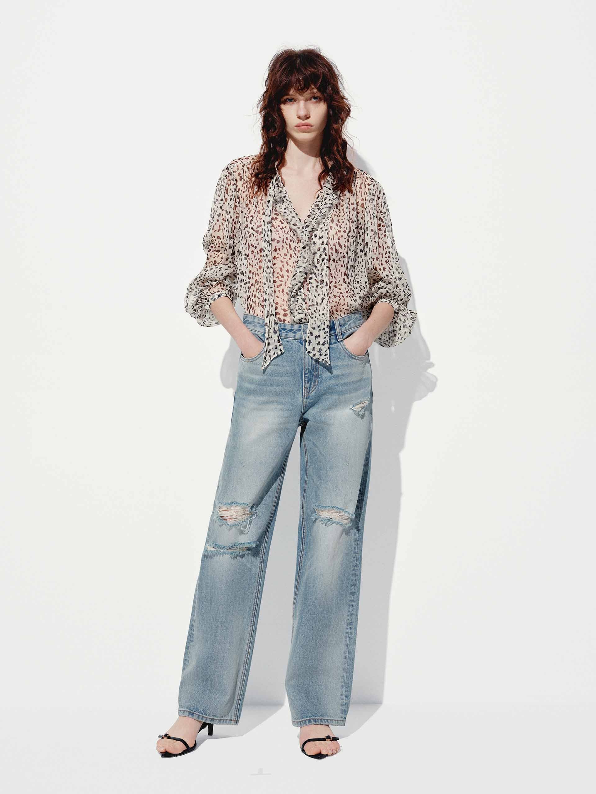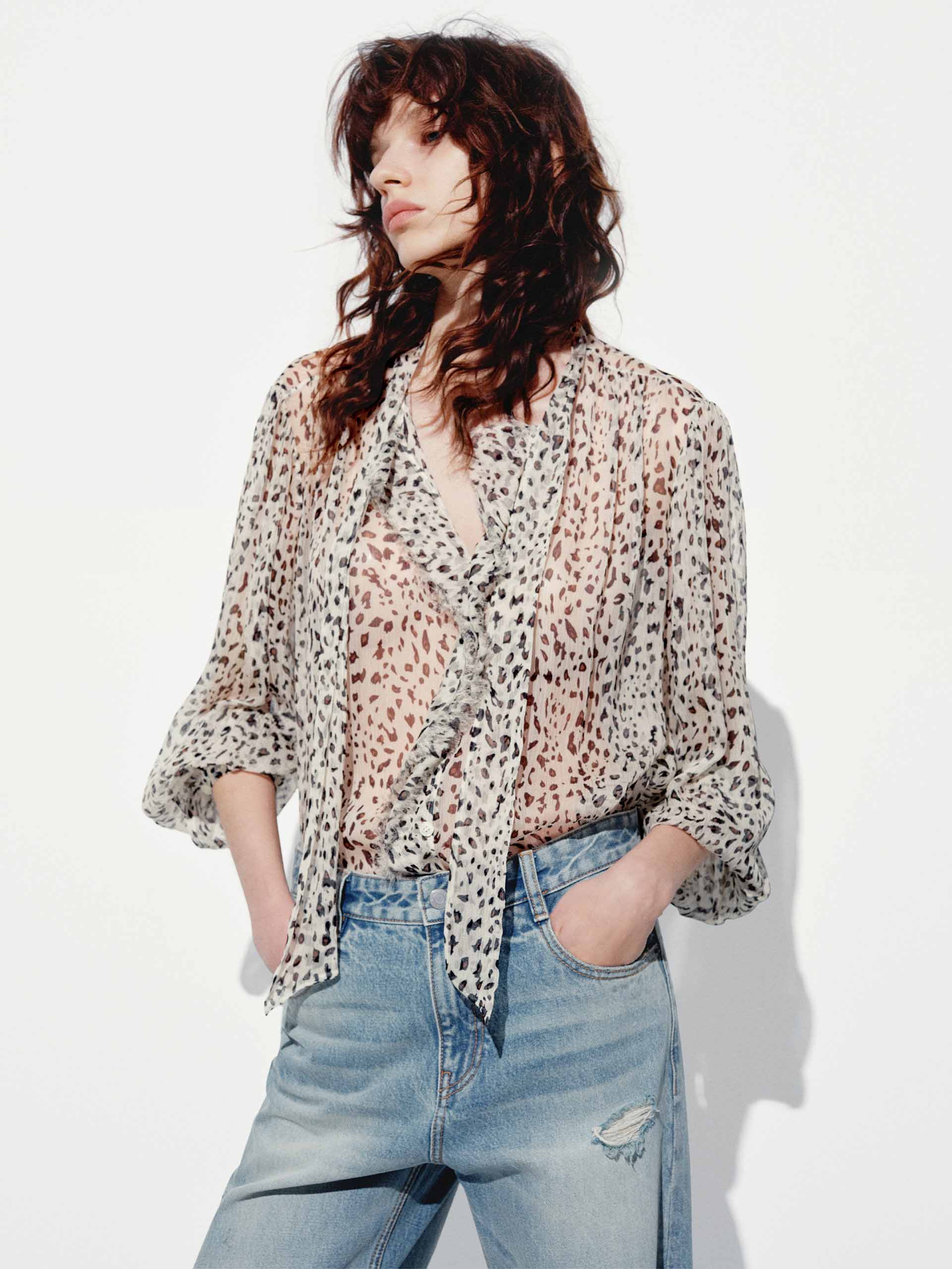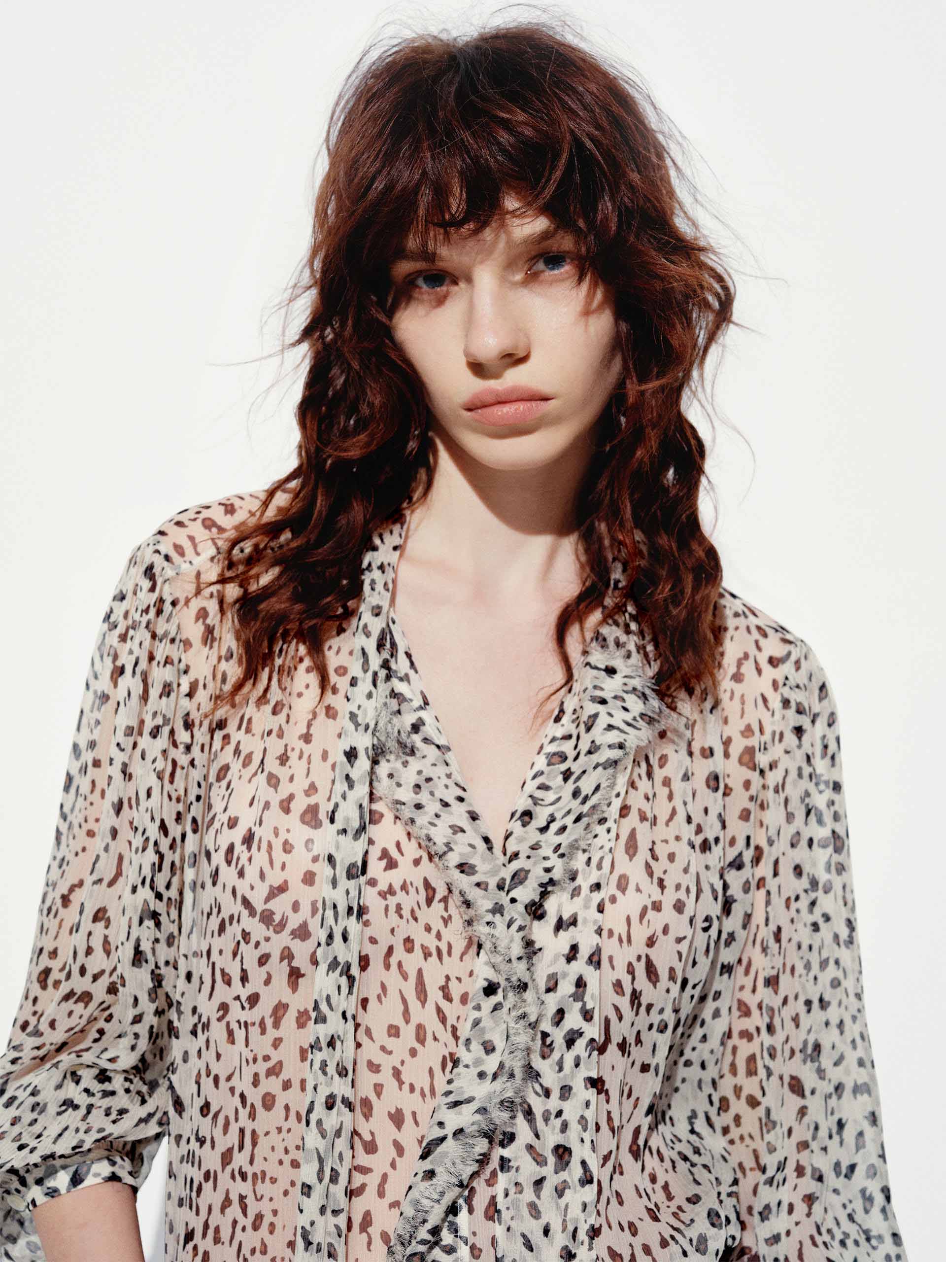 Unleash your wild side with this eye-catching animal print blouse, designed for those who love to stand out. The regular fit offers effortless comfort, while the elbow-length sleeves—featuring a smooth lining—add a touch of refined elegance. Flowing ribbon details that cascade with movement, bringing dynamic flair to your look.