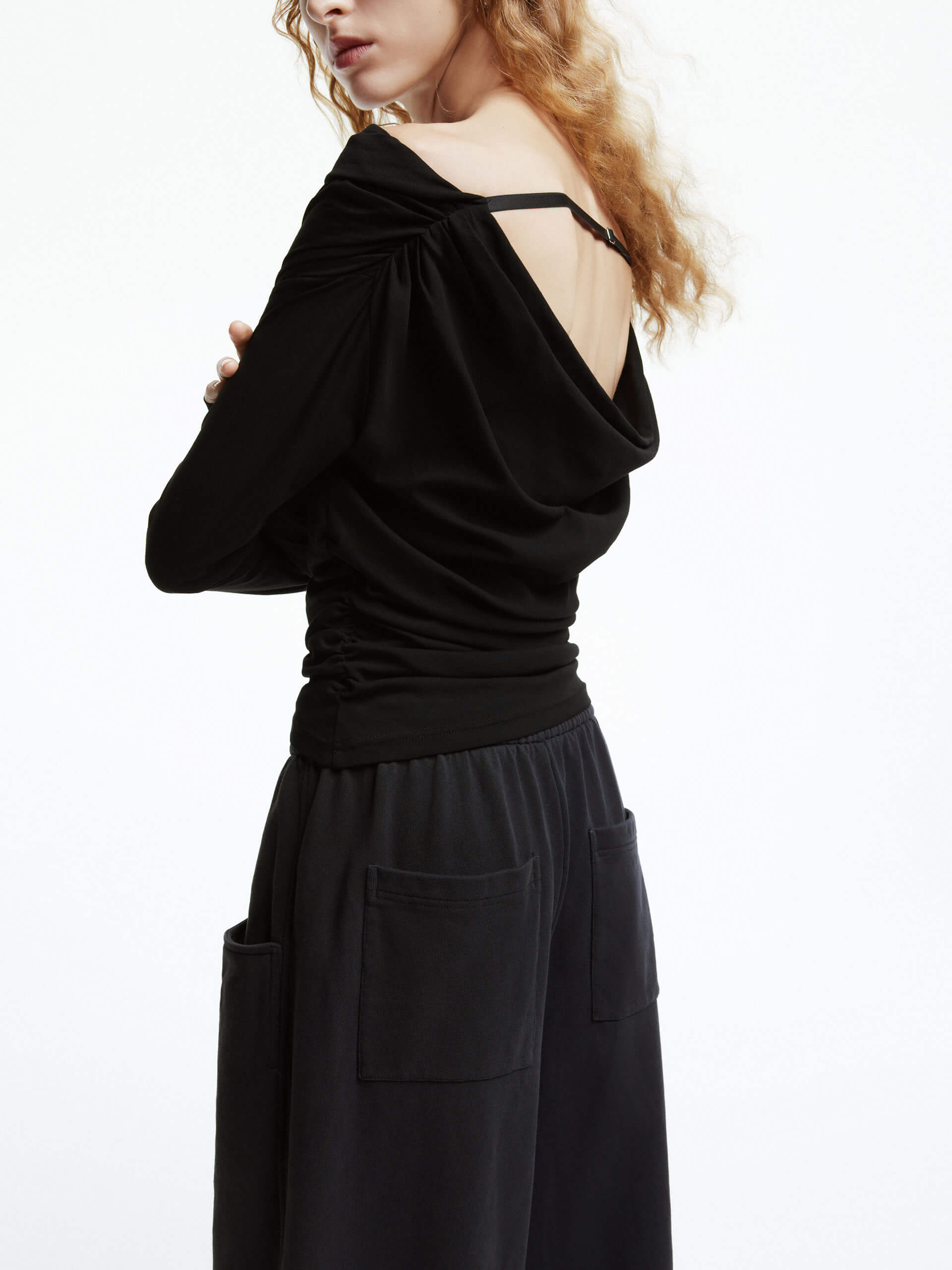 Indulge in comfort and effortless style with our top! Made with form-fitting, stretchy cotton material, this top not only feels amazing but also features a subtly alluring off-shoulder design. The unique wrinkled and back strap details add a touch of intrigue. Perfectly pairs with casual pants or shorts.