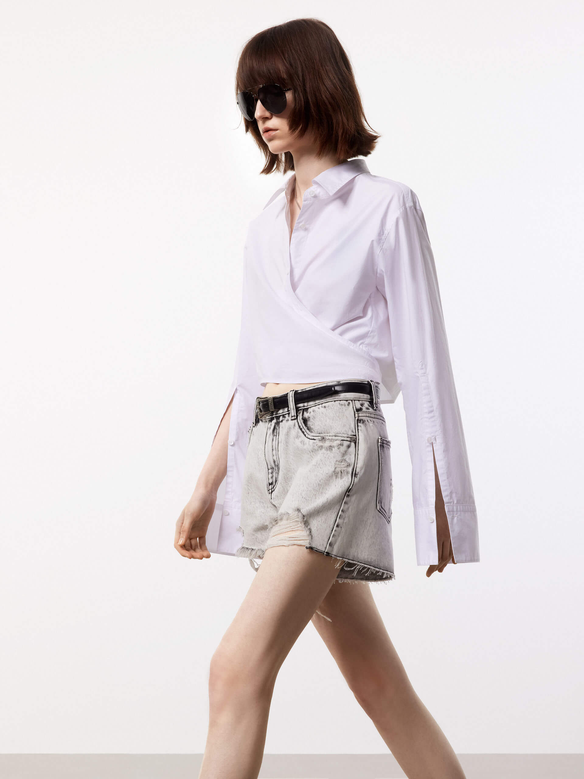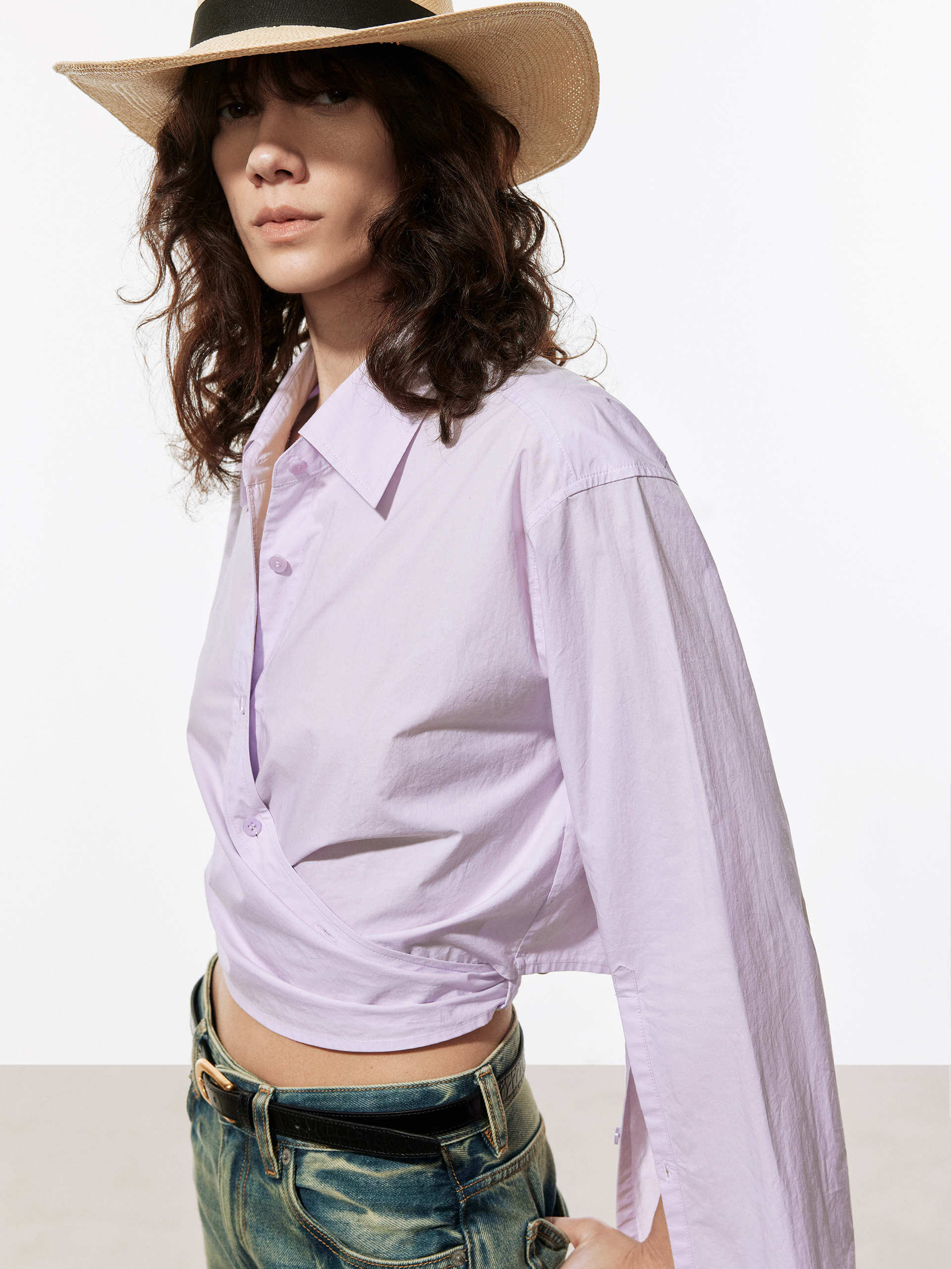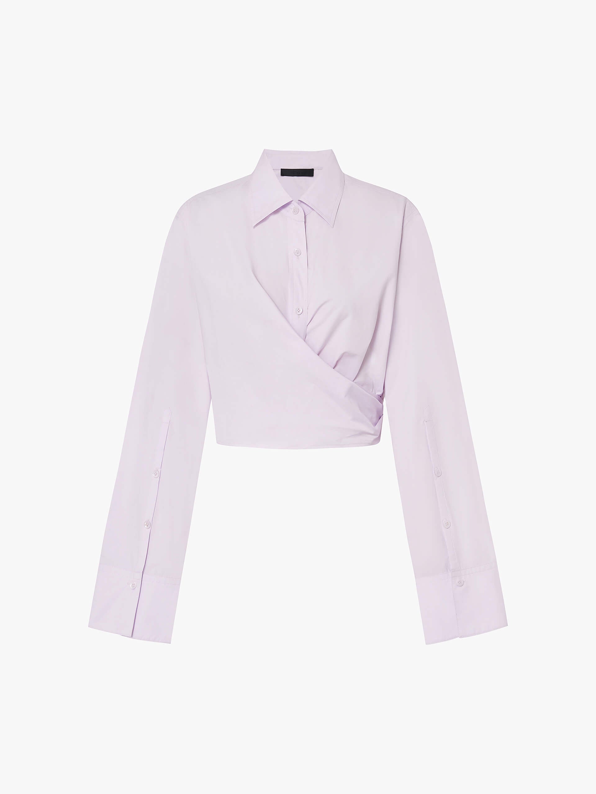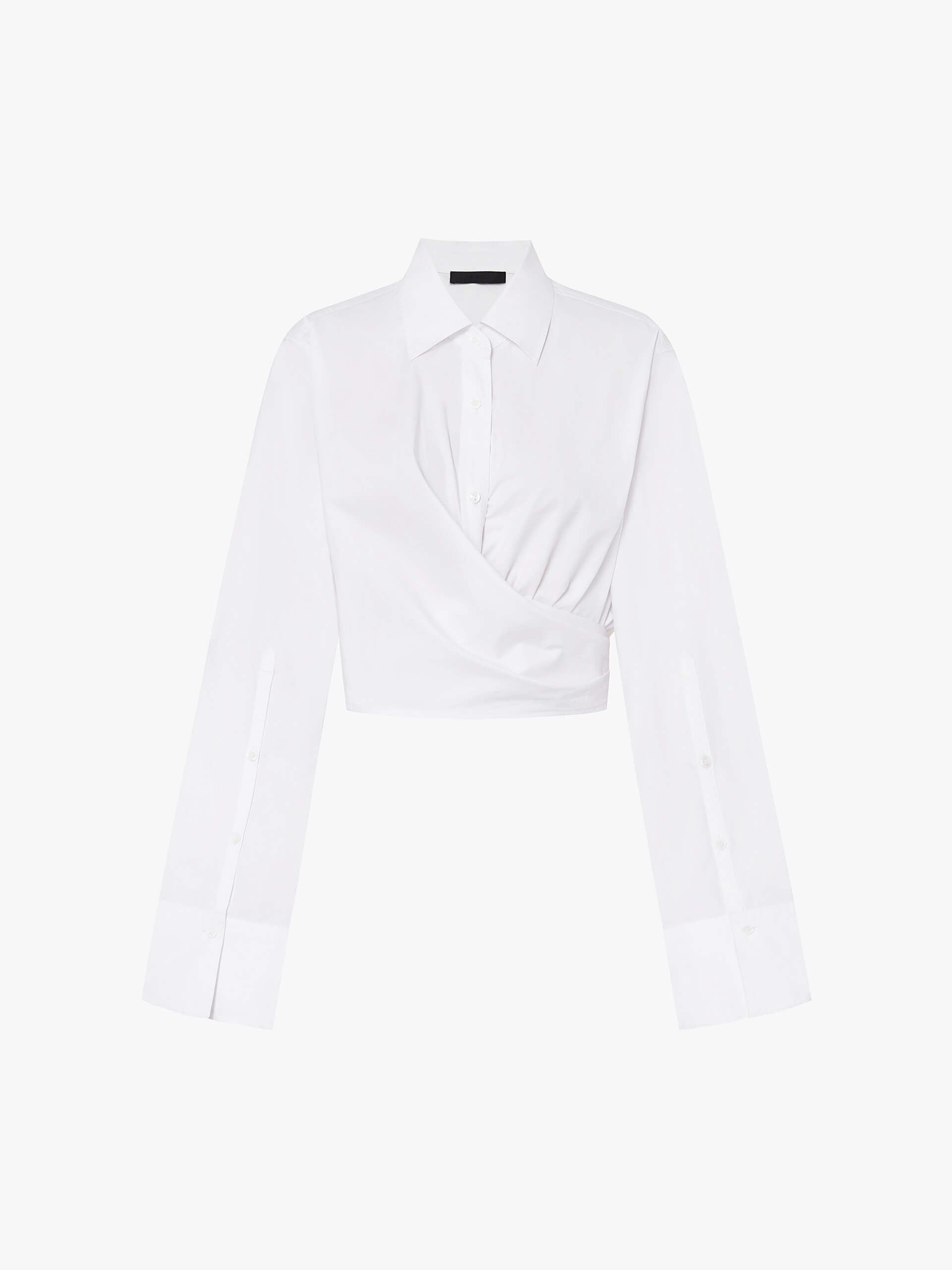 The MO&Co top is a stylish and comfortable piece of clothing made from 100% cotton. Features a shirt style with long cuffed sleeves and a button closure. The wrapped design adds a unique and fashionable touch to this top, making it perfect for any occasion. The cropped length of the top is ideal for pairing with high-waisted jeans or skirts, and the soft cotton fabric ensures a comfortable fit.