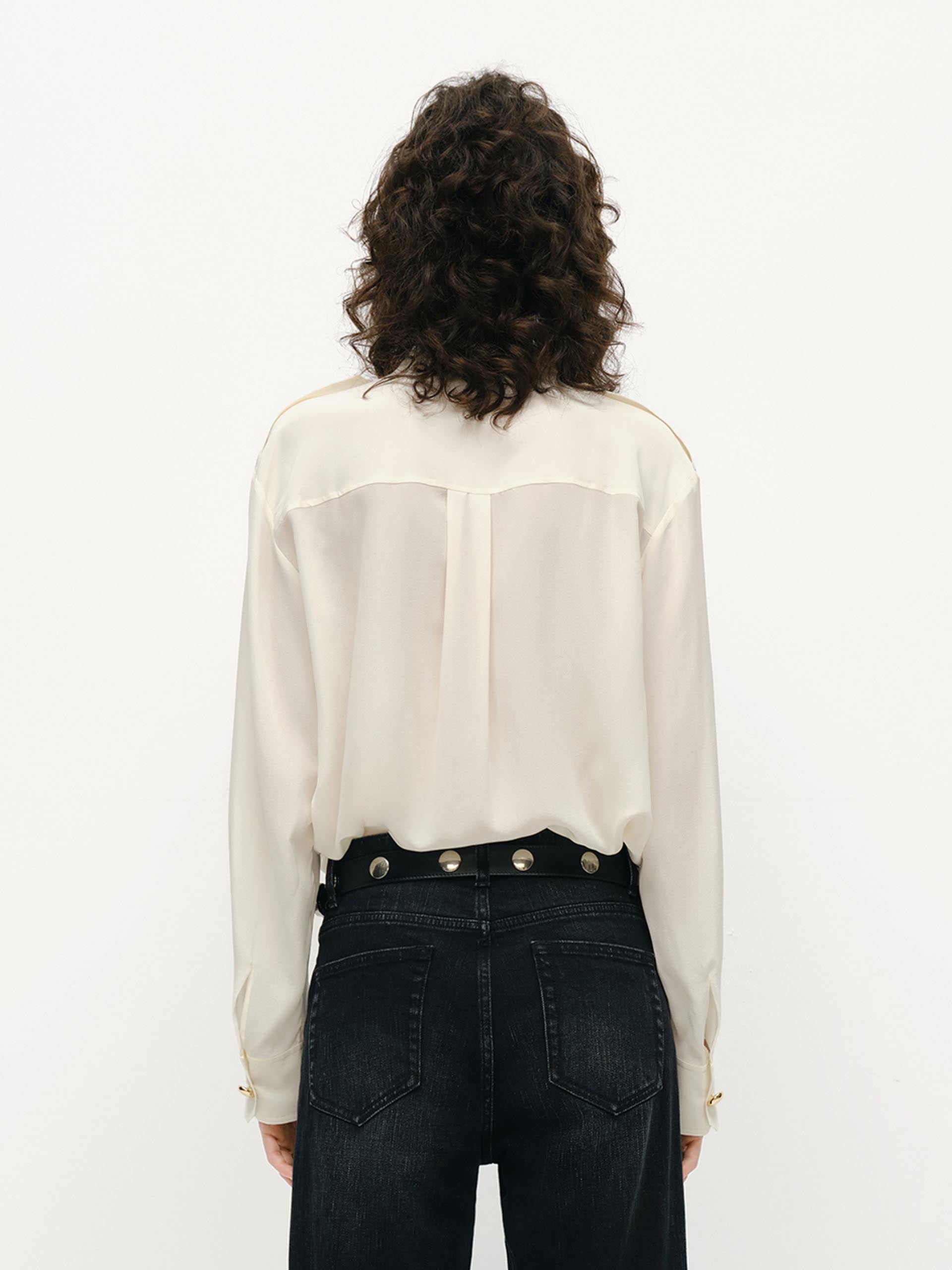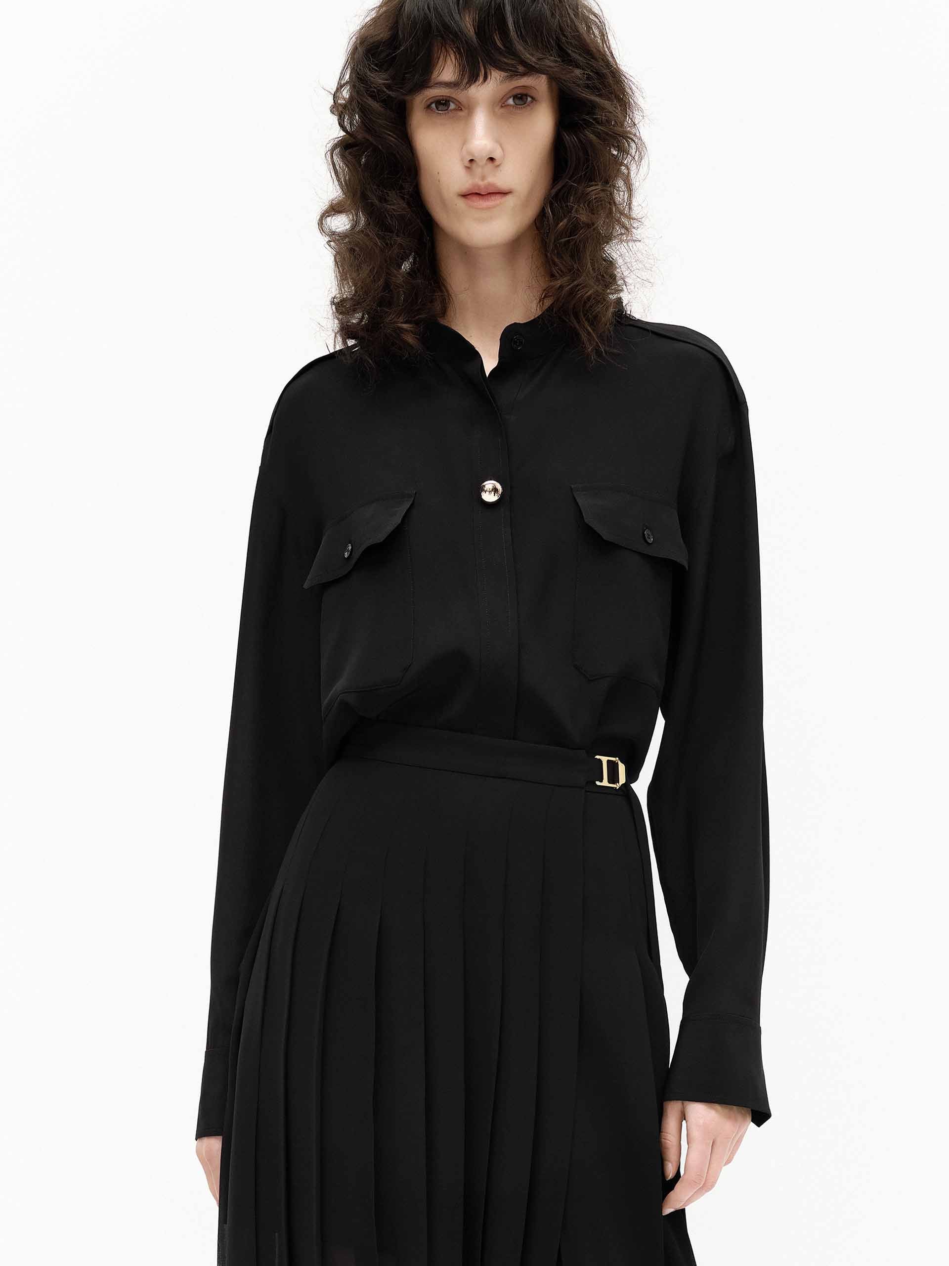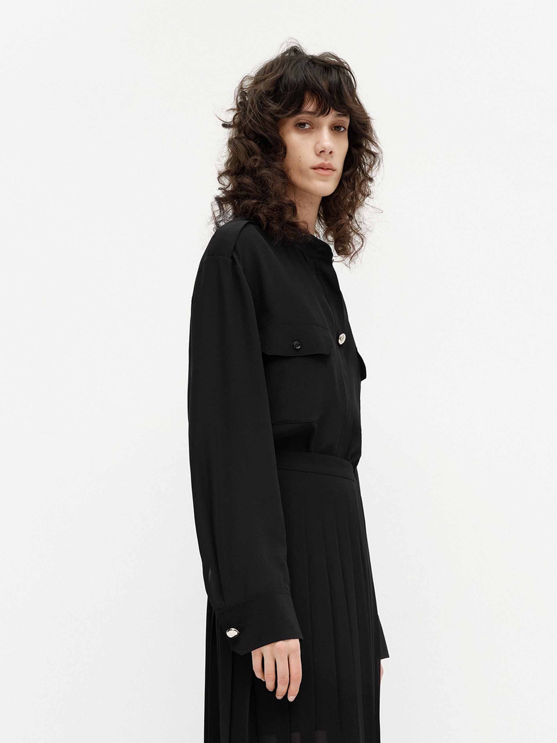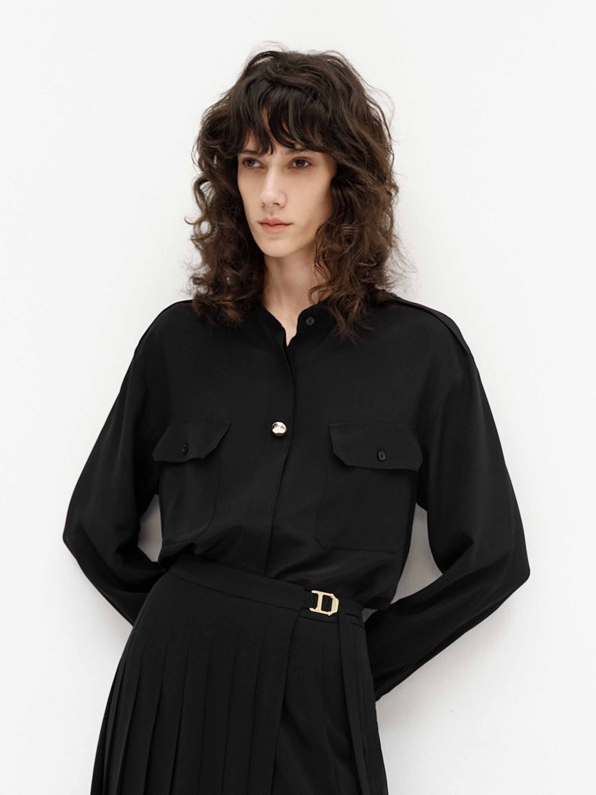 This professional and luxurious silk blouse is designed to provide comfort and style. Made from 100% silk, it features a front pocket, stand collar, and back pleated design for added roominess.