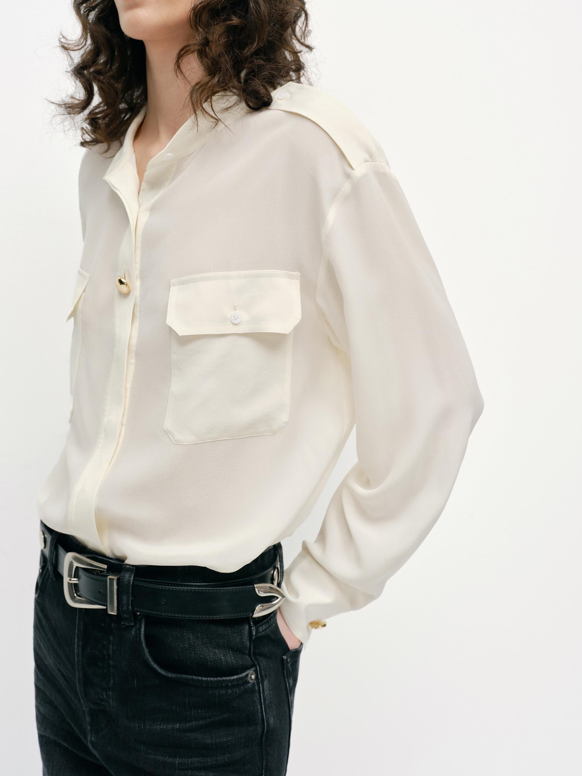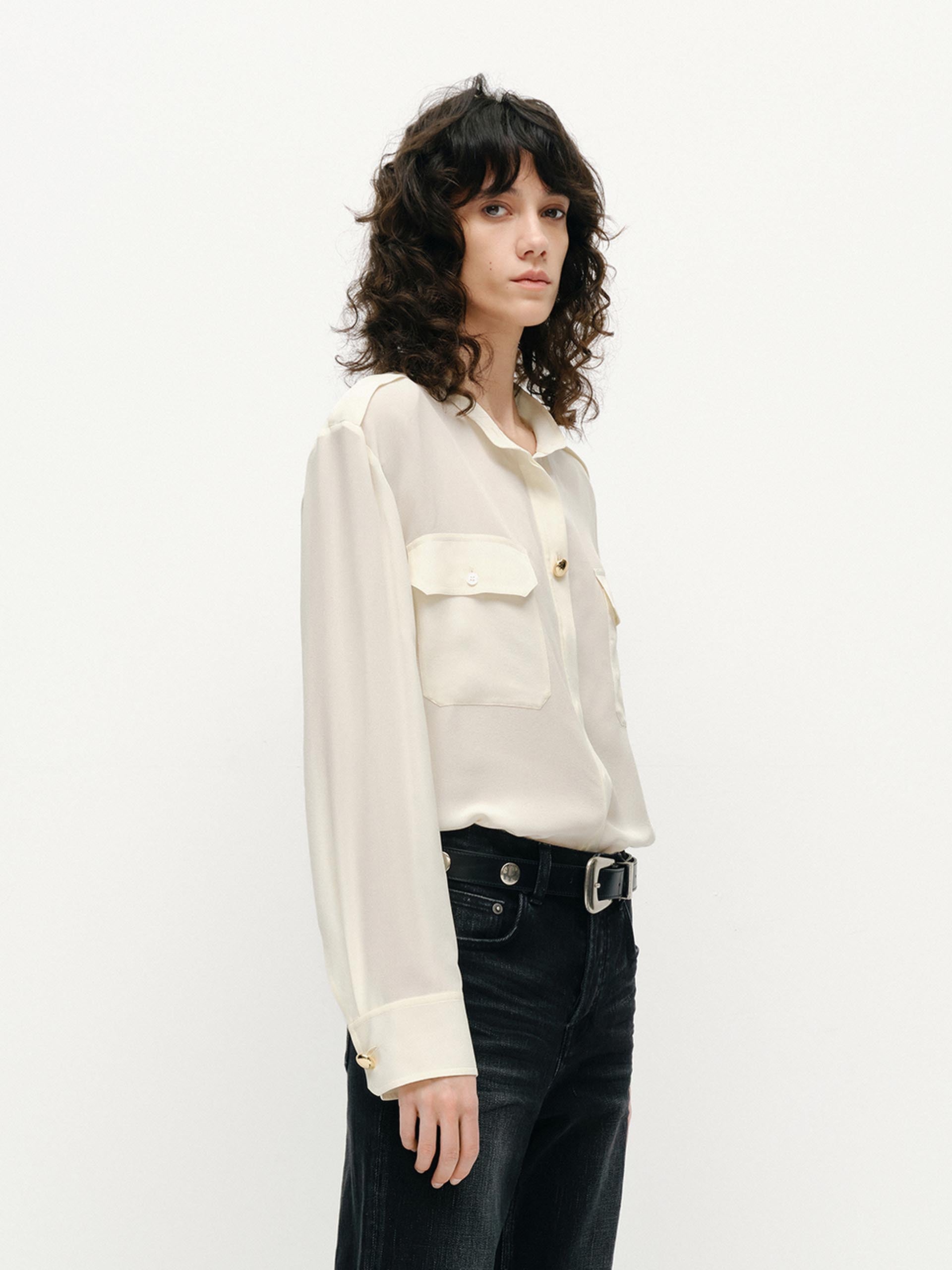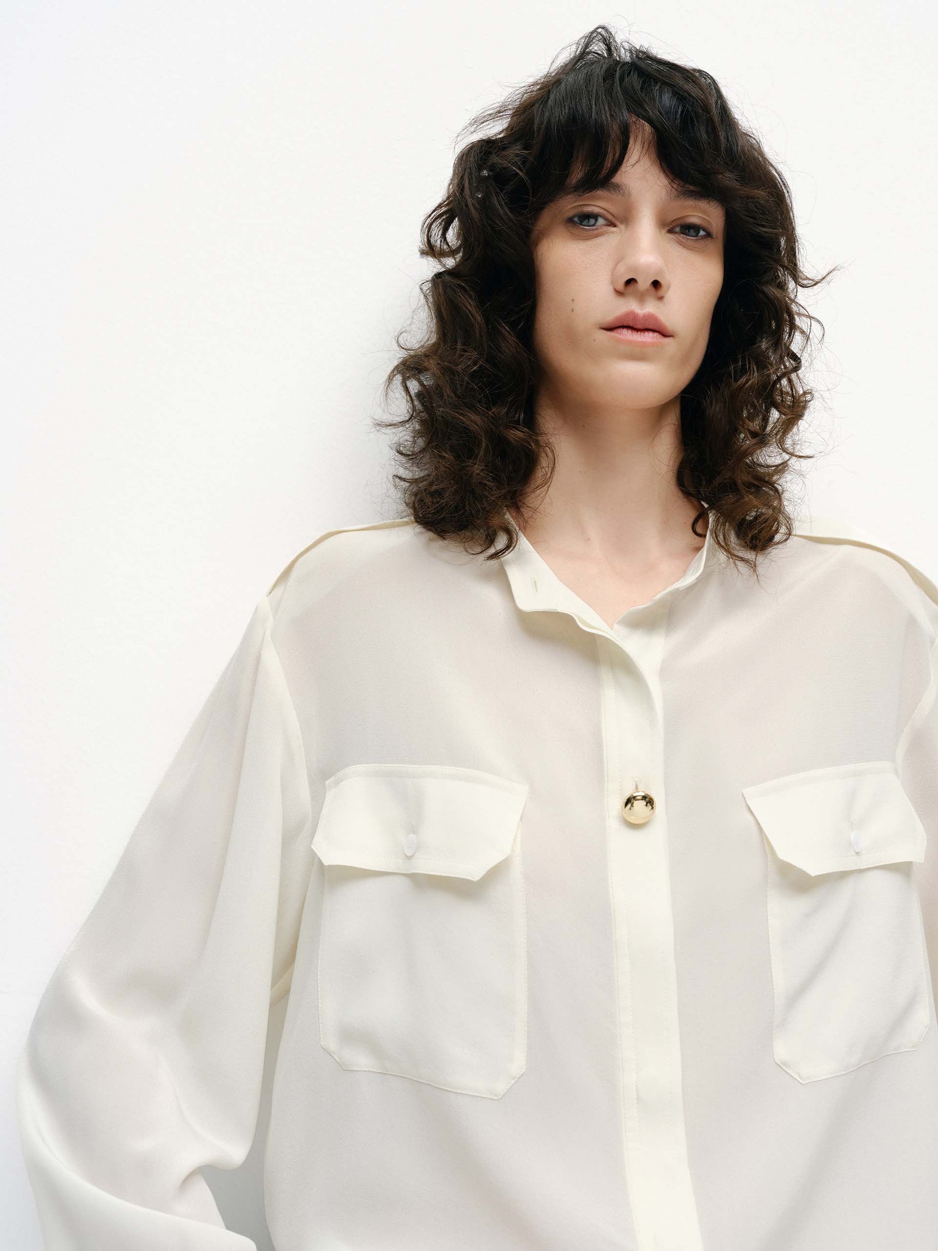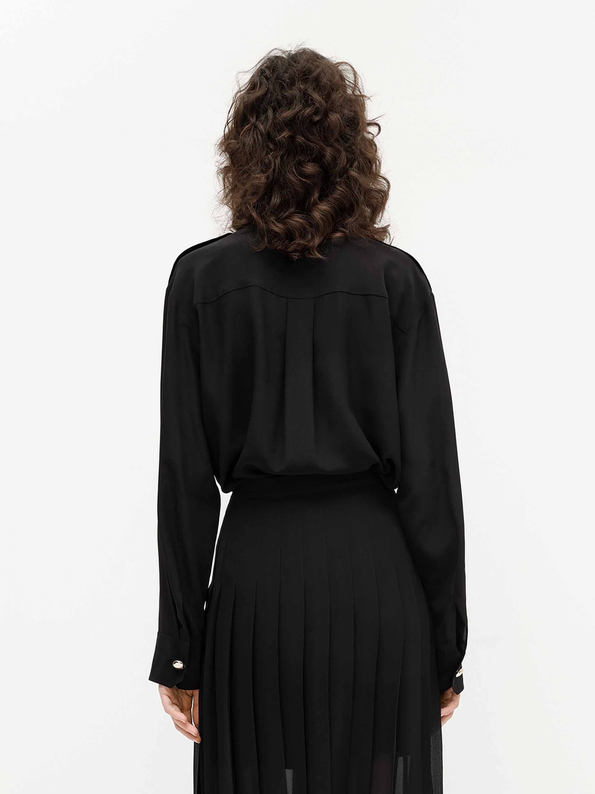 This professional and luxurious silk blouse is designed to provide comfort and style. Made from 100% silk, it features a front pocket, stand collar, and back pleated design for added roominess.