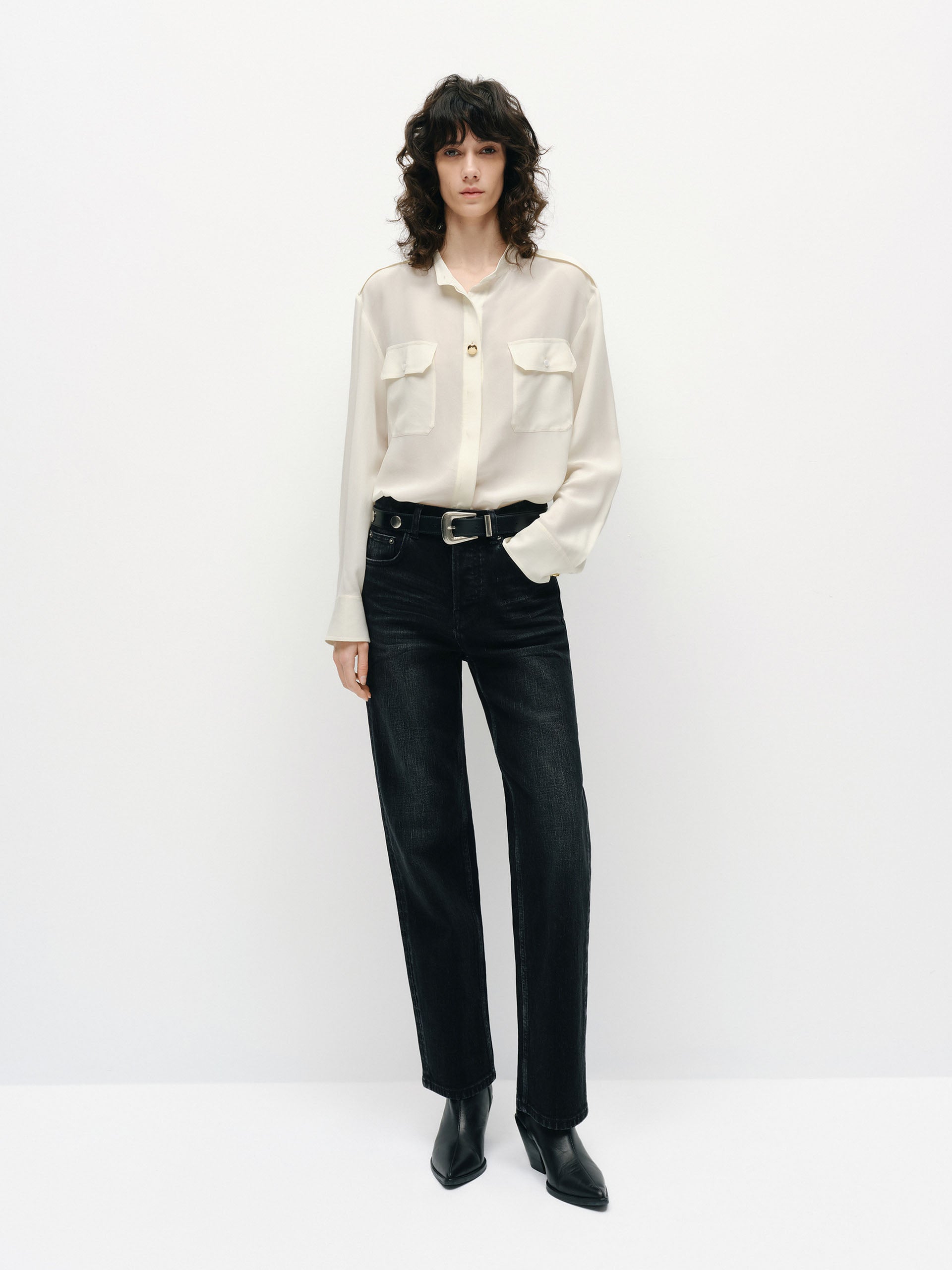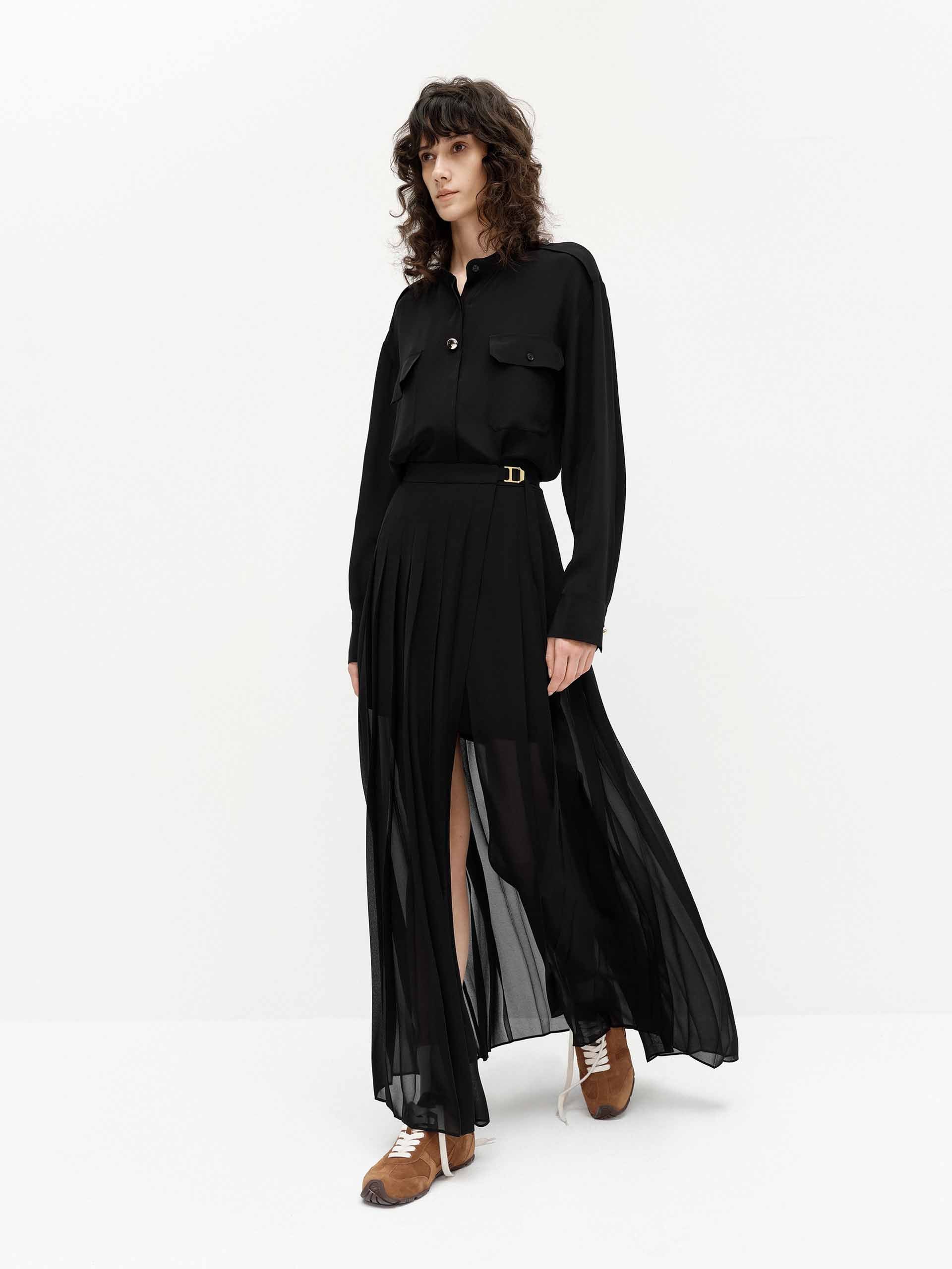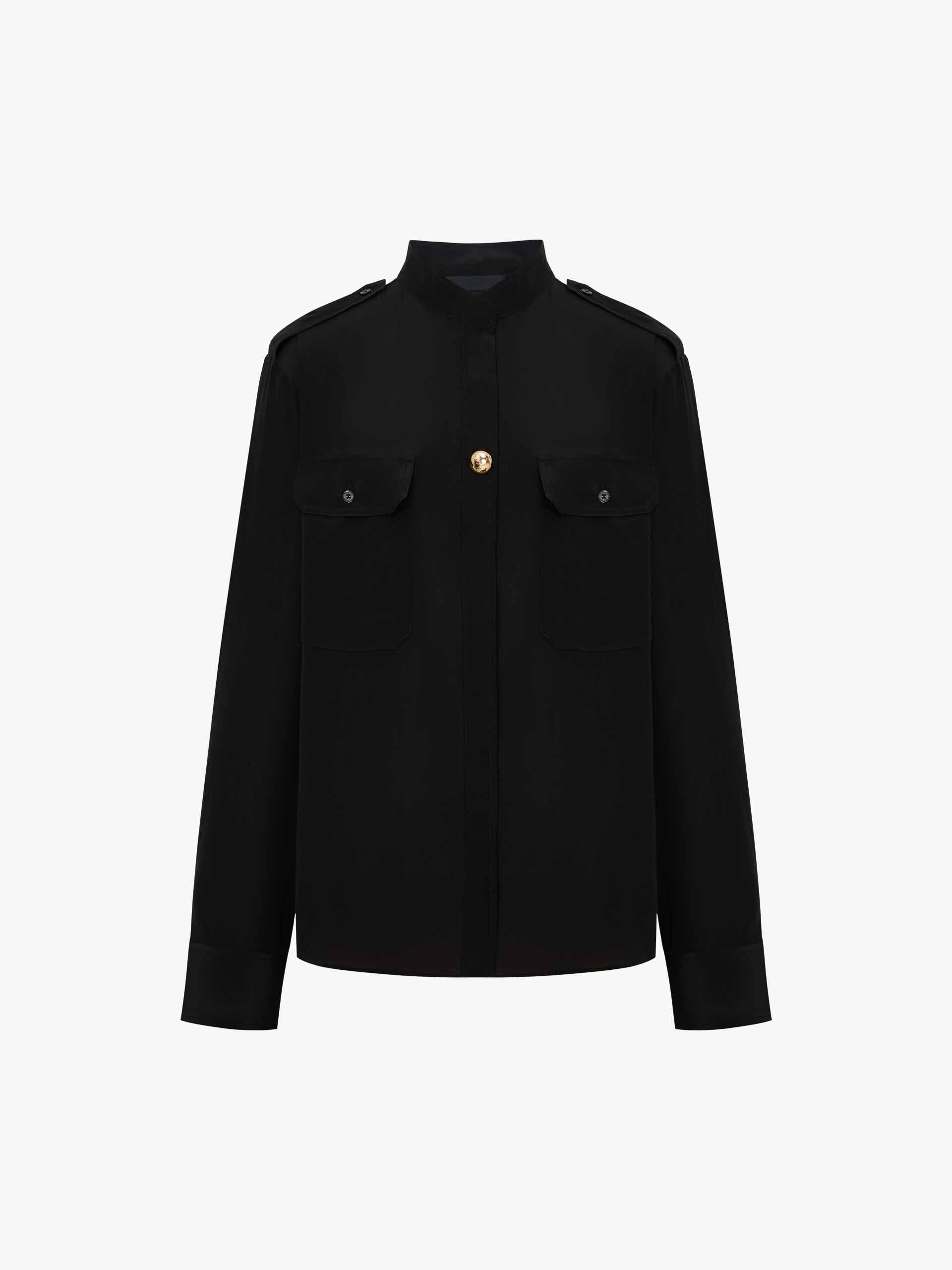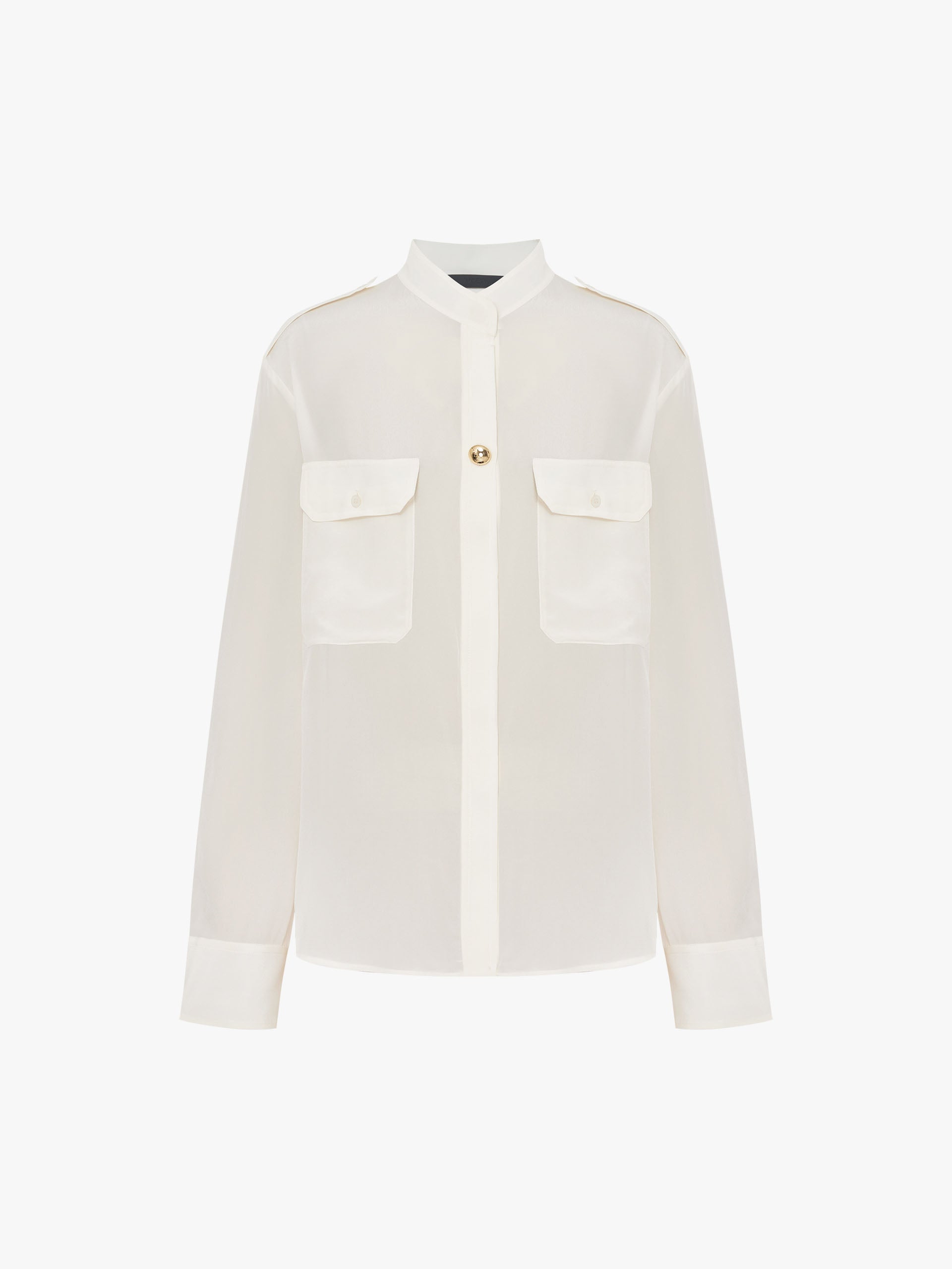 This professional and luxurious silk blouse is designed to provide comfort and style. Made from 100% silk, it features a front pocket, stand collar, and back pleated design for added roominess.