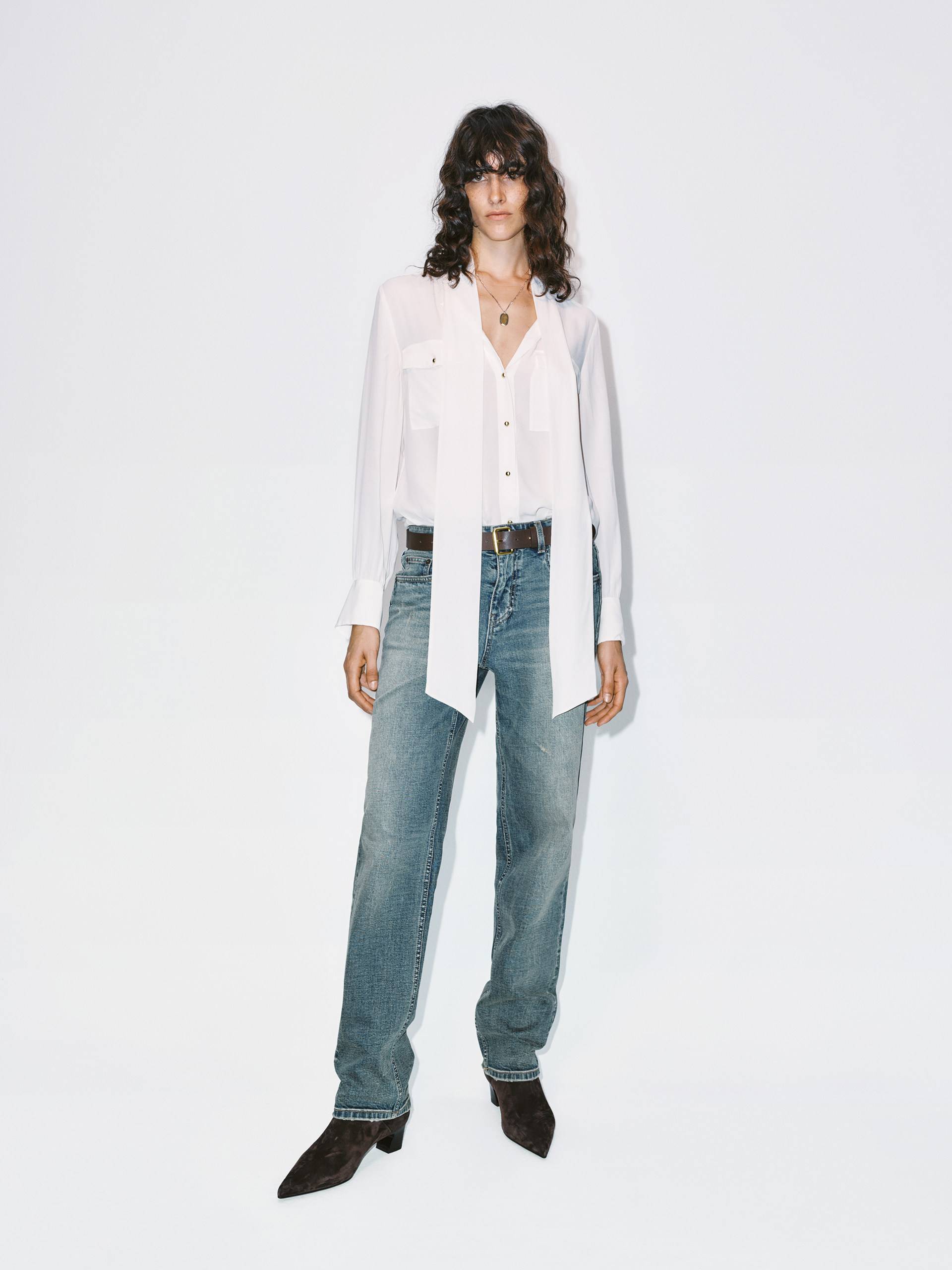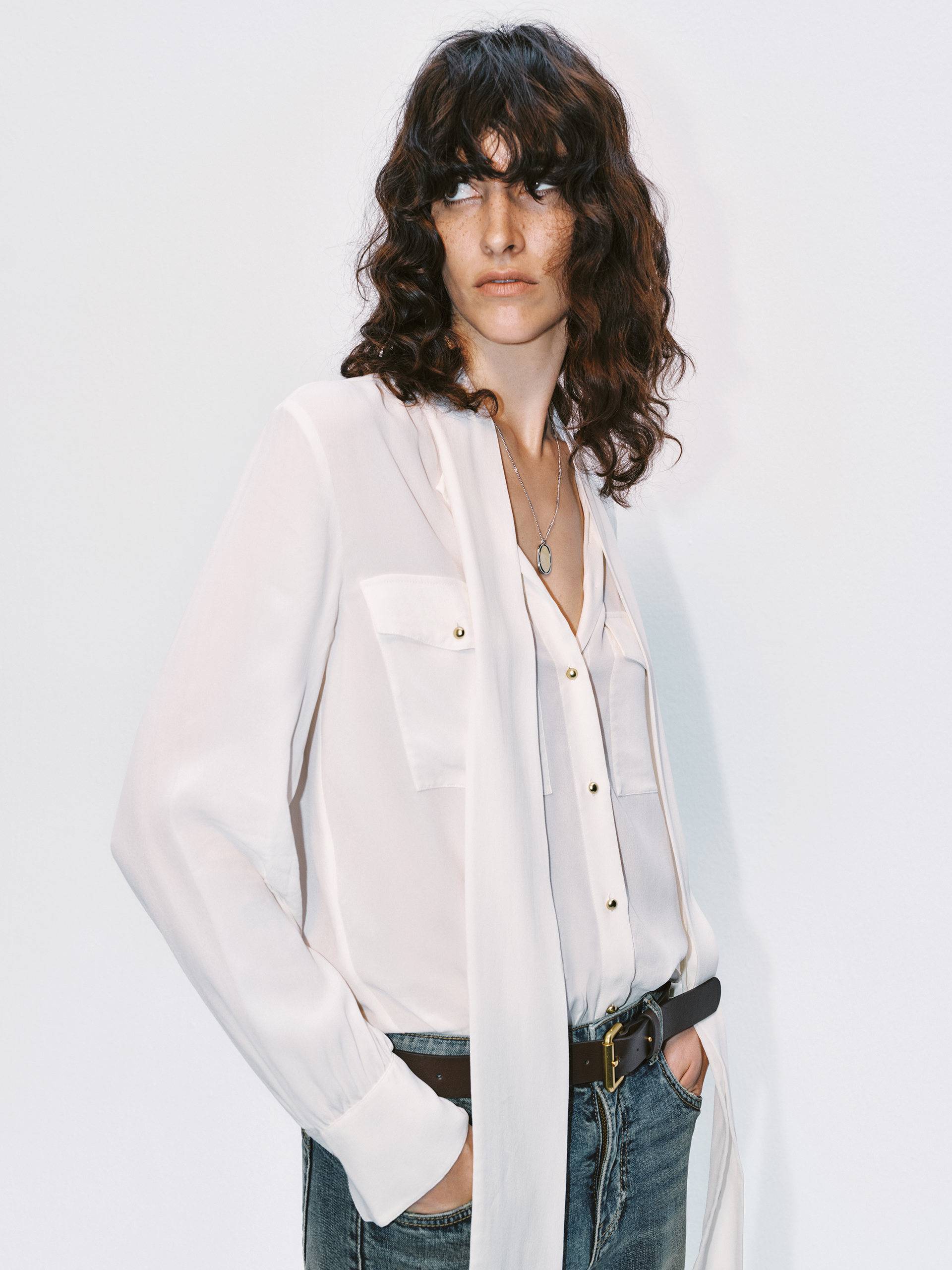 Effortlessly elegant and versatile, this blouse is crafted from lightweight chiffon for a graceful drape and comfortable feel. The long sleeves are finished with sophisticated button cuffs, allowing adjustable styling, while a delicate button closure runs smoothly down the front. Practical and chic, the chest pockets add a touch of functionality, and the front tie detail lets you customize the look.