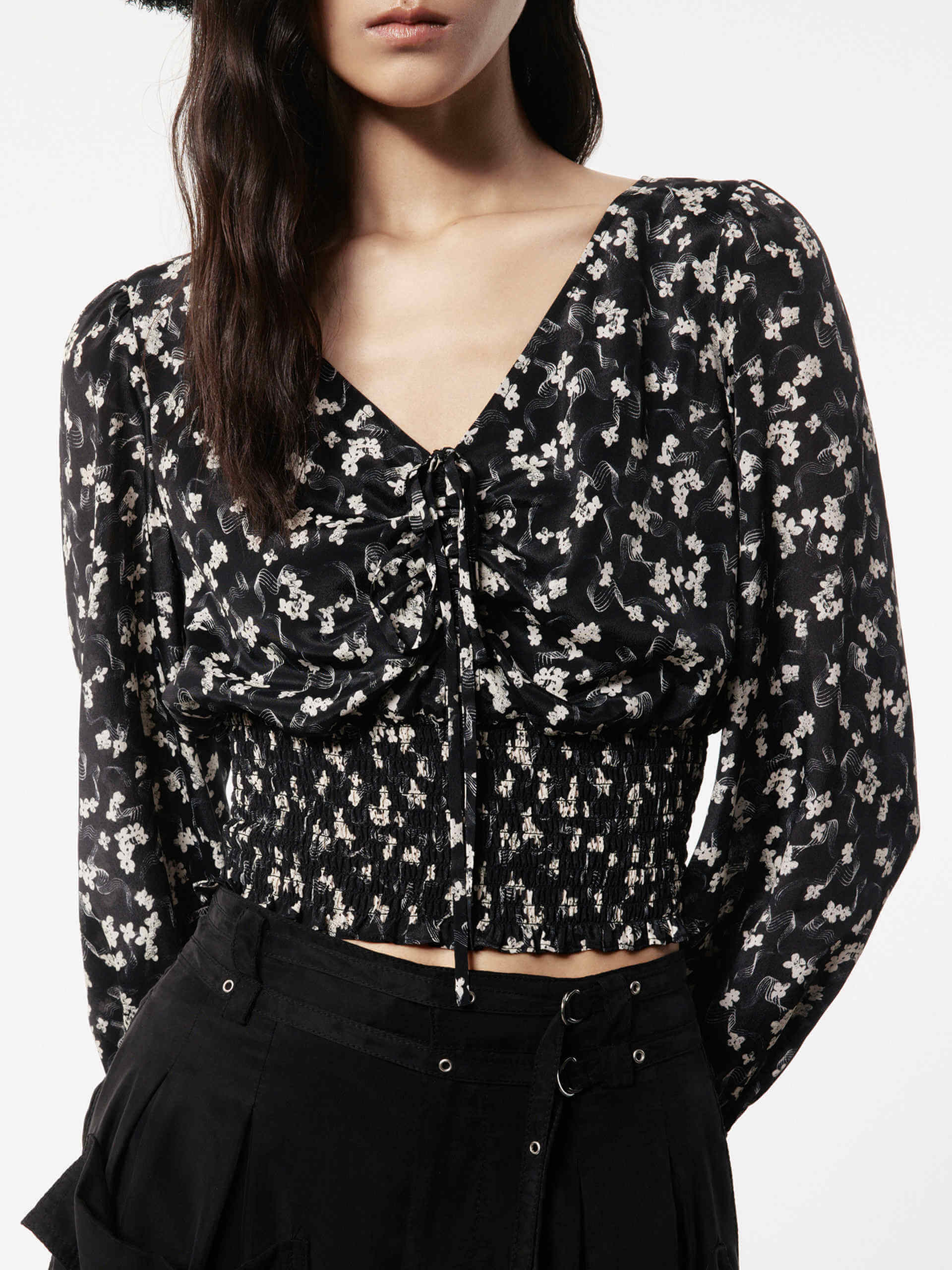 This blouse is made from a soft and smooth silk blend material for a comfortable and elegant feel. It features a V-neckline with a self-tie detail that adds a touch of femininity to the design. The slim fit and cropped length of the blouse make it perfect for pairing with high-waisted pants or skirts.