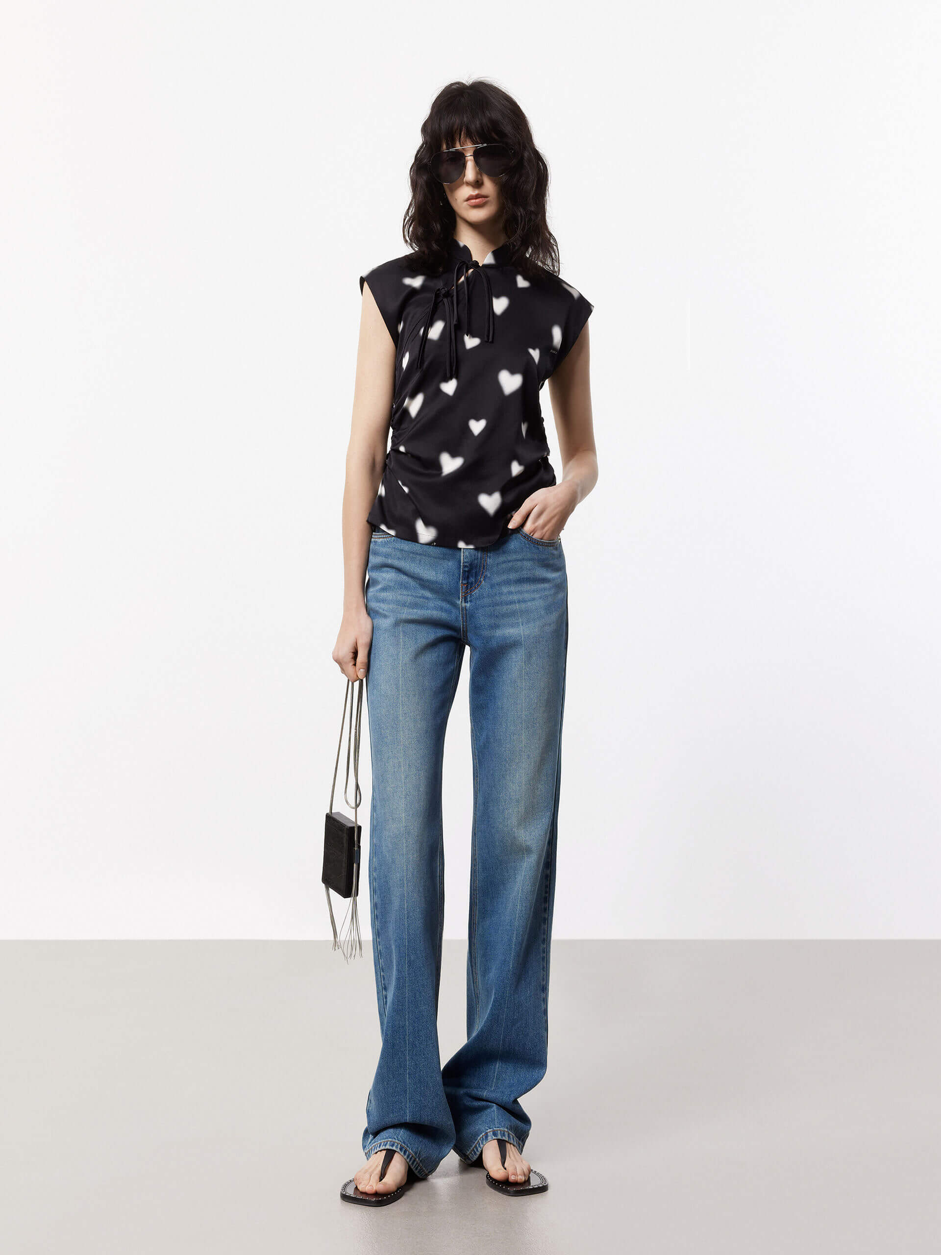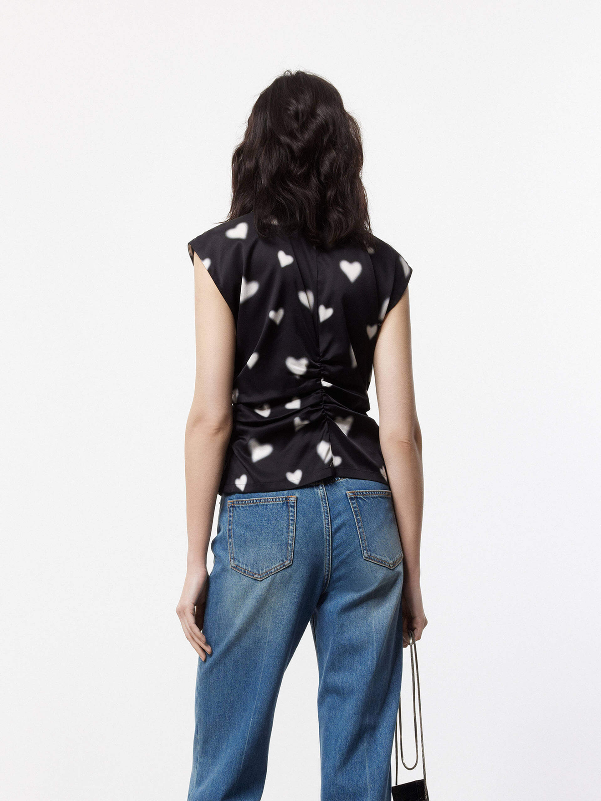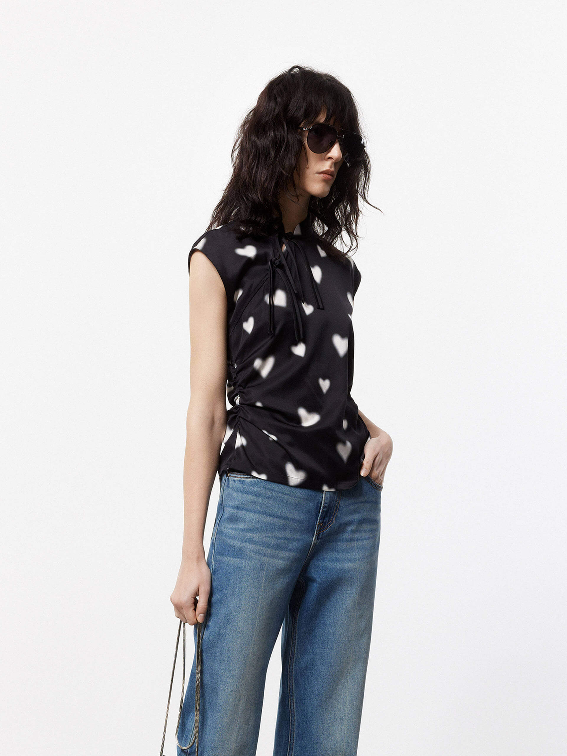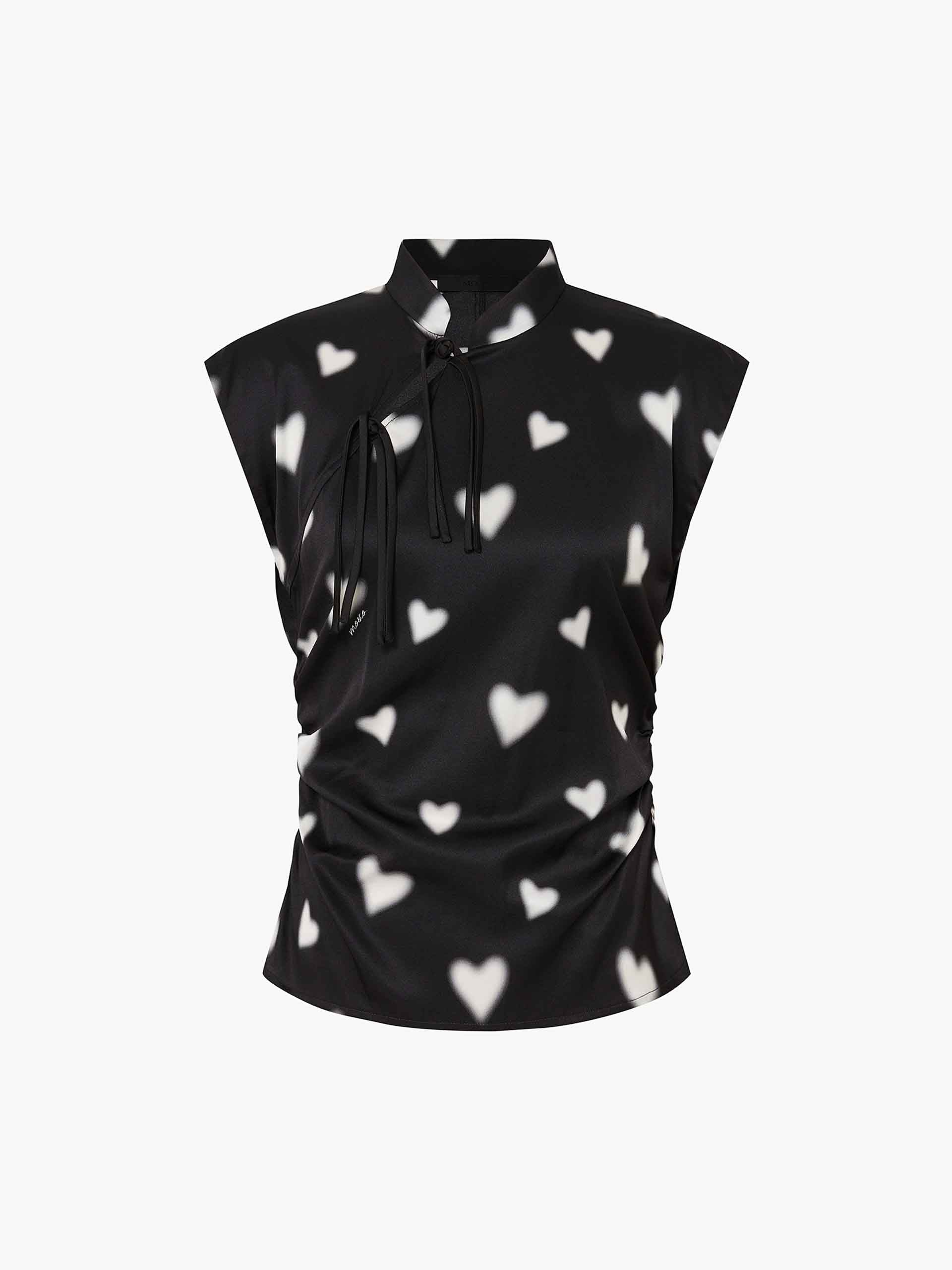 Crafted from a luxurious silk blend that feels smooth and elegant against the skin. Features a heart pattern and pleated details add a feminine and playful touch. The Neo-Chinese style adds a cultural touch and the stand collar gives it a modern look.