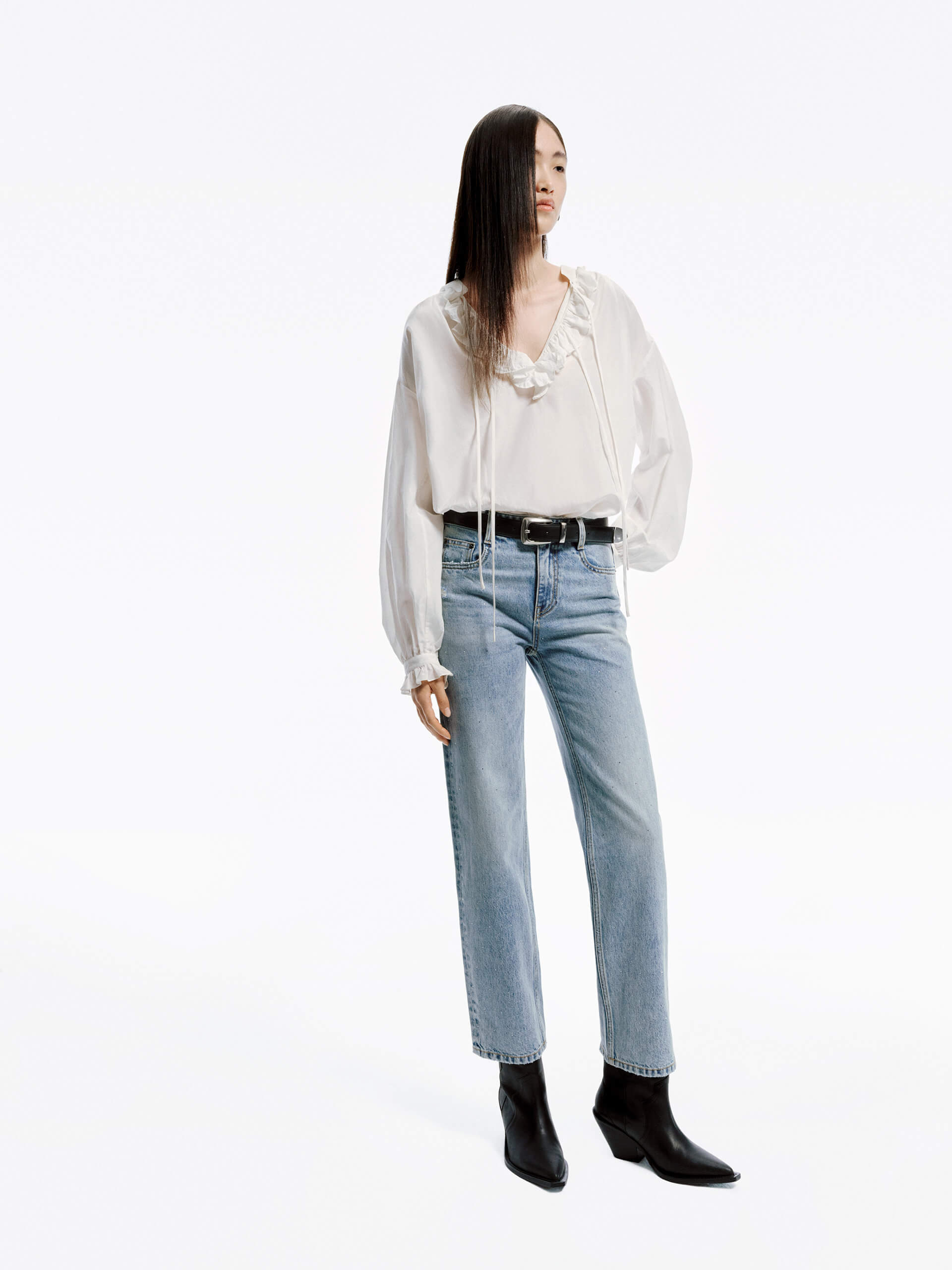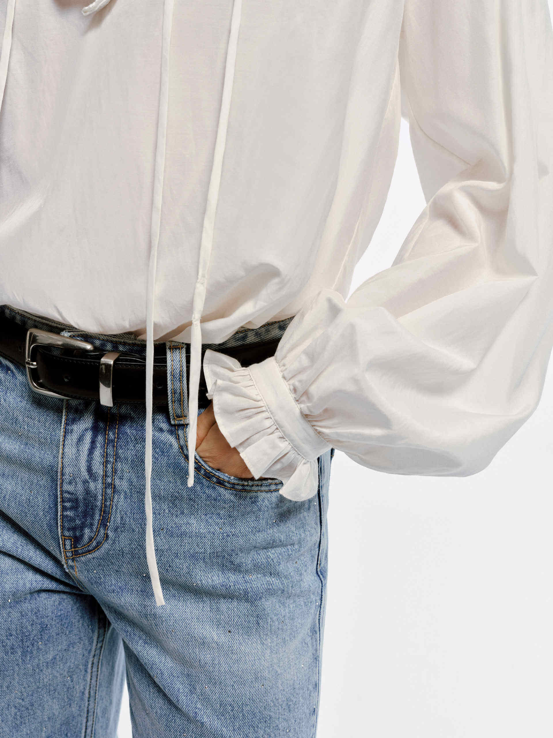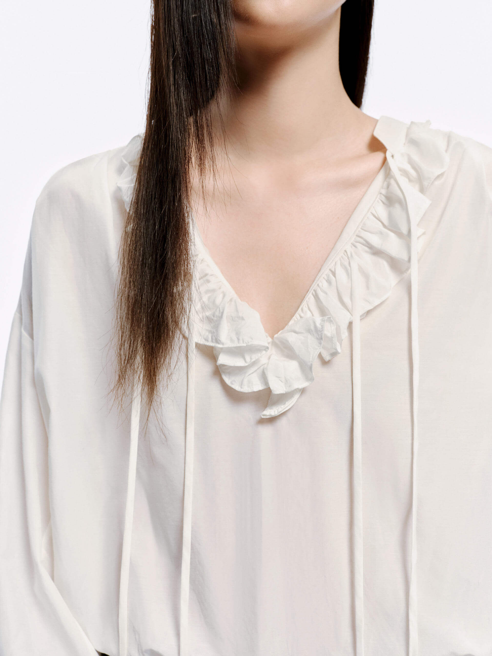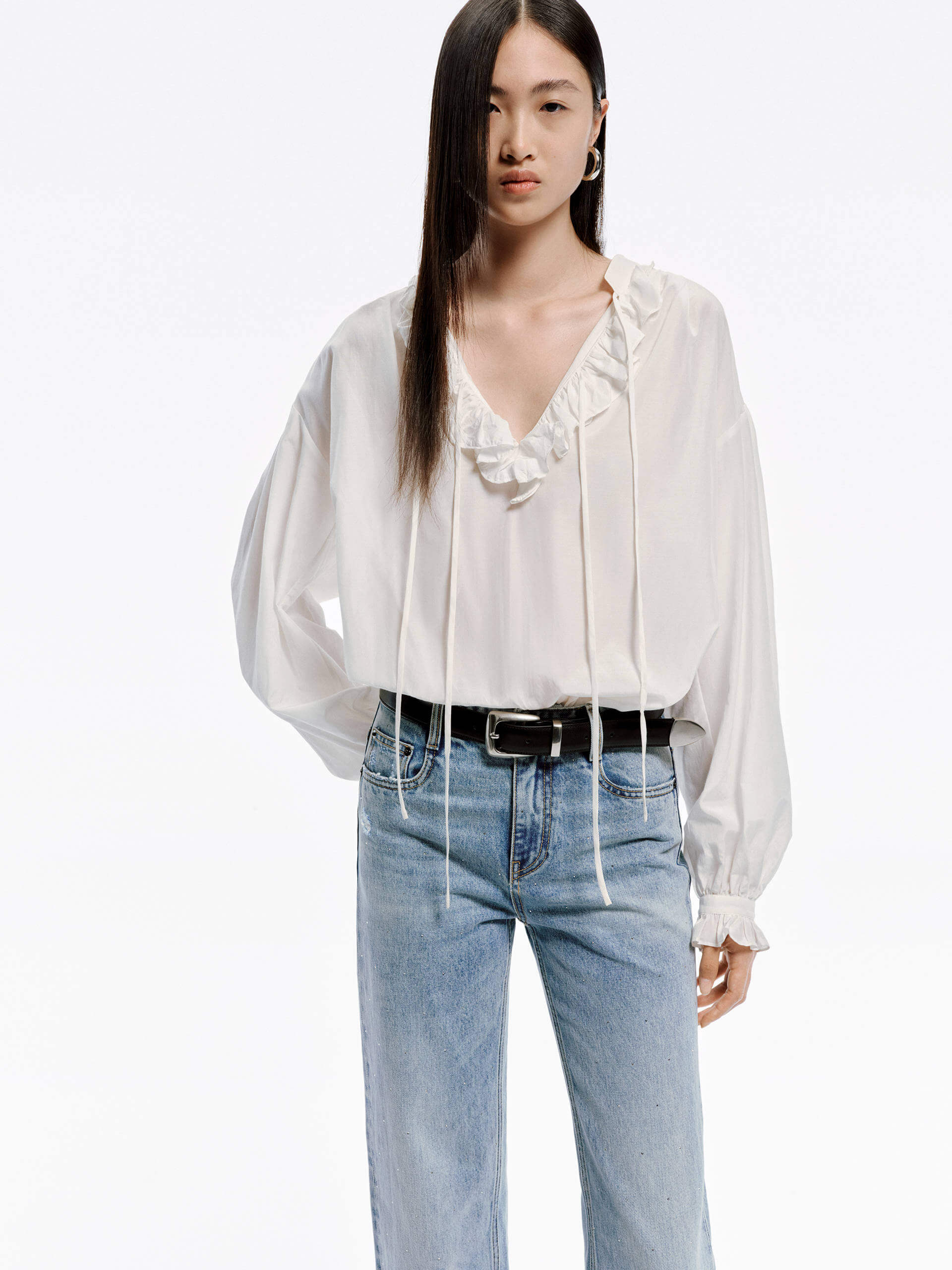 Crafted from a blend of cotton and silk, this blouse features billowy sleeves with delicate ruffled cuffs and a V-neckline with a self-tie design. The loose silhouette pairs perfectly with high-waisted jeans for a chic, effortless look.