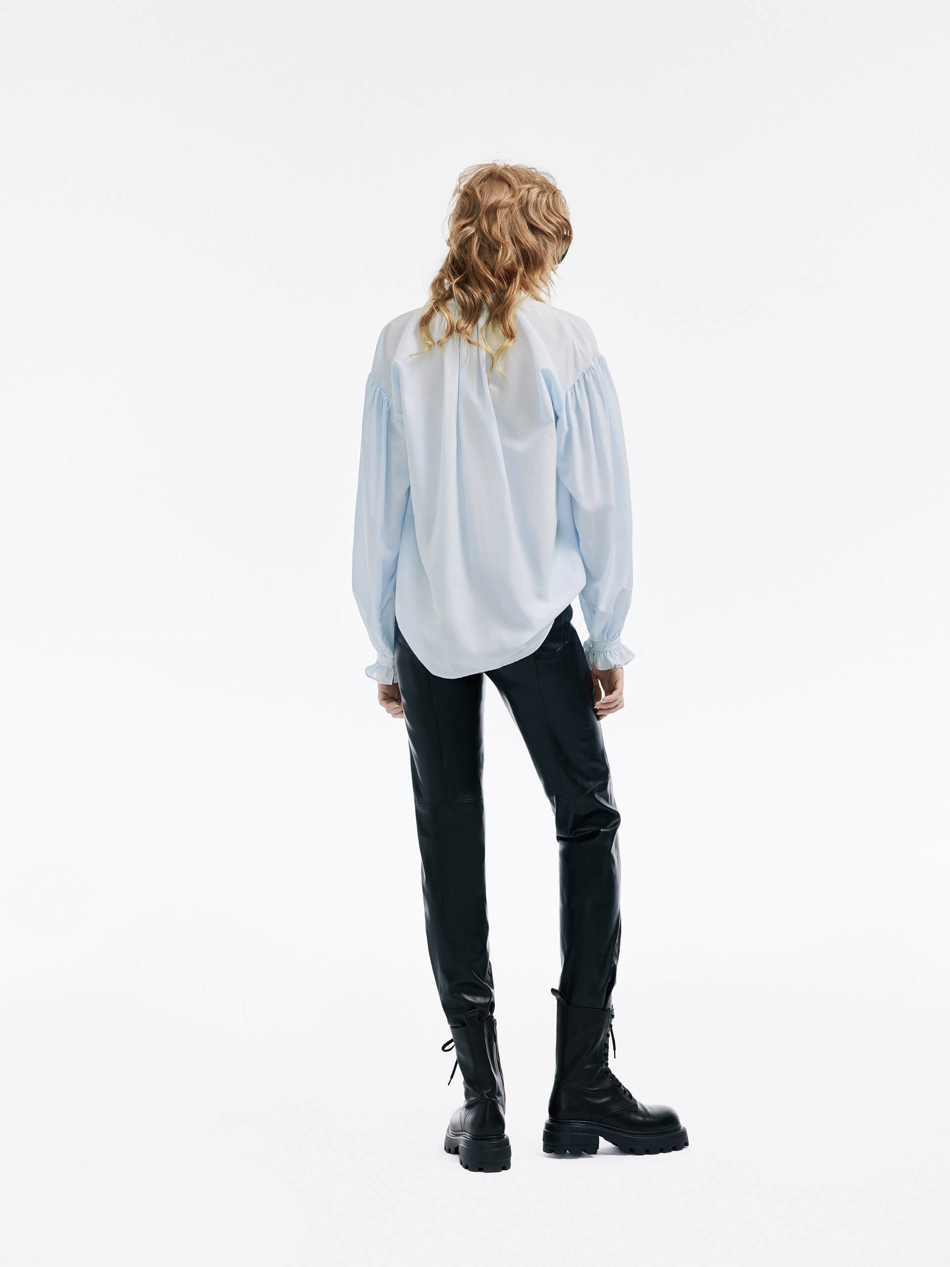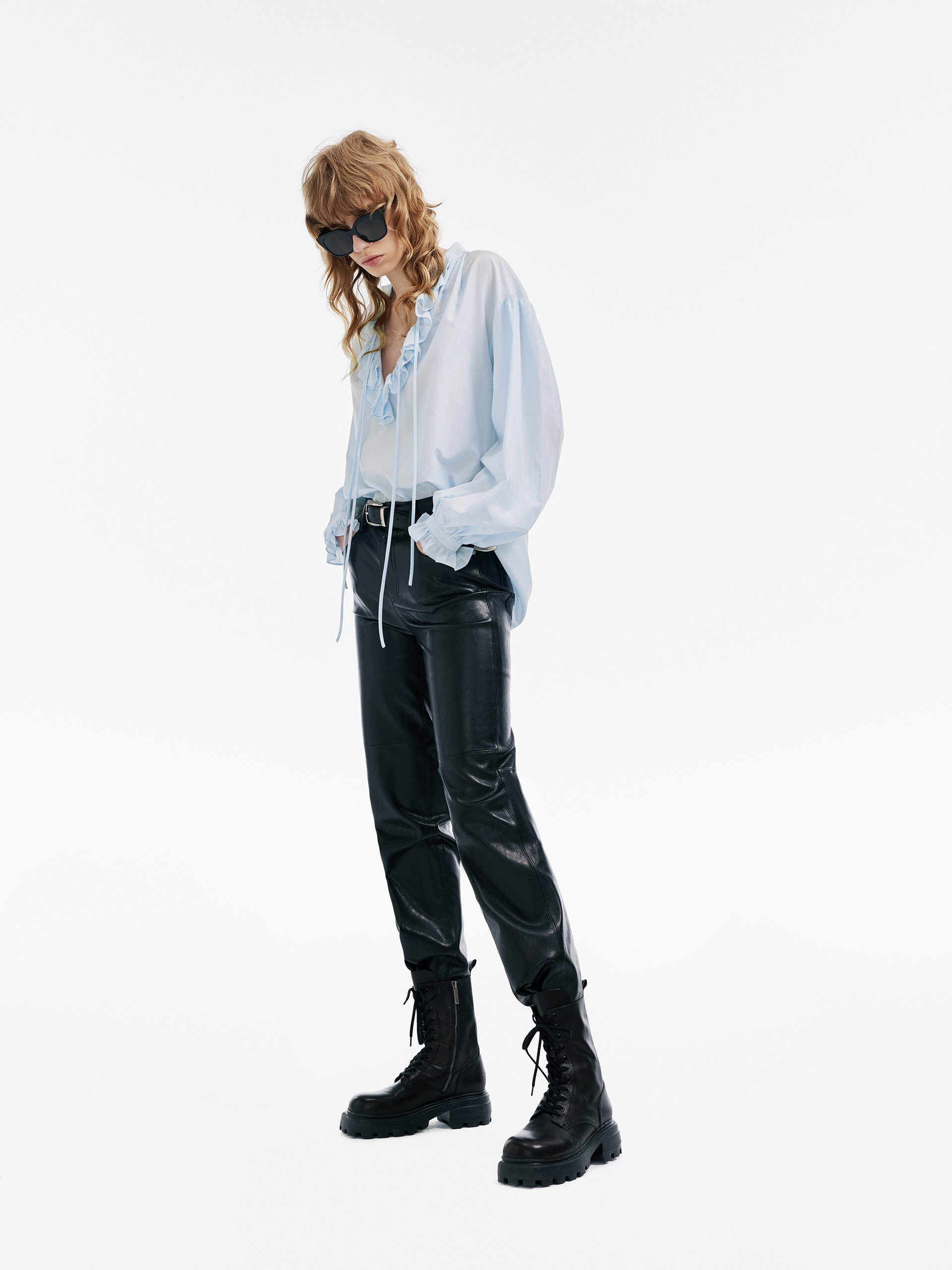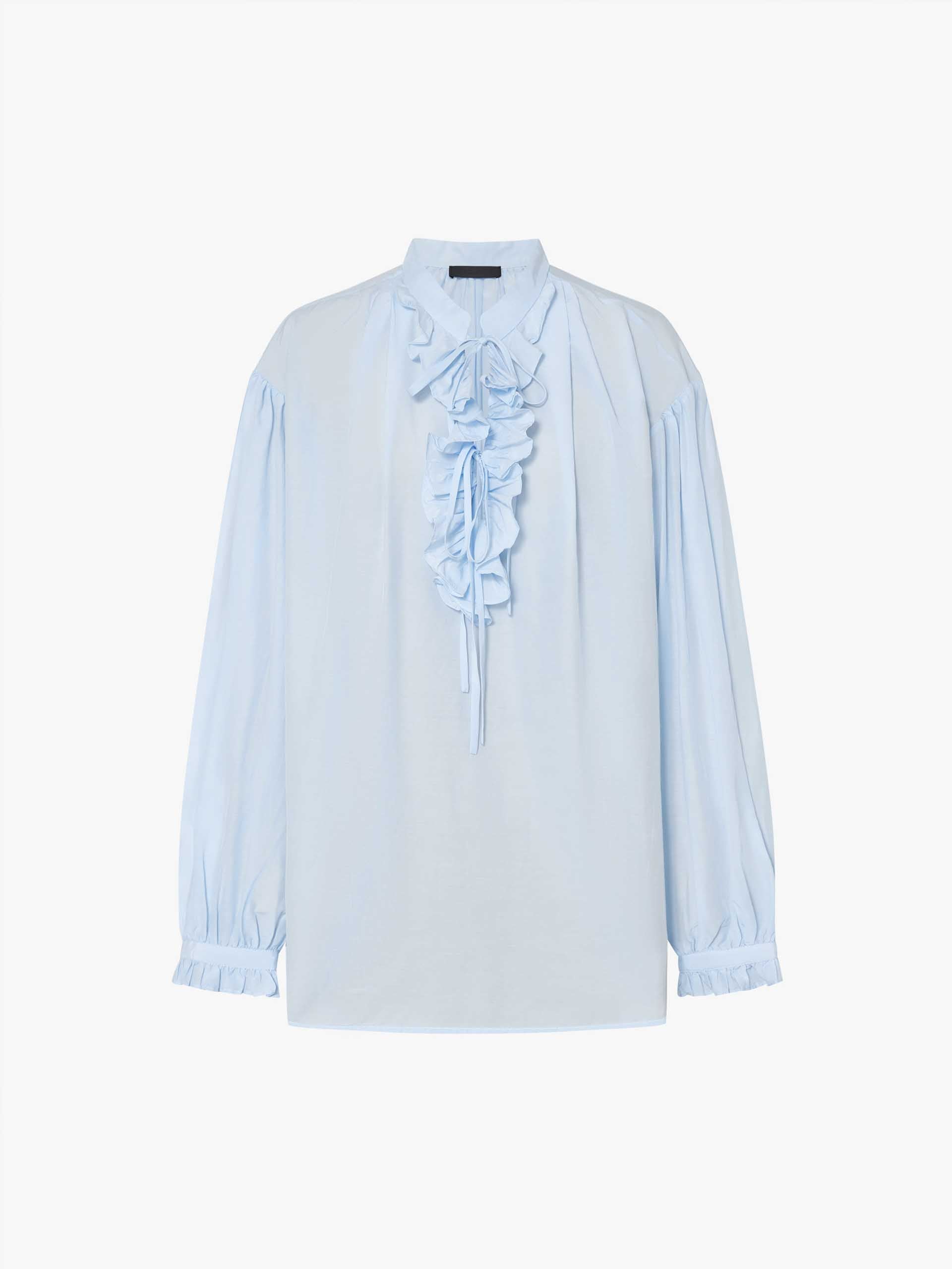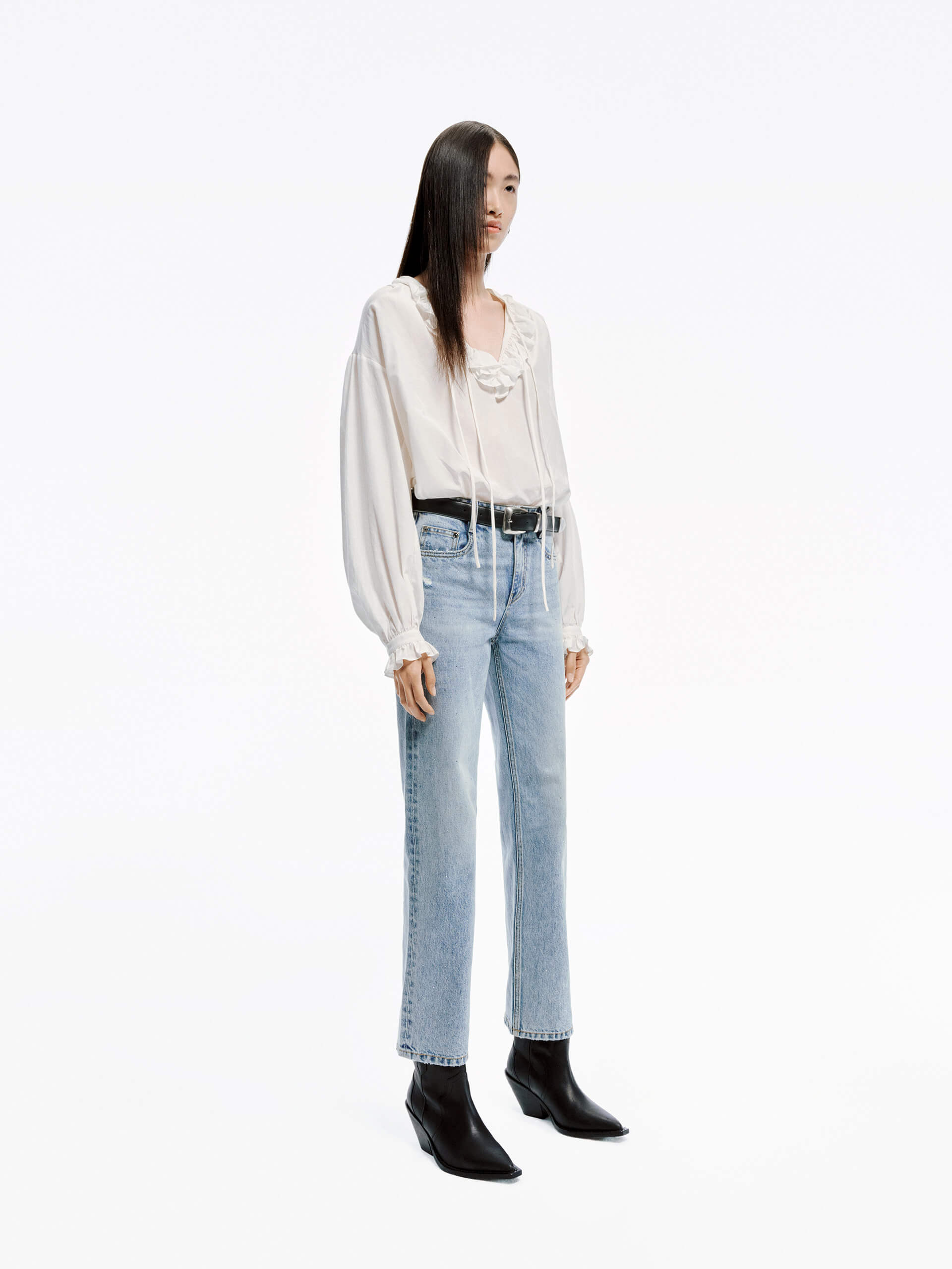 Crafted from a blend of cotton and silk, this blouse features billowy sleeves with delicate ruffled cuffs and a V-neckline with a self-tie design. The loose silhouette pairs perfectly with high-waisted jeans for a chic, effortless look.