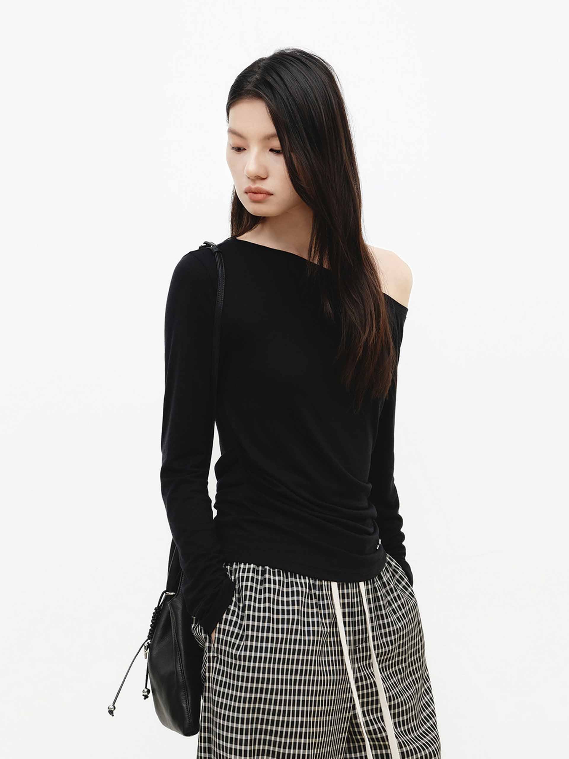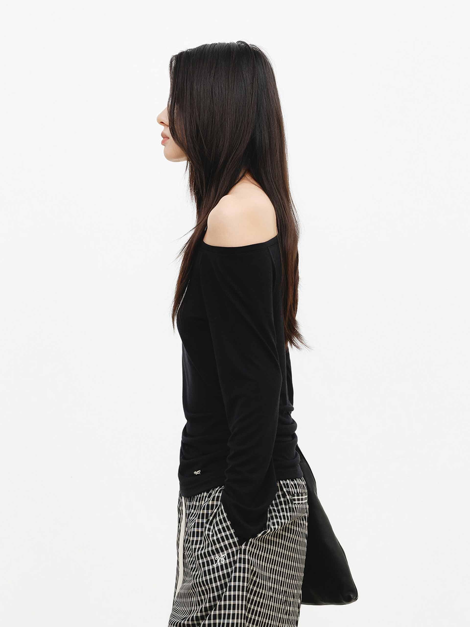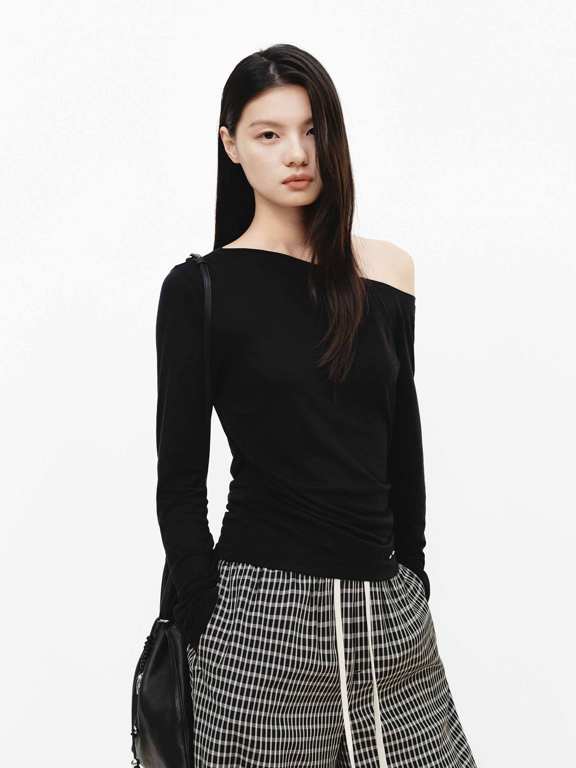 This blouse features a tailored fit that precisely accentuates the figure. The off-the-shoulder design subtly reveals the collarbone, exuding a touch of elegance within its softness. Made from a solid-color wool blend, it radiates a mature and gentle charm, making it perfect for dates or formal occasions.