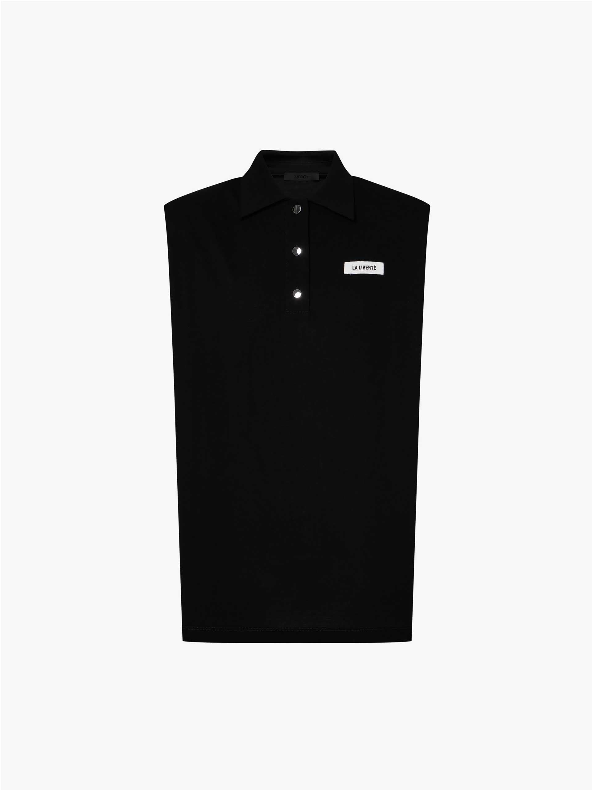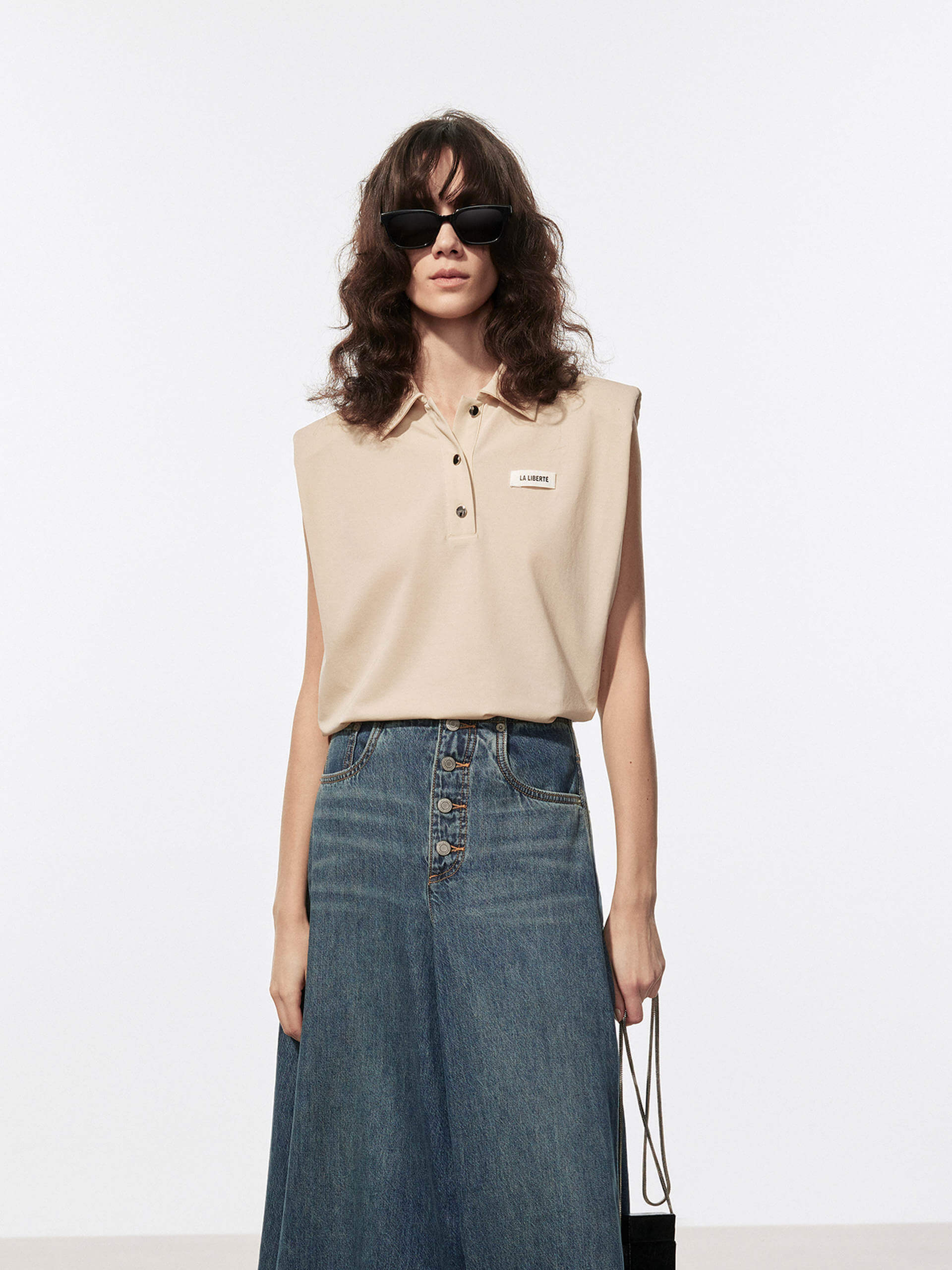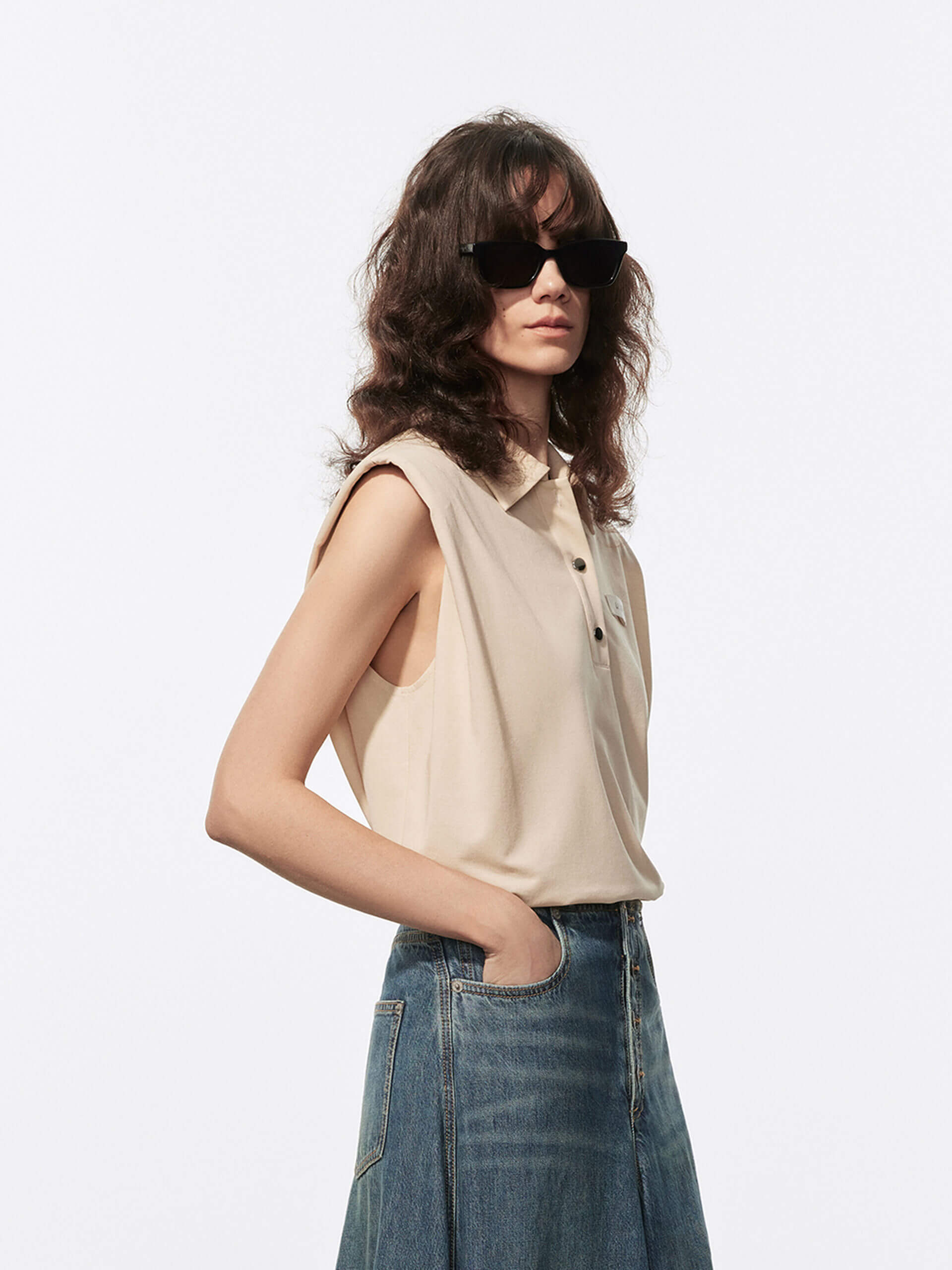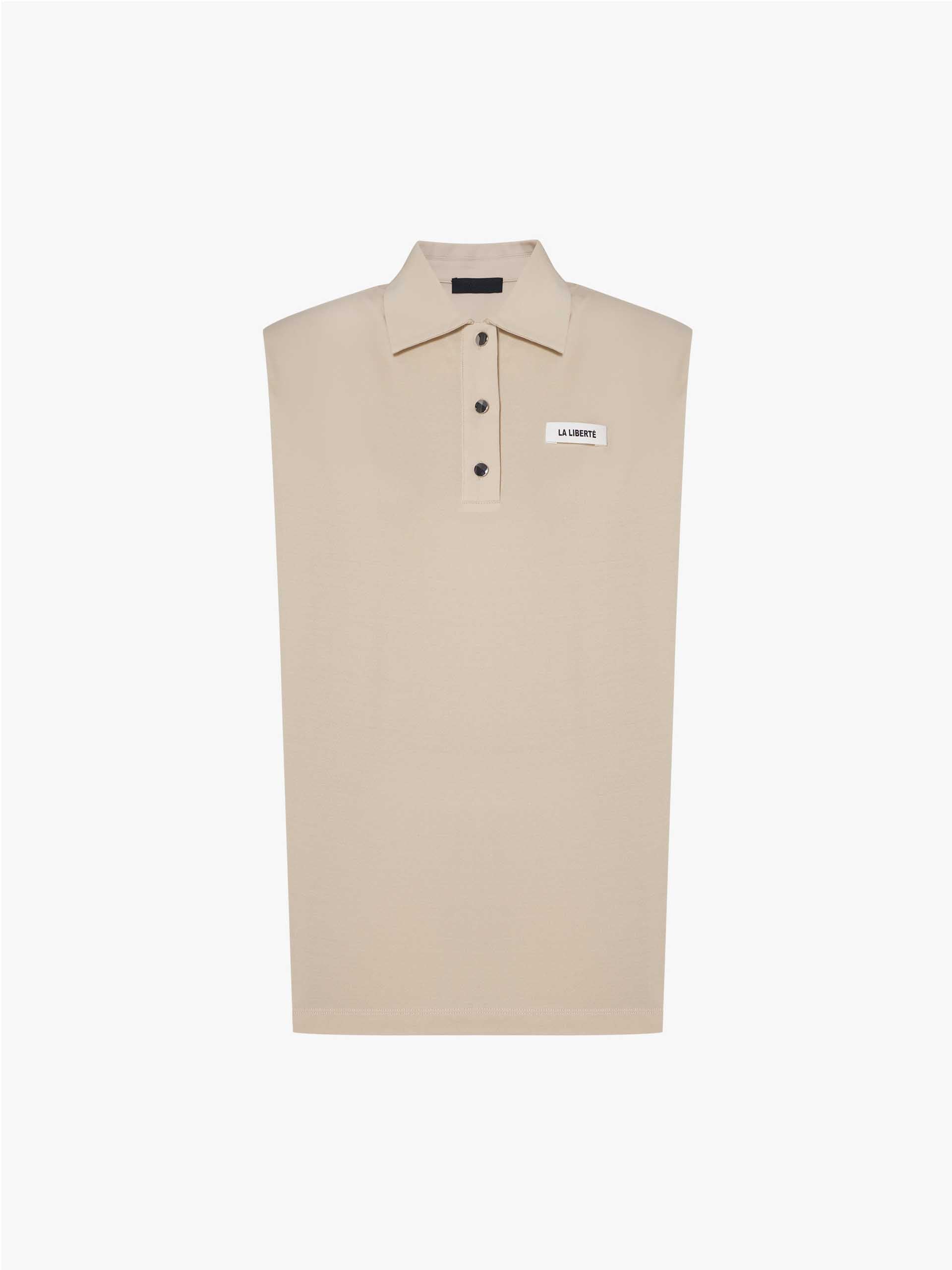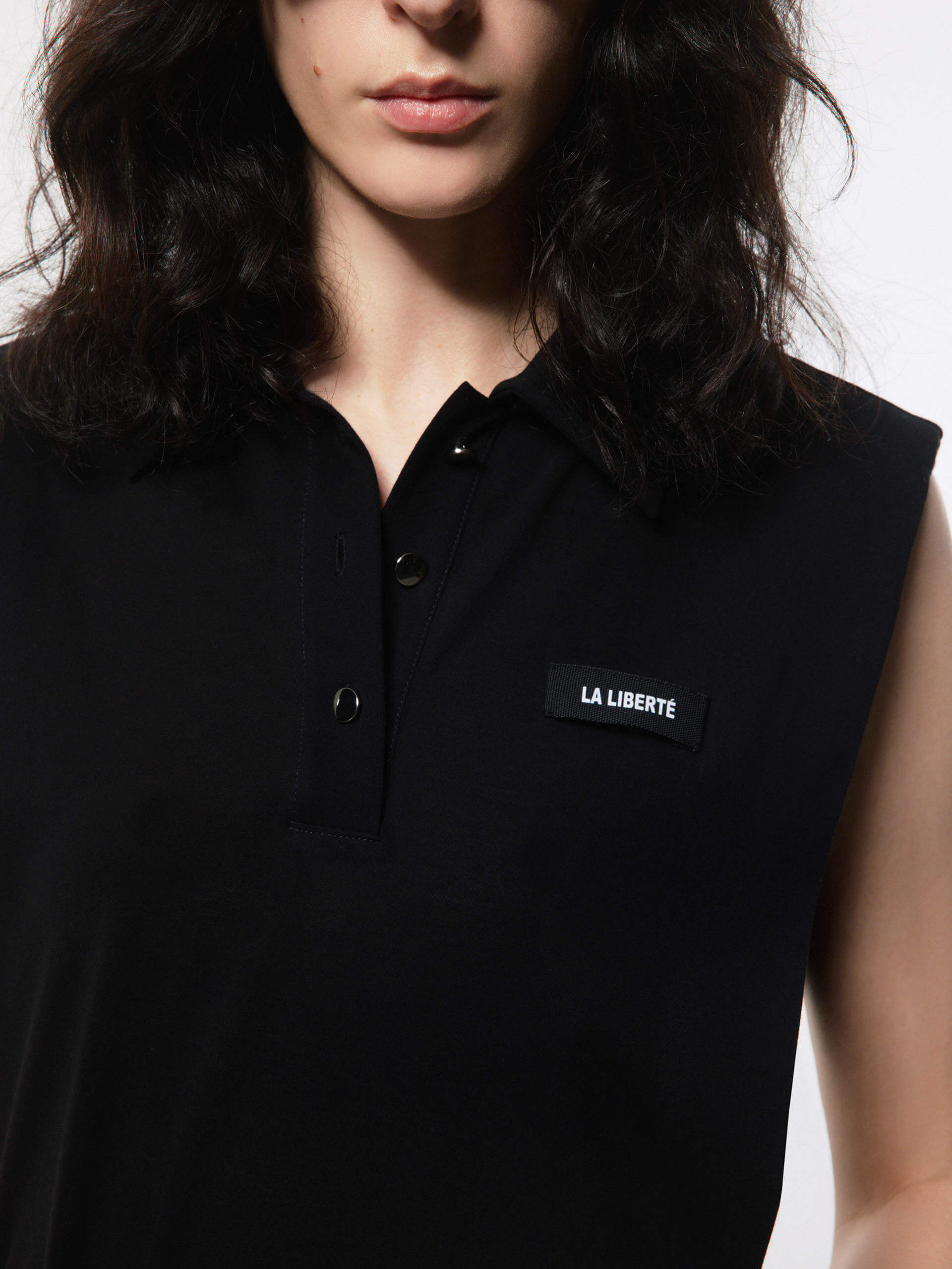 This cotton top, designed with a comfortable regular fit and padded shoulders, is the perfect addition to your wardrobe. Its stylish polo collar and sleeveless design make it versatile for casual occasions. Made from high-quality cotton fabric, it offers both comfort and style.