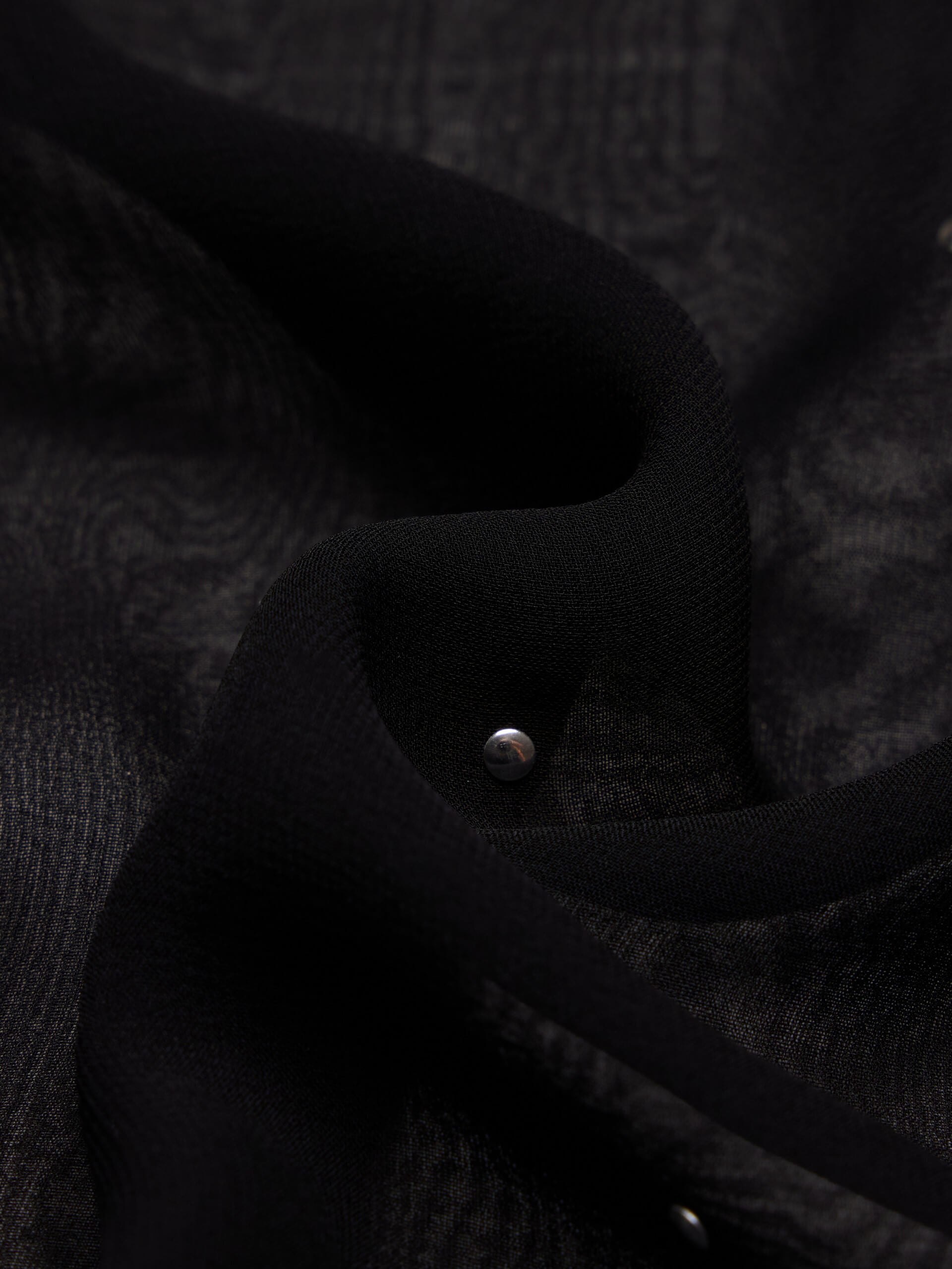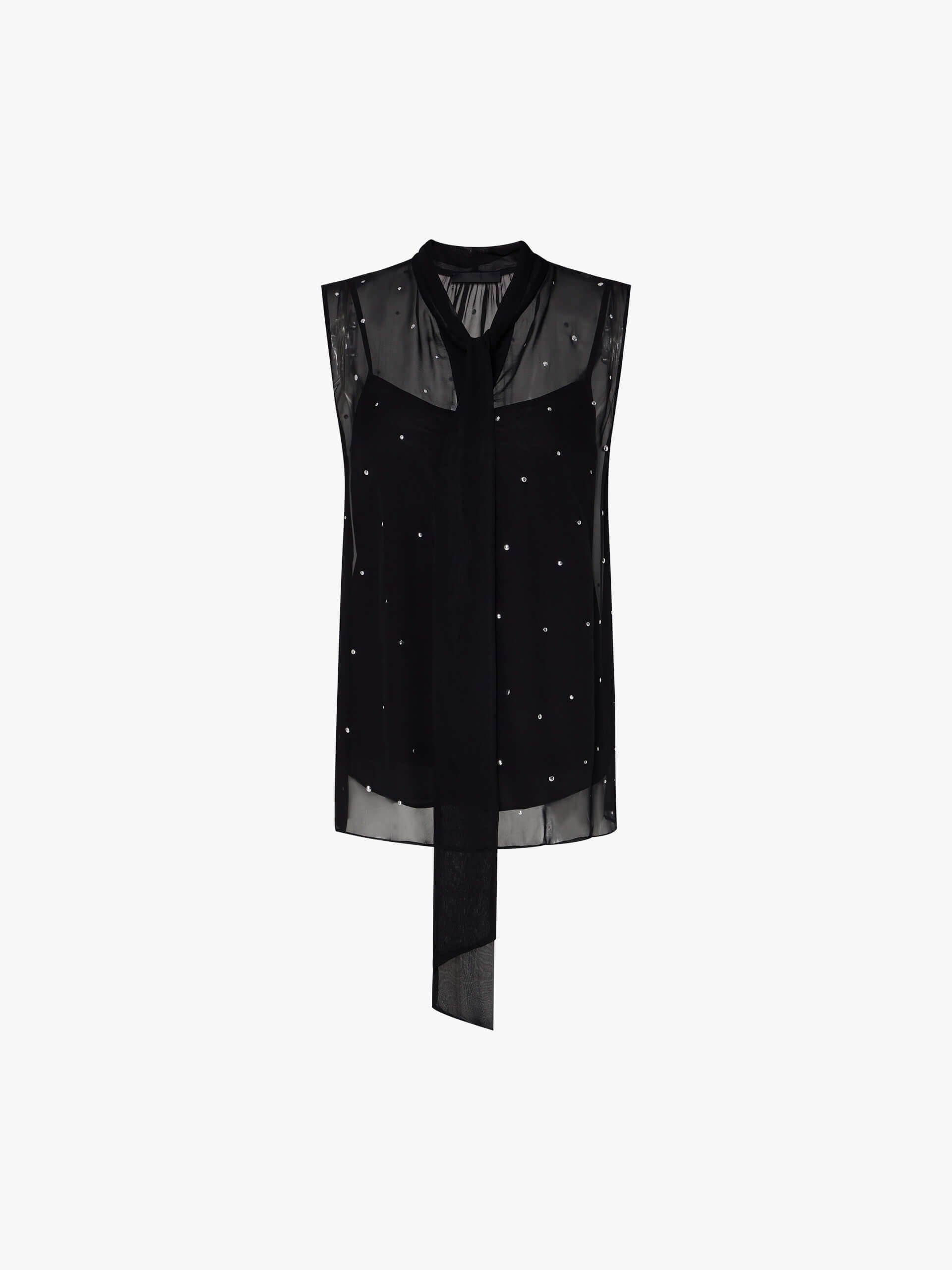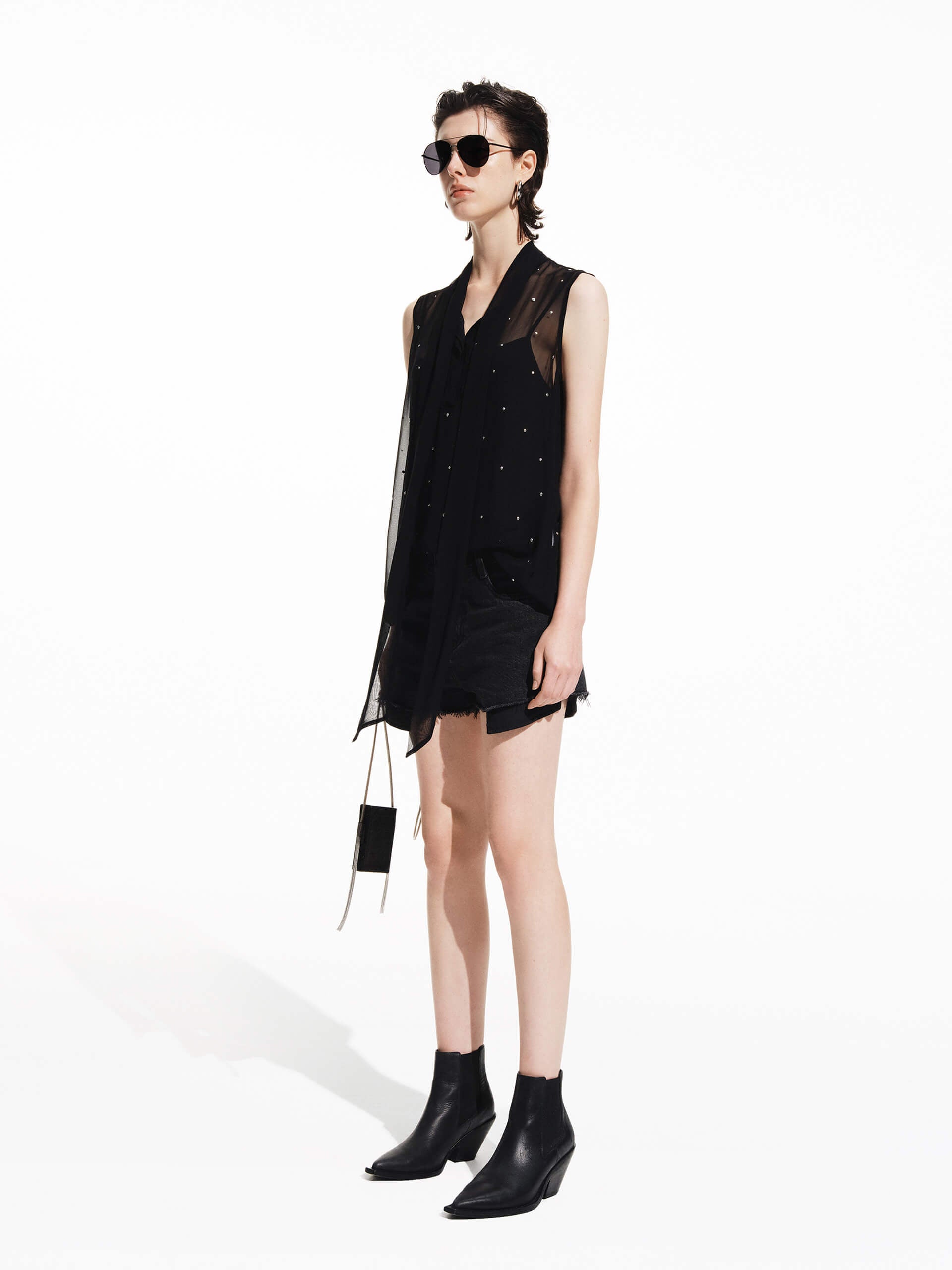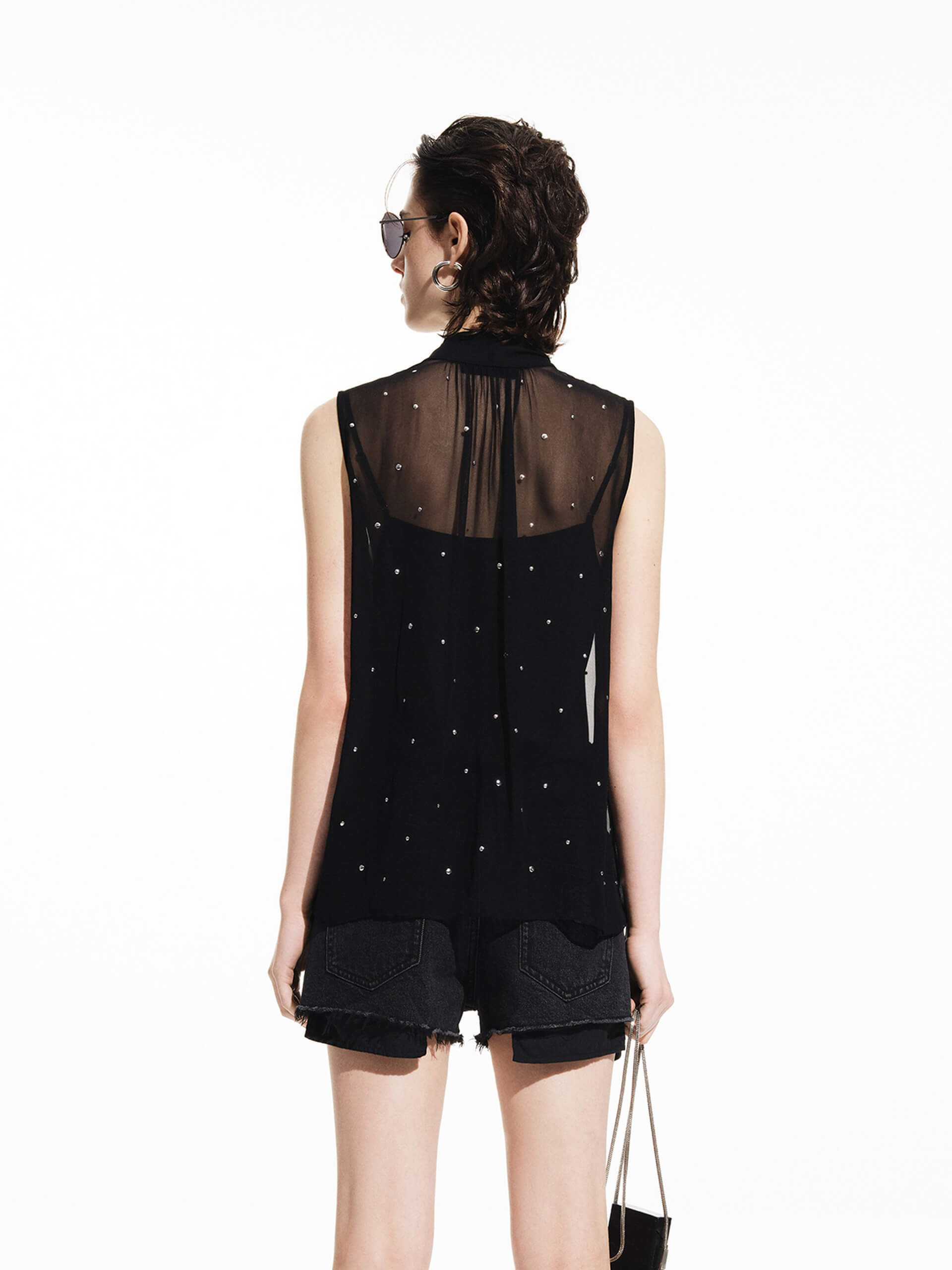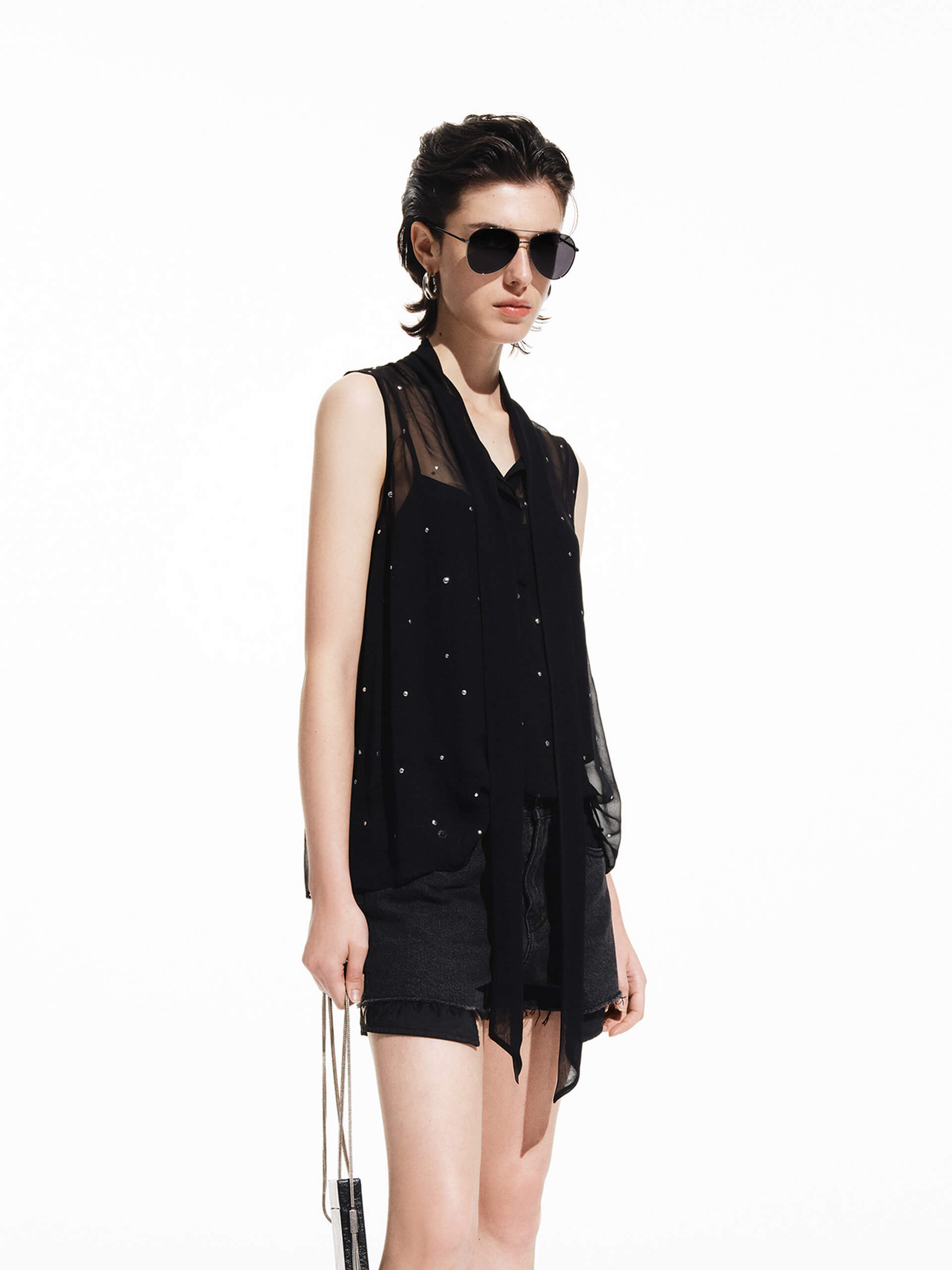 This blouse is made from a smooth silk blend, giving it a luxurious feel and a polished look. It features a sheer design with a lining, allowing for a balance of style and modesty. The rivets add a touch of edginess and visual interest to the overall look. Combined with a V-neckline and self-tie detail adds a feminine and romantic touch, while the sleeveless design keeps the look modern and versatile.