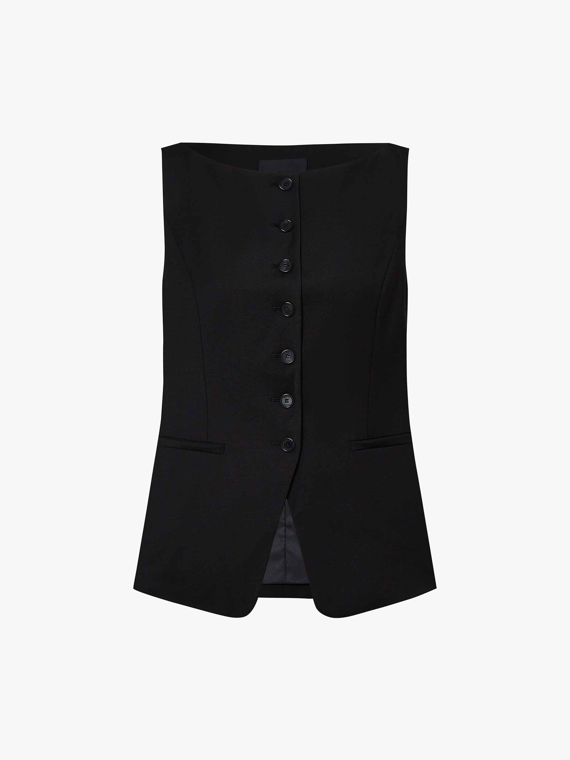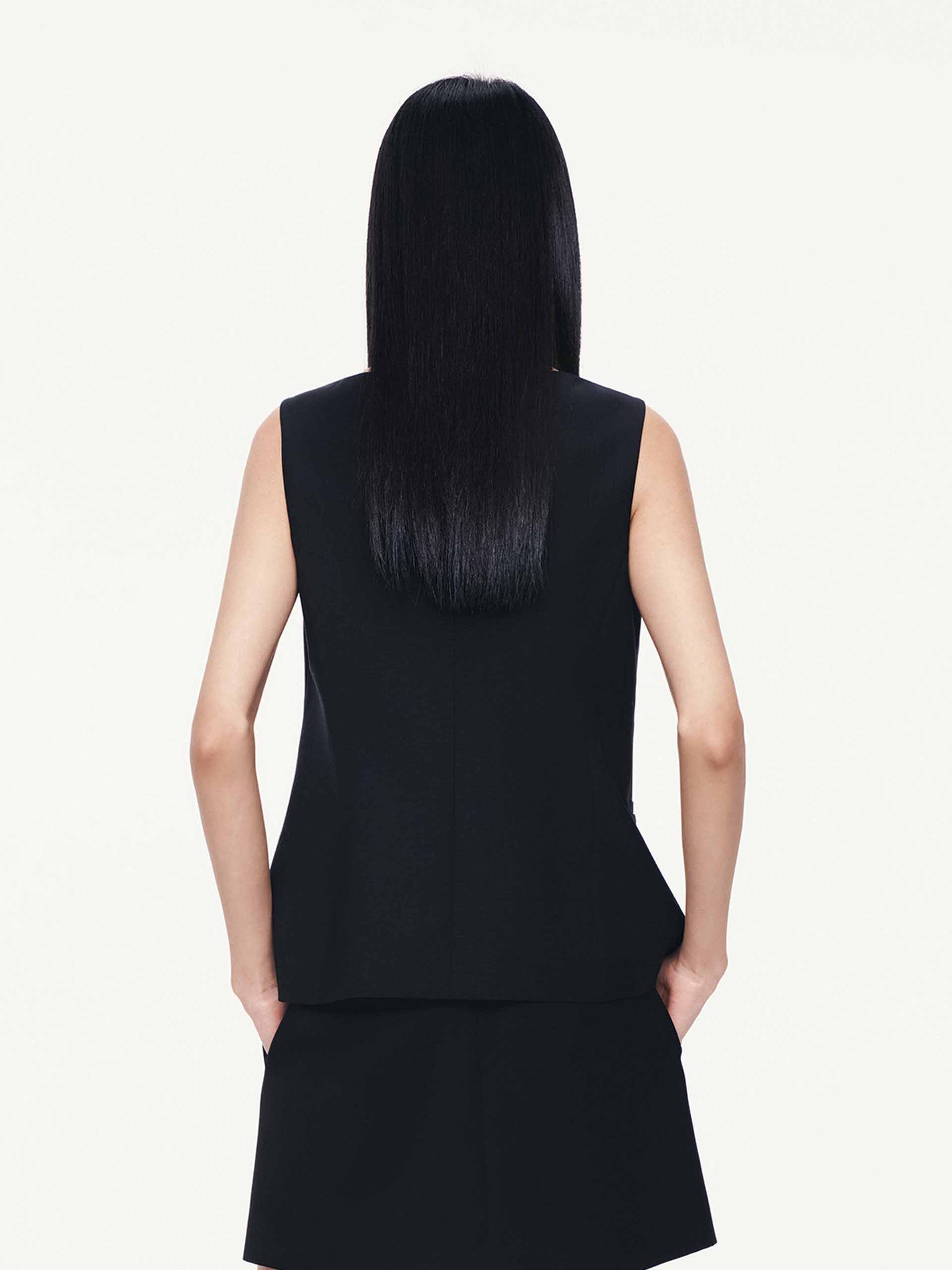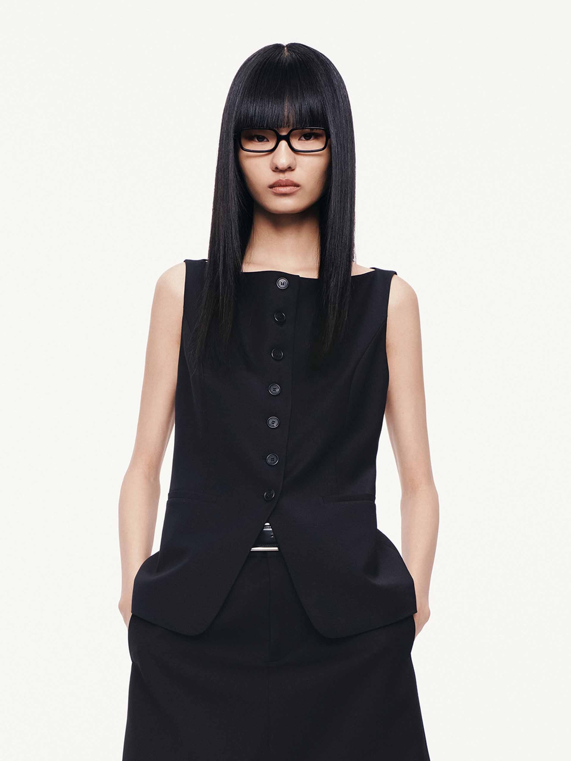 Crafted from a luxurious wool blend, this top offers a soft, structured drape with a refined finish. The classic boat neckline frames the collarbone beautifully. A refined slit hem adds subtle movement and modern flair to the regular fit, and the custom button closure provides a polished finishing touch.