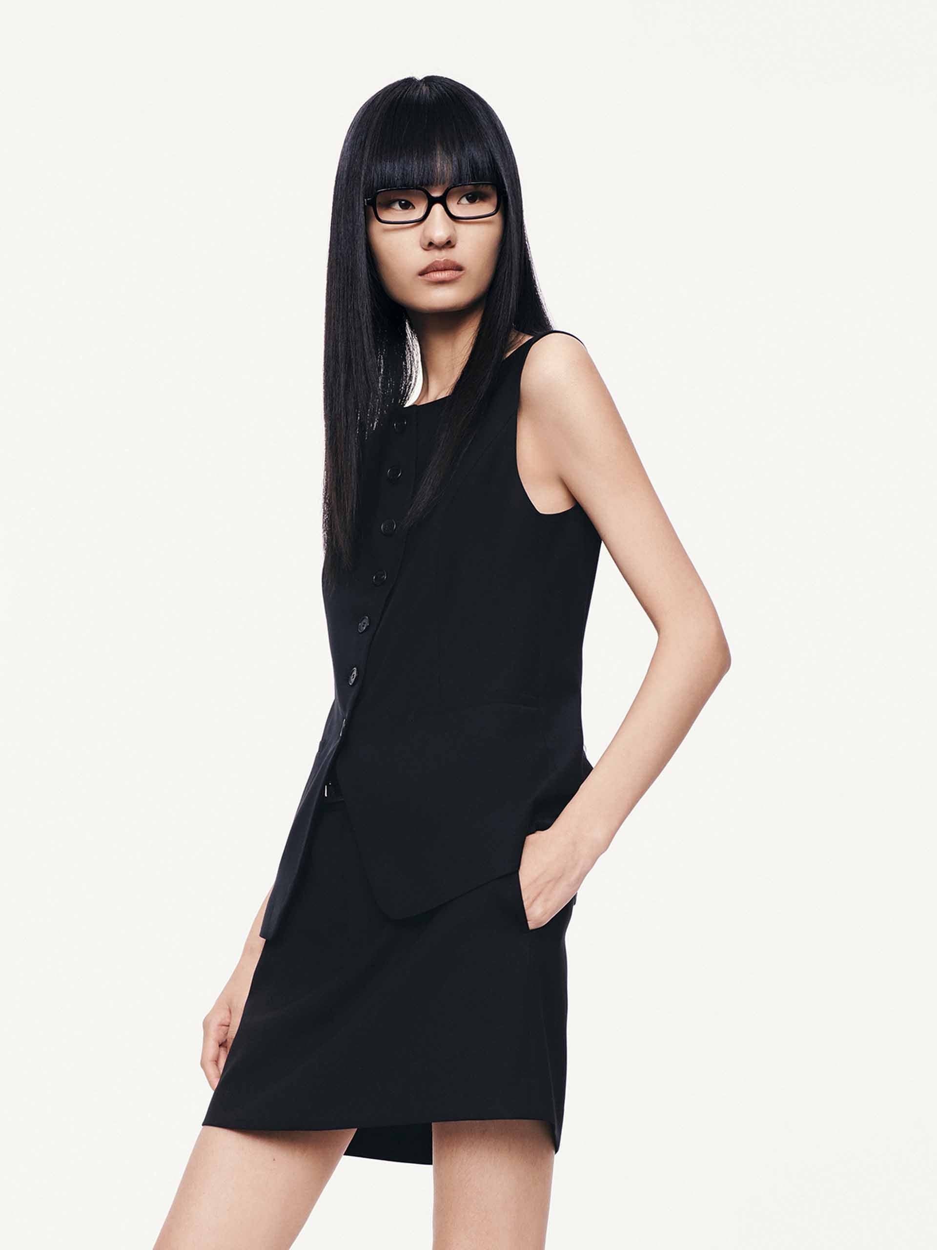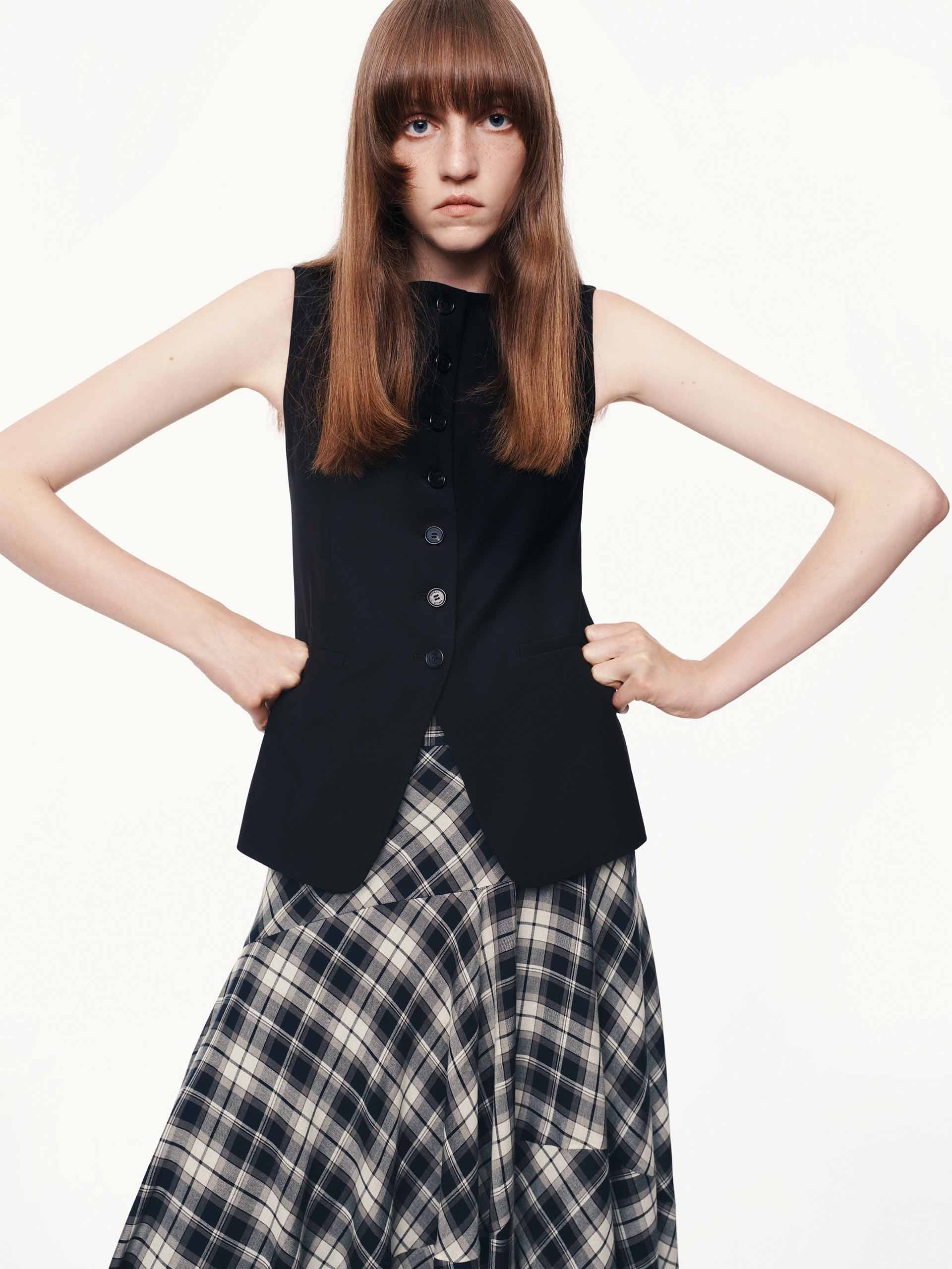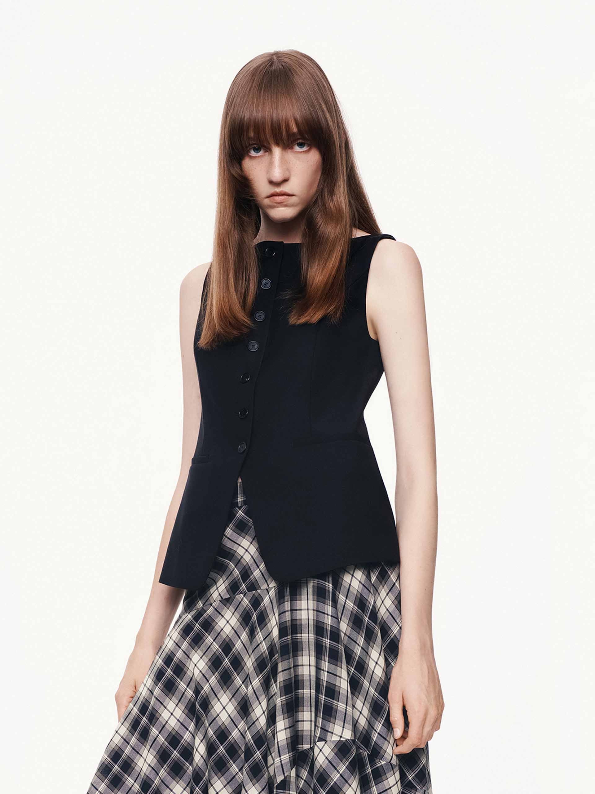 Crafted from a luxurious wool blend, this top offers a soft, structured drape with a refined finish. The classic boat neckline frames the collarbone beautifully. A refined slit hem adds subtle movement and modern flair to the regular fit, and the custom button closure provides a polished finishing touch.