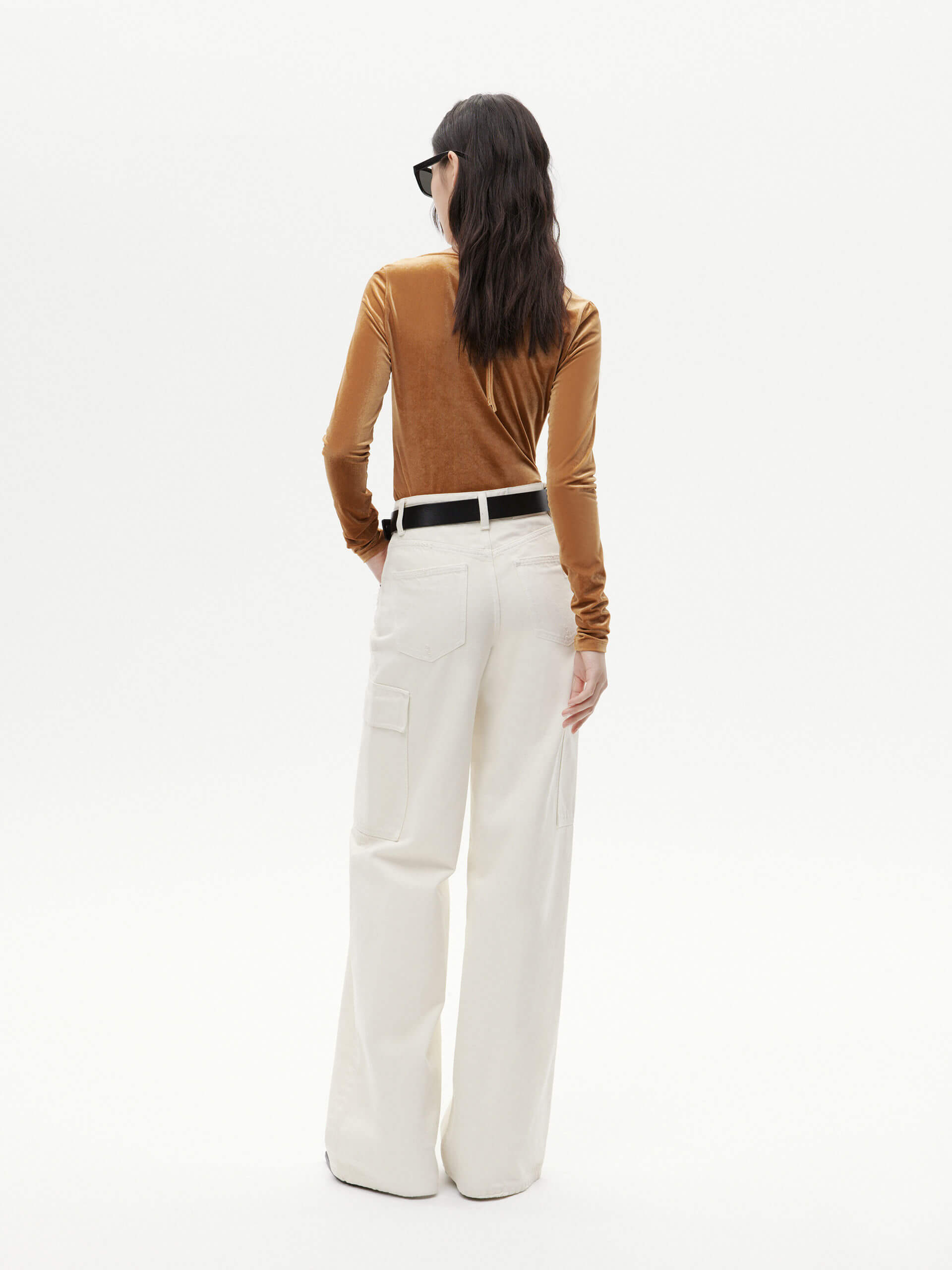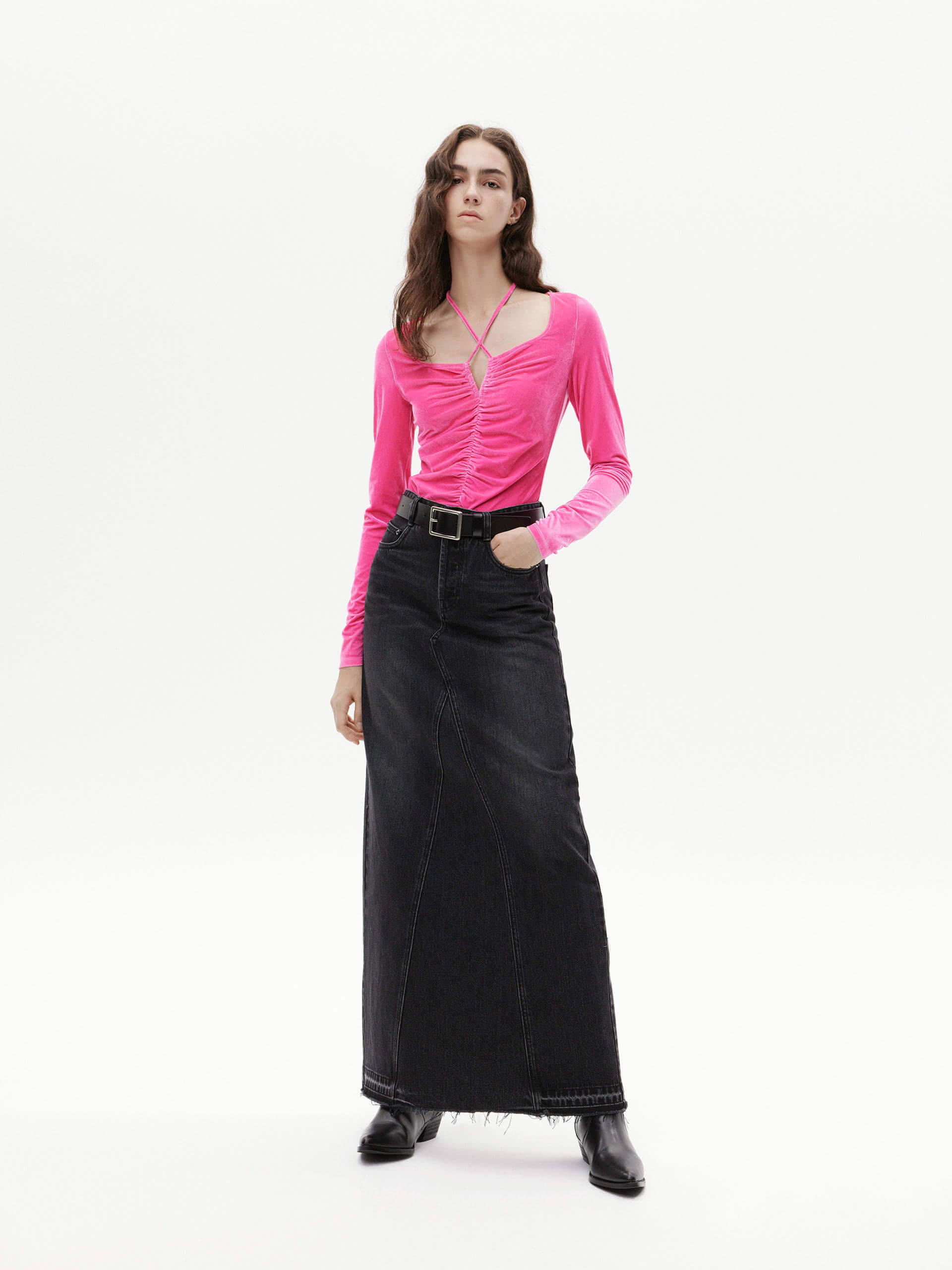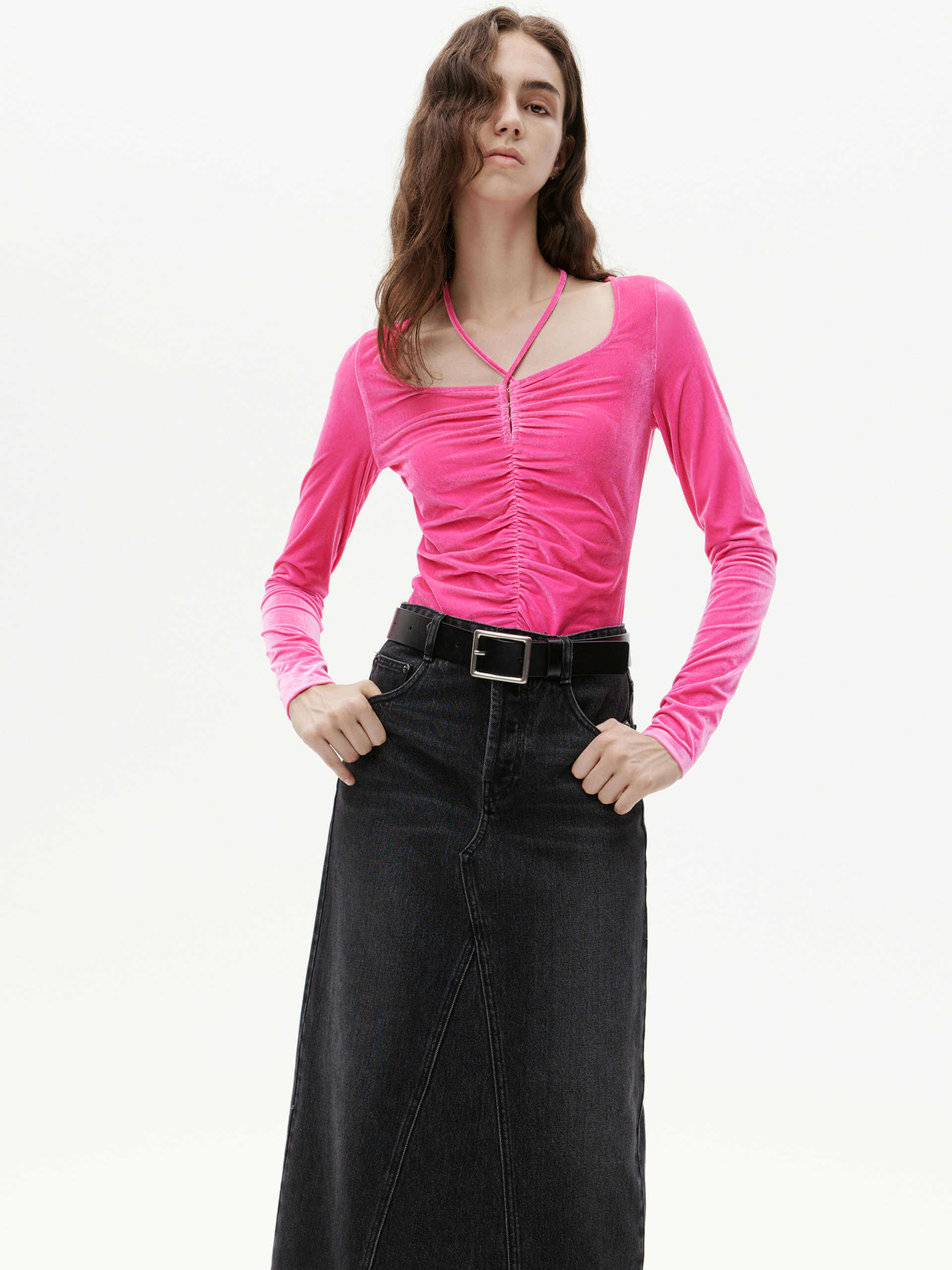 This top is tailored to perfection in a slim-fit stretch silhouette, with its cinching self-tie strap design providing a custom fit. Crafted from soft velvet for an exquisite touch, the intricate pleating adds subtle texture to any ensemble. Perfectly paired with high-waisted jeans or a midi skirt.