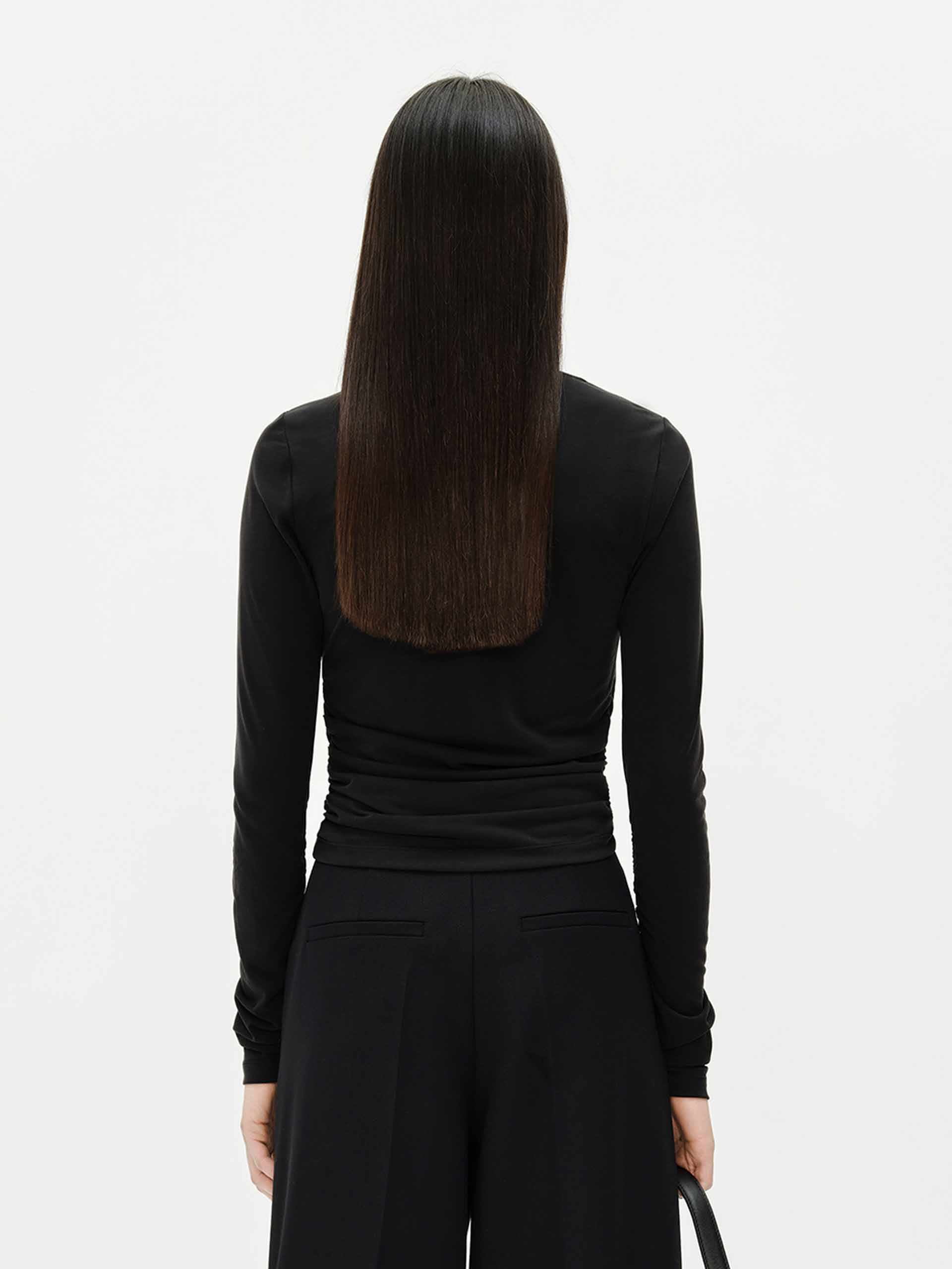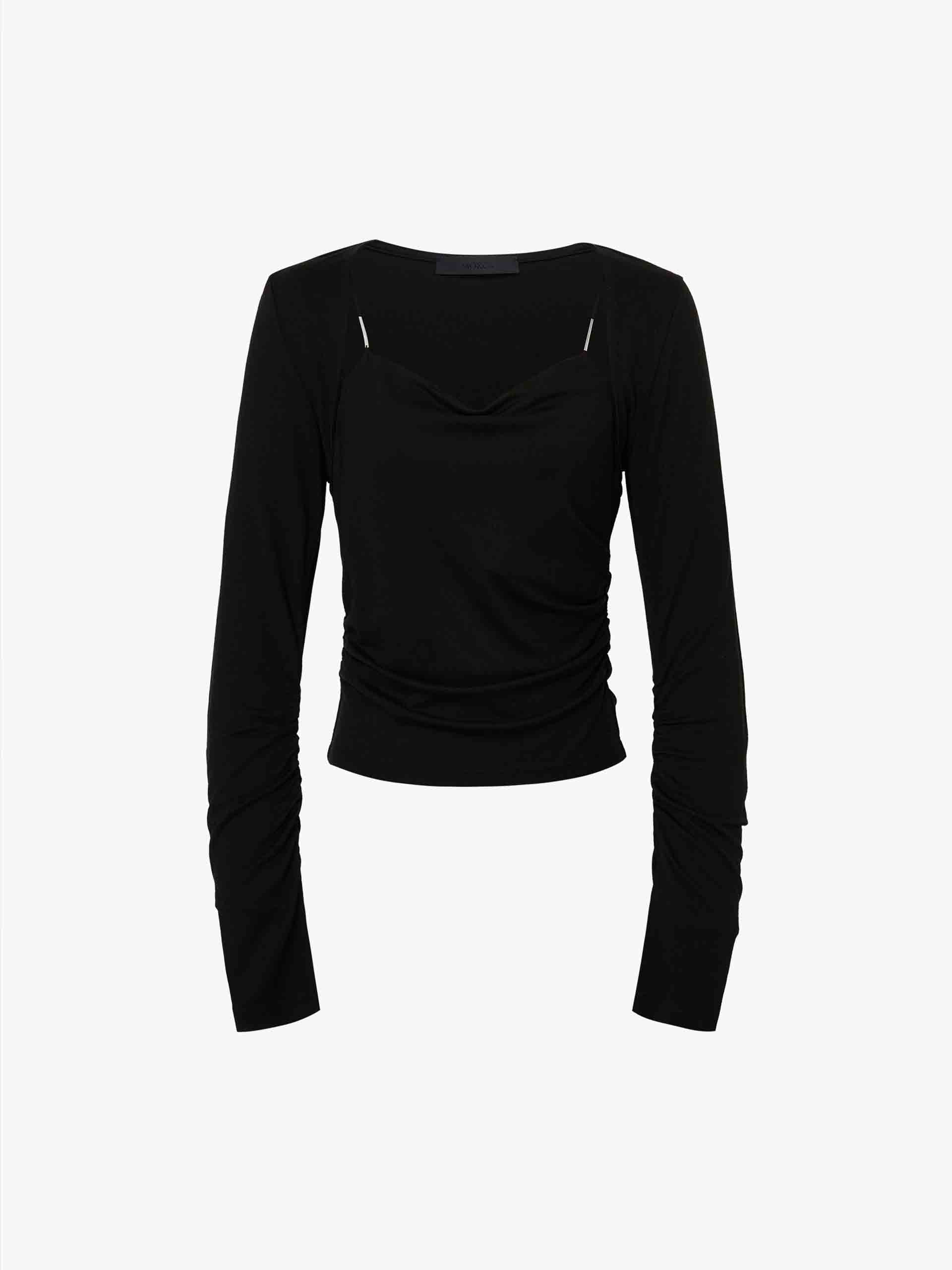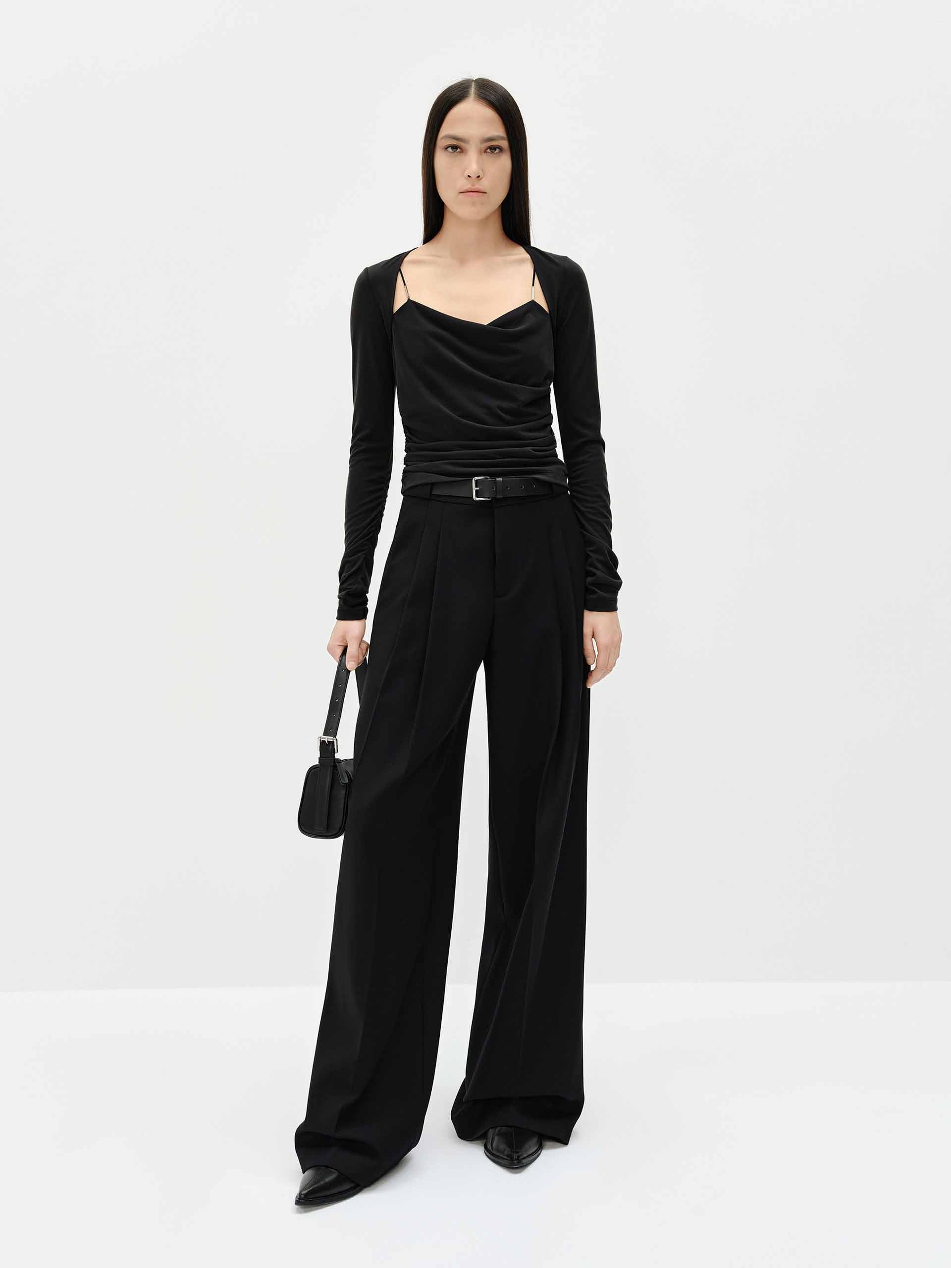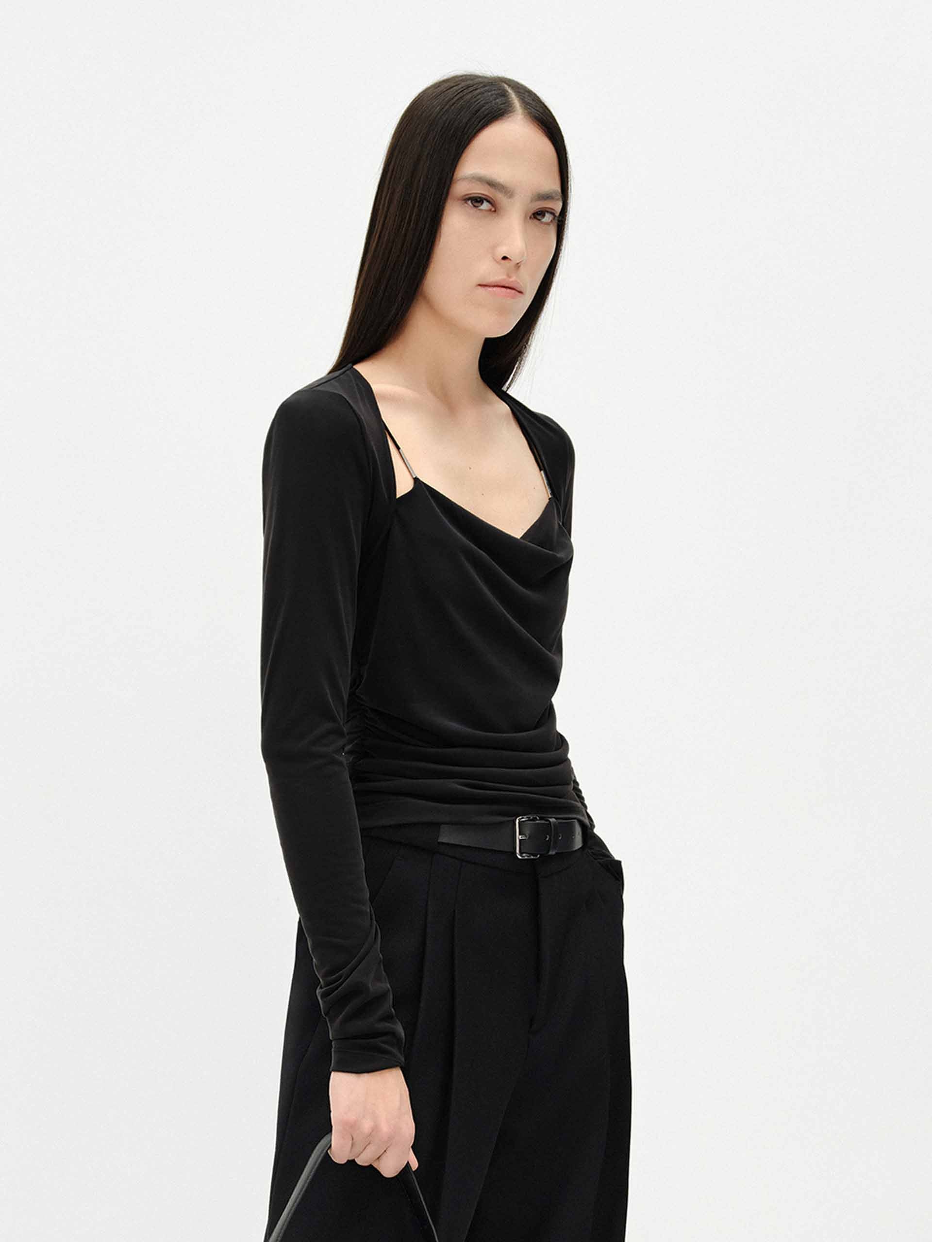 This top is made from a luxurious wool blend, it offers a slim fit with a deconstructed design. Feature a waterfall neckline and pleated design to create a unique and elegant look.