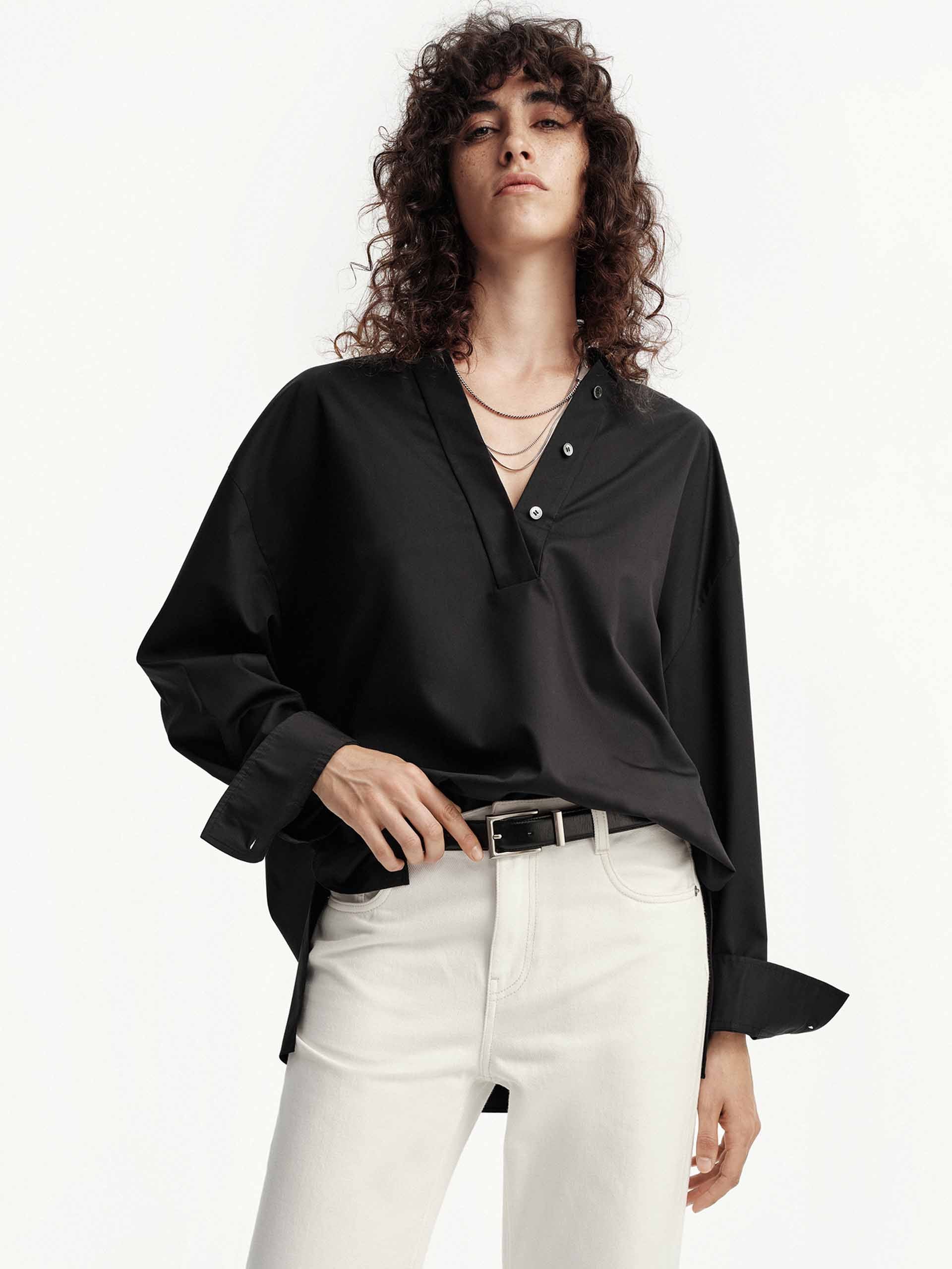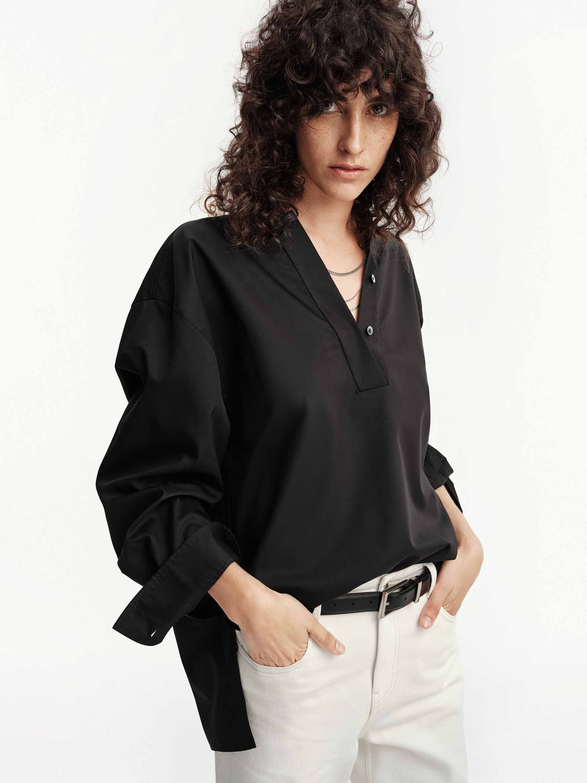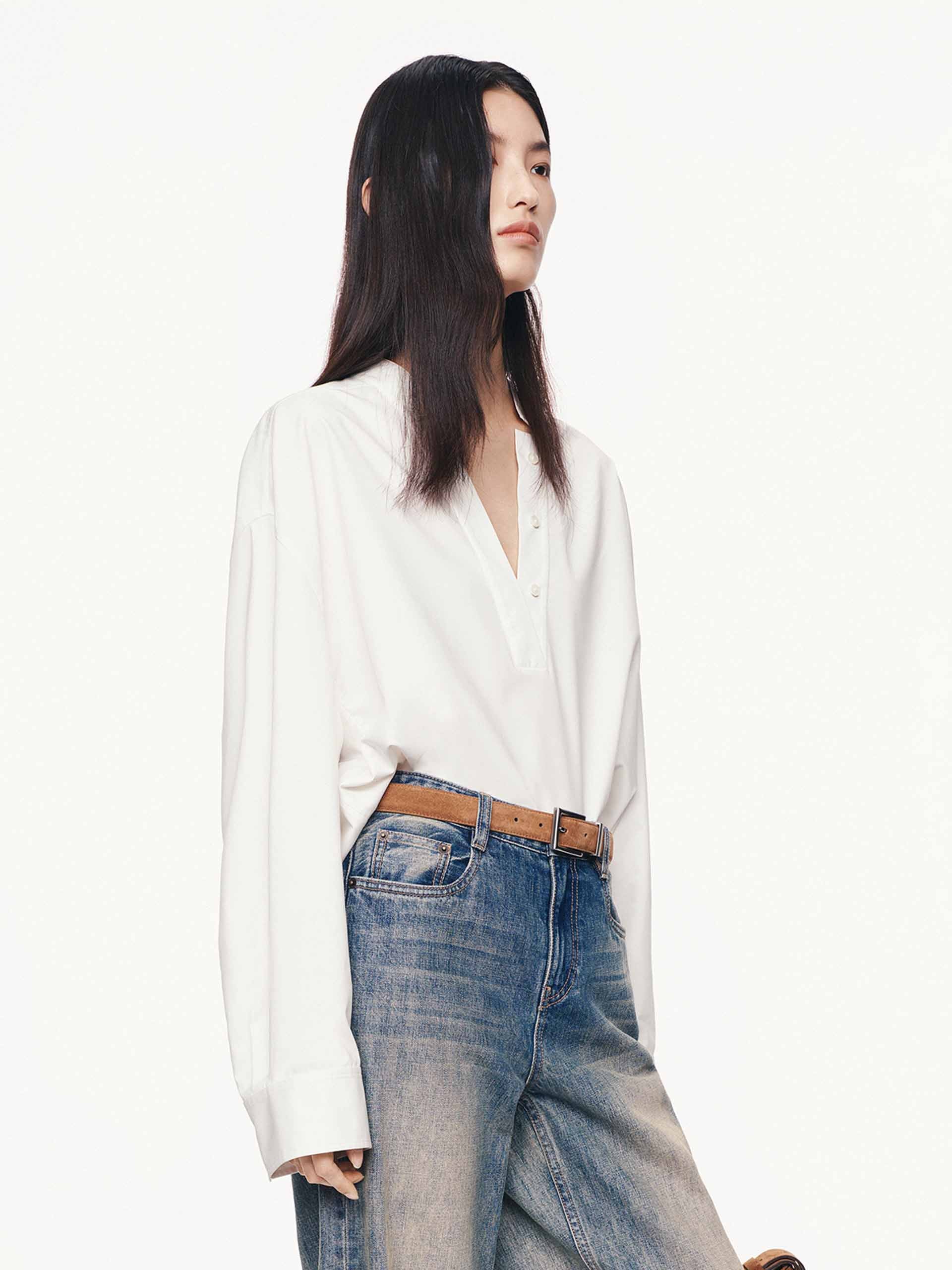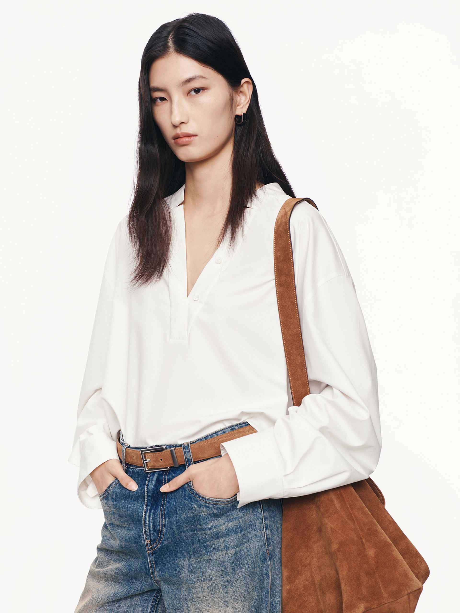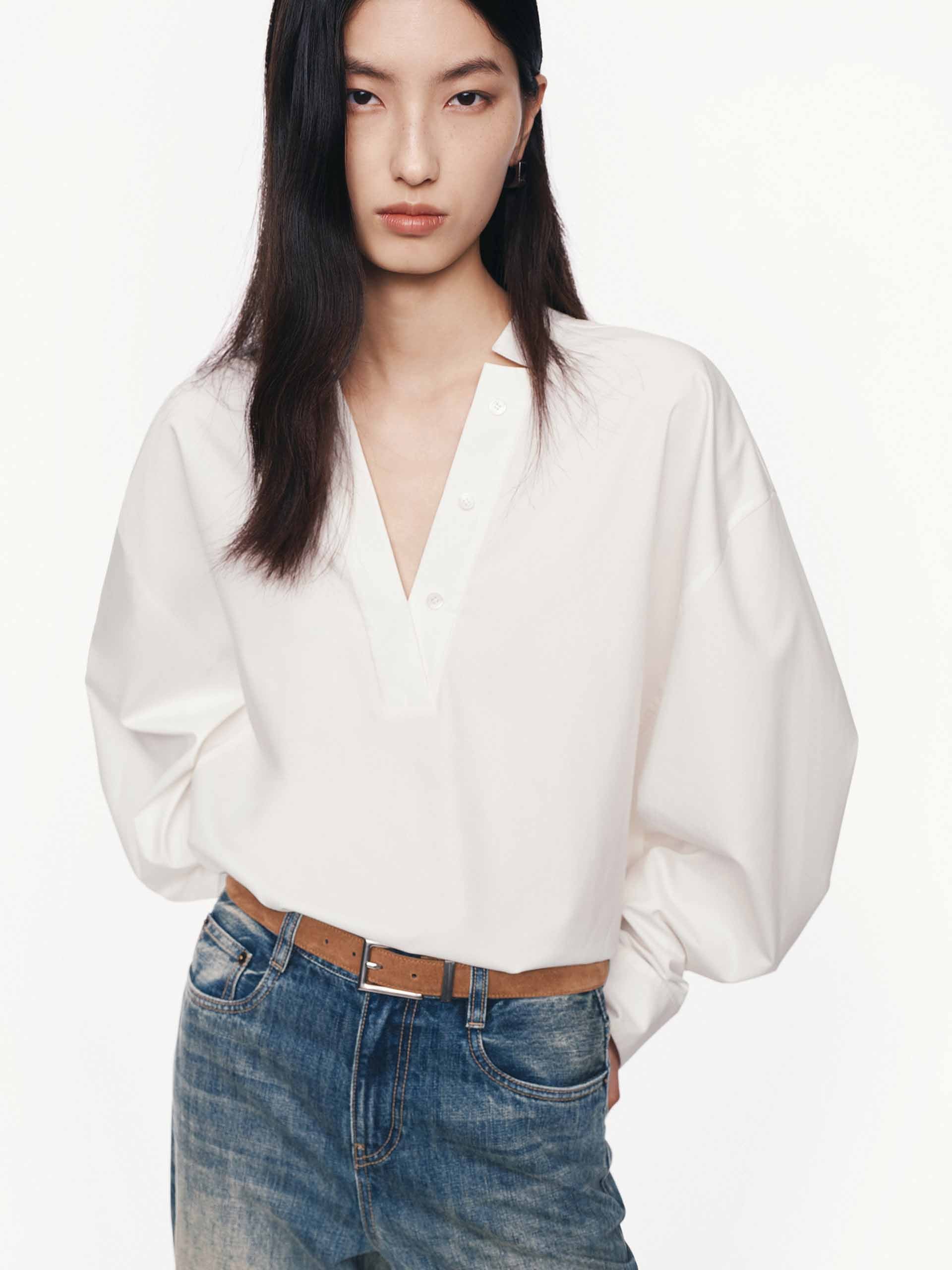 Upgrade your wardrobe with this relaxed shirt-style blouse, designed for comfort and understated sophistication. The V-neck adds a feminine touch, while the long sleeves provide versatile wearability for any season. The asymmetric hem—short in the front, long in the back—offers a modern twist, making it perfect for tucking in or leaving loose.