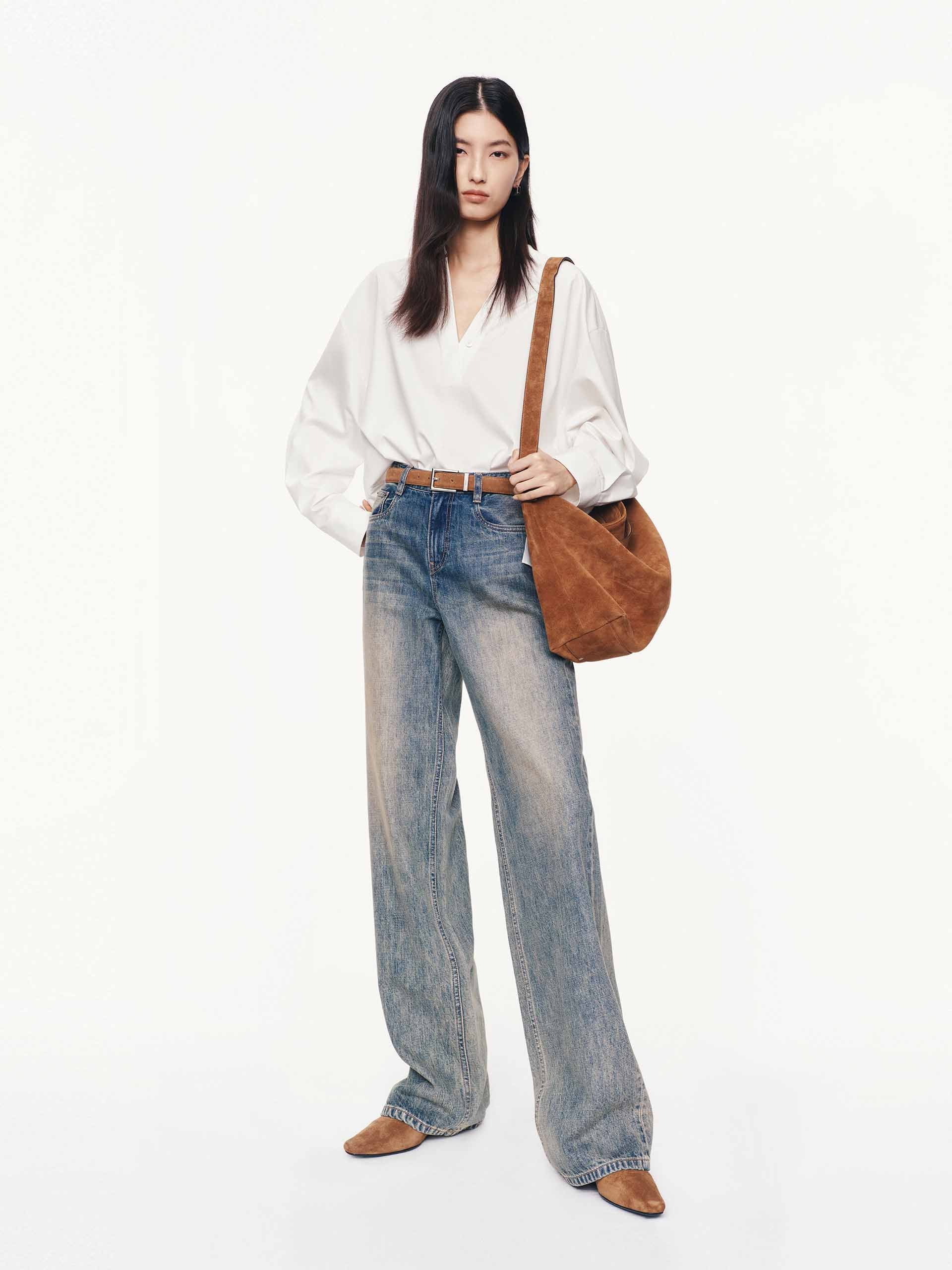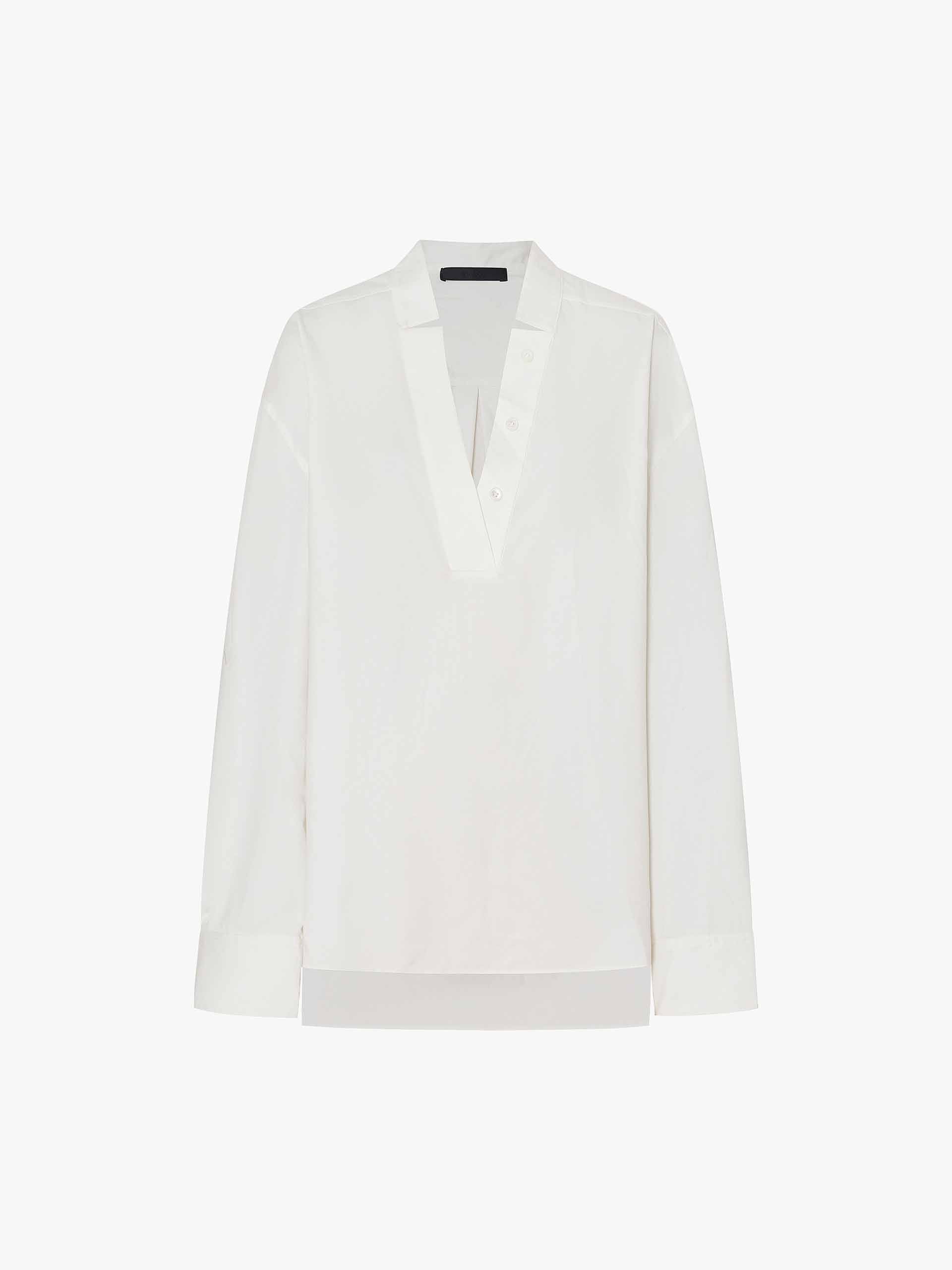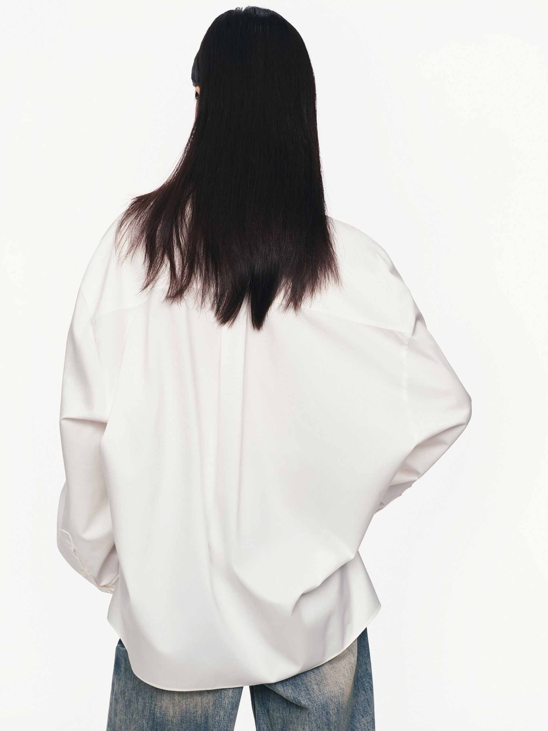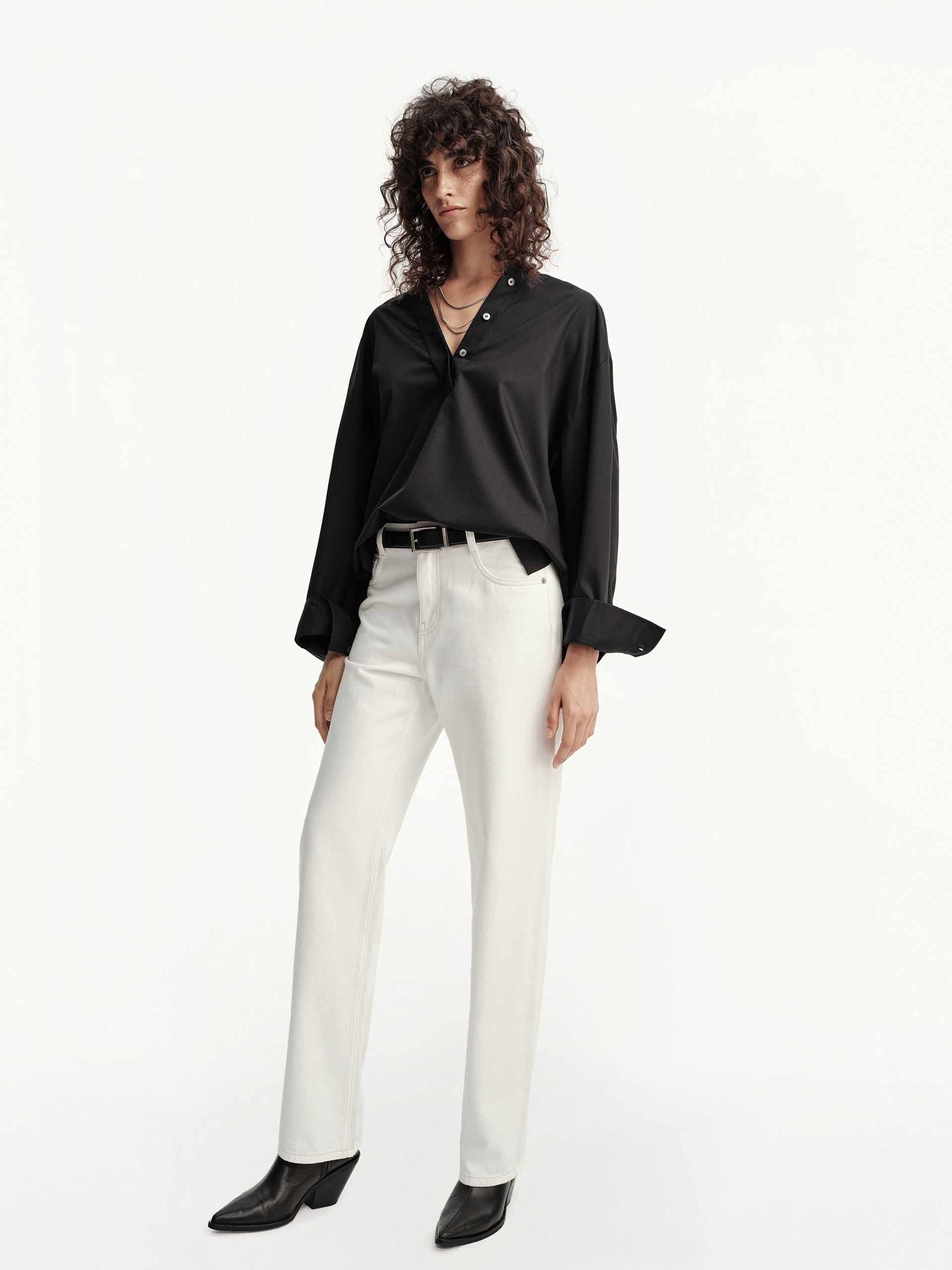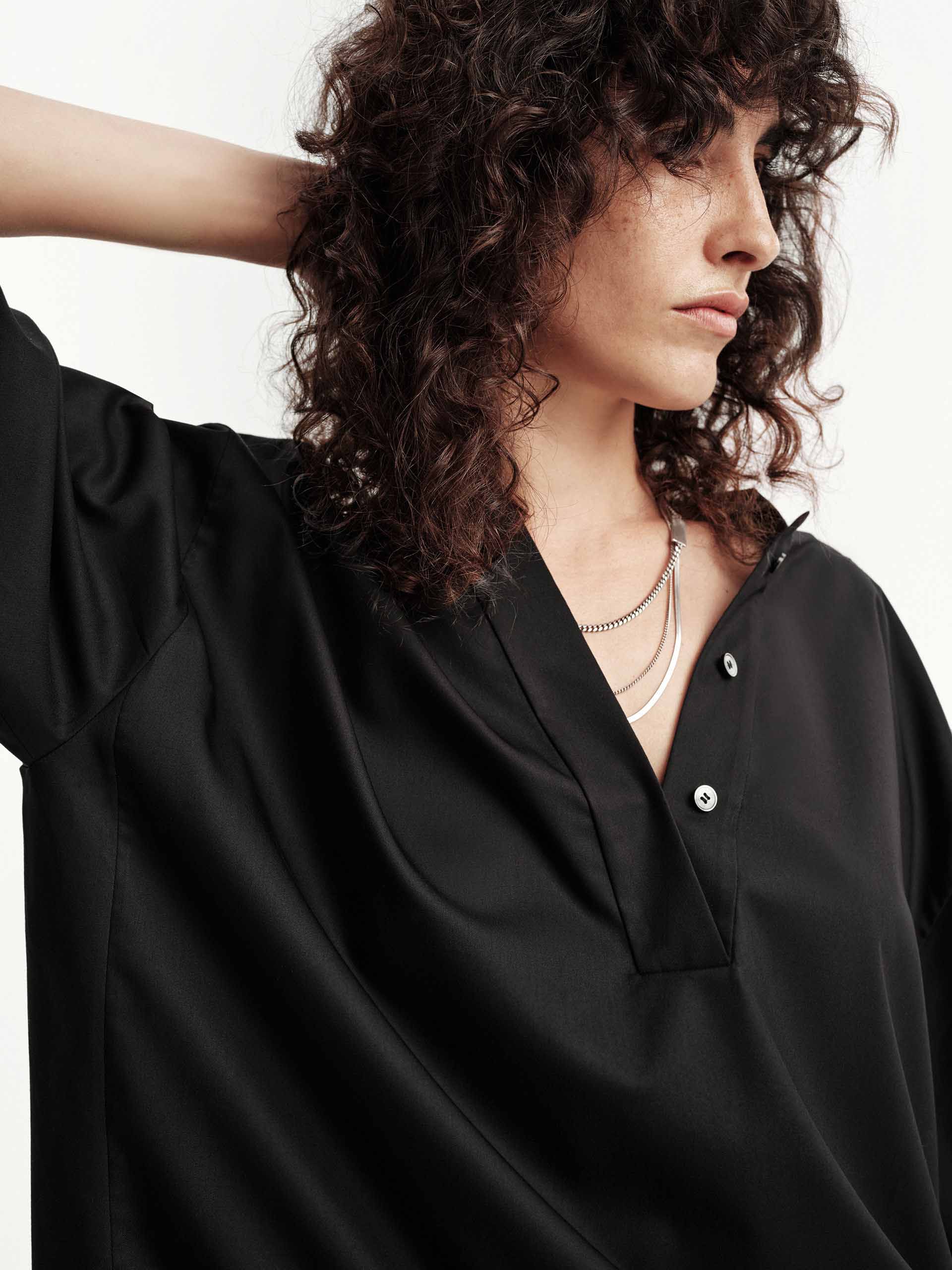 Upgrade your wardrobe with this relaxed shirt-style blouse, designed for comfort and understated sophistication. The V-neck adds a feminine touch, while the long sleeves provide versatile wearability for any season. The asymmetric hem—short in the front, long in the back—offers a modern twist, making it perfect for tucking in or leaving loose.