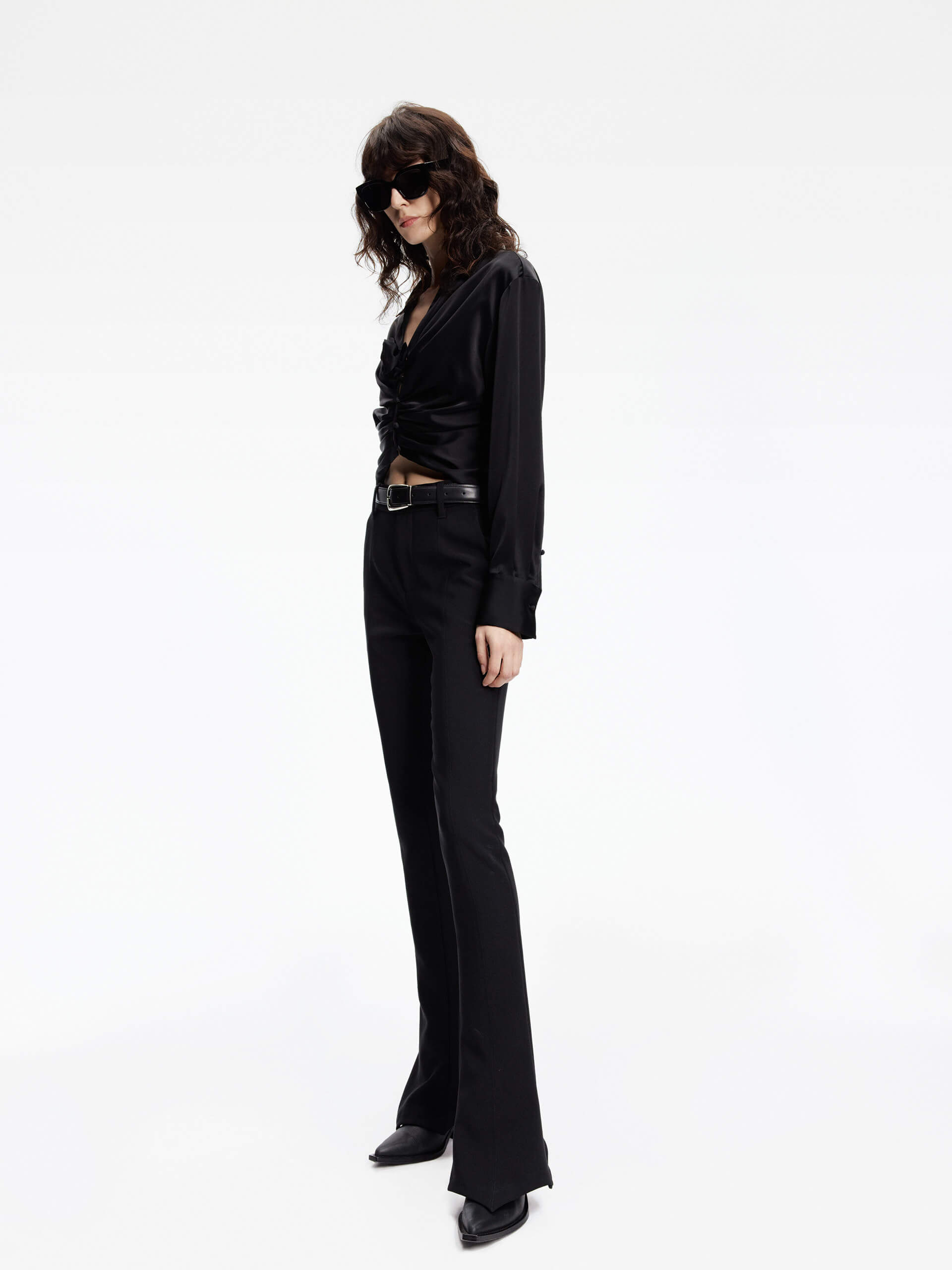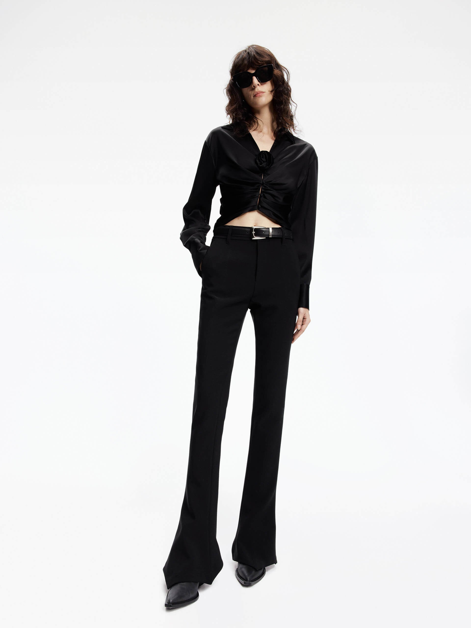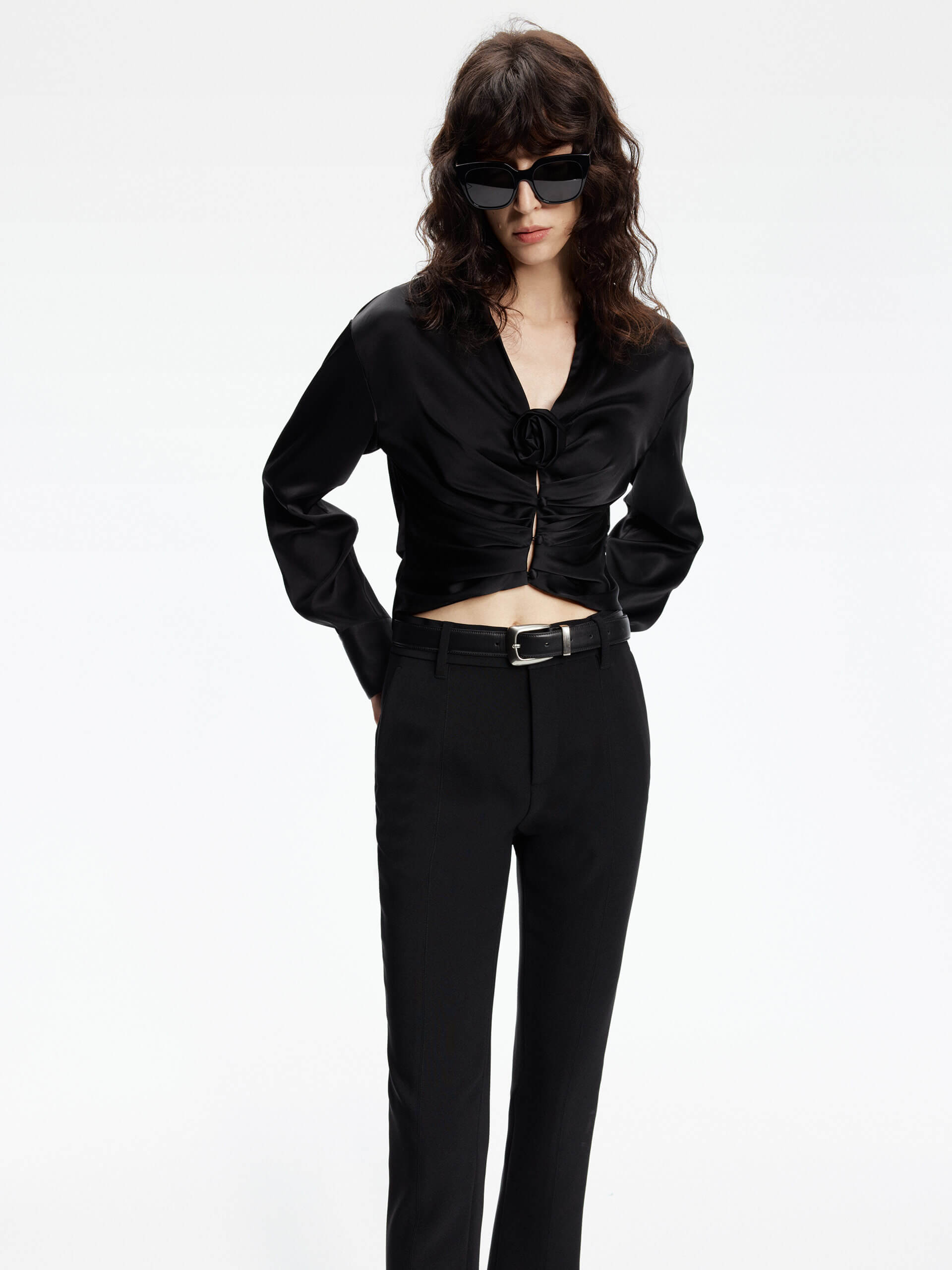 The smooth and soft blended fabric provides luxurious comfort while the V-neck and rose brooch add a touch of elegance. Feature a cropped length and pleated details to create a flattering silhouette when paired with high-waisted pants or jeans.