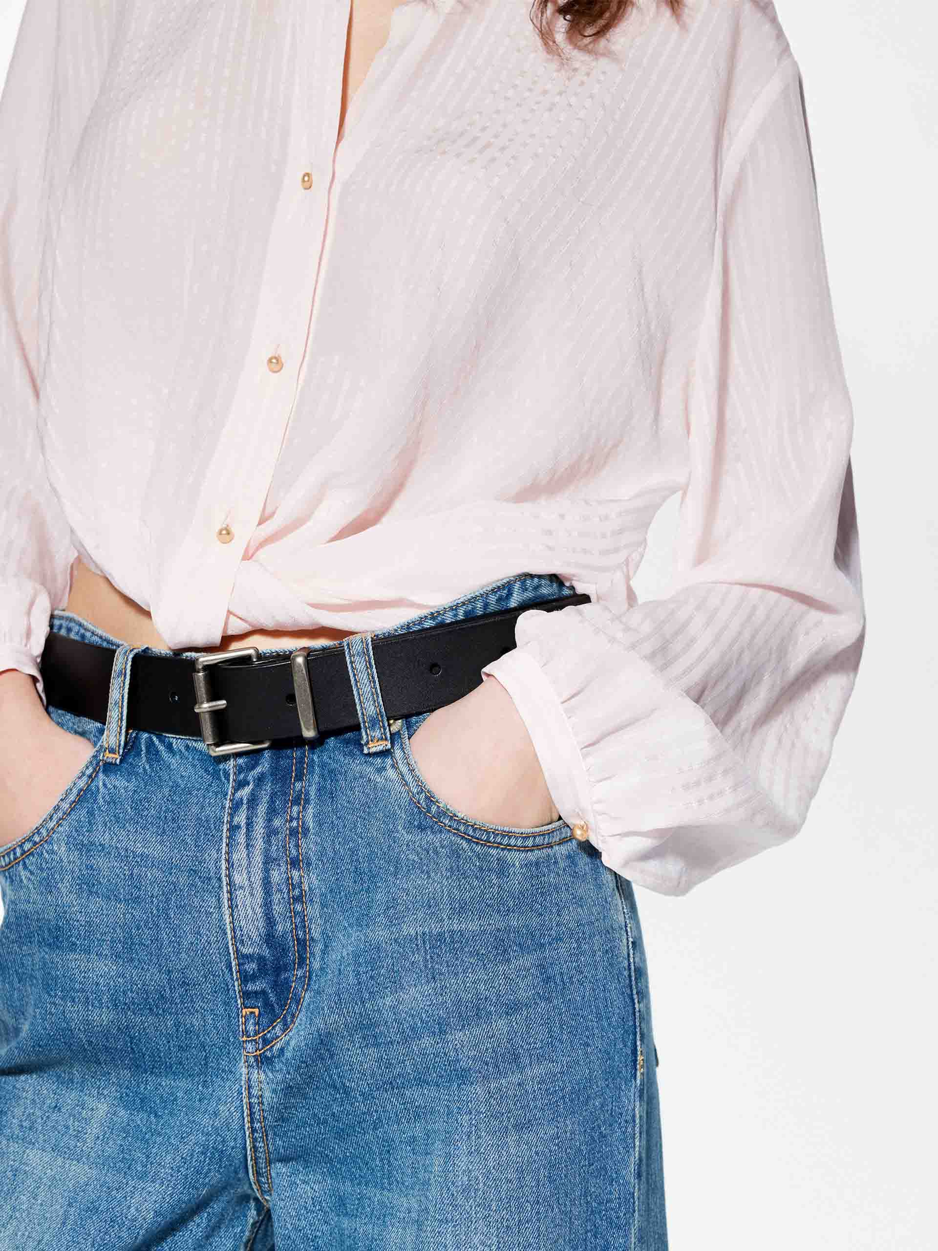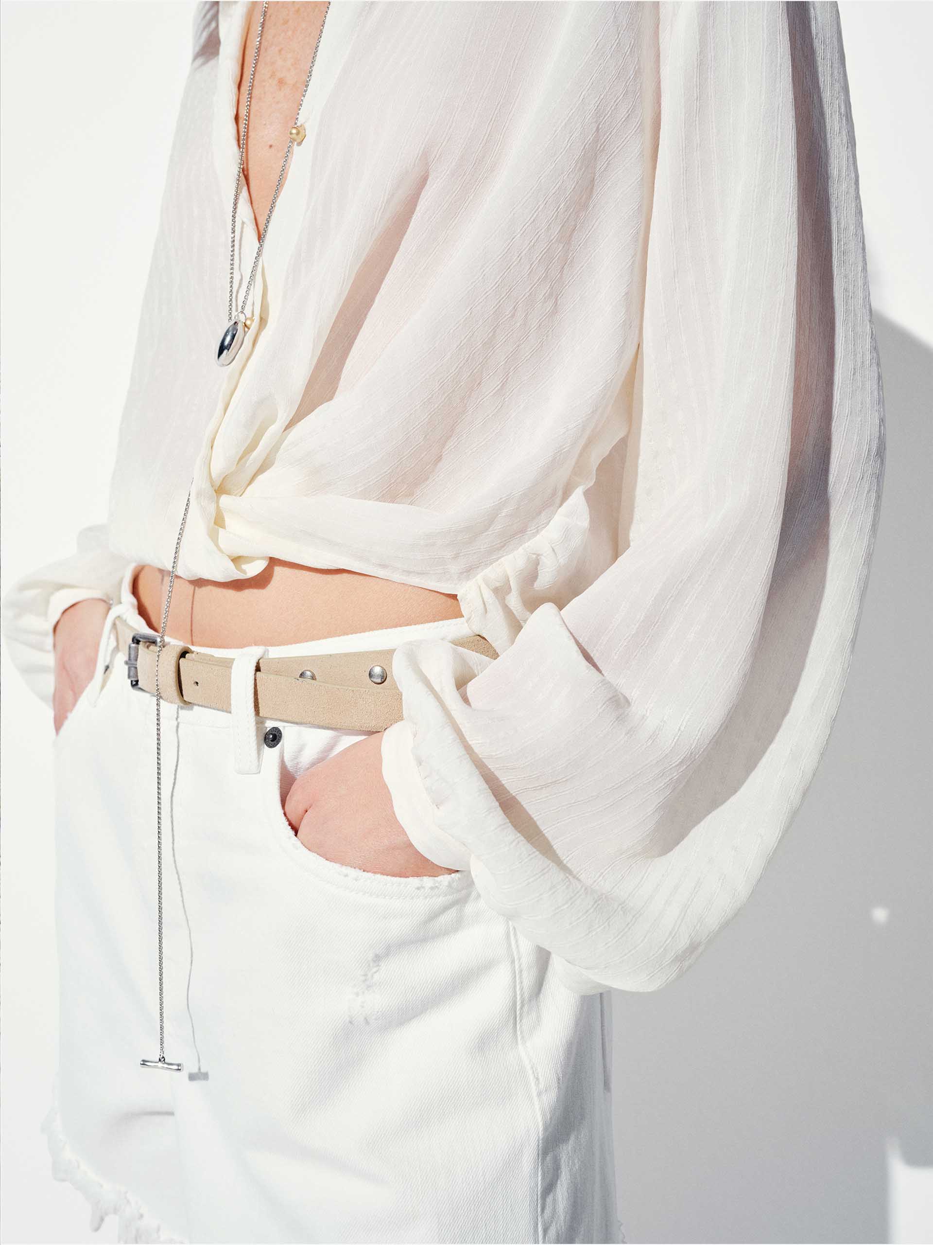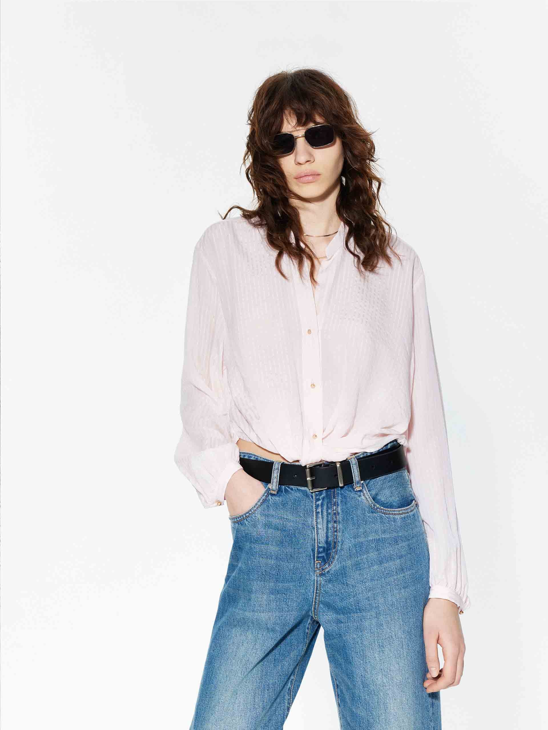 Crafted from luxurious 100% silk, this blouse exudes effortless sophistication with its relaxed fit and graceful drape. The dropped shoulders and long sleeves create a chic, contemporary silhouette. Secured with custom metal buttons and a refined button closure, this blouse blends timeless elegance with modern design, perfect for elevating both casual and formal ensembles.