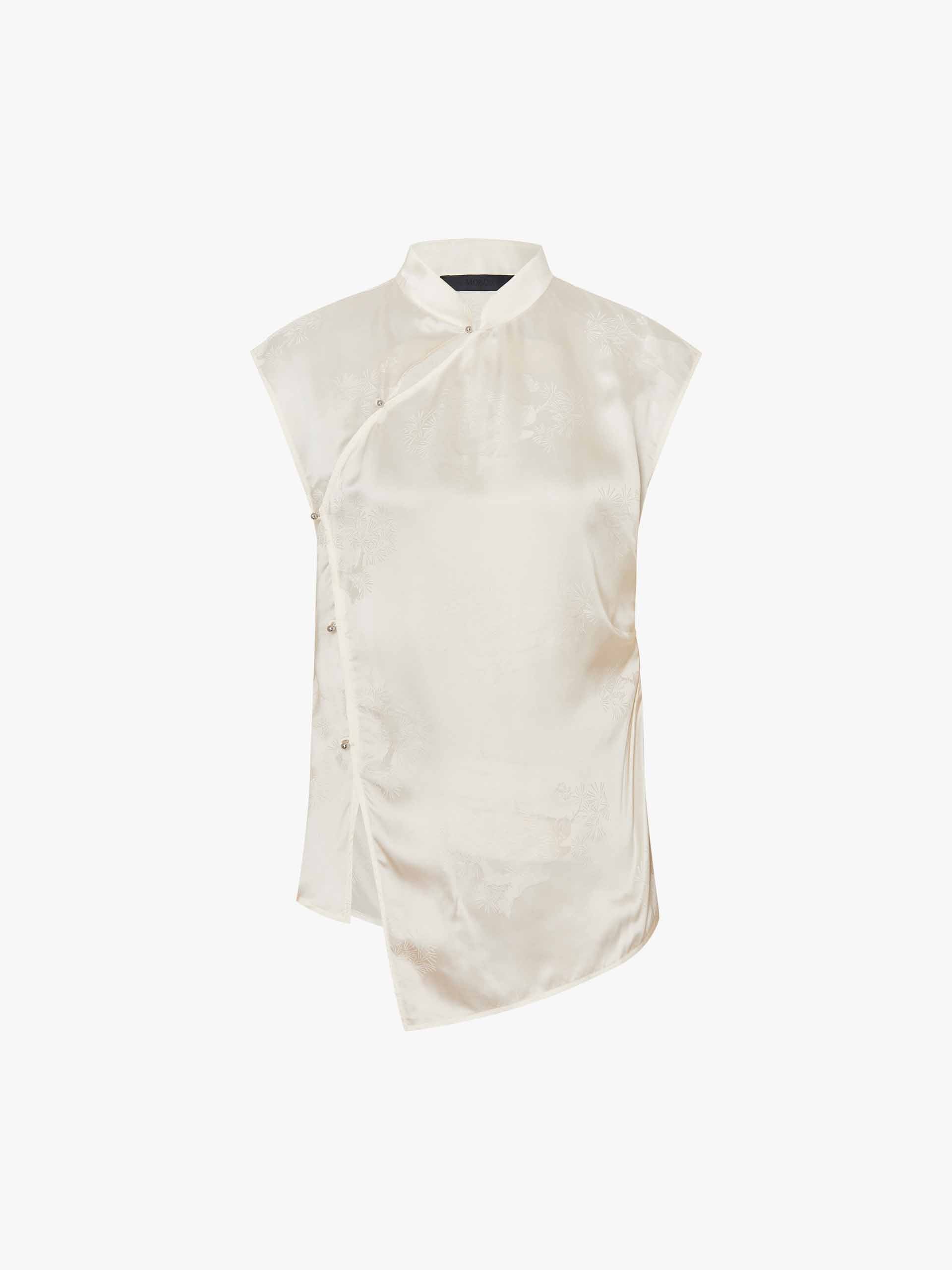 Crafted from a luxurious silk blend, this blouse reinterprets classic cheongsam allure with contemporary sophistication. The structured stand collar exudes timeless grace, while sleek sleeveless styling and an asymmetrical hem deliver modern fluidity in motion. Thoughtful details elevate its design: waist pleats softly accentuate curves, complemented by a cinched waist silhouette.
