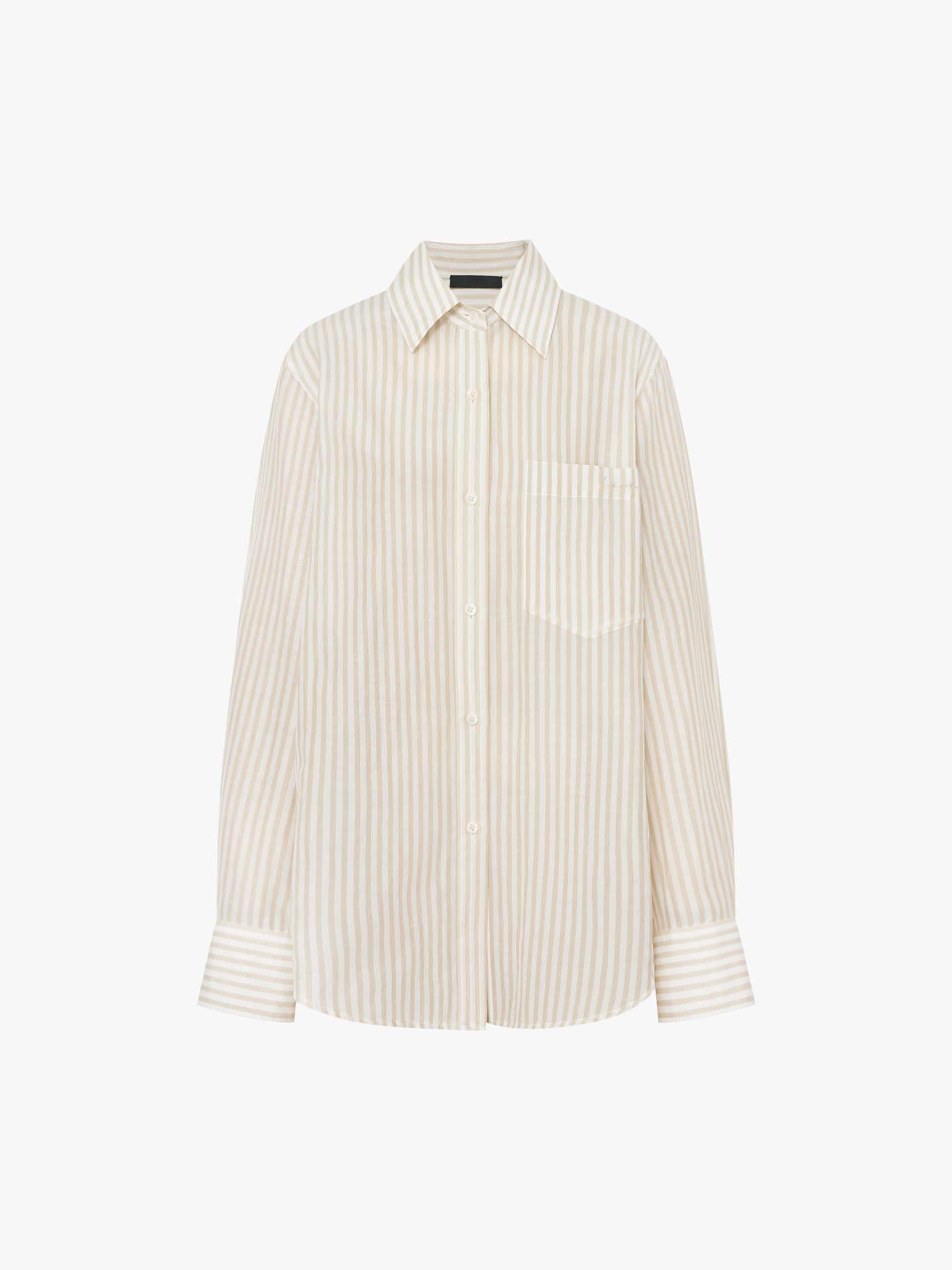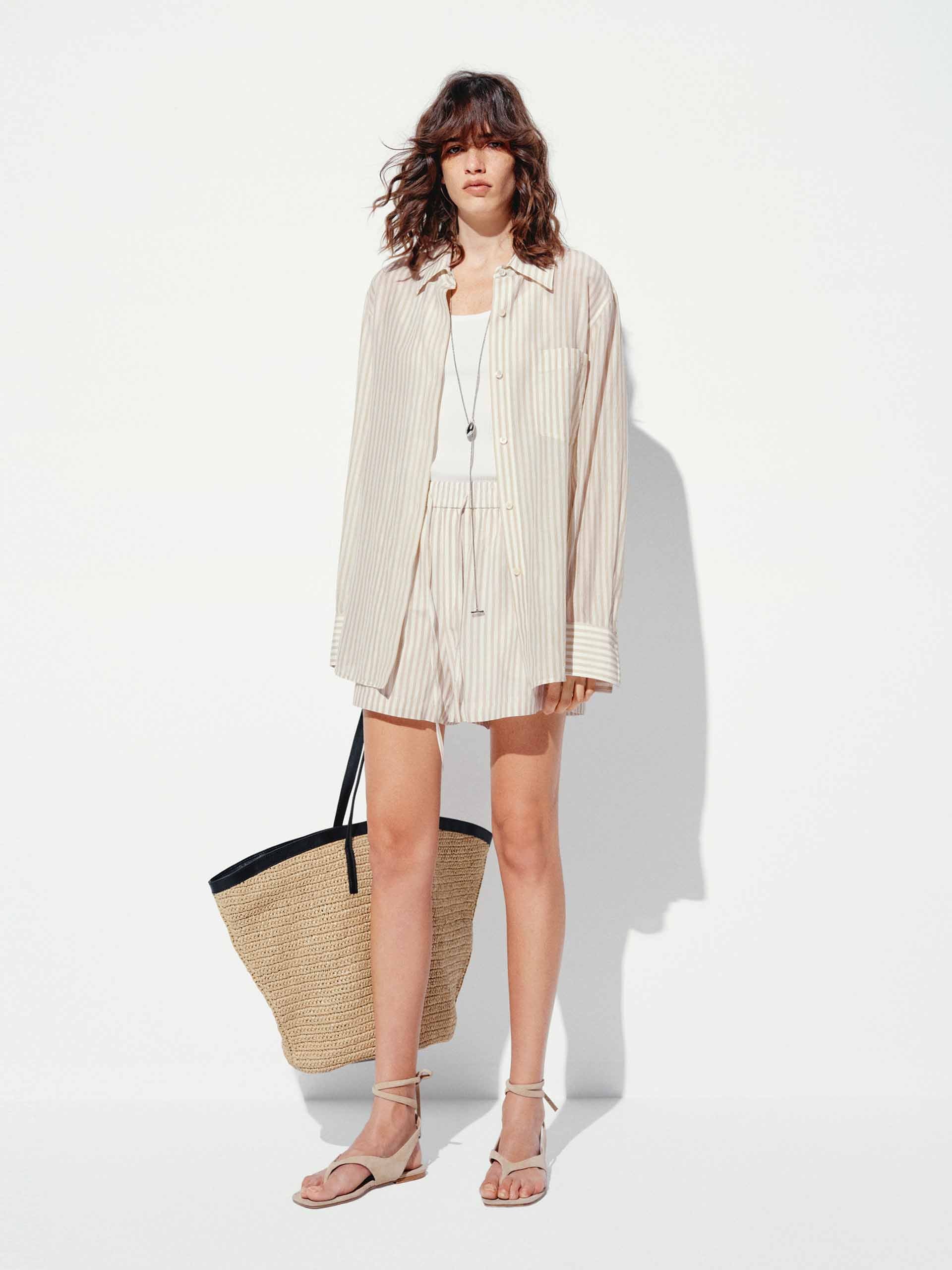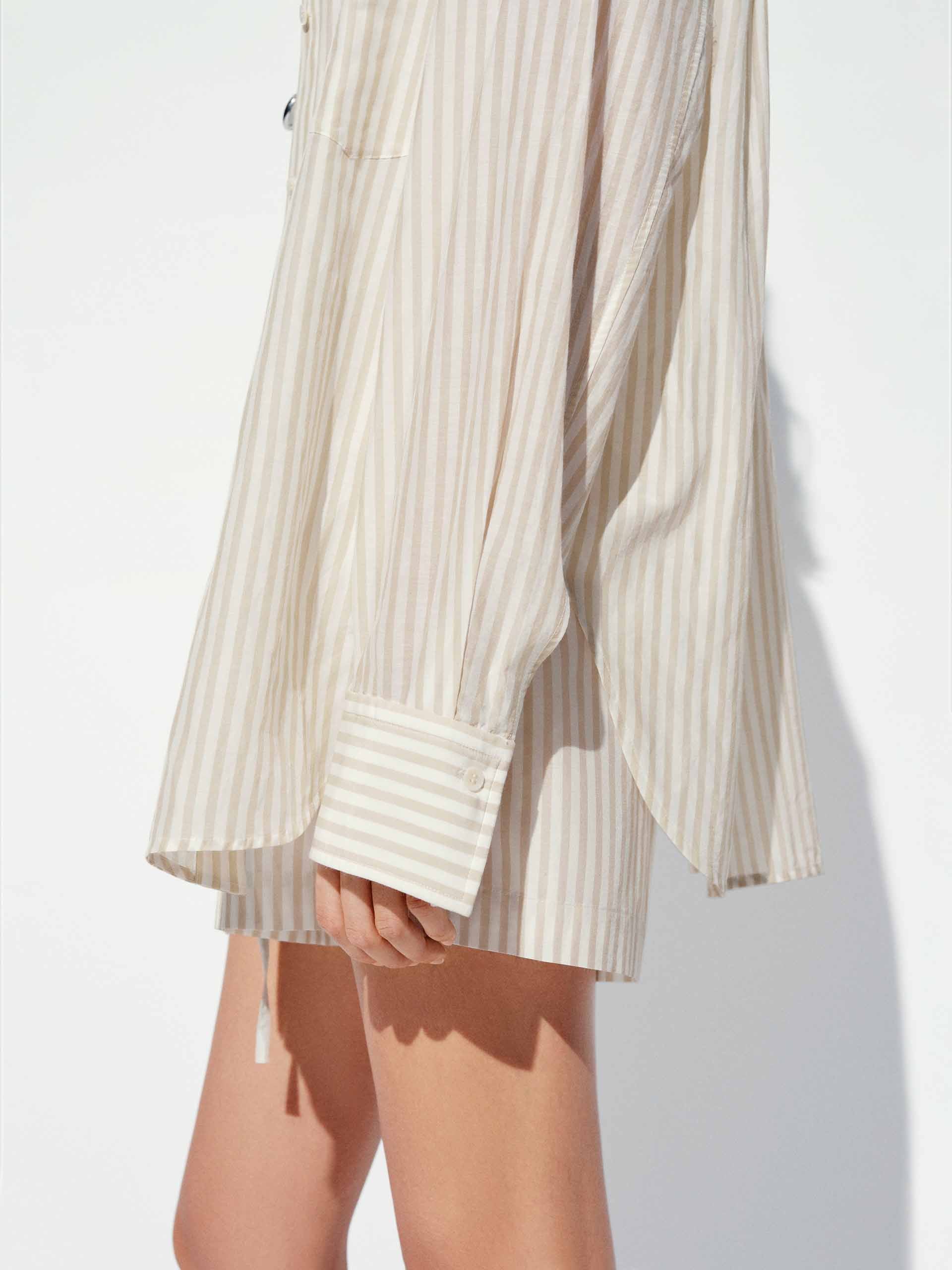 Blending the breathability of cotton with the luminous drape of silk, this shirt elevates everyday style with understated sophistication. The subtle striped pattern adds timeless visual interest. Designed for versatility, the button-front closure and curved hem create clean lines that tuck neatly or wear untucked with equal ease. Pair with the matching shorts for a more sophisticated and charming look.