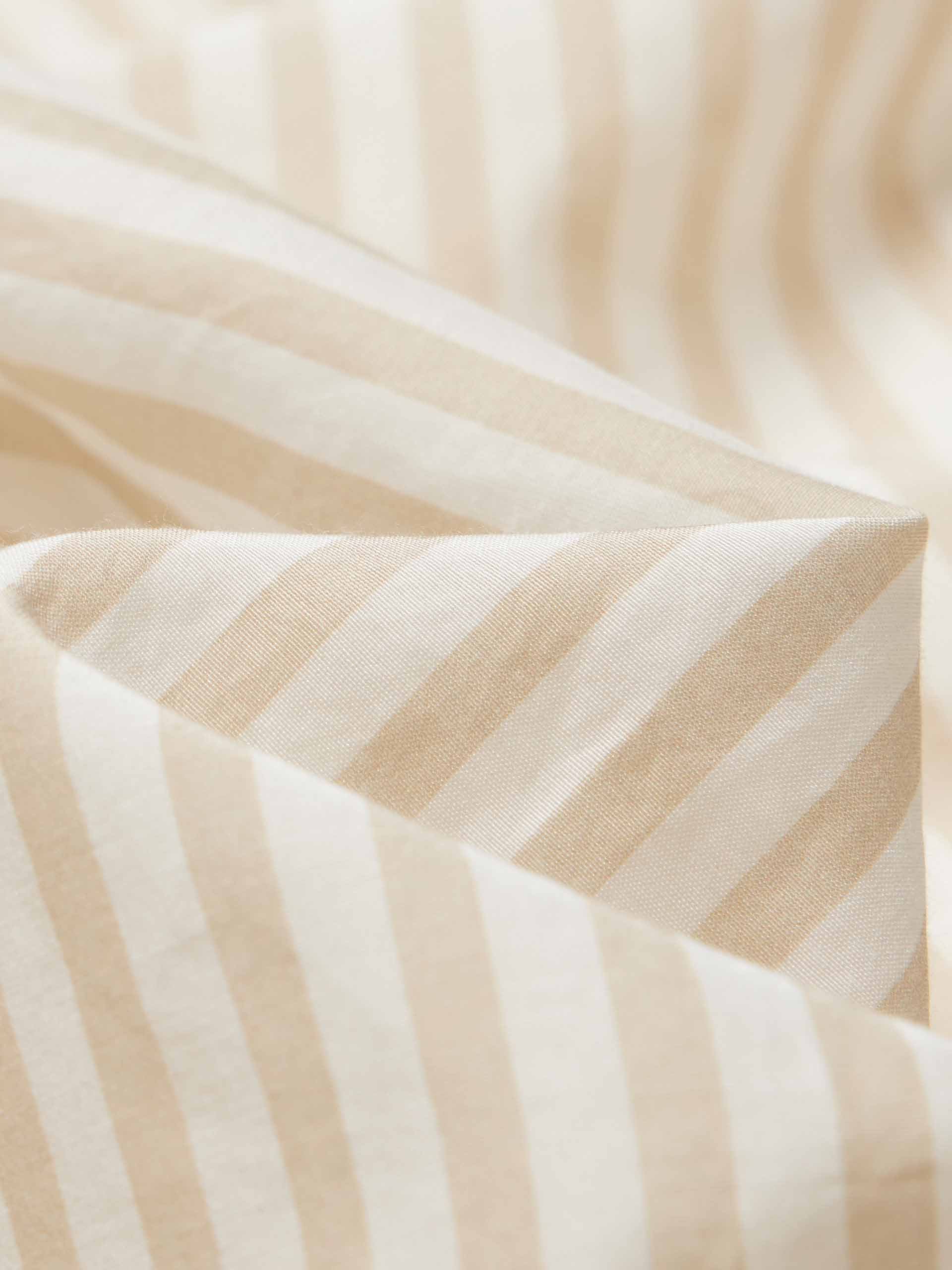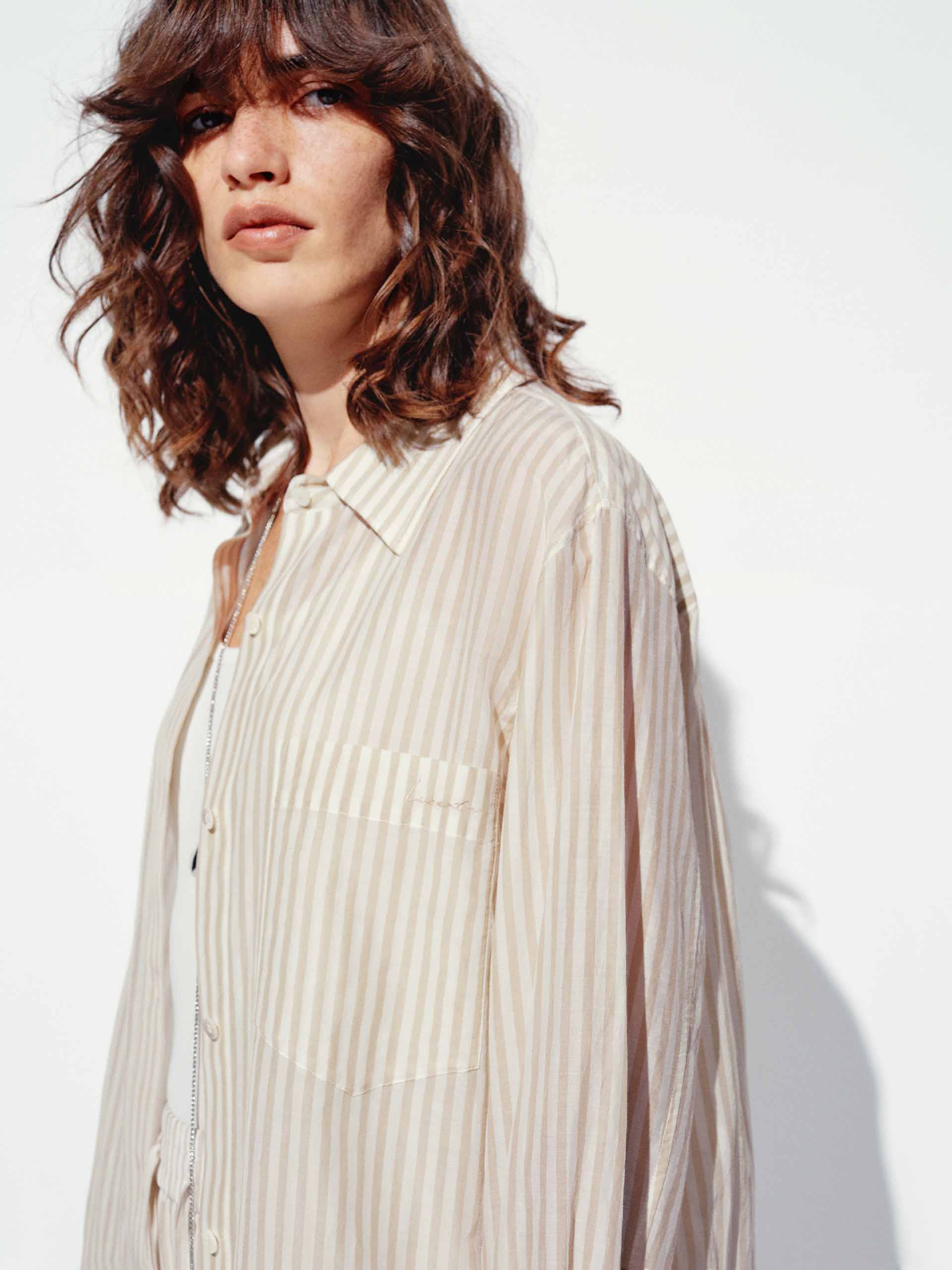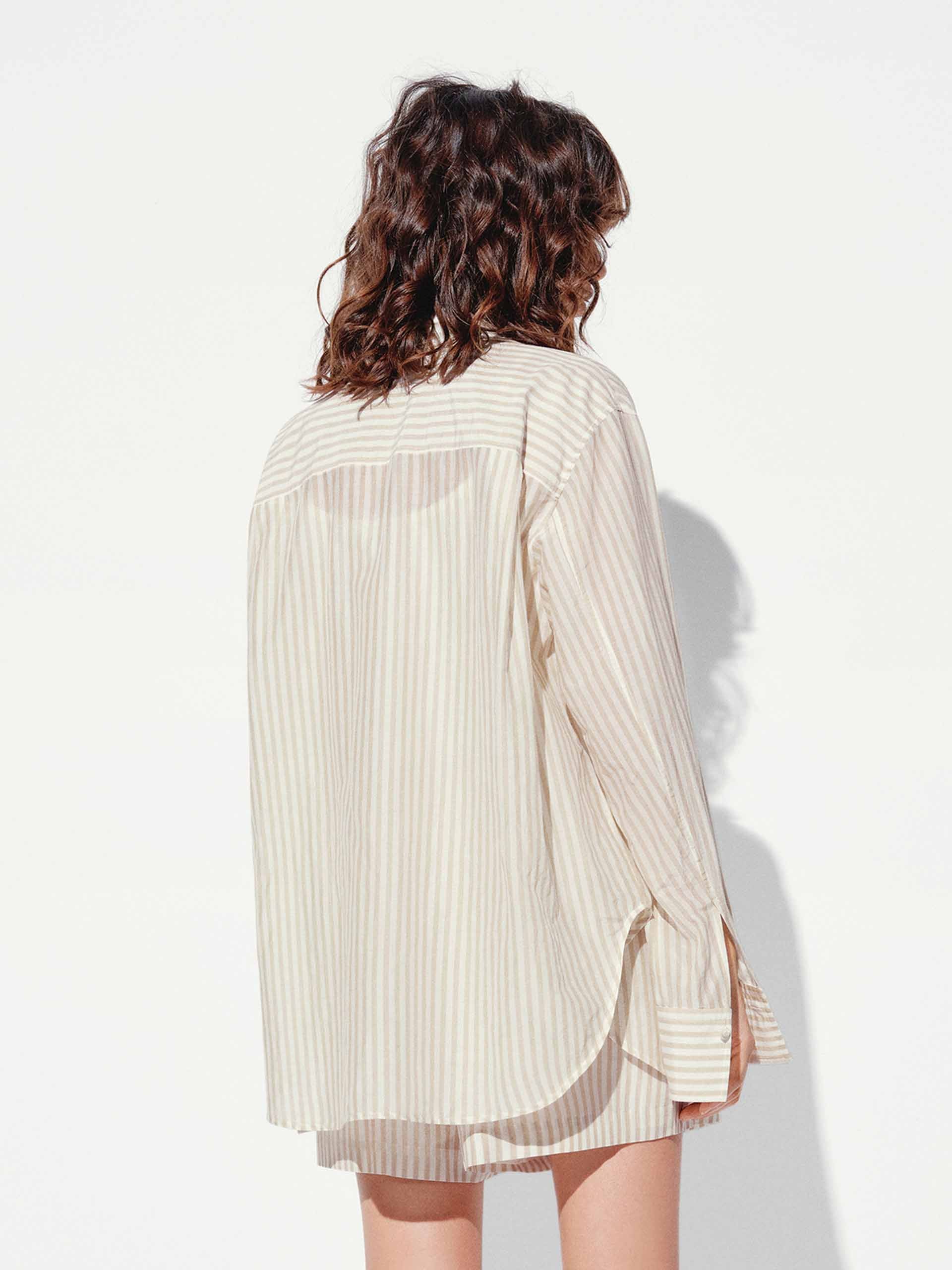 Blending the breathability of cotton with the luminous drape of silk, this shirt elevates everyday style with understated sophistication. The subtle striped pattern adds timeless visual interest. Designed for versatility, the button-front closure and curved hem create clean lines that tuck neatly or wear untucked with equal ease. Pair with the matching shorts for a more sophisticated and charming look.