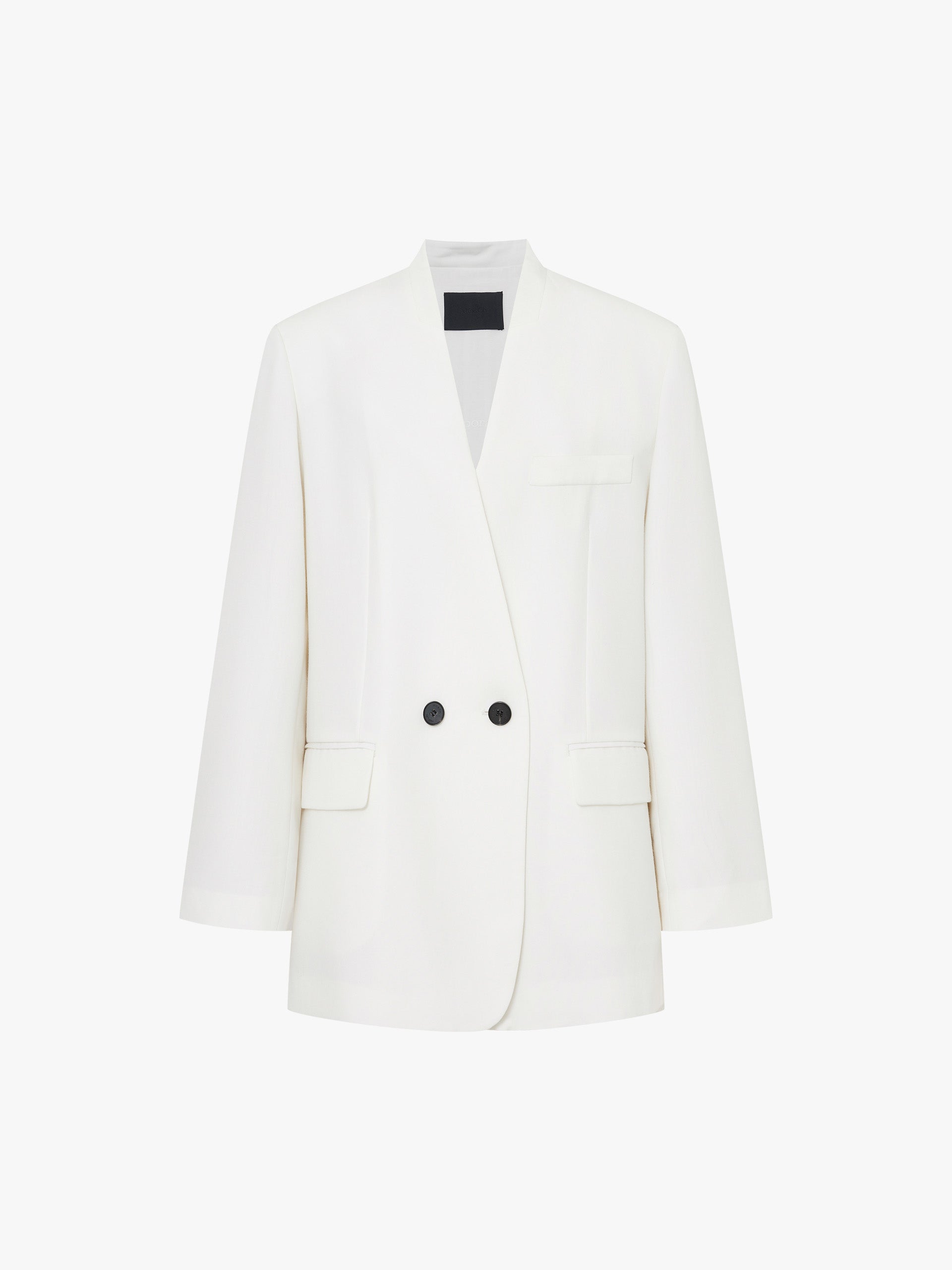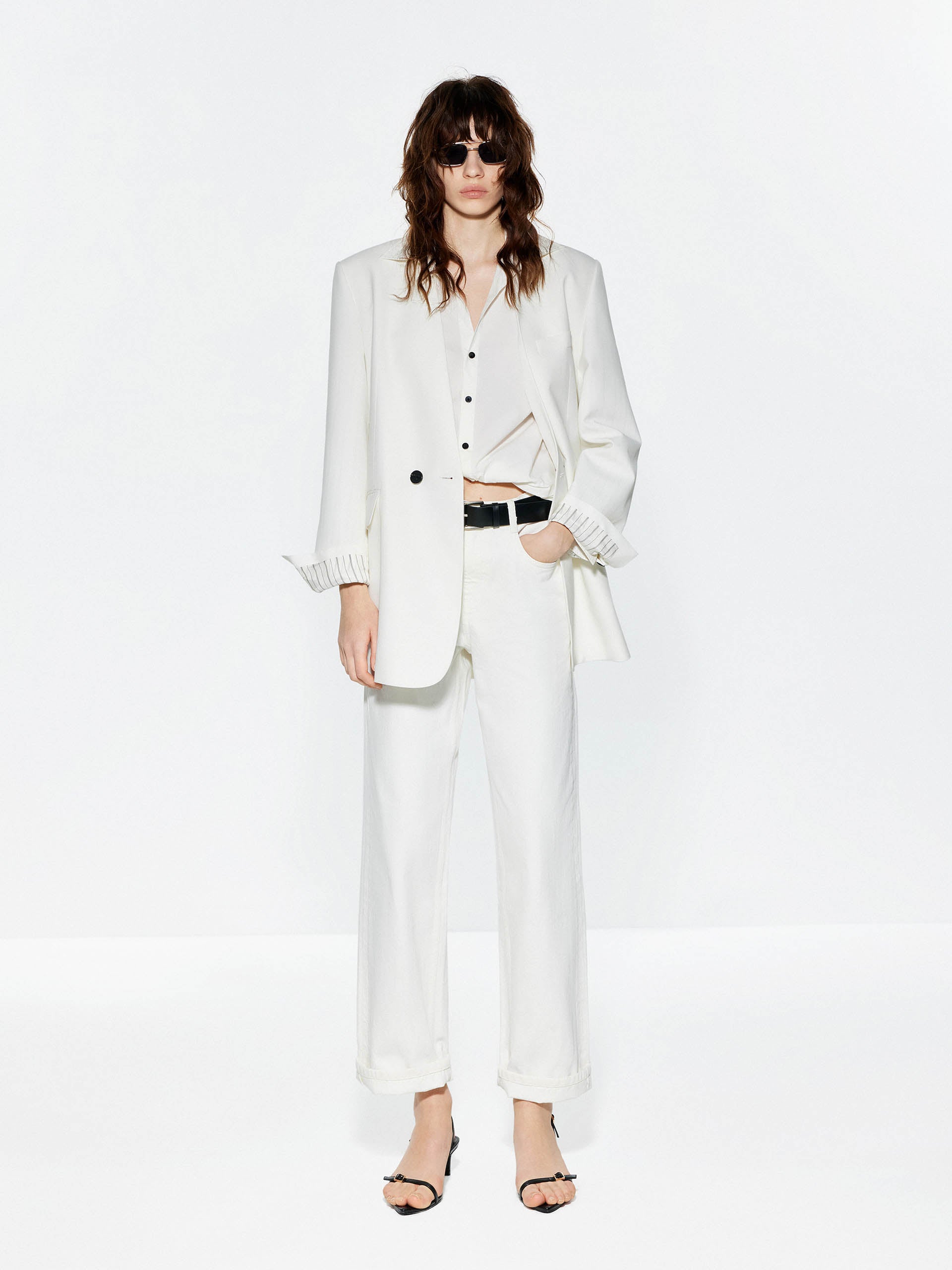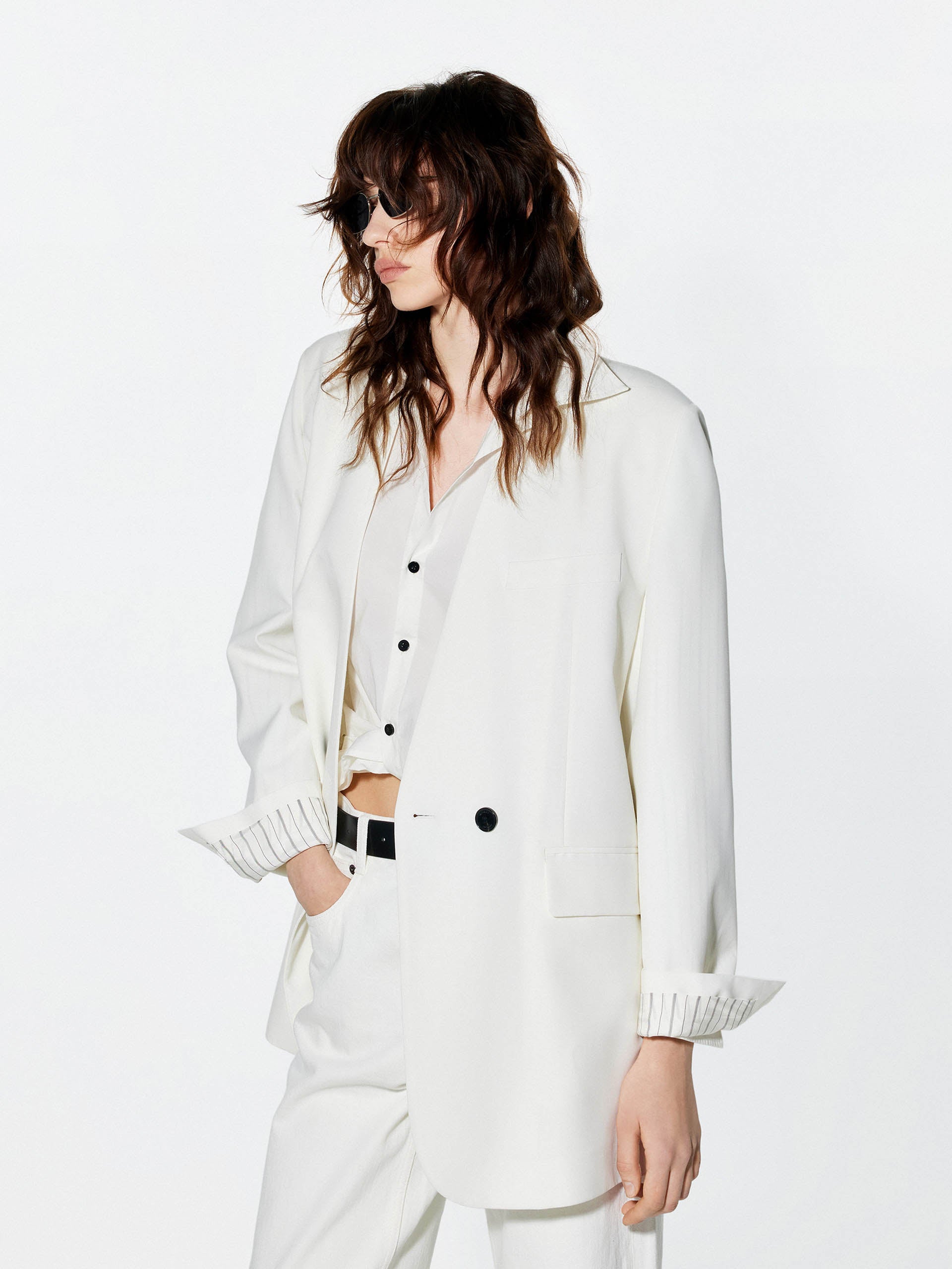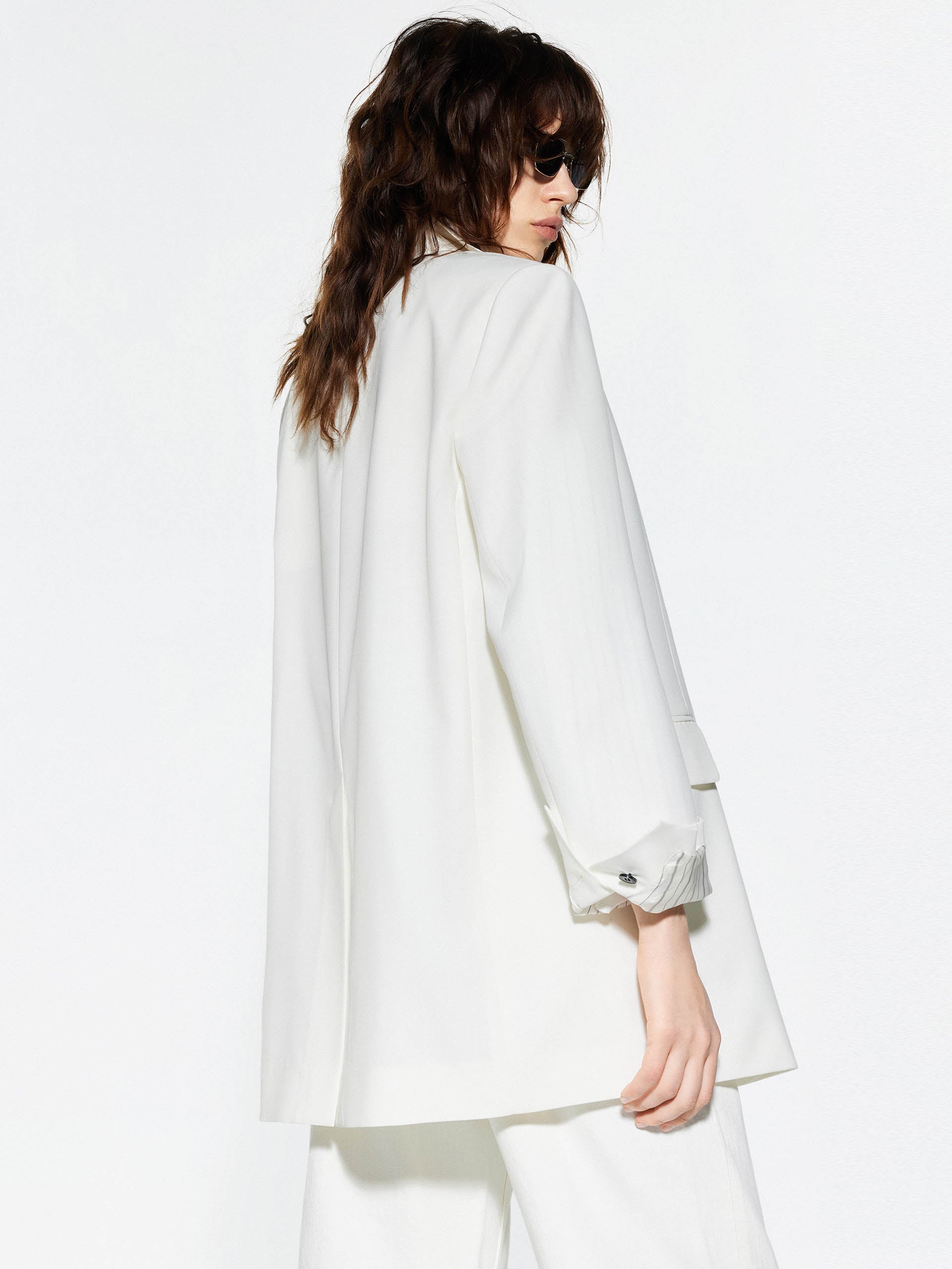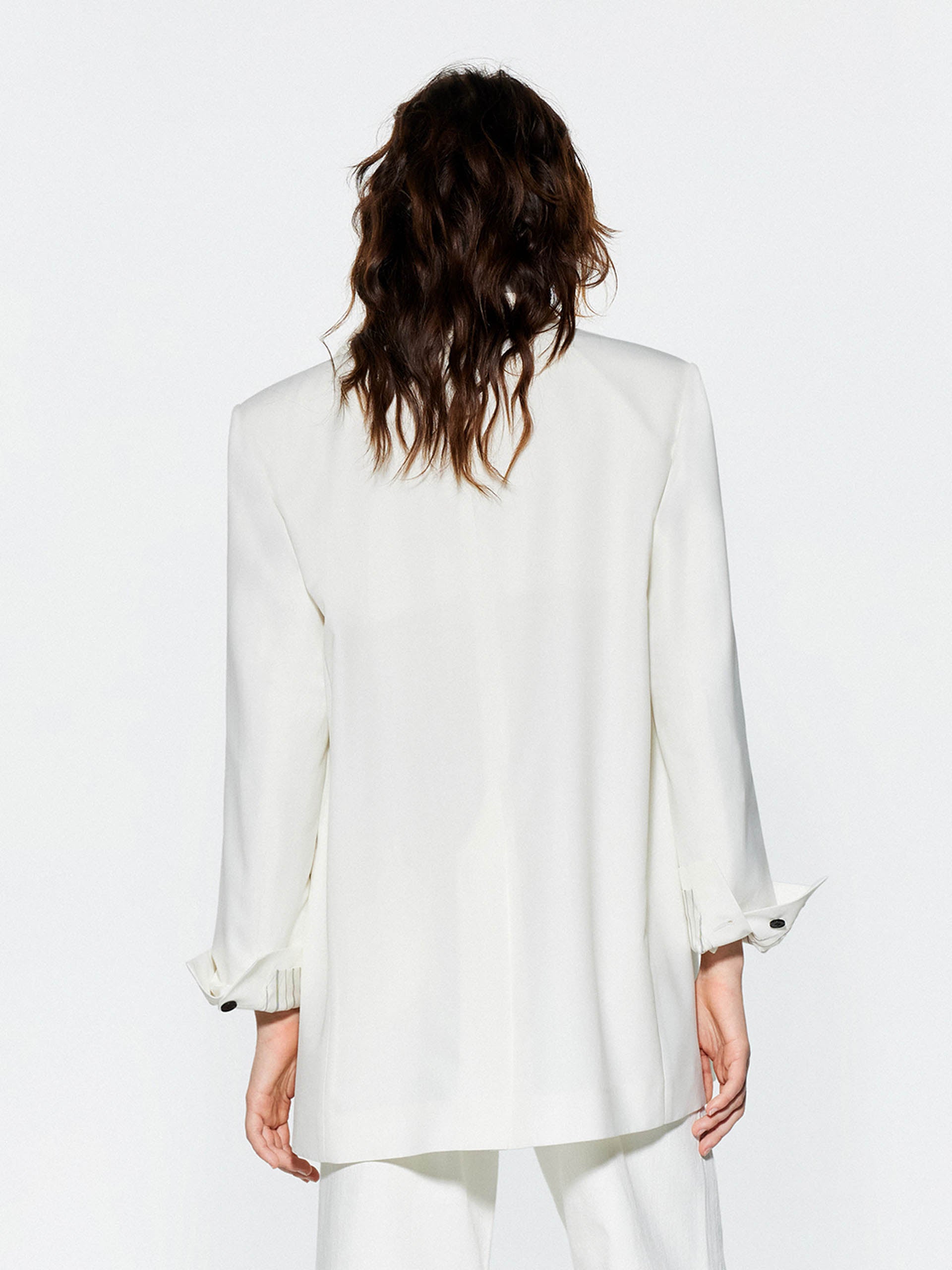 This blazer offers a modern twist on a classic silhouette. With pad shoulders, a back slit, and flap pockets, this blazer creates a stylish and professional look. The relaxed, collarless design adds a touch of trendiness, while the striped lining at the cuffs adds a subtle pop of detail.