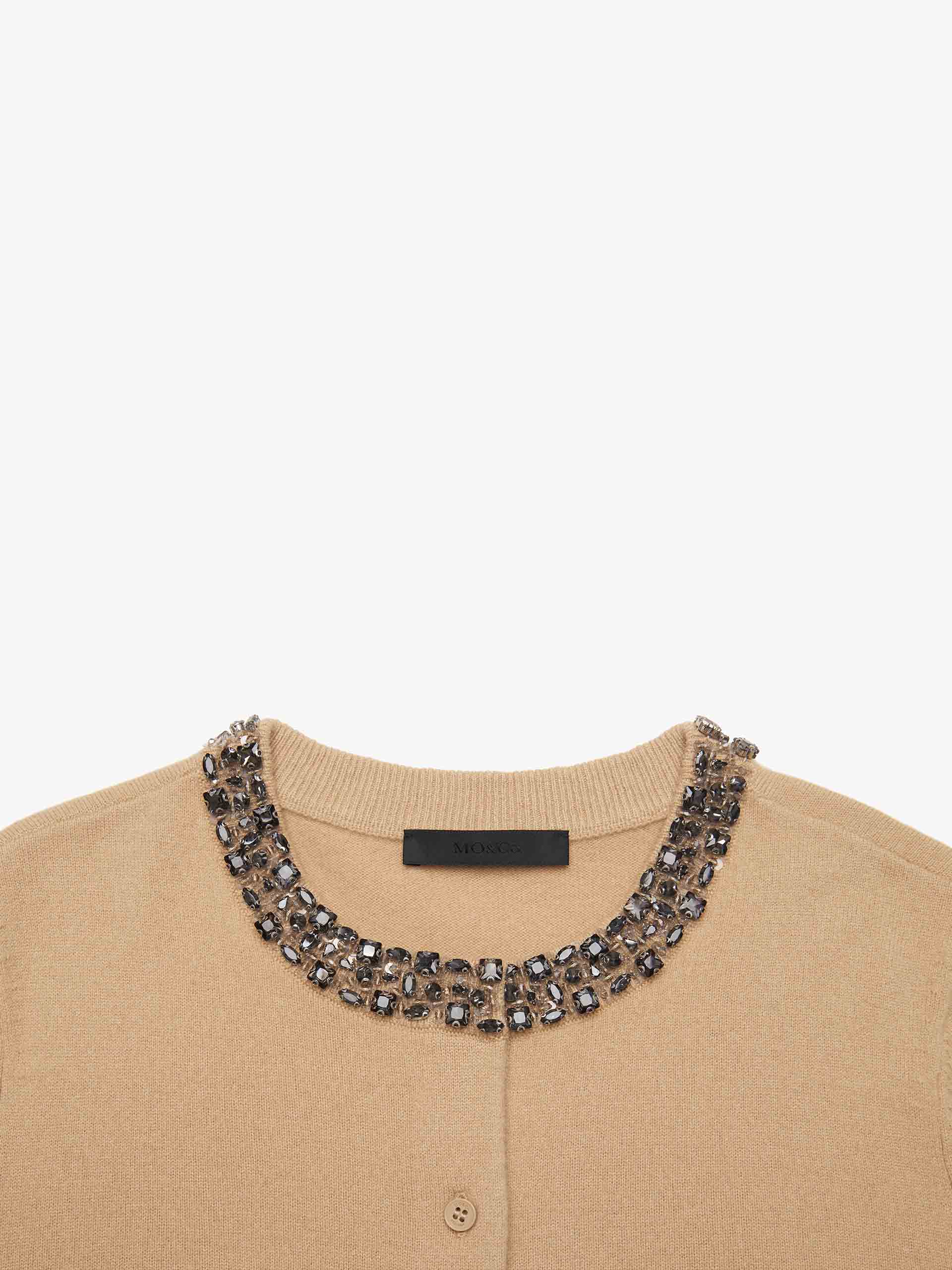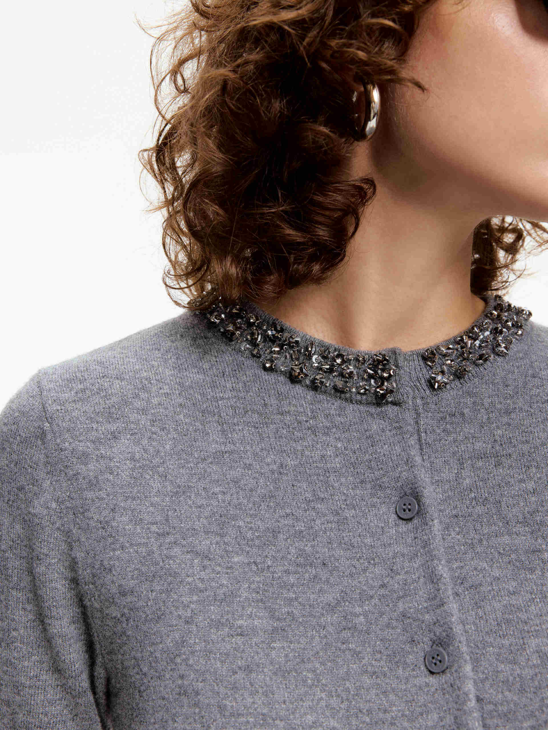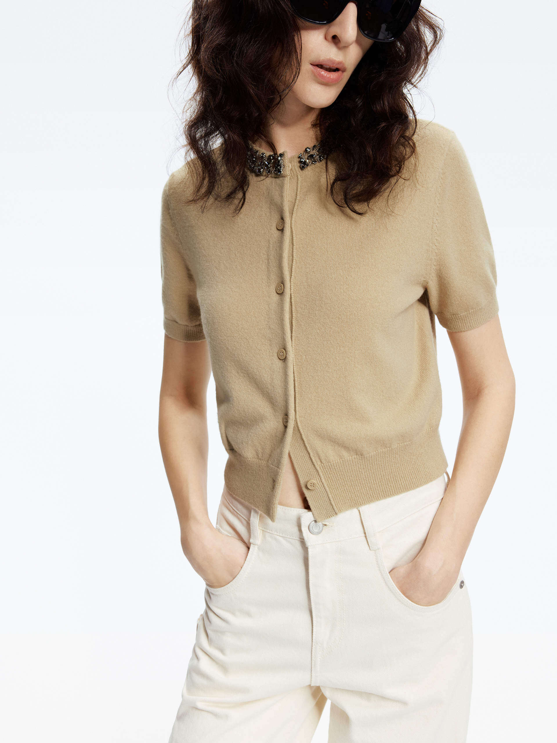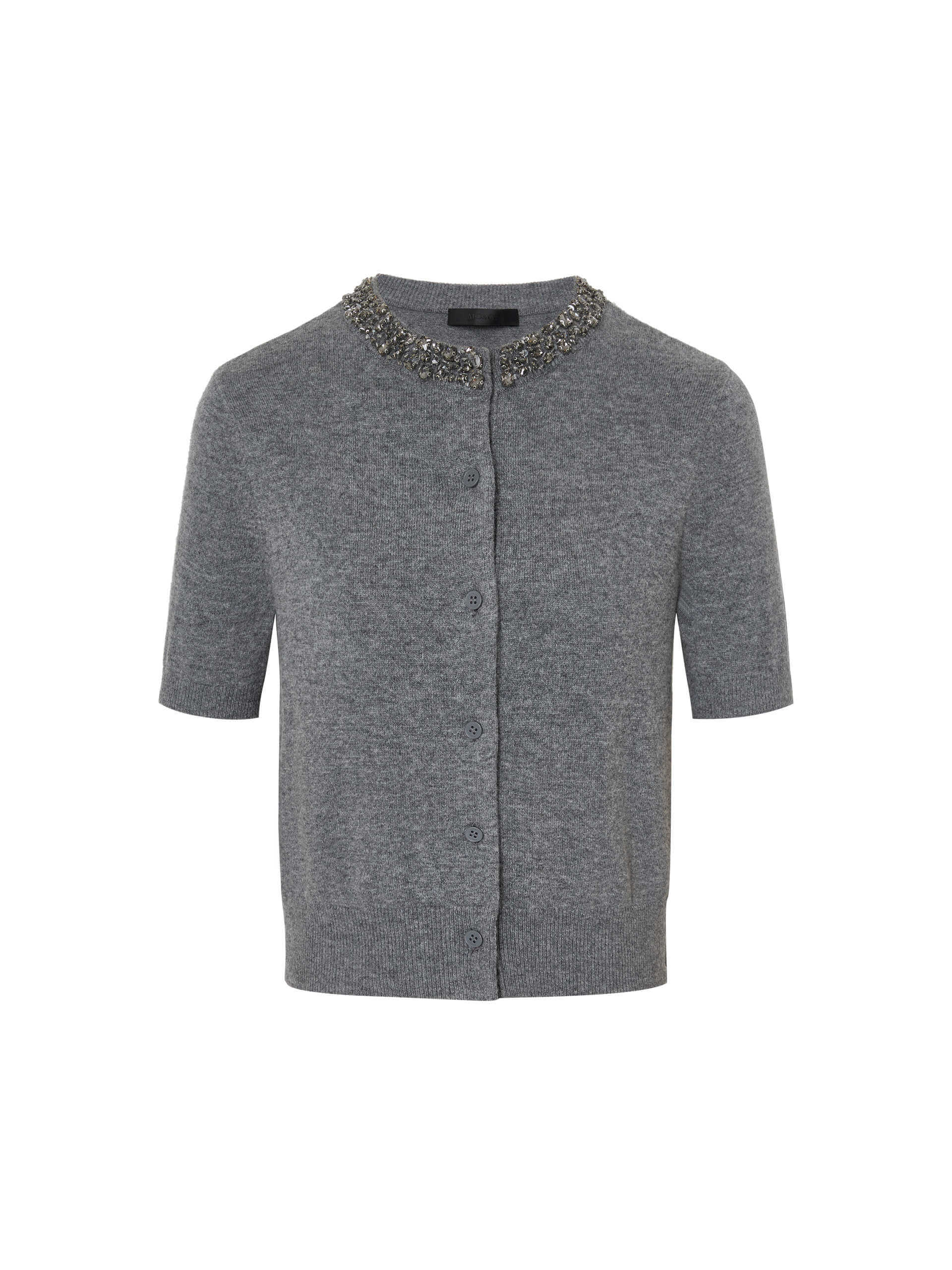 Made with soft wool and cashmere, this cardigan features a fitted silhouette and sparkling crystal accents on the collar. Pair it with a high-waisted skirt or jeans for a chic and effortless look.
