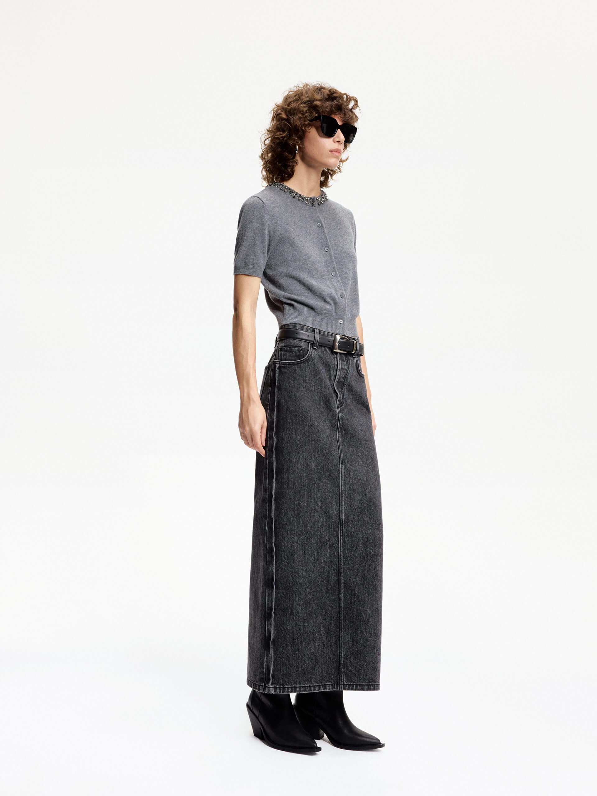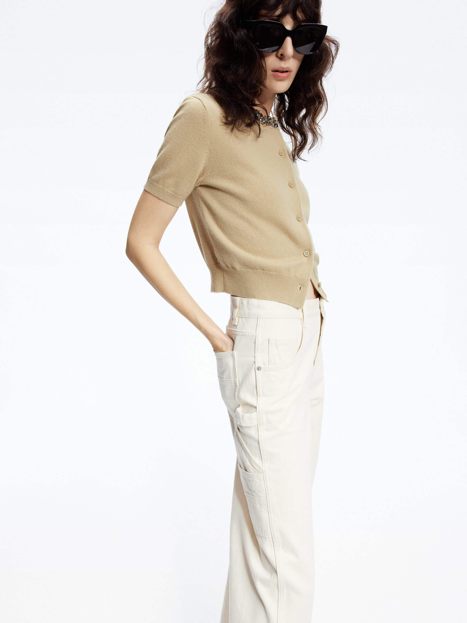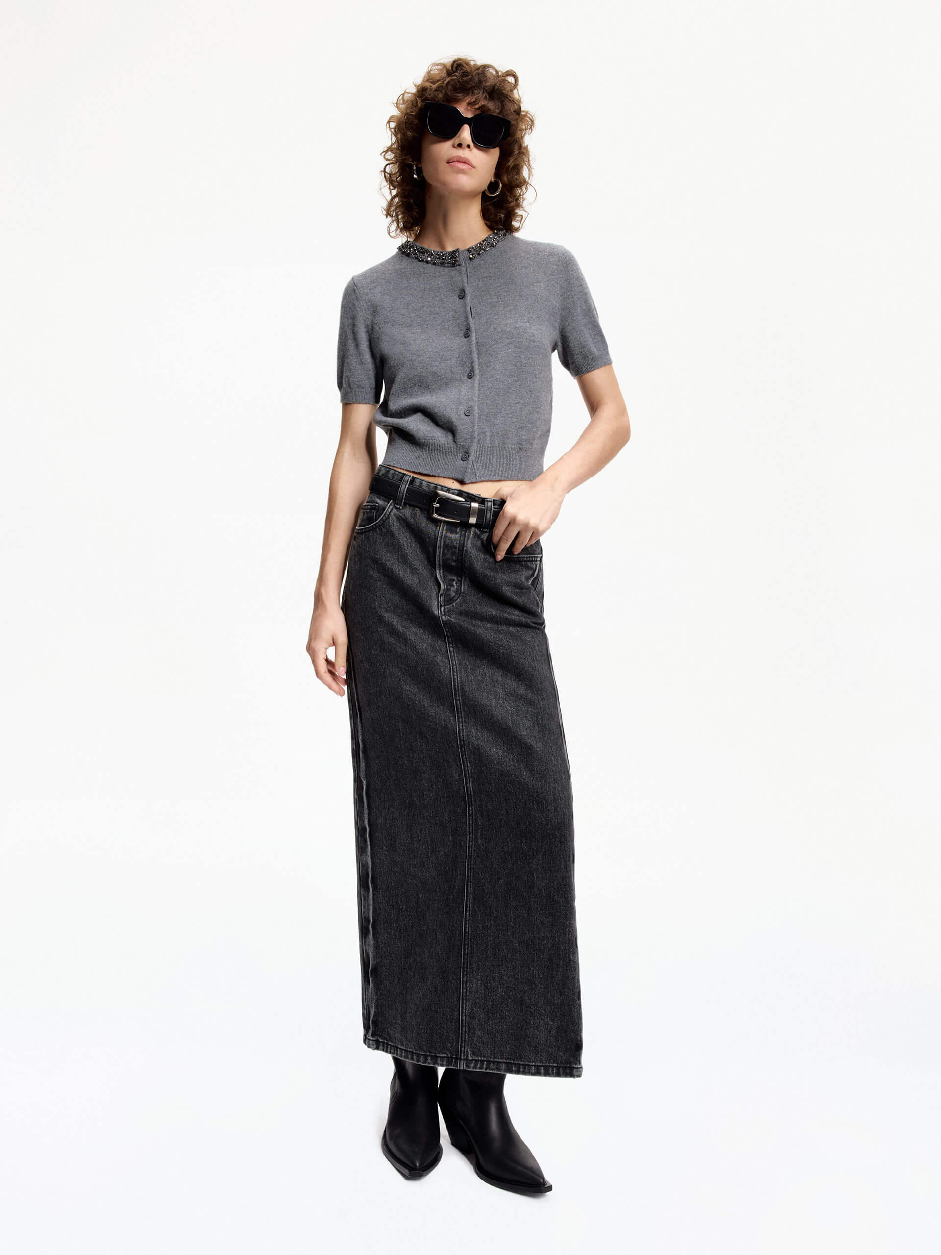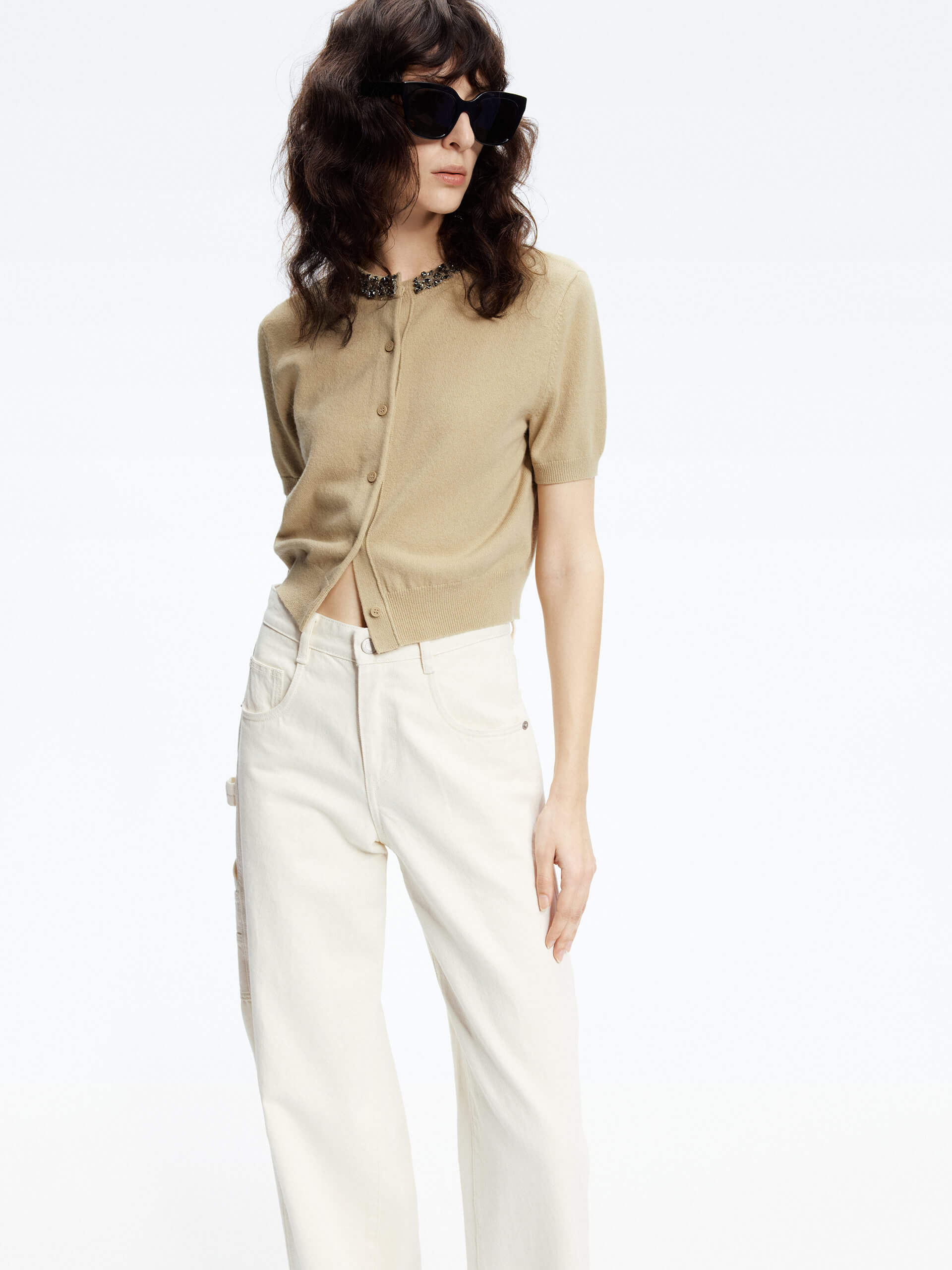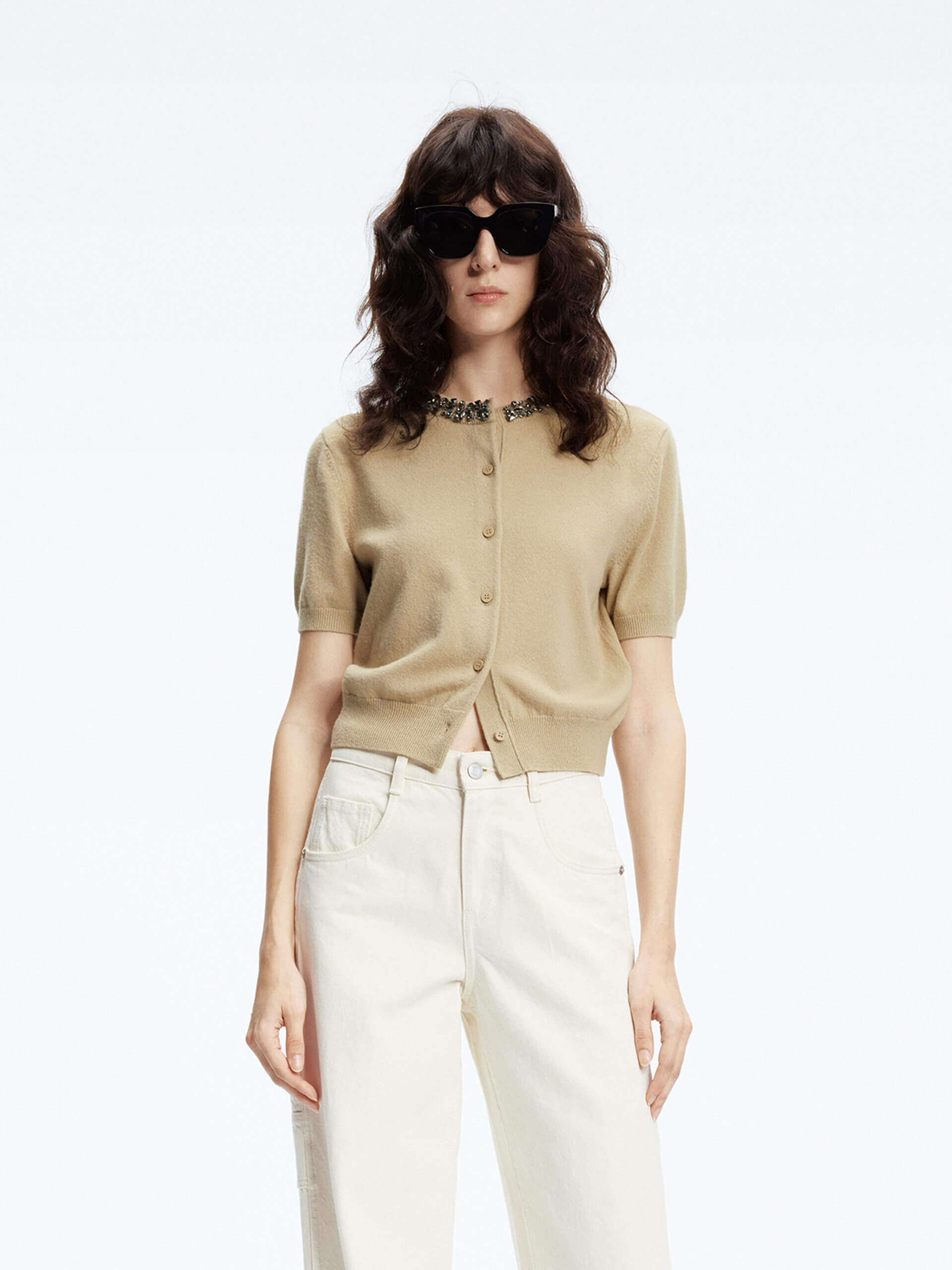 Made with soft wool and cashmere, this cardigan features a fitted silhouette and sparkling crystal accents on the collar. Pair it with a high-waisted skirt or jeans for a chic and effortless look.